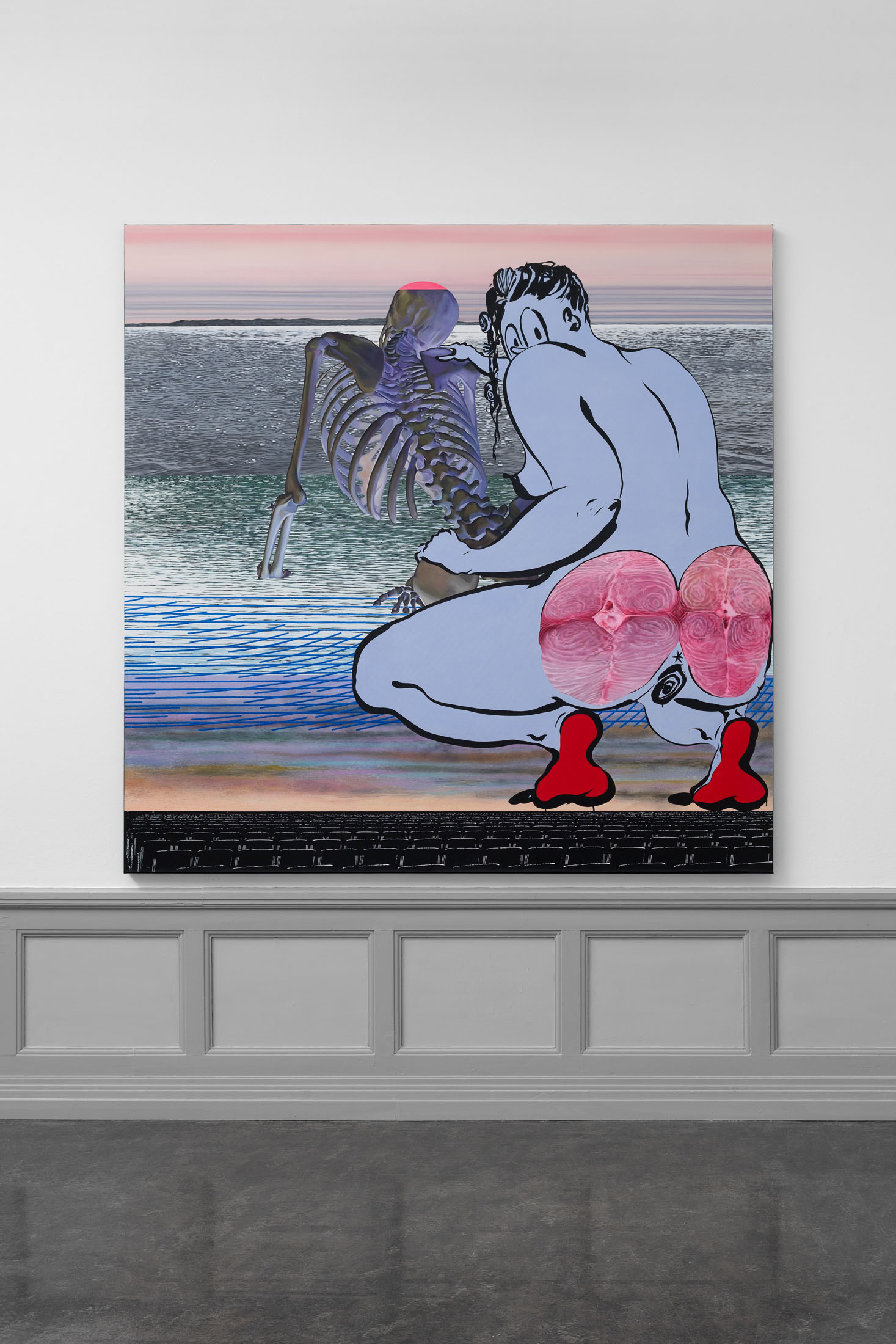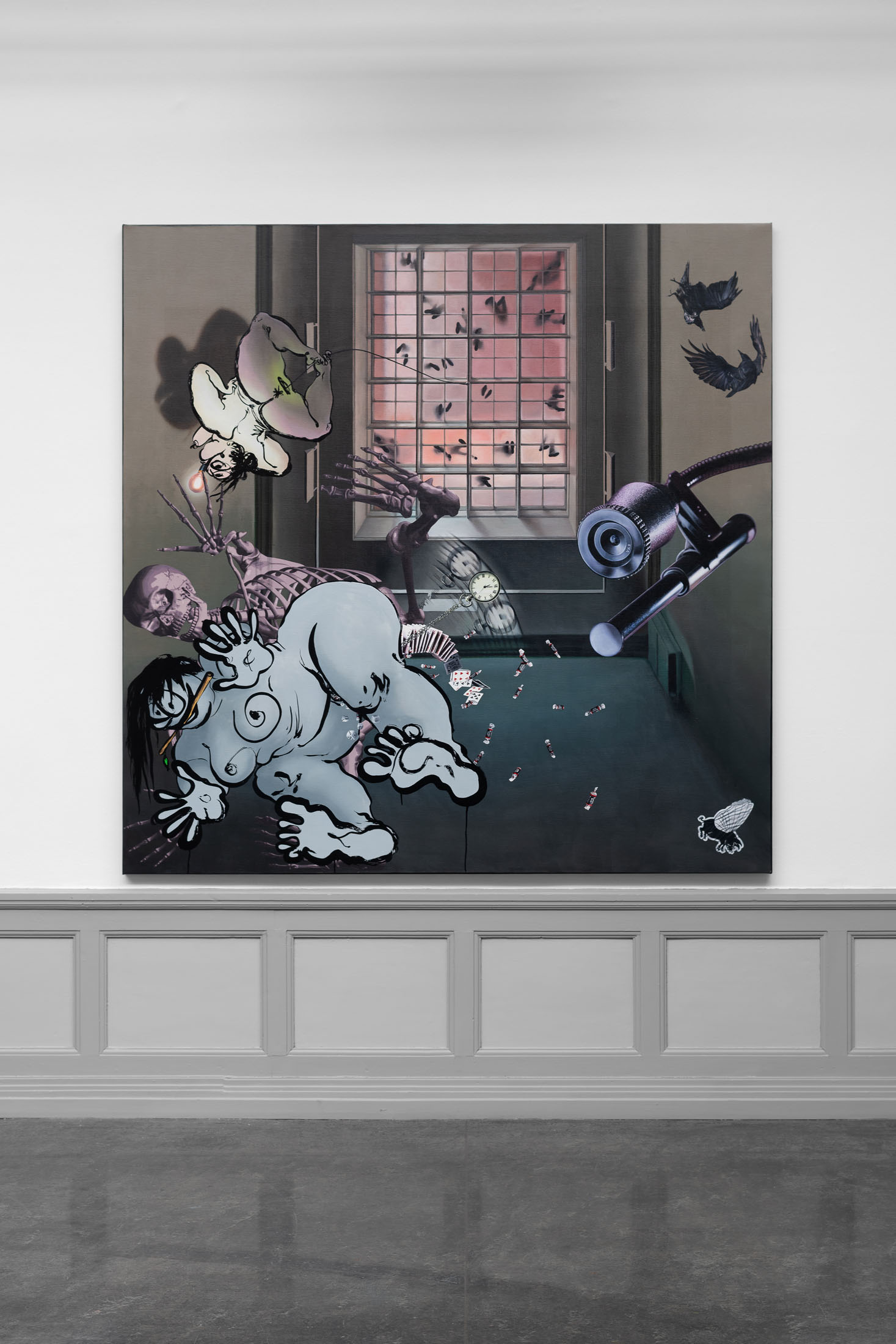 Symbols and objects in the work serve as compositional and emotive signposts rather than fixed metaphors, and challenge viewers to search for their own interpretations. The repetition of skeletal forms could be an anonymous human counterpart to Fatebe’s cartoon-line body, or they could reference fear, mortality, or the constraints of our physical bodies. Objects like swinging pocket watches, moonlit lakes, and flower-shaped throwing stars function as emotional and formal signifiers rather than encoded messages. They create a compositional tension between movement and stillness, as well as a psychological tension between playfulness and trauma. Muslimova’s messages are intuitive rather than didactic – felt in the gut as well as the mind.