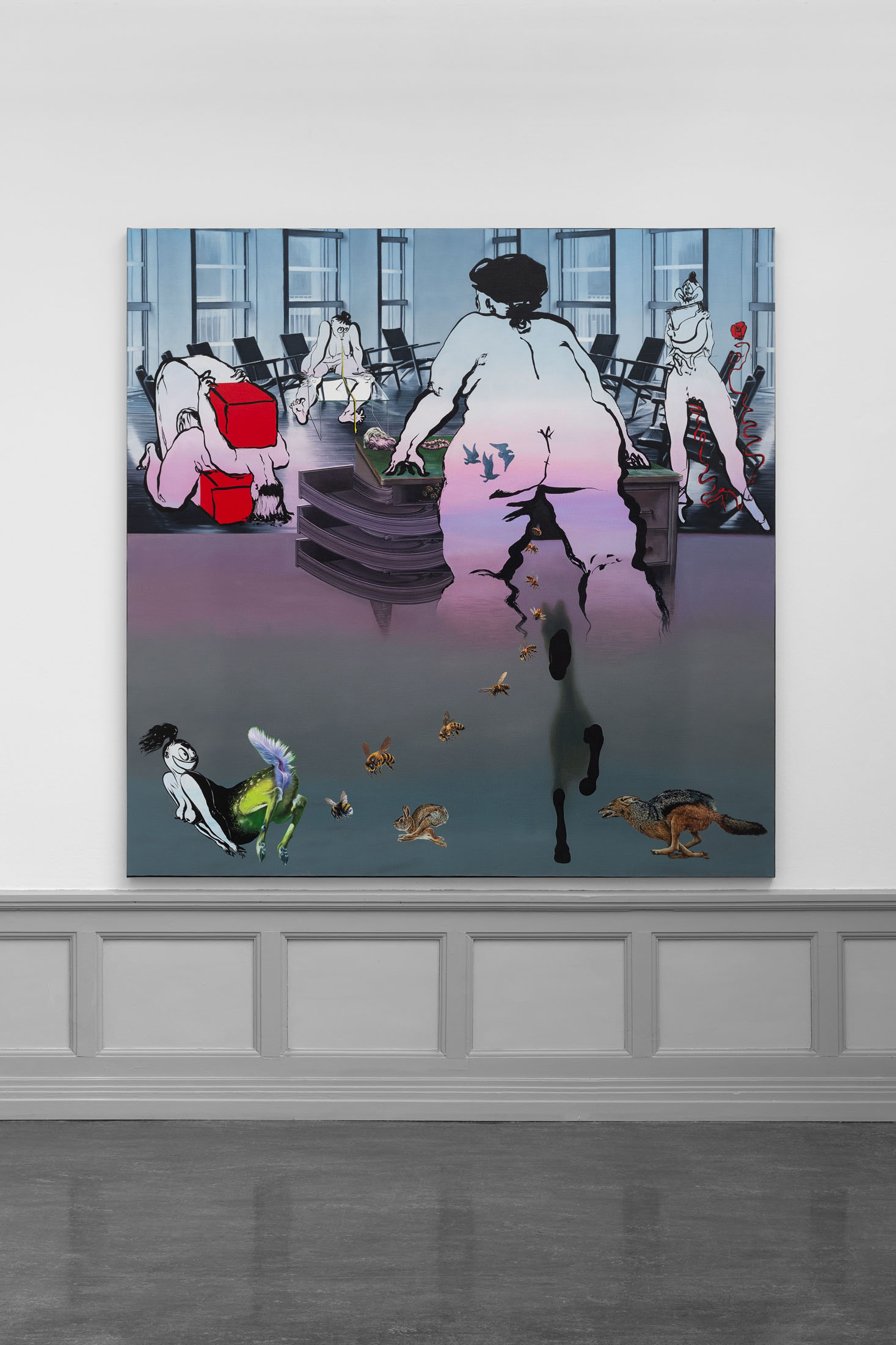 Here Fatebe is not merely a dark counterpart but a generative force; a reservoir of repressed traits and latent creativity that challenges the conscious mind’s rigidity. As Jung observed, the shadow “must be acknowledged continuously” for individuation to progress. The representations of Fatebe in these works display the messy, chaotic energies that underlie creativity and life itself. Muslimova’s process mirrors this insight. She approaches each work by setting rational parameters and then takes a cue from improvisational acting by letting Fatebe “yes and” herself into the work. This method allows for intuitive flow and unexpected connections.