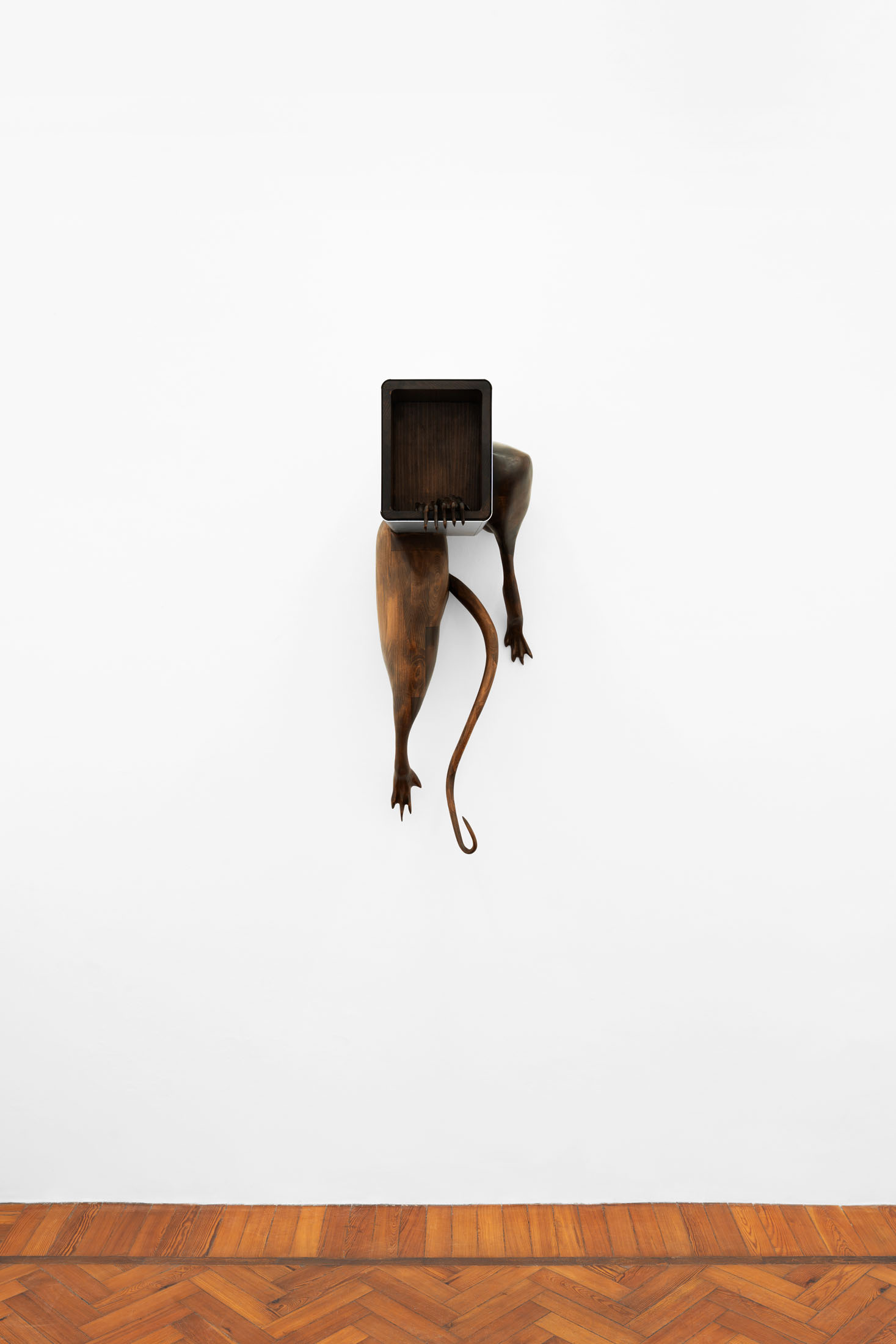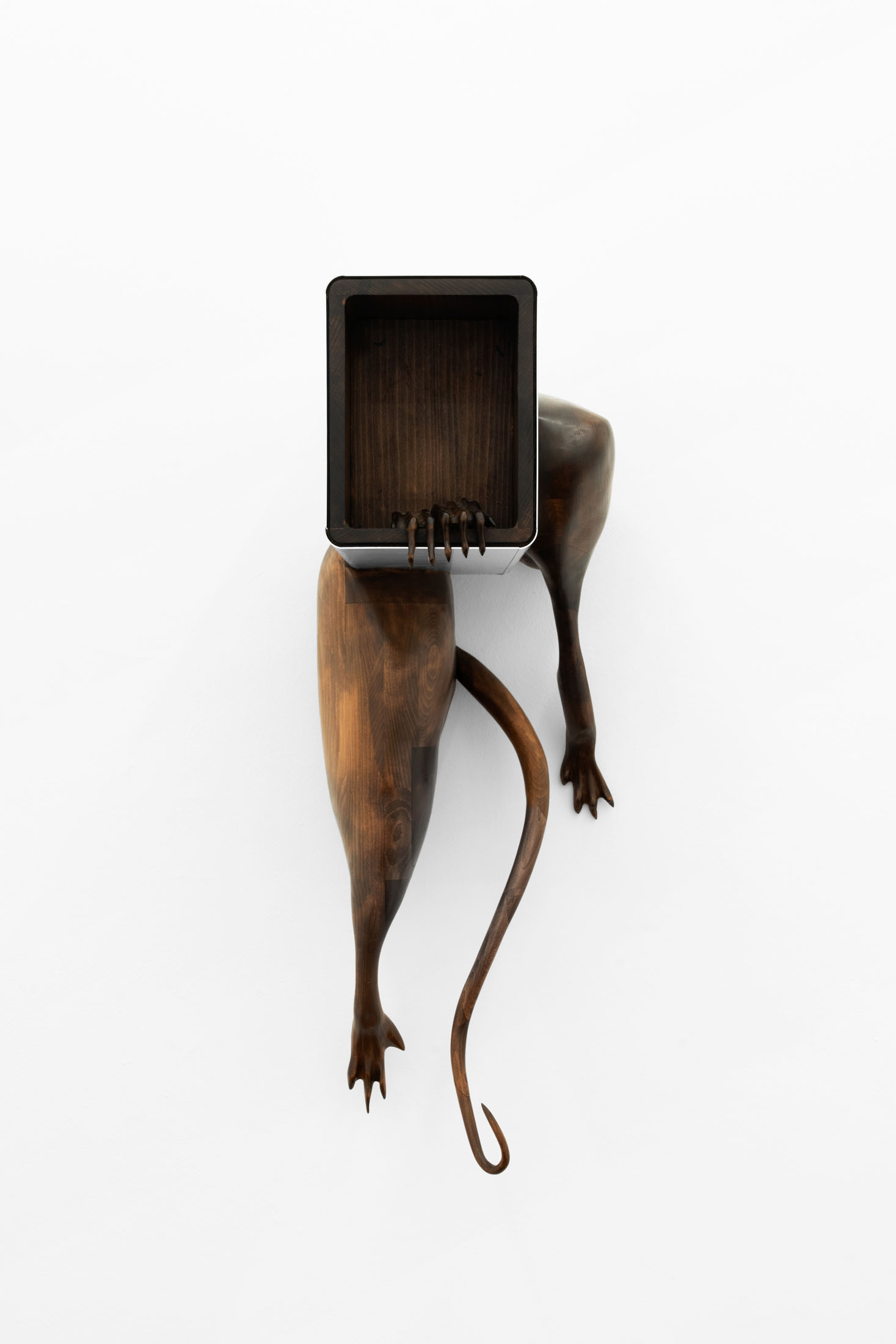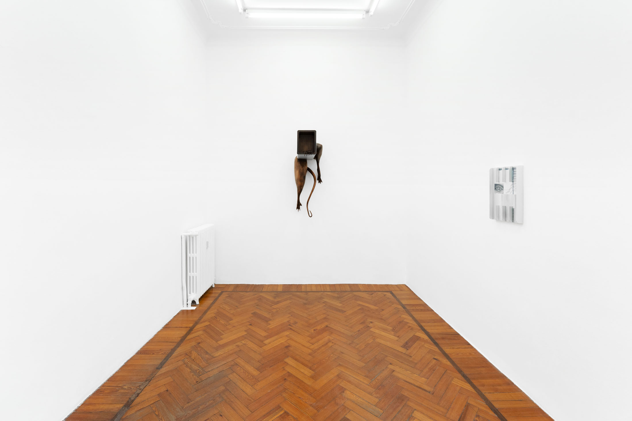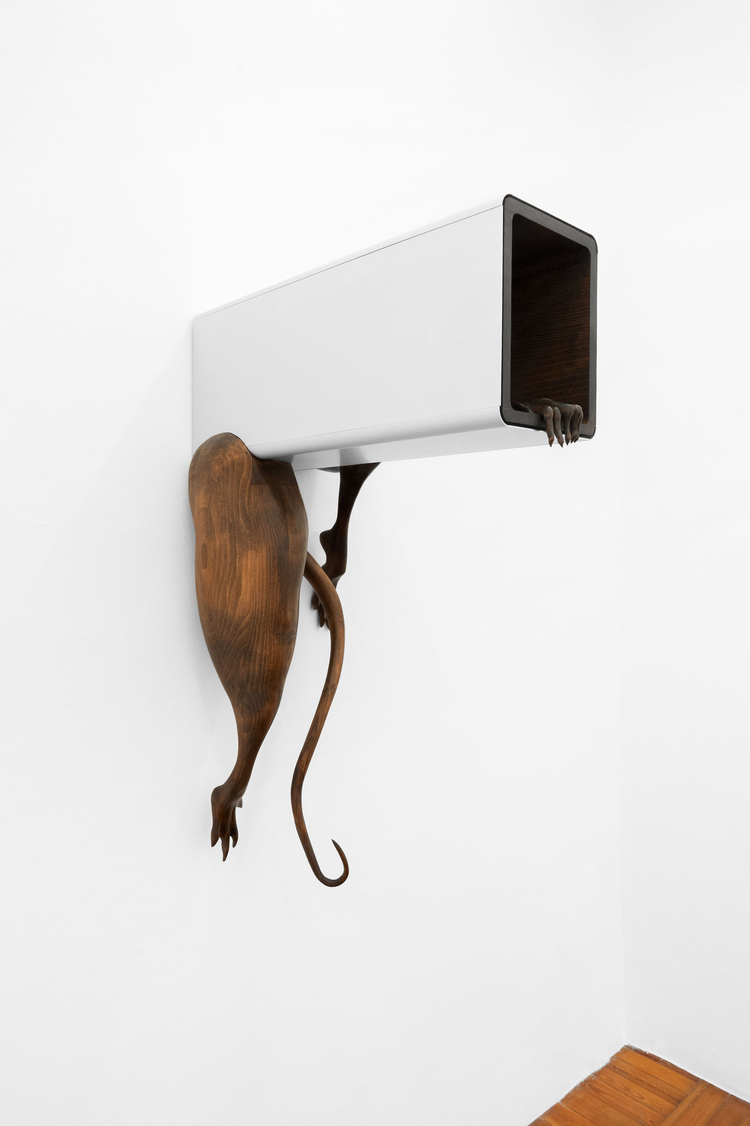 This figure, in the exhibition, takes on different forms and accompanies us in a path of progressive manifestation; if in the first room, with Hitchcockian suspense, the artist warns us of its presence by leaving some hidden but unmistakable traces, such as “Apple” — an apple core gnawed away, made in beech wood — in the second, our supposition becomes certainty. “Stryge #6” stands out hanging on the wall like a contemporary gargoyle, although its features do not recall the grotesque decorations of a cathedral but rather the smooth and translucent surfaces of modernist architecture; within this duct slide the shapes of a mysterious being between man and rodent, completing this sort of summa work that gathers around itself all the concepts revolving around this exhibition. Between the two rooms, “Stryge #5” — a work in the form of a real subway turnstile whose arms, however, take the shape of enigmatic wooden limbs — functions as a filter, an ideal portal to this world foreign to us; deprived of its didactic value (due to its overturned position and off-axis with respect to the real passage), the work comes alive only if our body comes into contact with these “other” presences… as if the artist were inviting us to a metaphorical gesture of confrontation and overcoming of our fears. Completing the exhibition are four airbrush paintings on anodized aluminum entitled “H&S (Atomic Purple)”; inspired by the Game Boy model from 1998 (whose transparent plastic shell allowed one to glimpse the technological organs of the handheld console), they represent a combination of small figures or fragments of the body joined to networks of cables and other underground infrastructural pipes, “landscapes” of which the artist was able to have direct experience due to a large metropolitan excavation right in front of the door of his studio in Aubervilliers.
