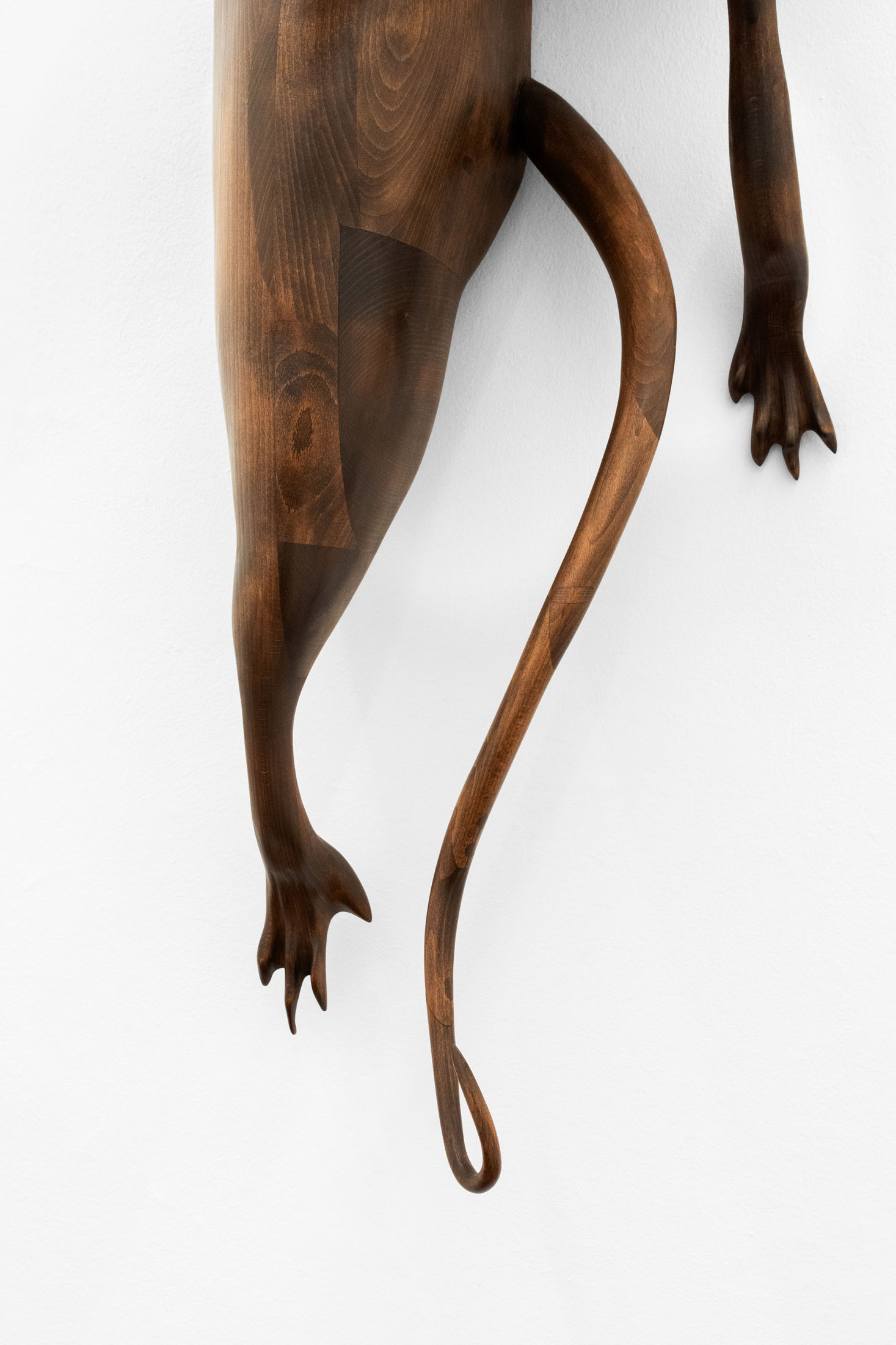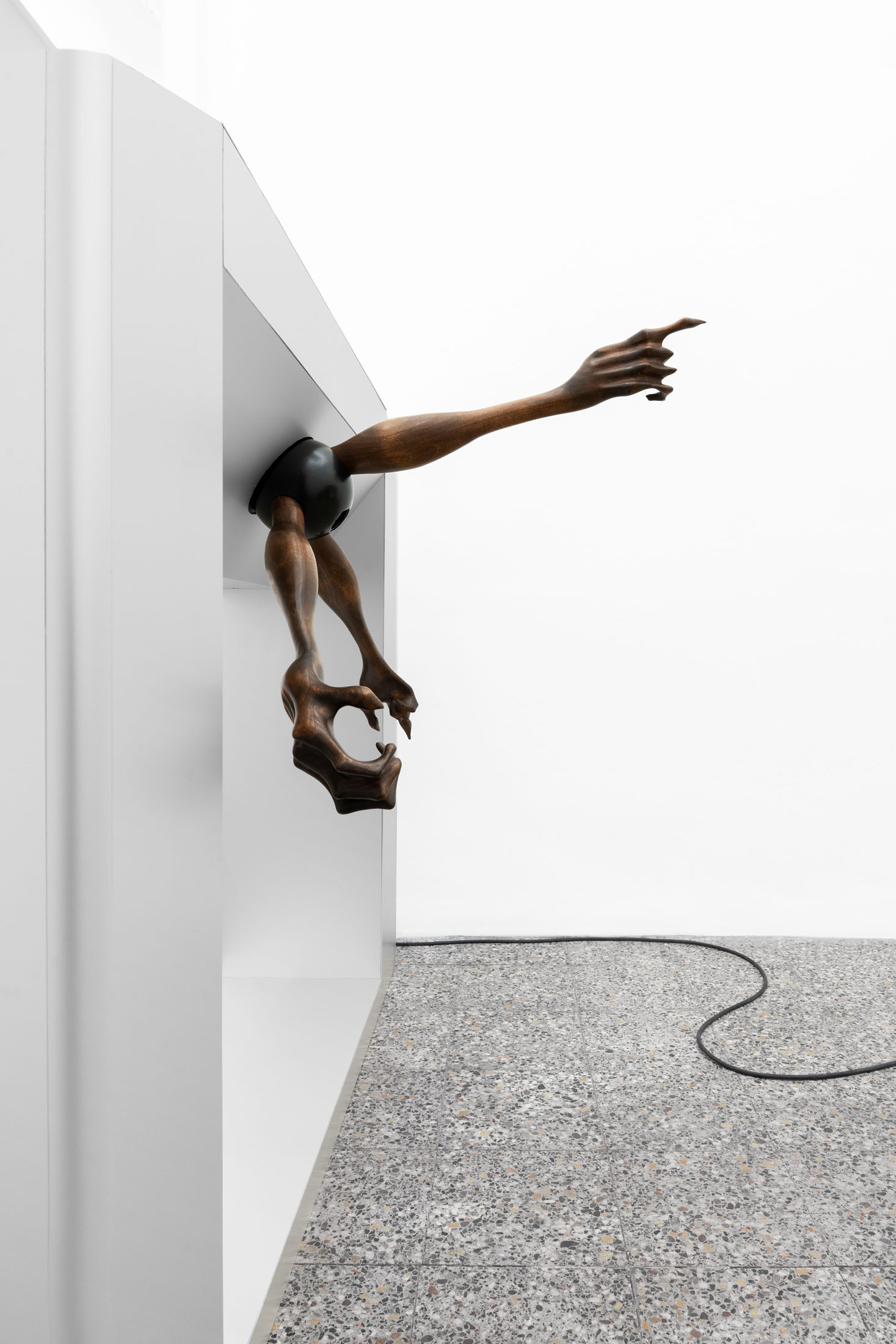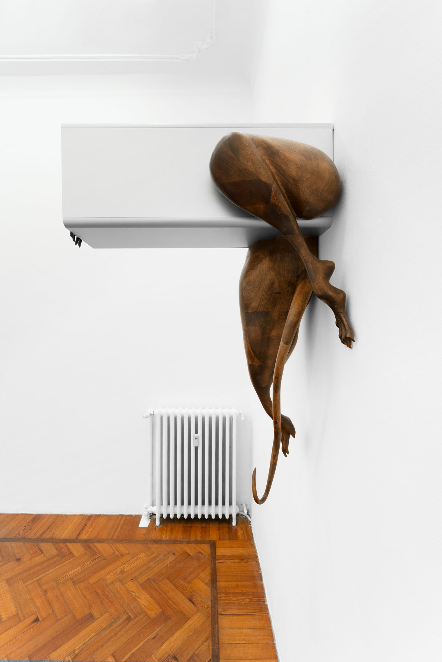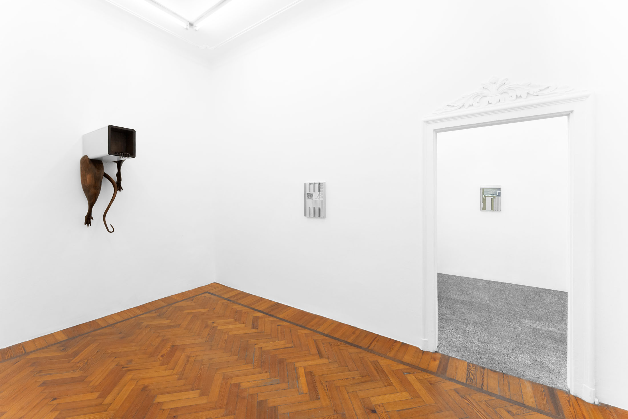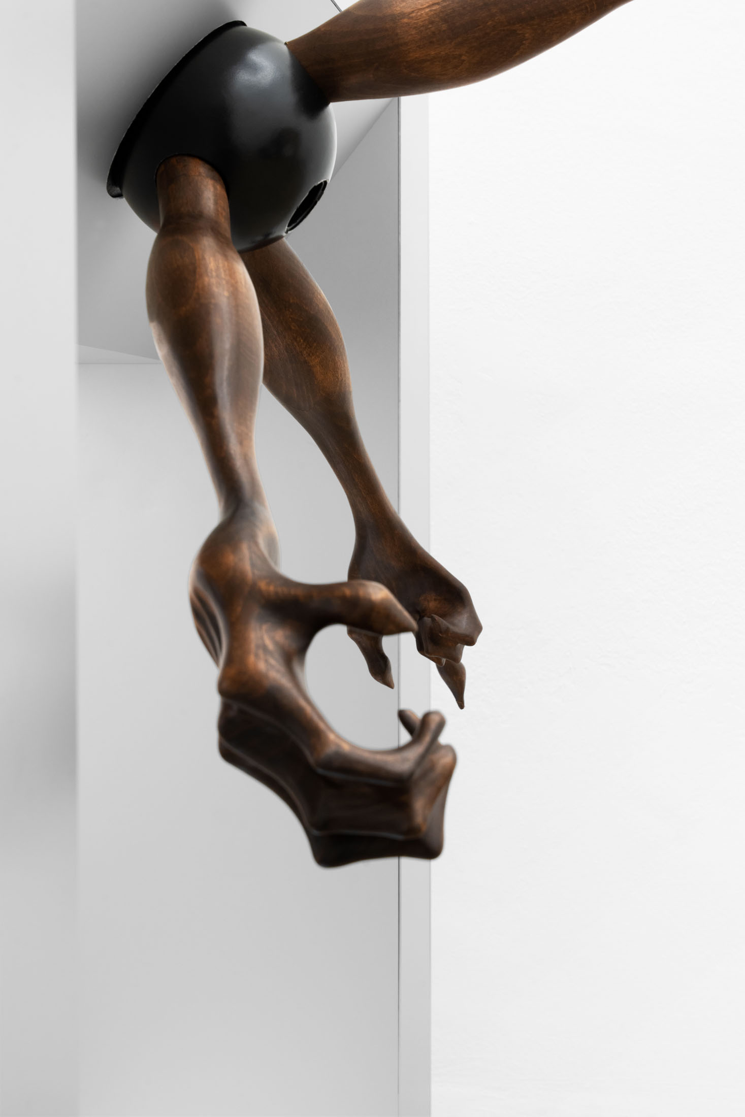 This figure, in the exhibition, takes on different forms and accompanies us in a path of progressive manifestation; if in the first room, with Hitchcockian suspense, the artist warns us of its presence by leaving some hidden but unmistakable traces, such as “Apple” — an apple core gnawed away, made in beech wood — in the second, our supposition becomes certainty. “Stryge #6” stands out hanging on the wall like a contemporary gargoyle, although its features do not recall the grotesque decorations of a cathedral but rather the smooth and translucent surfaces of modernist architecture; within this duct slide the shapes of a mysterious being between man and rodent, completing this sort of summa work that gathers around itself all the concepts revolving around this exhibition. Between the two rooms, “Stryge #5” — a work in the form of a real subway turnstile whose arms, however, take the shape of enigmatic wooden limbs — functions as a filter, an ideal portal to this world foreign to us; deprived of its didactic value (due to its overturned position and off-axis with respect to the real passage), the work comes alive only if our body comes into contact with these “other” presences… as if the artist were inviting us to a metaphorical gesture of confrontation and overcoming of our fears. Completing the exhibition are four airbrush paintings on anodized aluminum entitled “H&S (Atomic Purple)”; inspired by the Game Boy model from 1998 (whose transparent plastic shell allowed one to glimpse the technological organs of the handheld console), they represent a combination of small figures or fragments of the body joined to networks of cables and other underground infrastructural pipes, “landscapes” of which the artist was able to have direct experience due to a large metropolitan excavation right in front of the door of his studio in Aubervilliers.