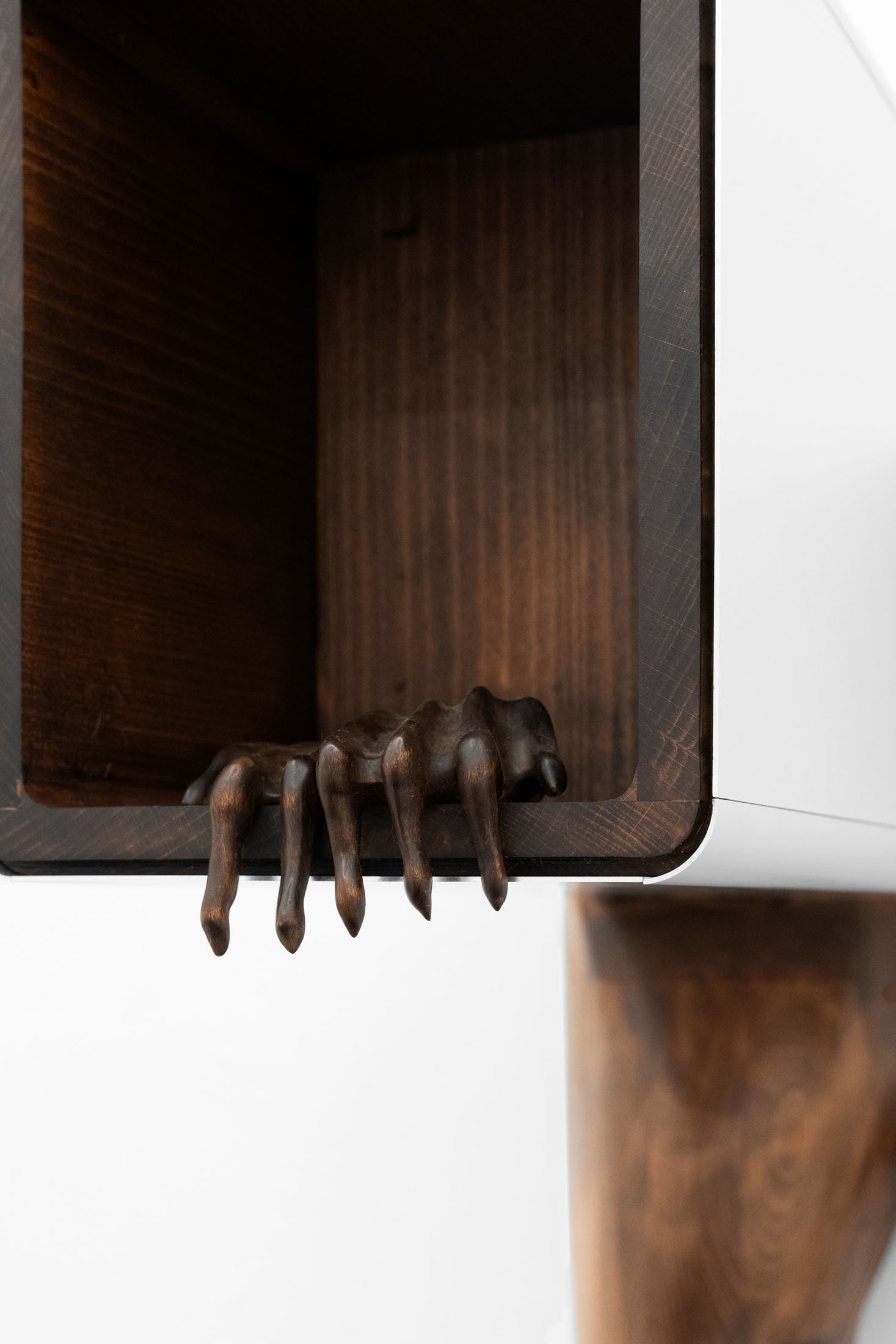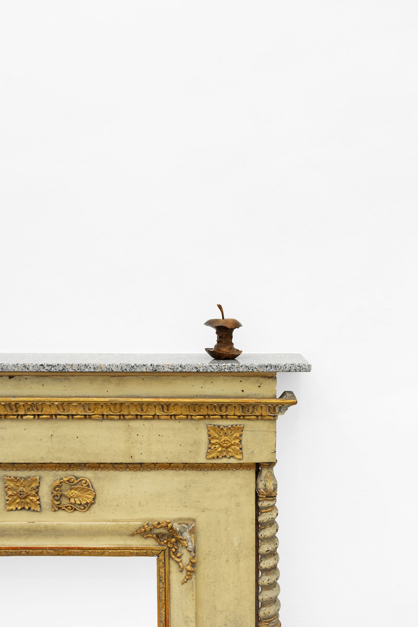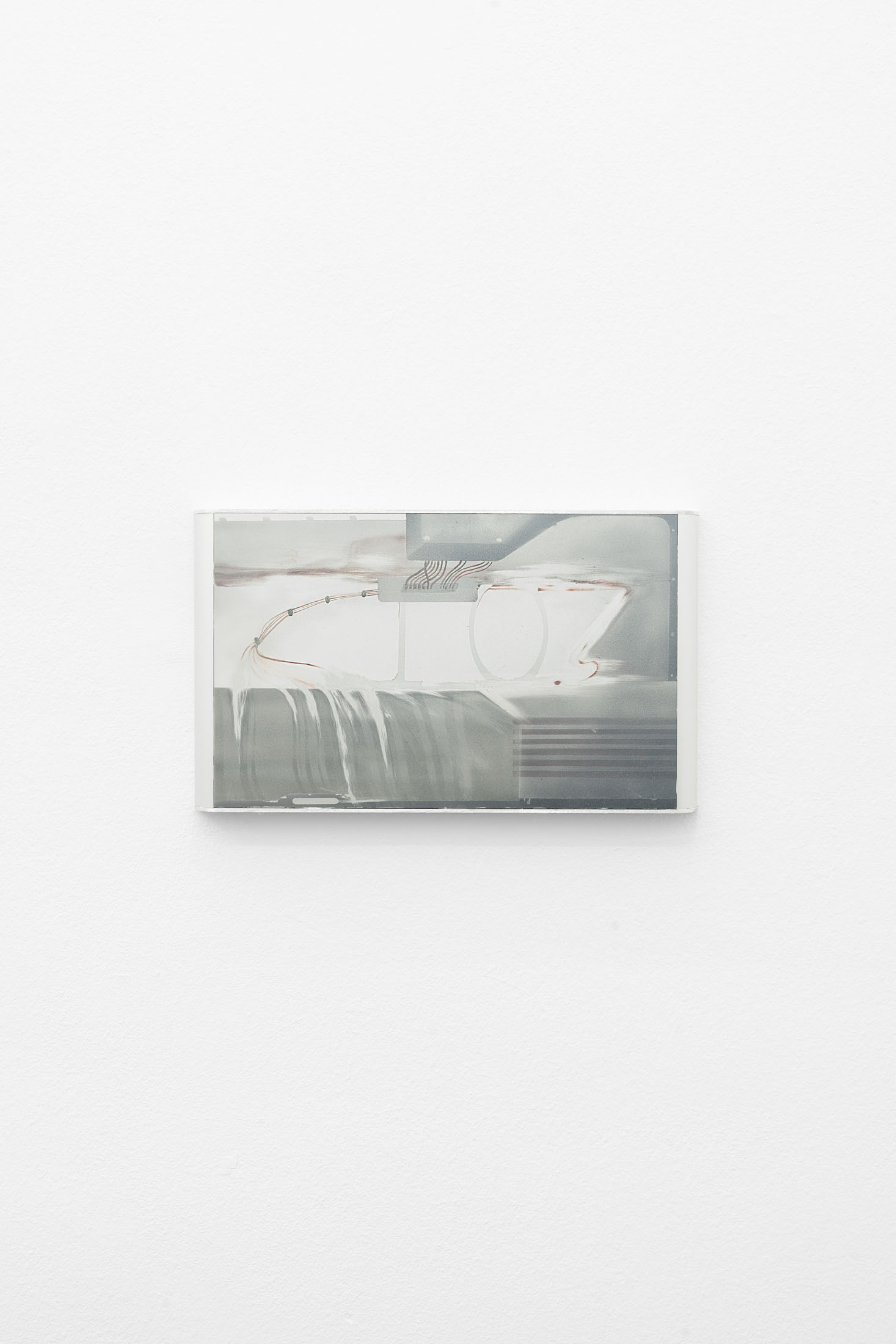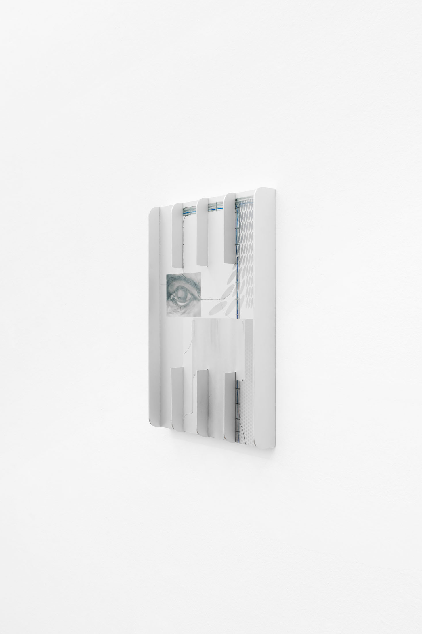 This figure, in the exhibition, takes on different forms and accompanies us in a path of progressive manifestation; if in the first room, with Hitchcockian suspense, the artist warns us of its presence by leaving some hidden but unmistakable traces, such as “Apple” — an apple core gnawed away, made in beech wood — in the second, our supposition becomes certainty. “Stryge #6” stands out hanging on the wall like a contemporary gargoyle, although its features do not recall the grotesque decorations of a cathedral but rather the smooth and translucent surfaces of modernist architecture; within this duct slide the shapes of a mysterious being between man and rodent, completing this sort of summa work that gathers around itself all the concepts revolving around this exhibition. Between the two rooms, “Stryge #5” — a work in the form of a real subway turnstile whose arms, however, take the shape of enigmatic wooden limbs — functions as a filter, an ideal portal to this world foreign to us; deprived of its didactic value (due to its overturned position and off-axis with respect to the real passage), the work comes alive only if our body comes into contact with these “other” presences… as if the artist were inviting us to a metaphorical gesture of confrontation and overcoming of our fears. Completing the exhibition are four airbrush paintings on anodized aluminum entitled “H&S (Atomic Purple)”; inspired by the Game Boy model from 1998 (whose transparent plastic shell allowed one to glimpse the technological organs of the handheld console), they represent a combination of small figures or fragments of the body joined to networks of cables and other underground infrastructural pipes, “landscapes” of which the artist was able to have direct experience due to a large metropolitan excavation right in front of the door of his studio in Aubervilliers.
