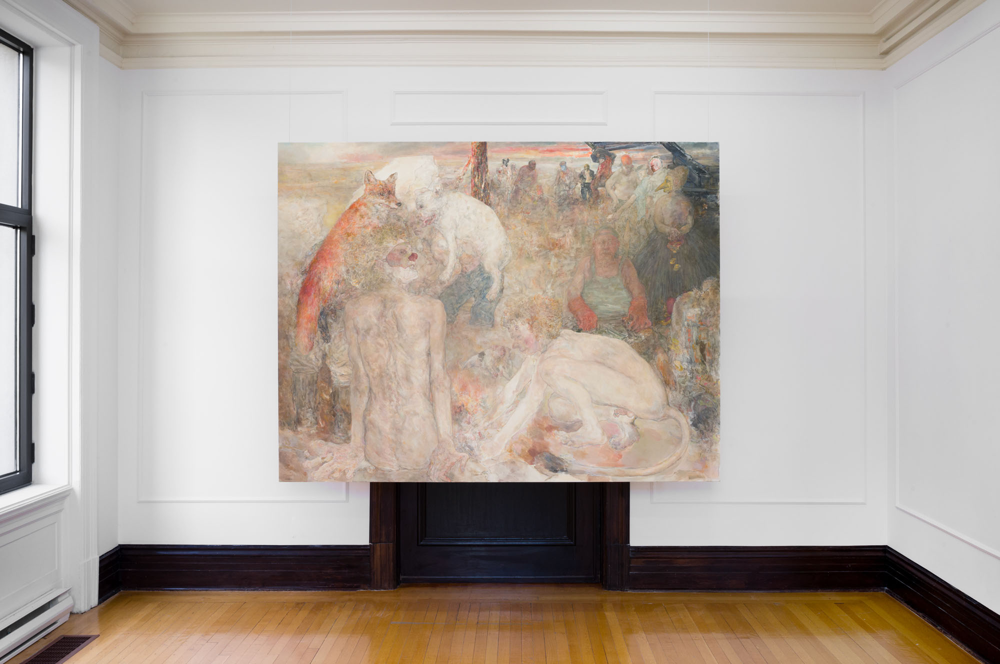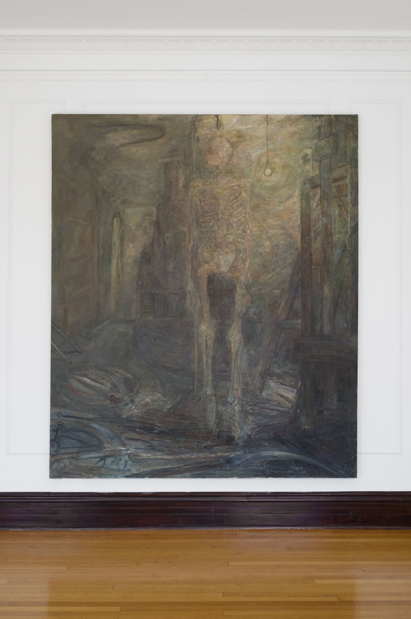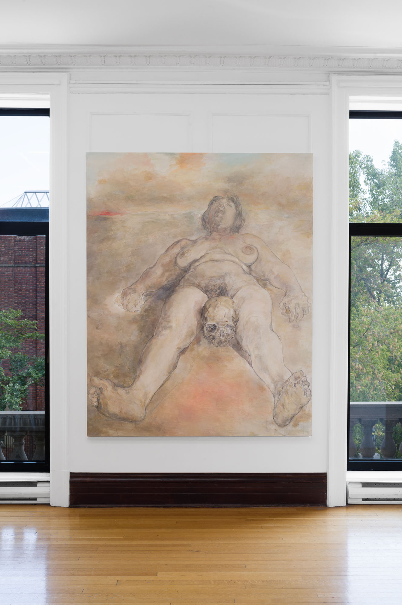 Wagschal’s paintings, monumental yet tender, stage a confrontation with the cycles of life and death. In Colossus (2016), she depicts her own nude body with a skull placed between her legs, a provocation that collapses the inevitabilities of birth and death into a single image. Mortality surfaces again in Atelier (1991), inspired by a real skeleton that once hung in Concordia University’s art department until the early 1990s. Wagschal’s practice oscillates between historical, fictional, and autobiographical, producing figures that loom larger than life yet remain anchored within resonant scenes that join recollection and fantasy.