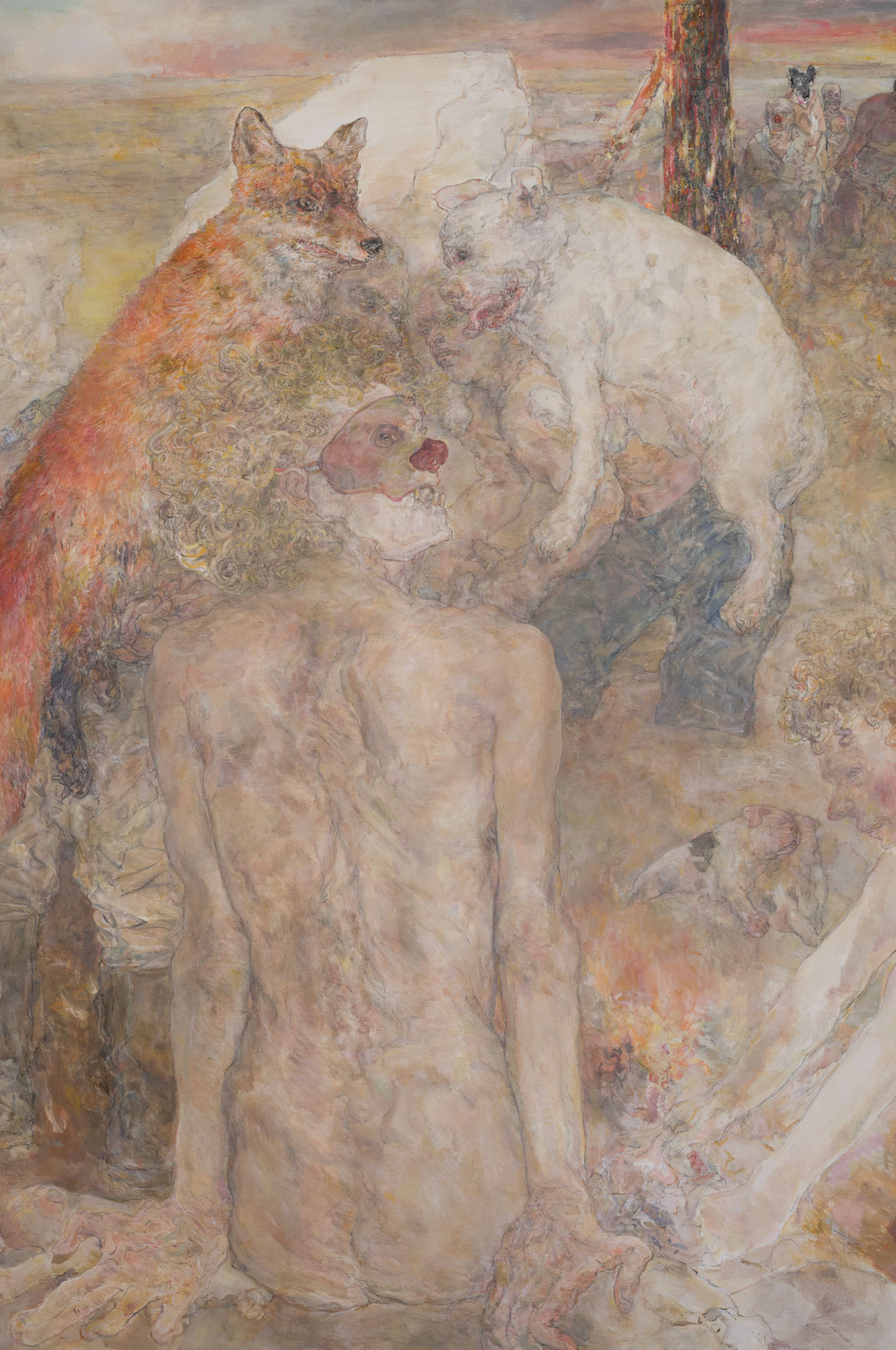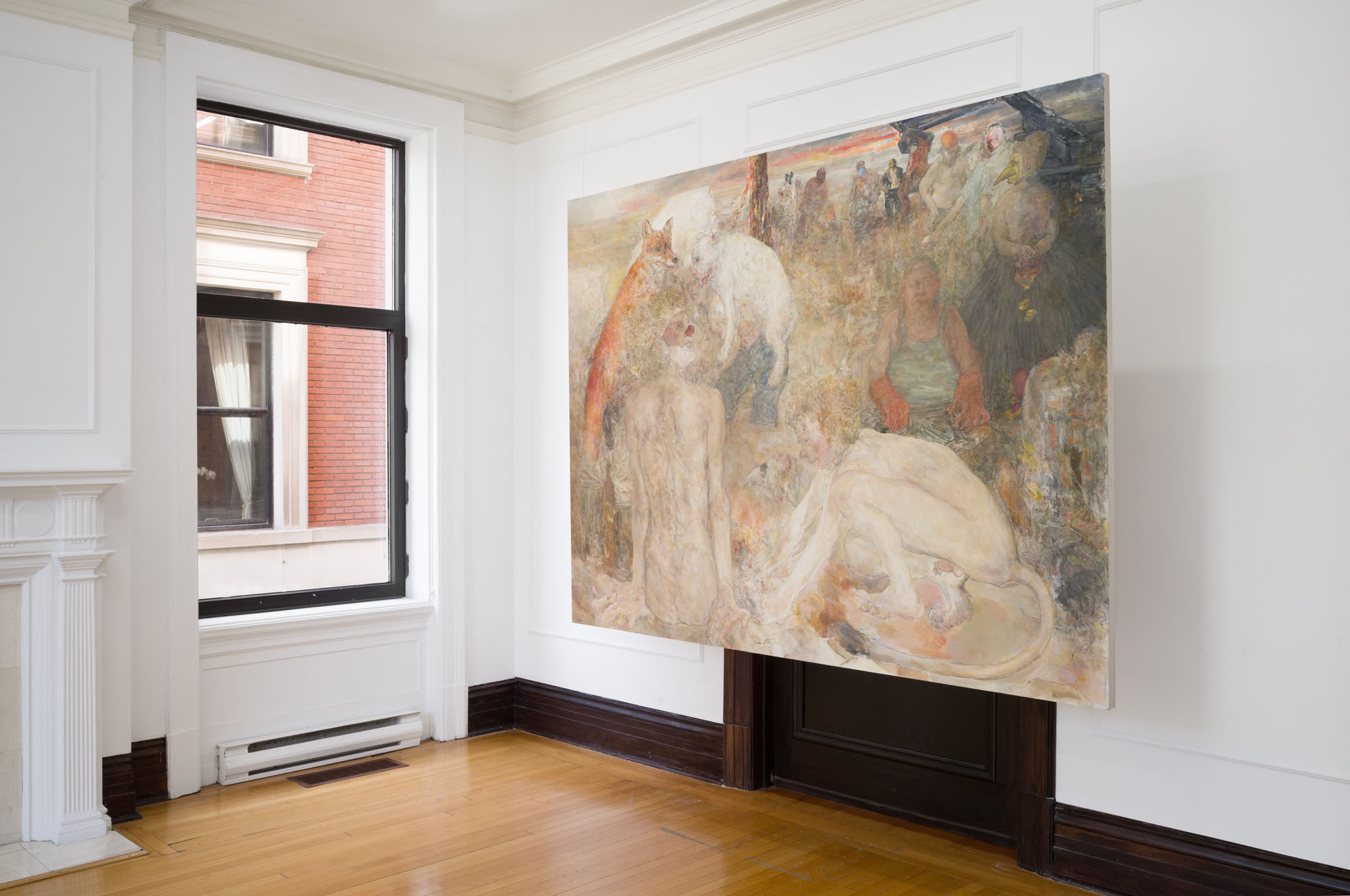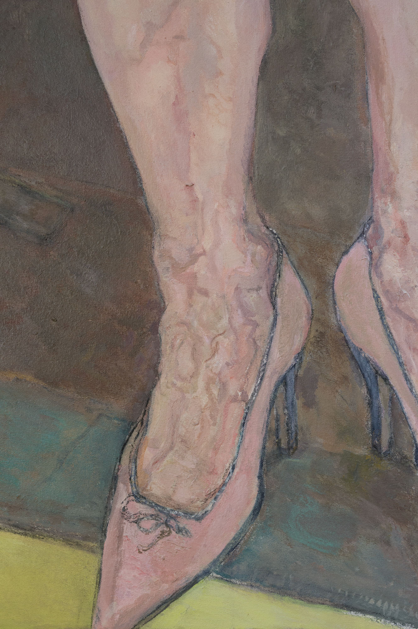 Wagschal’s paintings, monumental yet tender, stage a confrontation with the cycles of life and death. In Colossus (2016), she depicts her own nude body with a skull placed between her legs, a provocation that collapses the inevitabilities of birth and death into a single image. Mortality surfaces again in Atelier (1991), inspired by a real skeleton that once hung in Concordia University’s art department until the early 1990s. Wagschal’s practice oscillates between historical, fictional, and autobiographical, producing figures that loom larger than life yet remain anchored within resonant scenes that join recollection and fantasy.