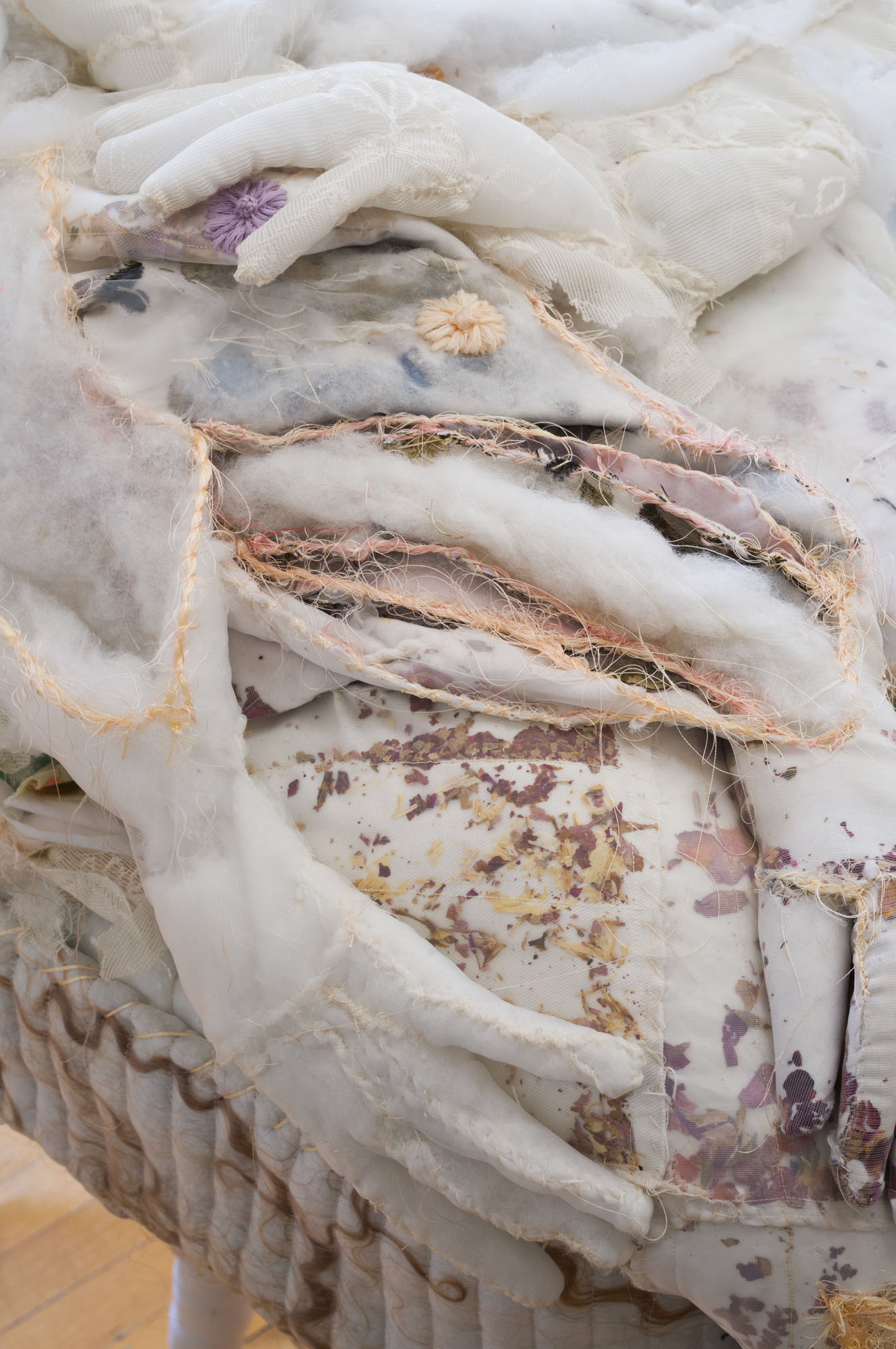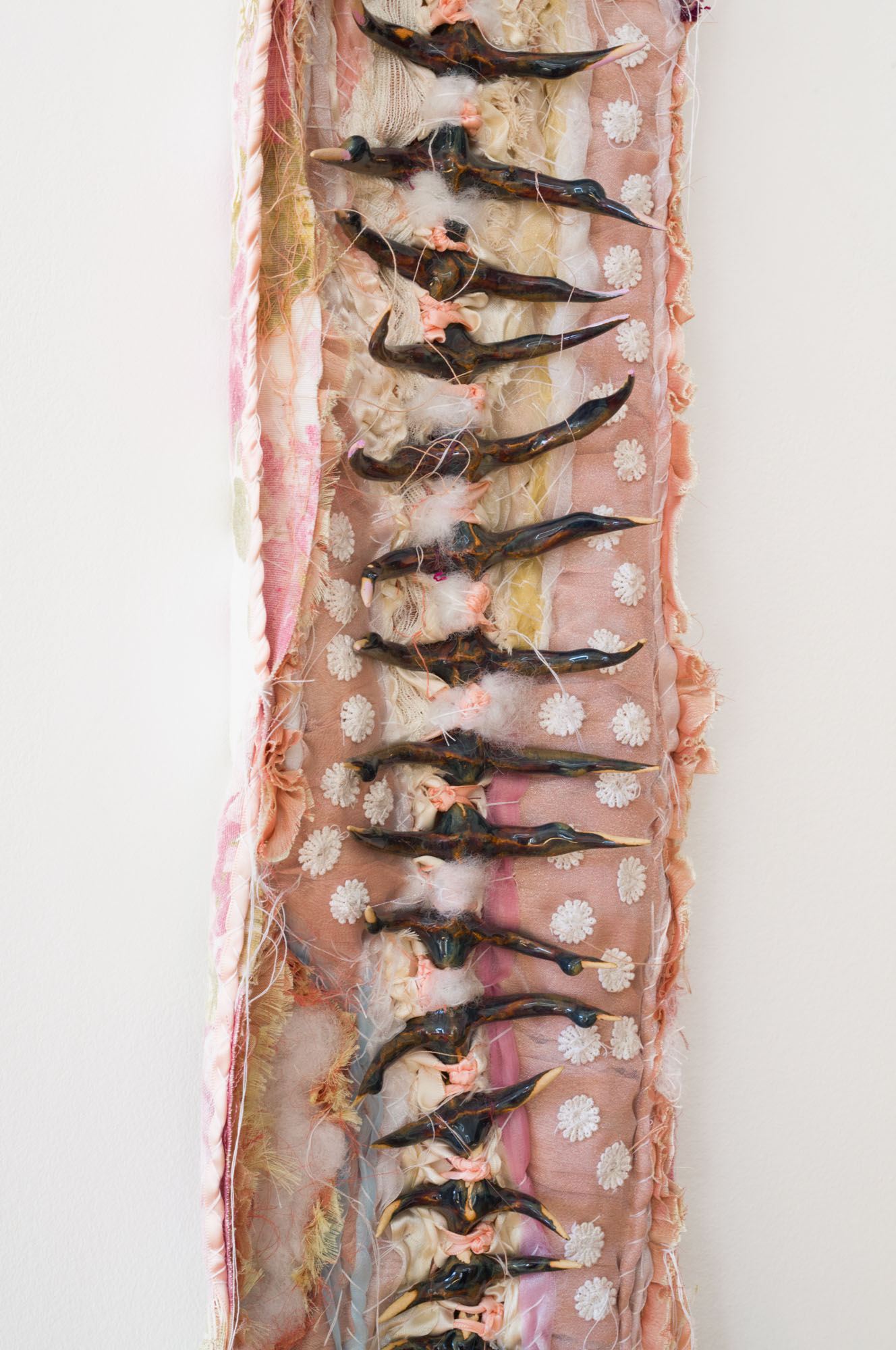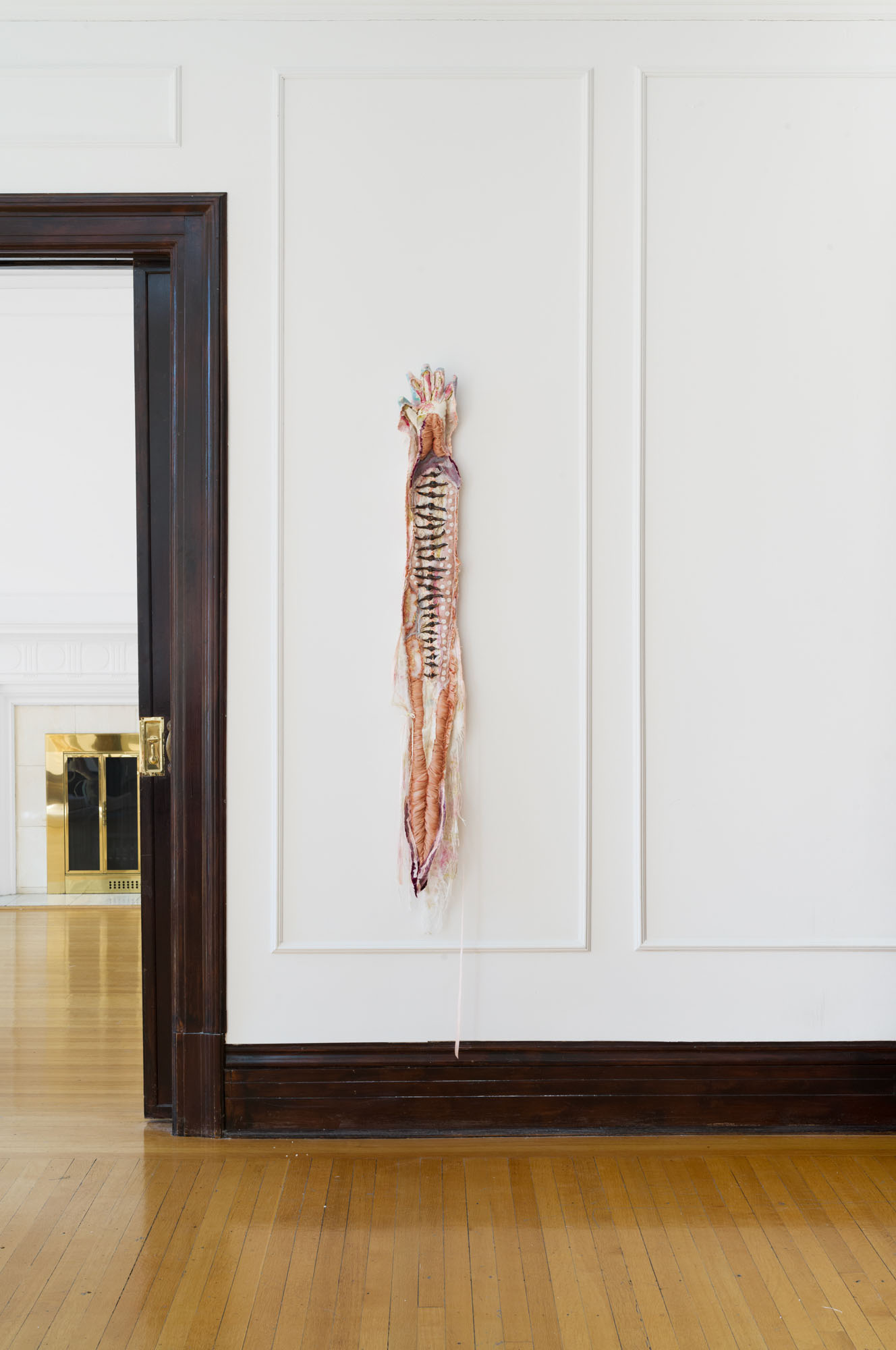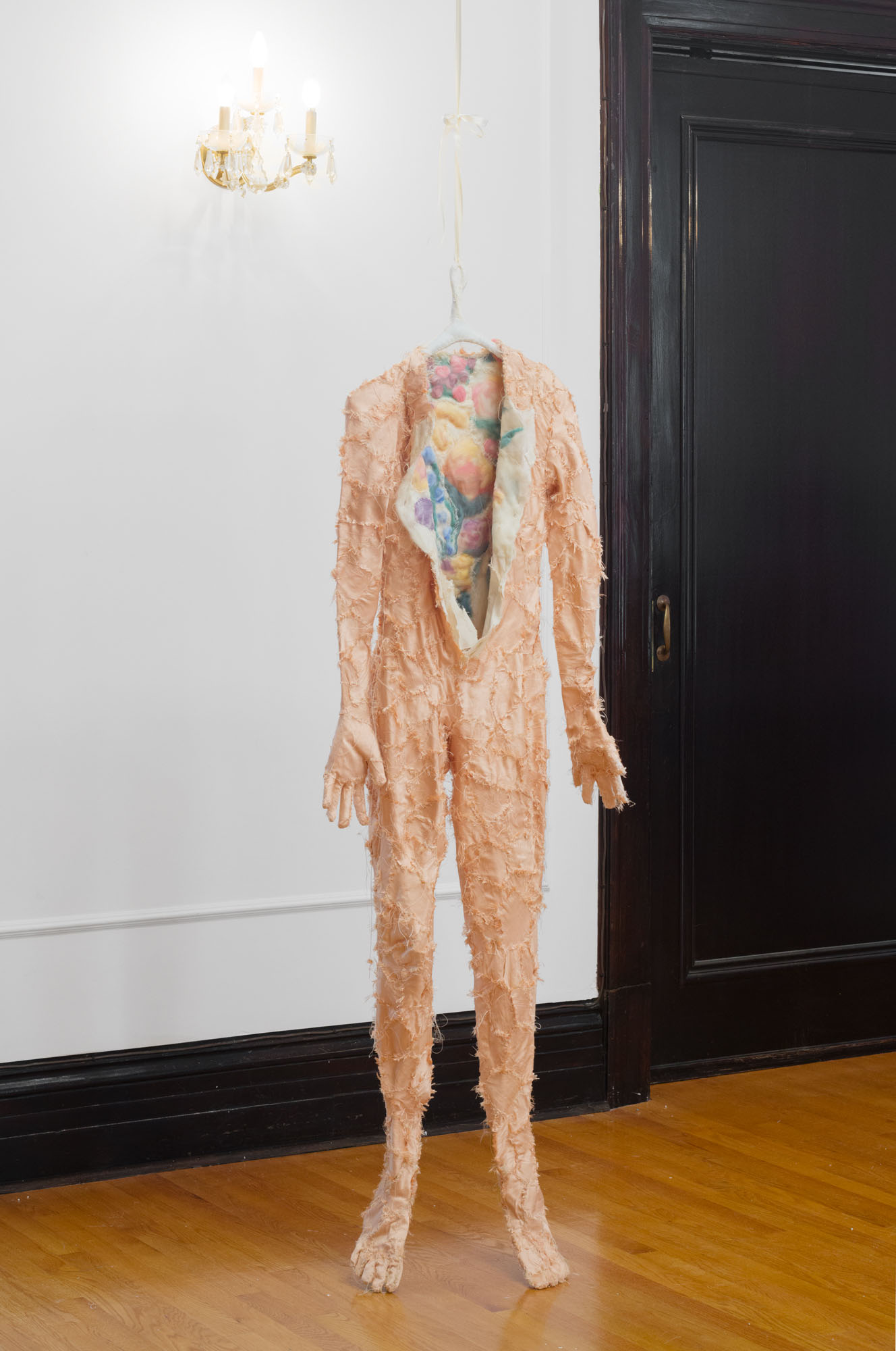 Among the exhibition’s most striking works, The Melancholy of Carnivores (2014) confronts the viewer with the ethics of consumption. The work, spurred by Wagschal’s conflicted relationship to eating meat to sustain the body, while grappling with the brutality it entails, opens the way for a broader meditation on complicity, appetite, and the violence inherent to our survival. In her portraits—whether of family members, friends, or models—inti-macy is framed as a space of both care and discomfort. With PK22 (2022), her brush lingers on the frailty of flesh, capturing the strange simultaneity of vulnerability and monumentality. Perrault’s works– partly created in dialogue with Wagschal’s selection–expand this reflection into sculptural form. La fontaine (2025) evokes the romanticized death of drowned women, bodies mythologized, eroticized, and erased by centuries of artistic and literary representation. Flowers, fabric, and hair intertwined with silicone and water, conjure a reliquary of loss that is at once devotional and unsettling. In Le clown (2025), a precarious figure stitched together from stacked textiles and found objects sits atop a rocking easel, teetering between humor and despair. The work considers consumption—of alcohol, drugs, sex, or objects—as both a coping mechanism and a form of escape and materializes the vertiginous instability it produces. Similar to Colossus, other works by Perrault turn toward self-portraiture and inheritance. Ma peau de 29 ans (2025) belongs to an ongoing series in which the artist molds fabric directly on her own body to create self-portraits, or “second skins” that captures to the continuity, transformation and regeneration of corporeal memory. De passage (2025) extends this inquiry further into maternal lineage, invoking the ways trauma and experience are transmitted across generations, carried in flesh, fabric, and bone.