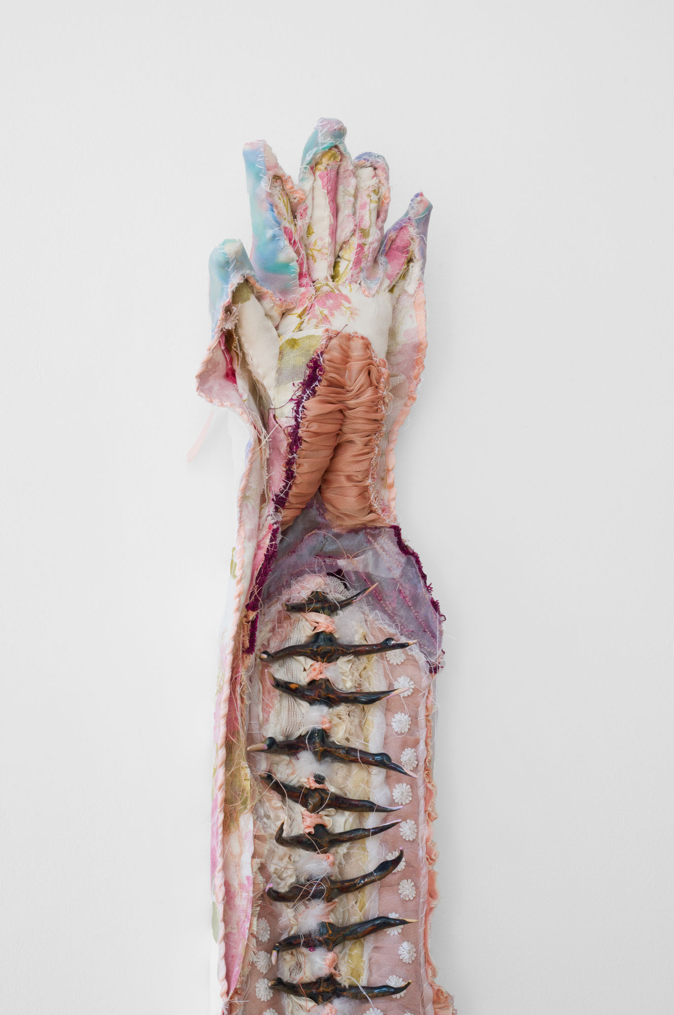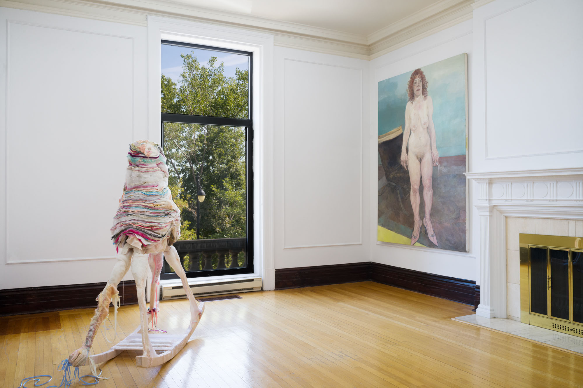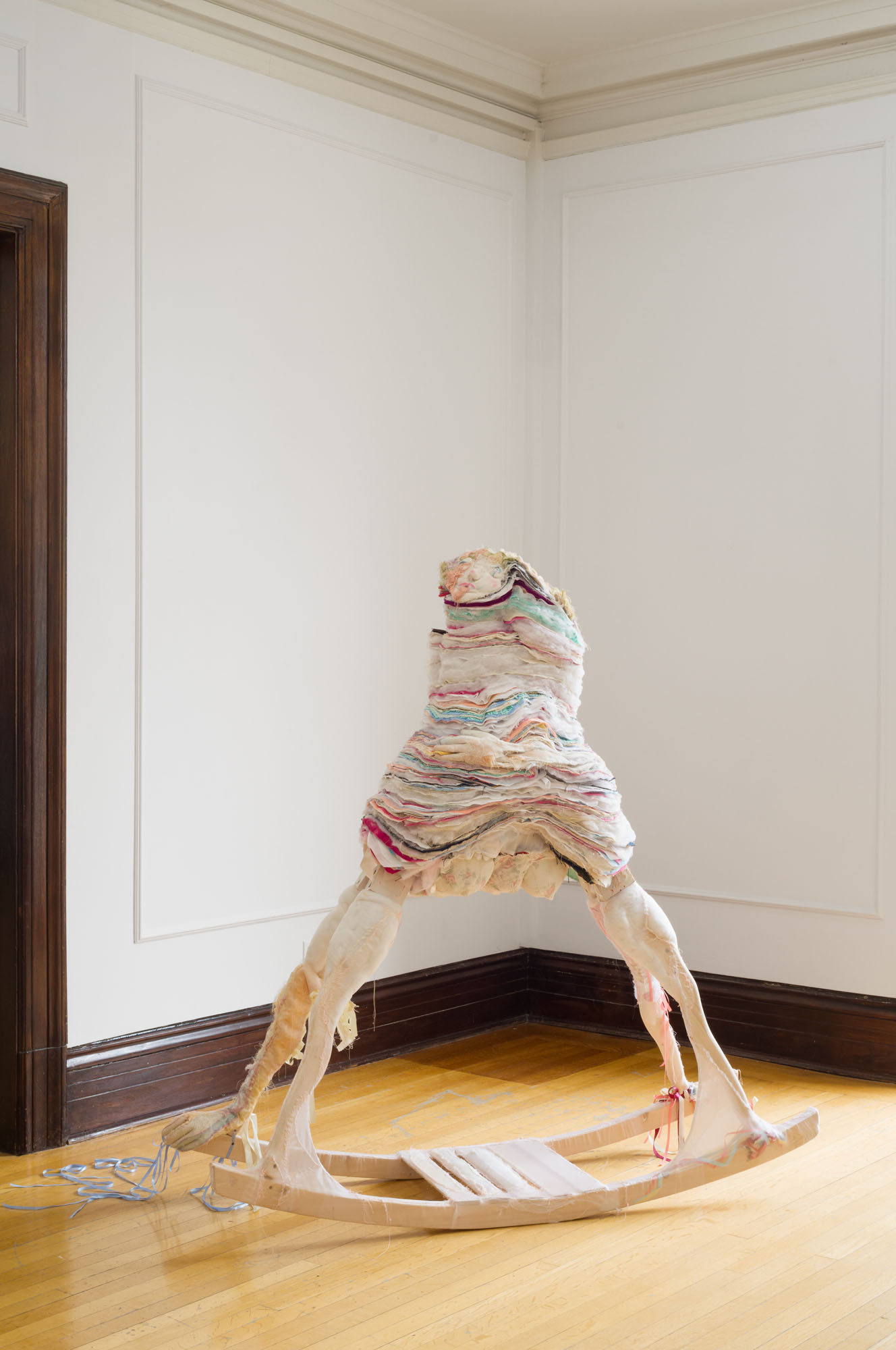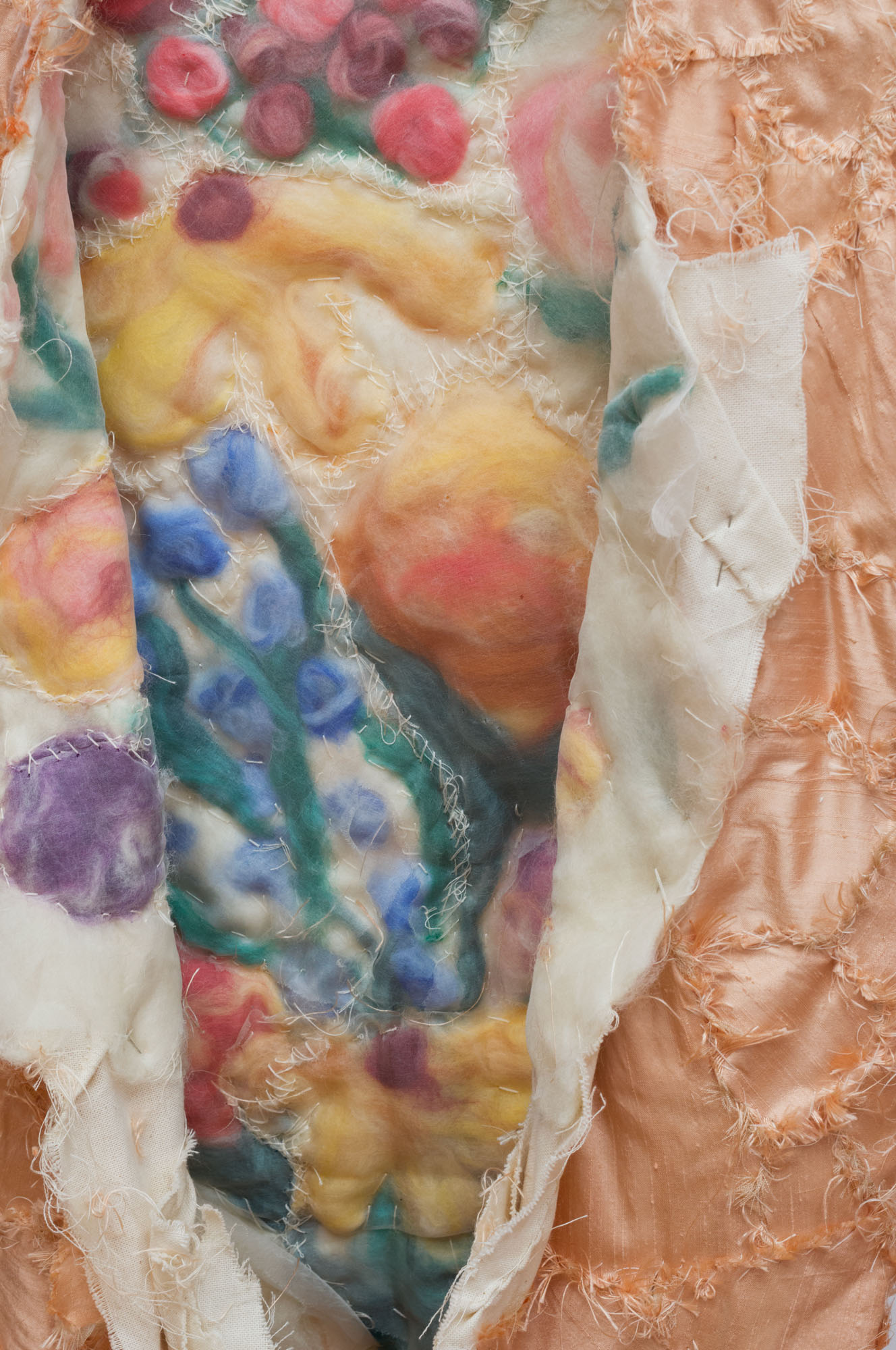 Among the exhibition’s most striking works, The Melancholy of Carnivores (2014) confronts the viewer with the ethics of consumption. The work, spurred by Wagschal’s conflicted relationship to eating meat to sustain the body, while grappling with the brutality it entails, opens the way for a broader meditation on complicity, appetite, and the violence inherent to our survival. In her portraits—whether of family members, friends, or models—inti-macy is framed as a space of both care and discomfort. With PK22 (2022), her brush lingers on the frailty of flesh, capturing the strange simultaneity of vulnerability and monumentality. Perrault’s works– partly created in dialogue with Wagschal’s selection–expand this reflection into sculptural form. La fontaine (2025) evokes the romanticized death of drowned women, bodies mythologized, eroticized, and erased by centuries of artistic and literary representation. Flowers, fabric, and hair intertwined with silicone and water, conjure a reliquary of loss that is at once devotional and unsettling. In Le clown (2025), a precarious figure stitched together from stacked textiles and found objects sits atop a rocking easel, teetering between humor and despair. The work considers consumption—of alcohol, drugs, sex, or objects—as both a coping mechanism and a form of escape and materializes the vertiginous instability it produces. Similar to Colossus, other works by Perrault turn toward self-portraiture and inheritance. Ma peau de 29 ans (2025) belongs to an ongoing series in which the artist molds fabric directly on her own body to create self-portraits, or “second skins” that captures to the continuity, transformation and regeneration of corporeal memory. De passage (2025) extends this inquiry further into maternal lineage, invoking the ways trauma and experience are transmitted across generations, carried in flesh, fabric, and bone.