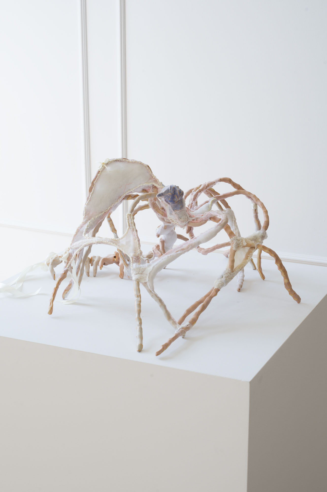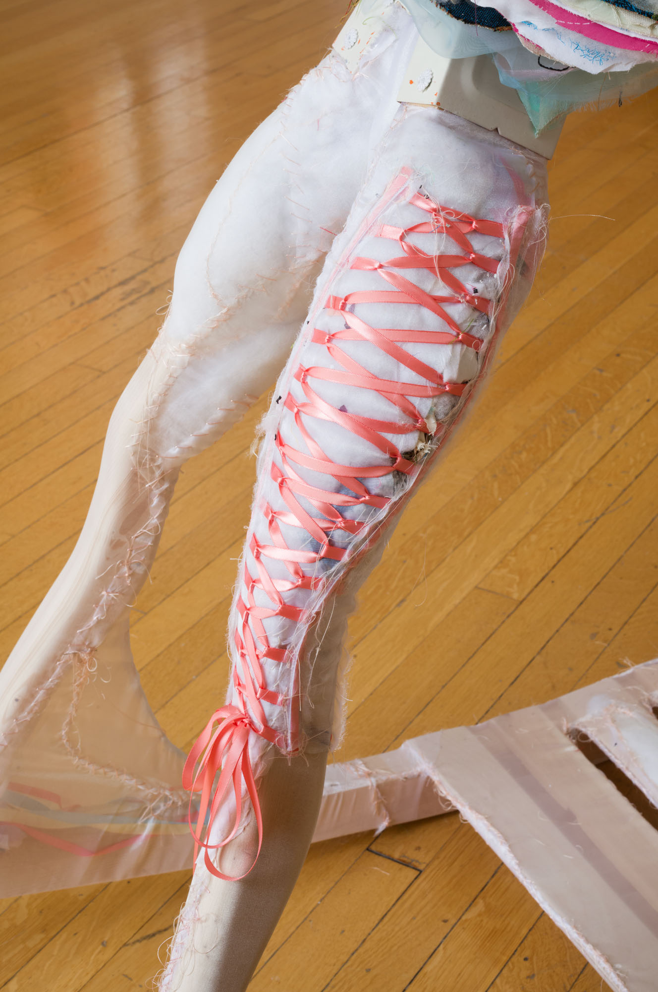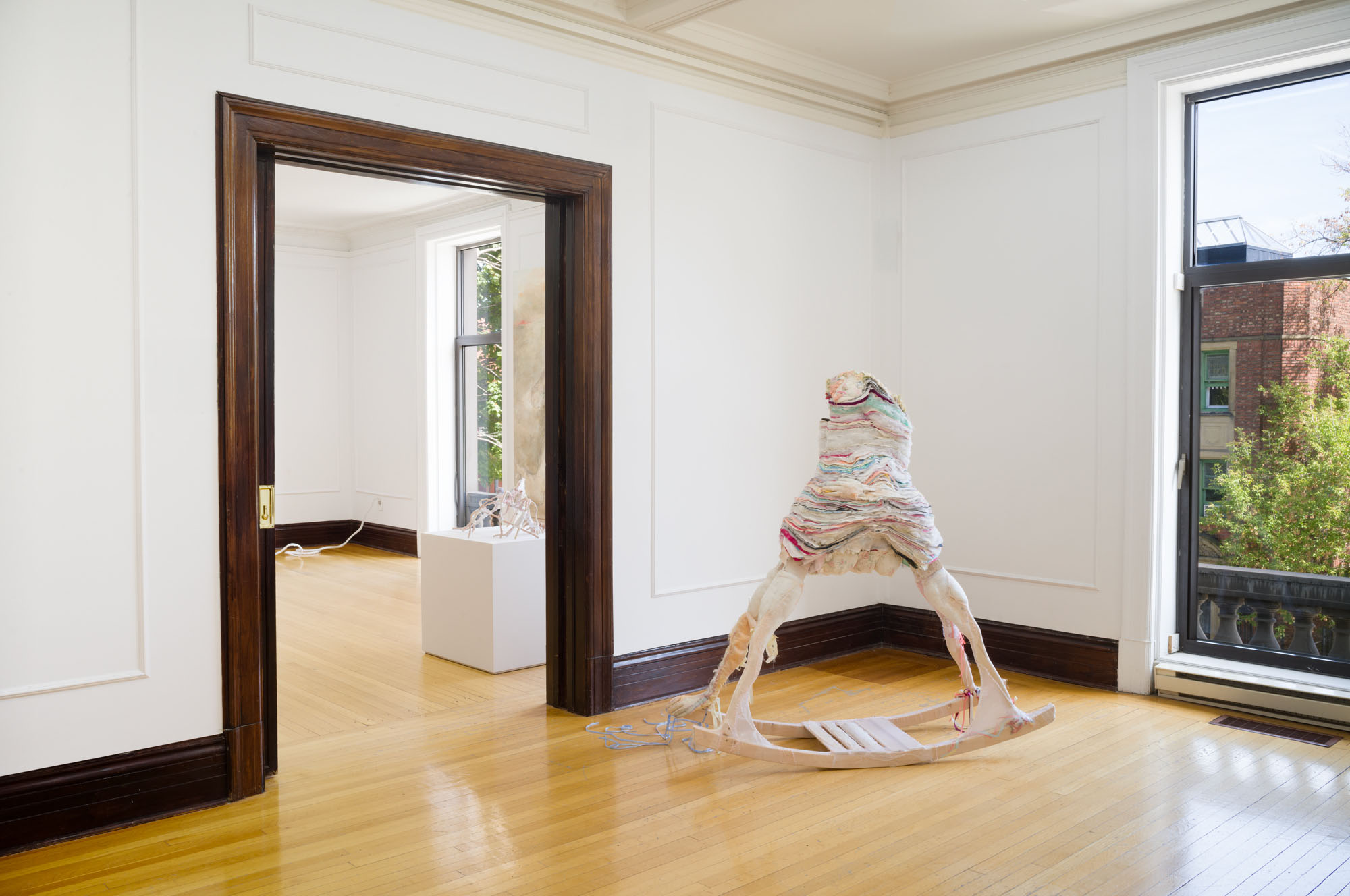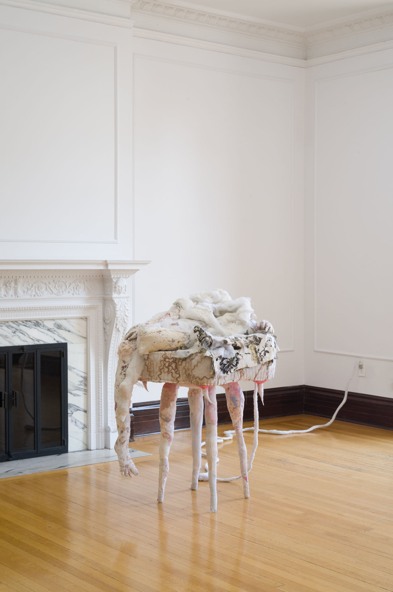 Among the exhibition’s most striking works, The Melancholy of Carnivores (2014) confronts the viewer with the ethics of consumption. The work, spurred by Wagschal’s conflicted relationship to eating meat to sustain the body, while grappling with the brutality it entails, opens the way for a broader meditation on complicity, appetite, and the violence inherent to our survival. In her portraits—whether of family members, friends, or models—inti-macy is framed as a space of both care and discomfort. With PK22 (2022), her brush lingers on the frailty of flesh, capturing the strange simultaneity of vulnerability and monumentality. Perrault’s works– partly created in dialogue with Wagschal’s selection–expand this reflection into sculptural form. La fontaine (2025) evokes the romanticized death of drowned women, bodies mythologized, eroticized, and erased by centuries of artistic and literary representation. Flowers, fabric, and hair intertwined with silicone and water, conjure a reliquary of loss that is at once devotional and unsettling. In Le clown (2025), a precarious figure stitched together from stacked textiles and found objects sits atop a rocking easel, teetering between humor and despair. The work considers consumption—of alcohol, drugs, sex, or objects—as both a coping mechanism and a form of escape and materializes the vertiginous instability it produces. Similar to Colossus, other works by Perrault turn toward self-portraiture and inheritance. Ma peau de 29 ans (2025) belongs to an ongoing series in which the artist molds fabric directly on her own body to create self-portraits, or “second skins” that captures to the continuity, transformation and regeneration of corporeal memory. De passage (2025) extends this inquiry further into maternal lineage, invoking the ways trauma and experience are transmitted across generations, carried in flesh, fabric, and bone.