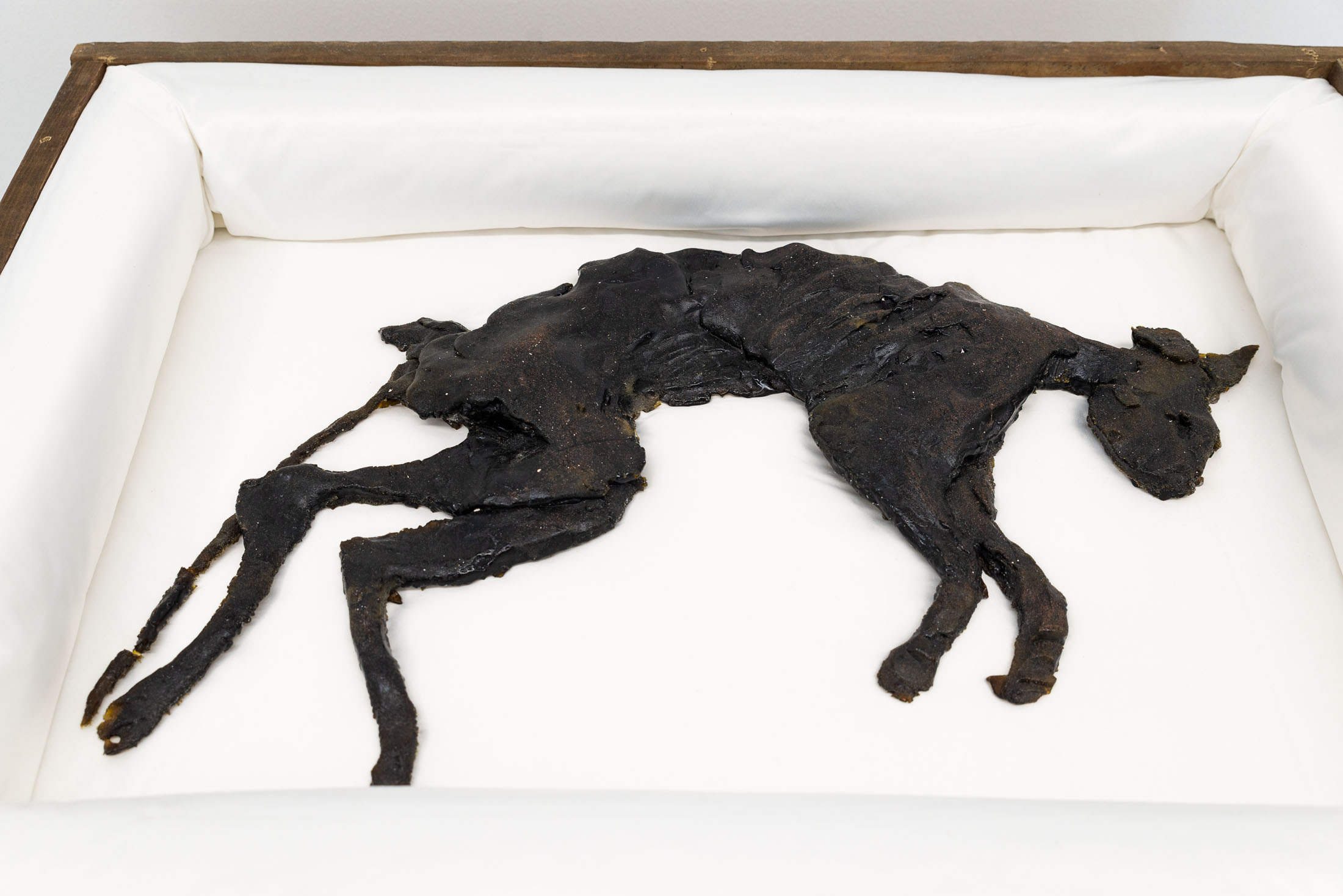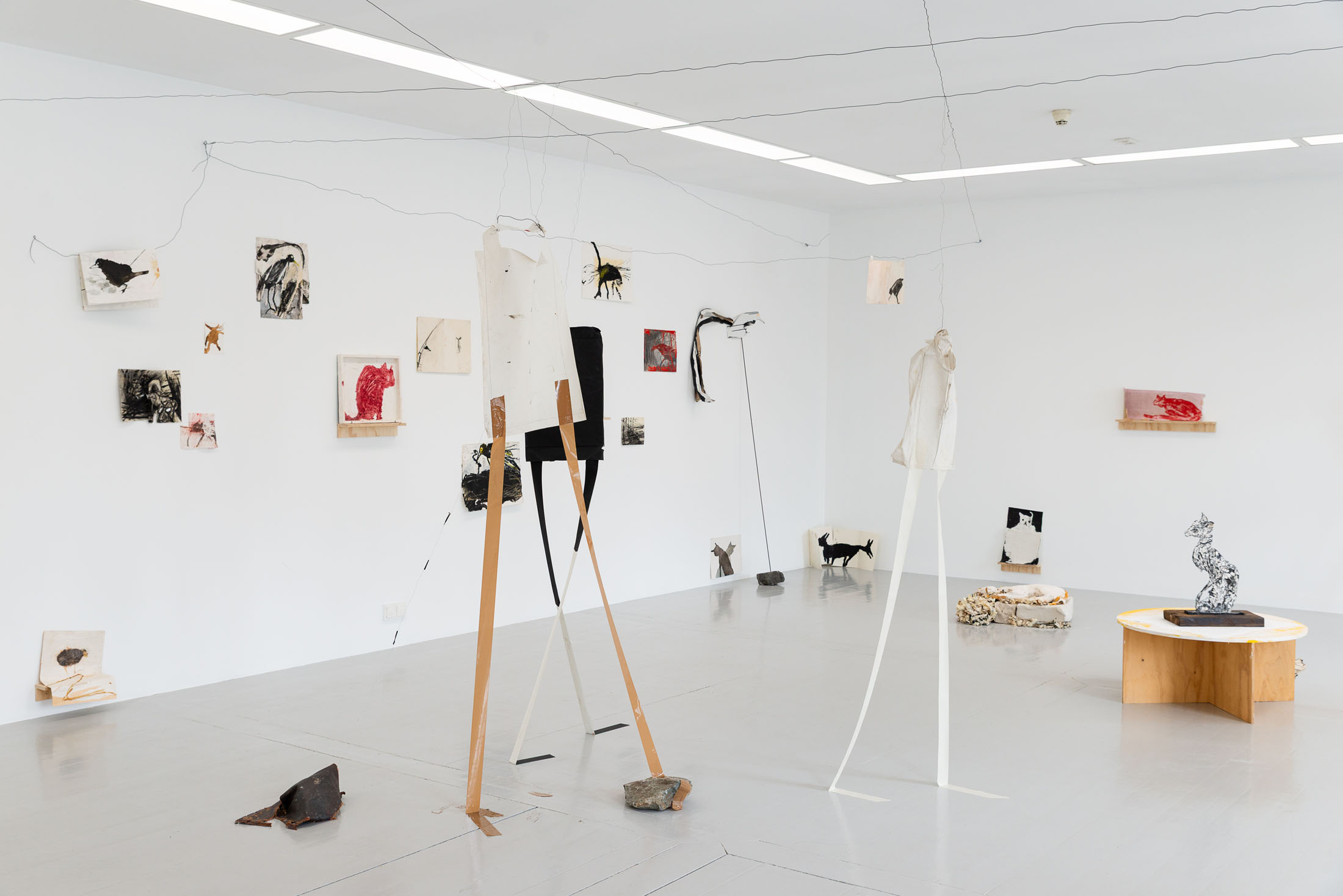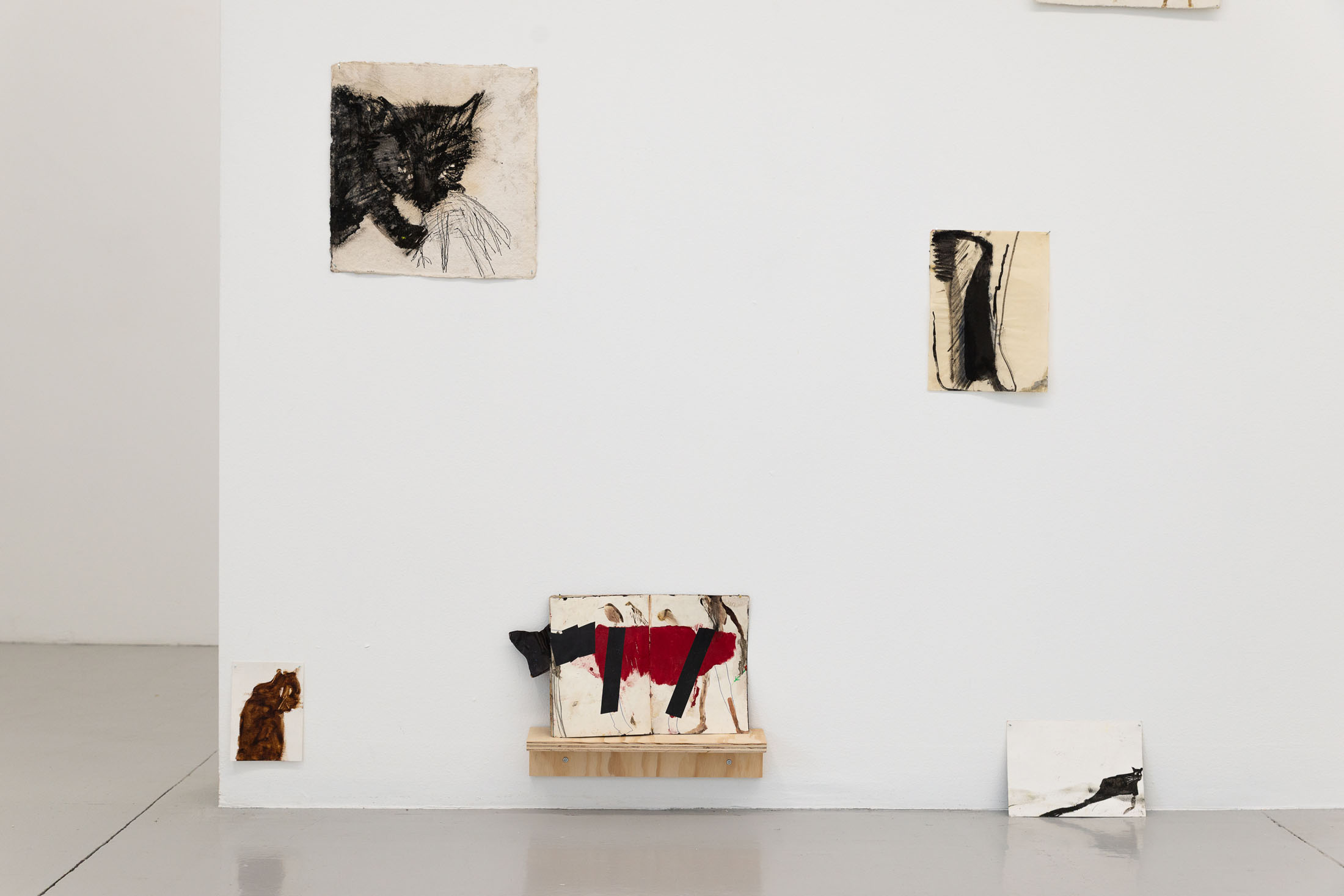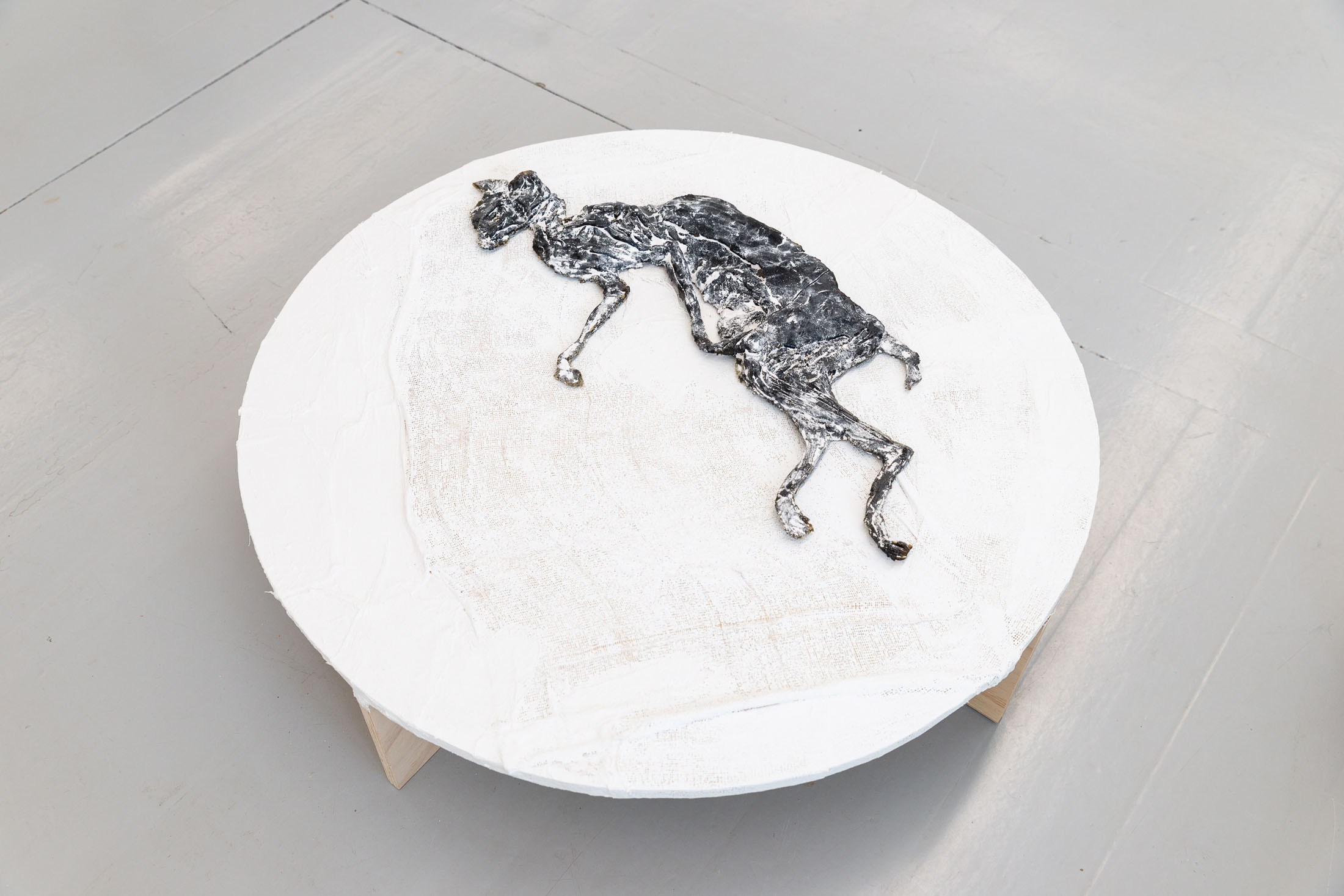 Karnik is especially captured by animals that live alongside humans, such as cats, birds, and dogs. In her depictions she explores the space between observations from daily life and fictional characters. The finished animal sculptures can also be read as portraits, or metaphors for situations and moods. Many of the figures in her exhibition are depicted in states of isolation, injury, or even death – yet several of the works have a playfulness about them.