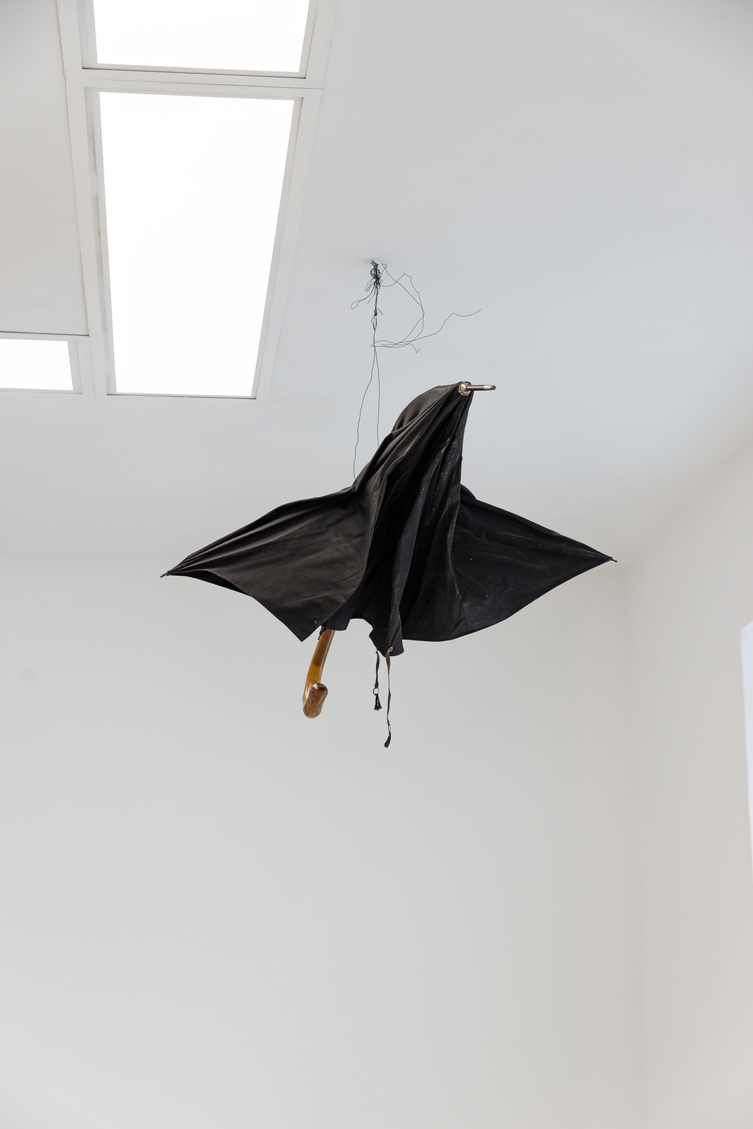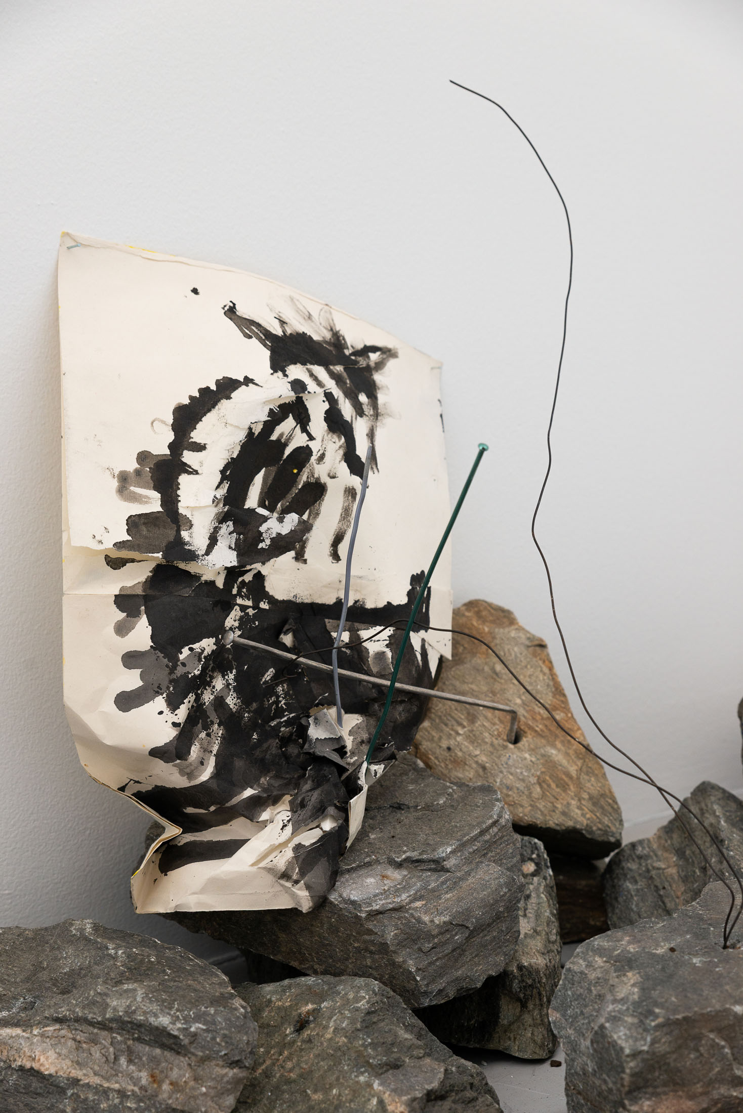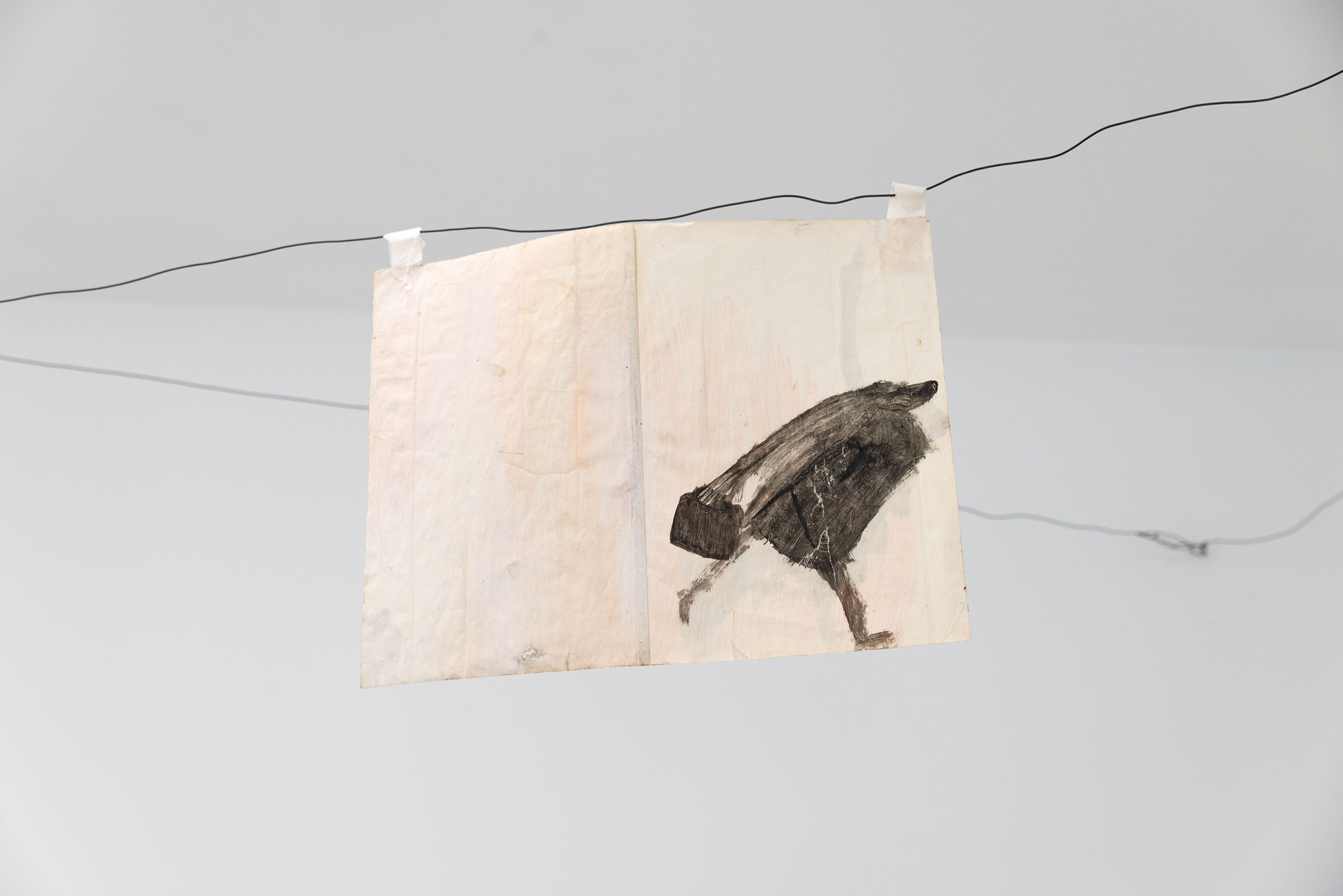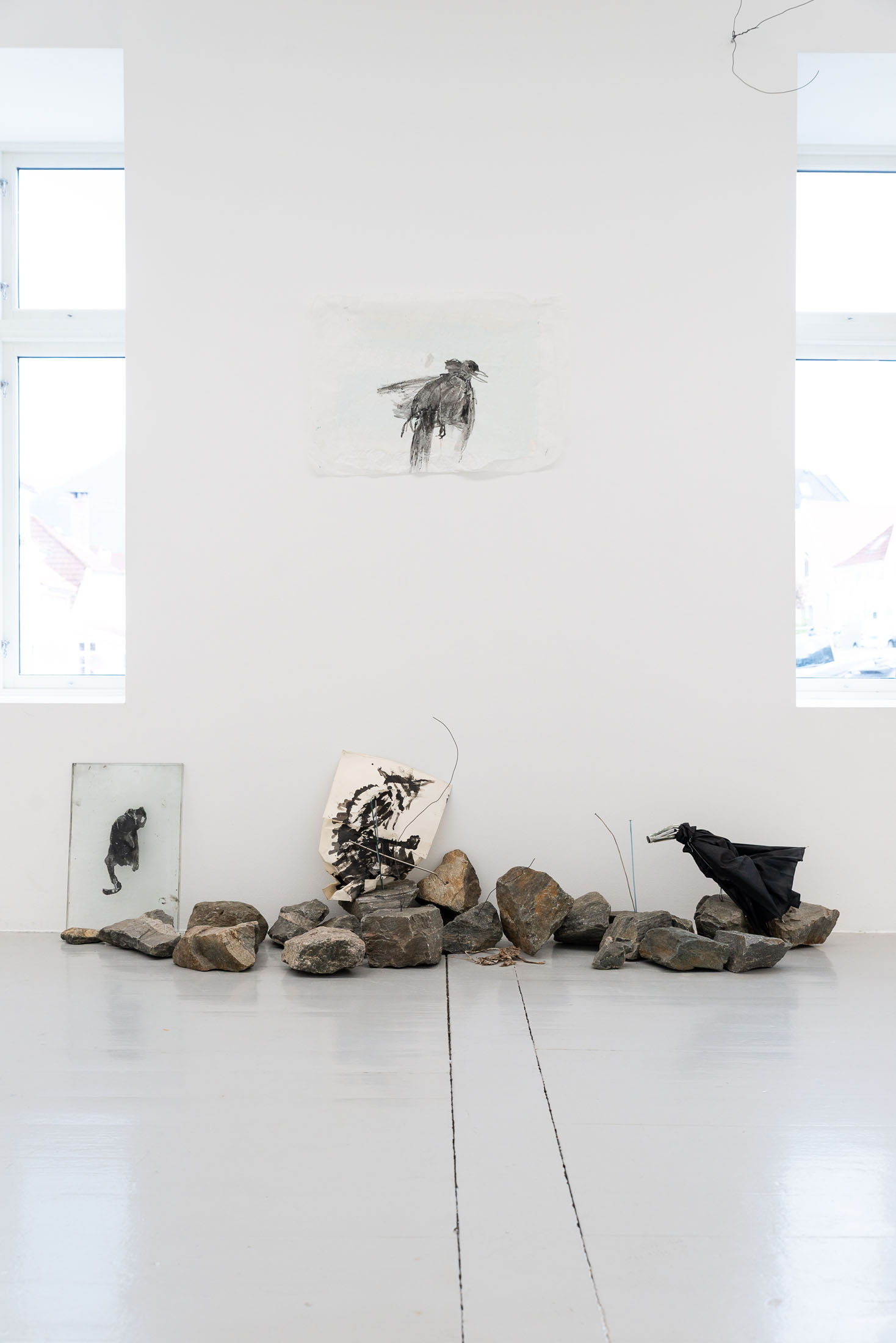 In Vandring we meet a number of animals, both in drawn and sculptural form. Several of them are made from repurposed, sometimes found, materials. Karnik reuses and manipulates drawings on paper, scraps and bits, working with them until each finds its rightful place and purpose. In the exhibition we also encounter sculptures made of glass from broken beer bottles, melted and reshaped, and broken umbrellas that have been transformed into birds.