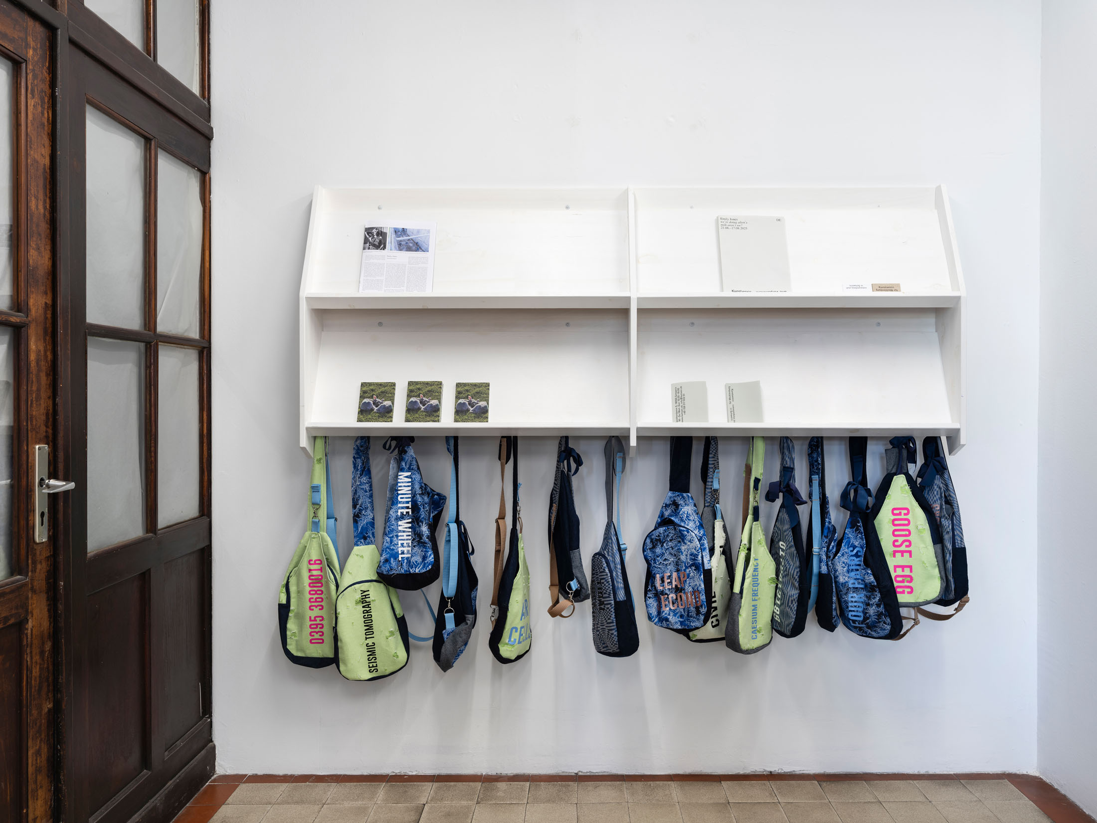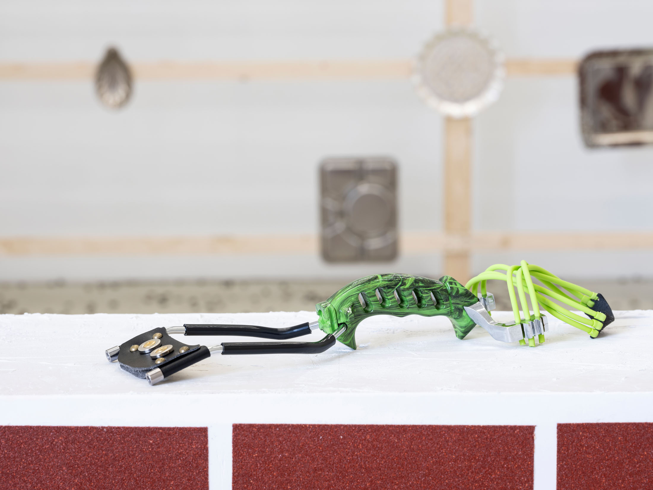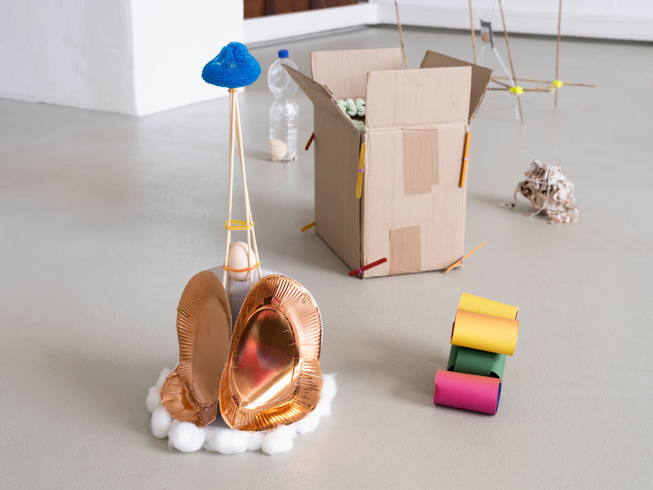 Her artistic repertoire of forms is fed by found objects, materials and visual languages that the artist draws from contexts such as DIY culture, collective self-organisation or educational practices. Organic materials enter into a dialogue with digitally generated forms; everyday objects encounter (mytho-)poetic narratives, creating hybrid spaces of image and meaning. Language does not act as an instrument of control or attribution, but rather as a means of shifting, multiplying or deliberately destabilising meanings.