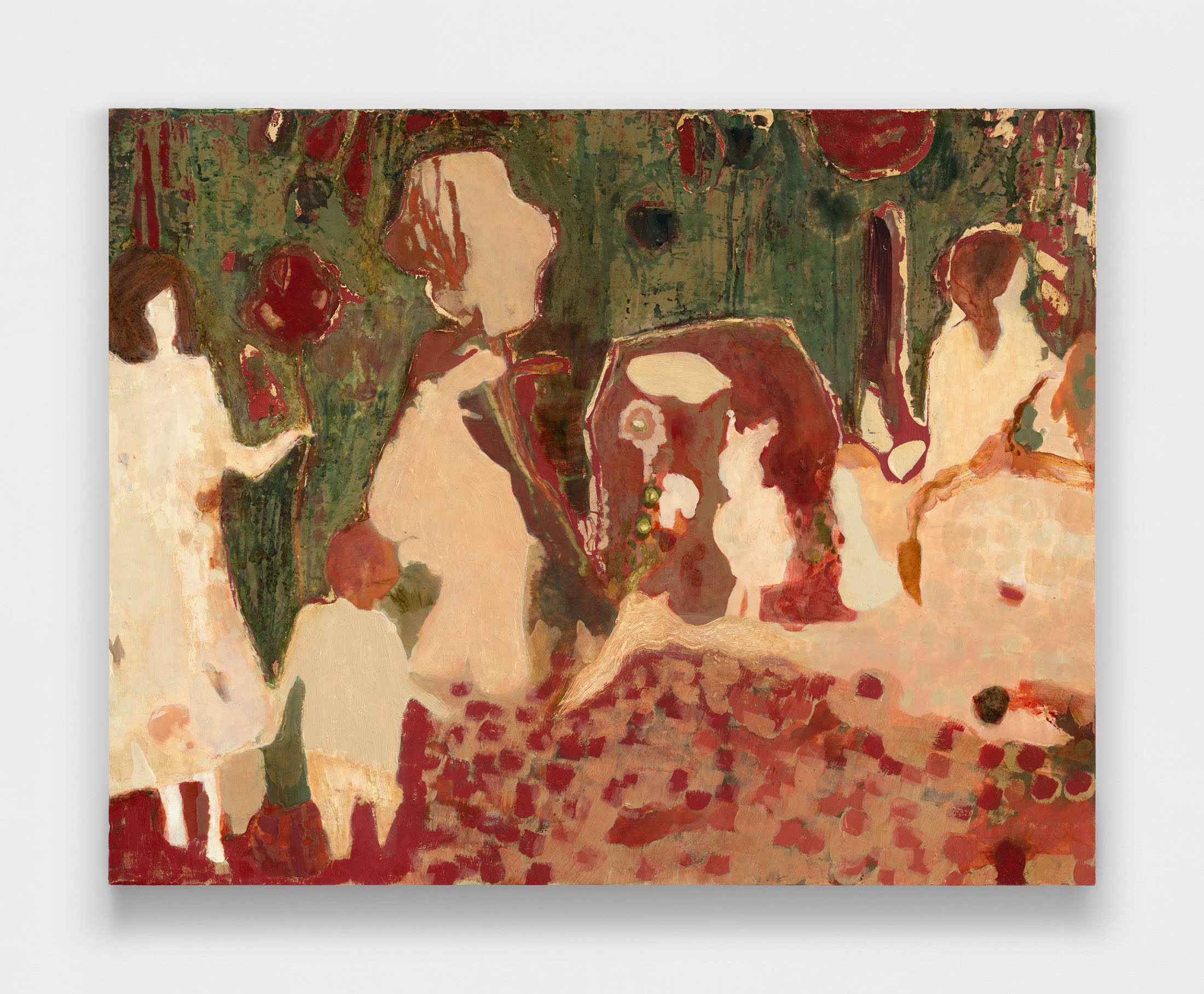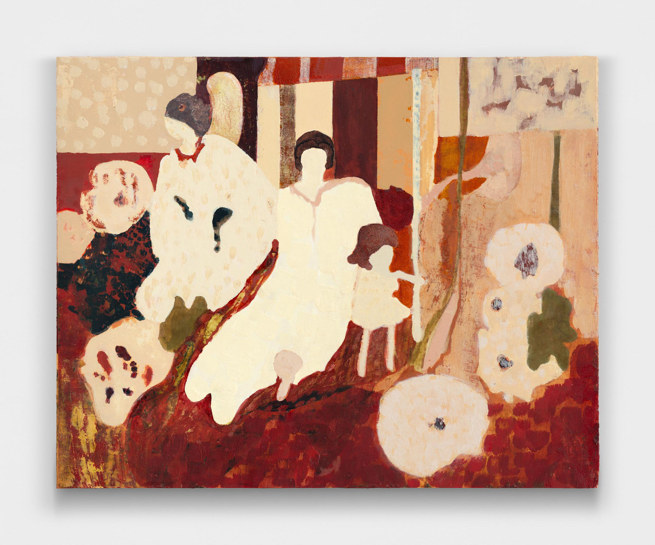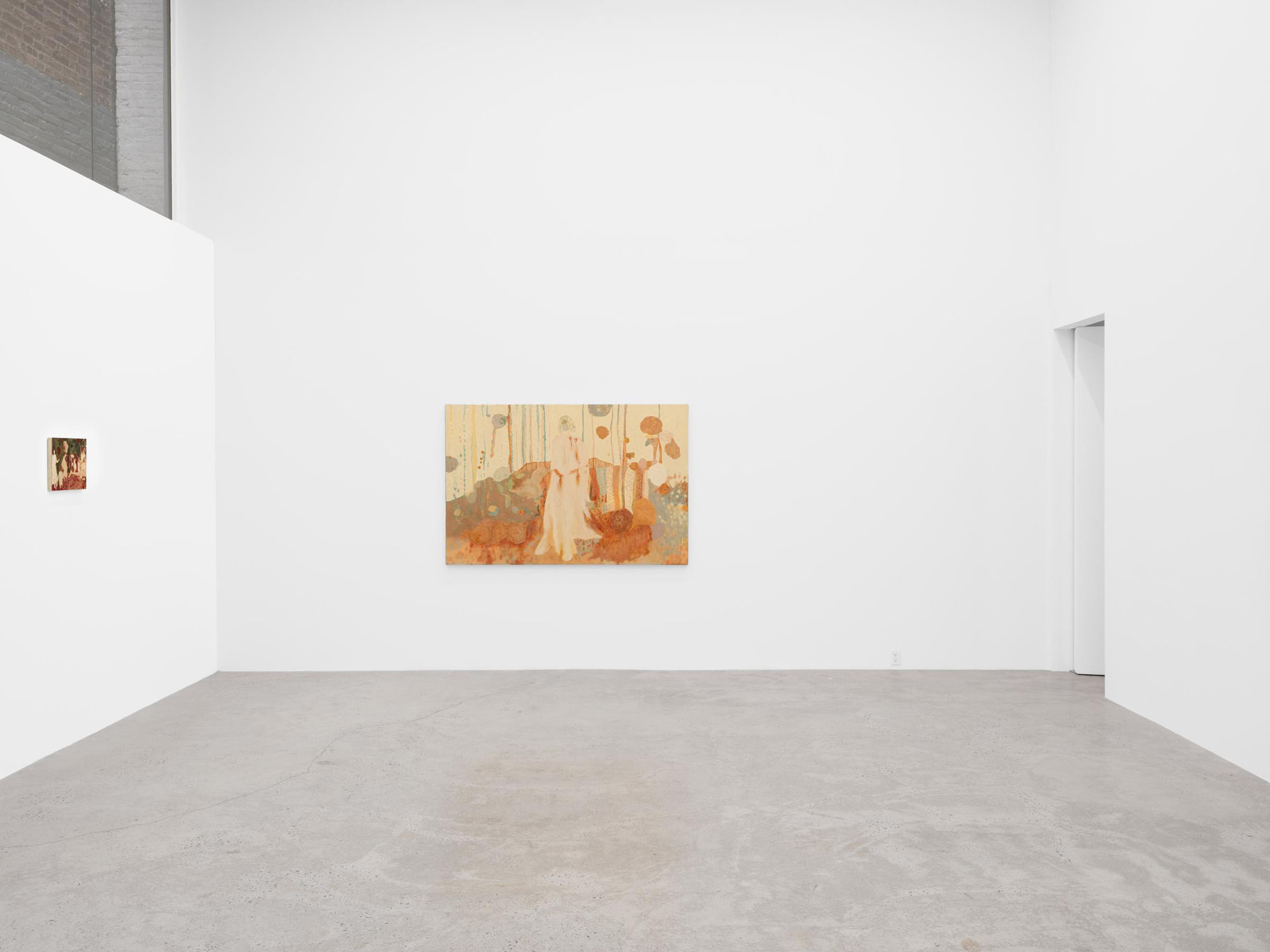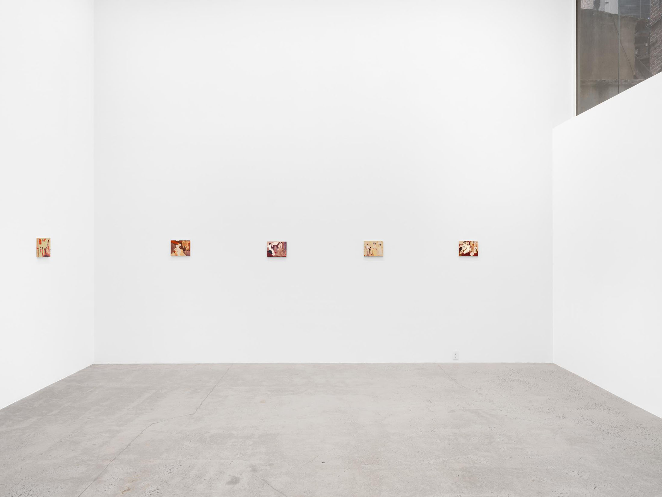 In these pictures, the most crucial points of demarcation that would commonly be added to the surface of a canvas during its preparation—pencil lines that give way to underpainting—appear not as conscious tools of depiction but as slivers of hidden layers, of paintings that once were but are no more. Familiar beings emerge through the violent rending of lumpy masses, via their collision or reluctant union, and what we initially perceive as an arm, a clavicle, a foot, a wrinkled brow, often gives way to something less distinct. e lines that bound and define the body peek through the painting like a violent crimson sunset: encountered in a hairline between two boulders, an arm breaking away from a chest, or the tiny crack of light under a door.
