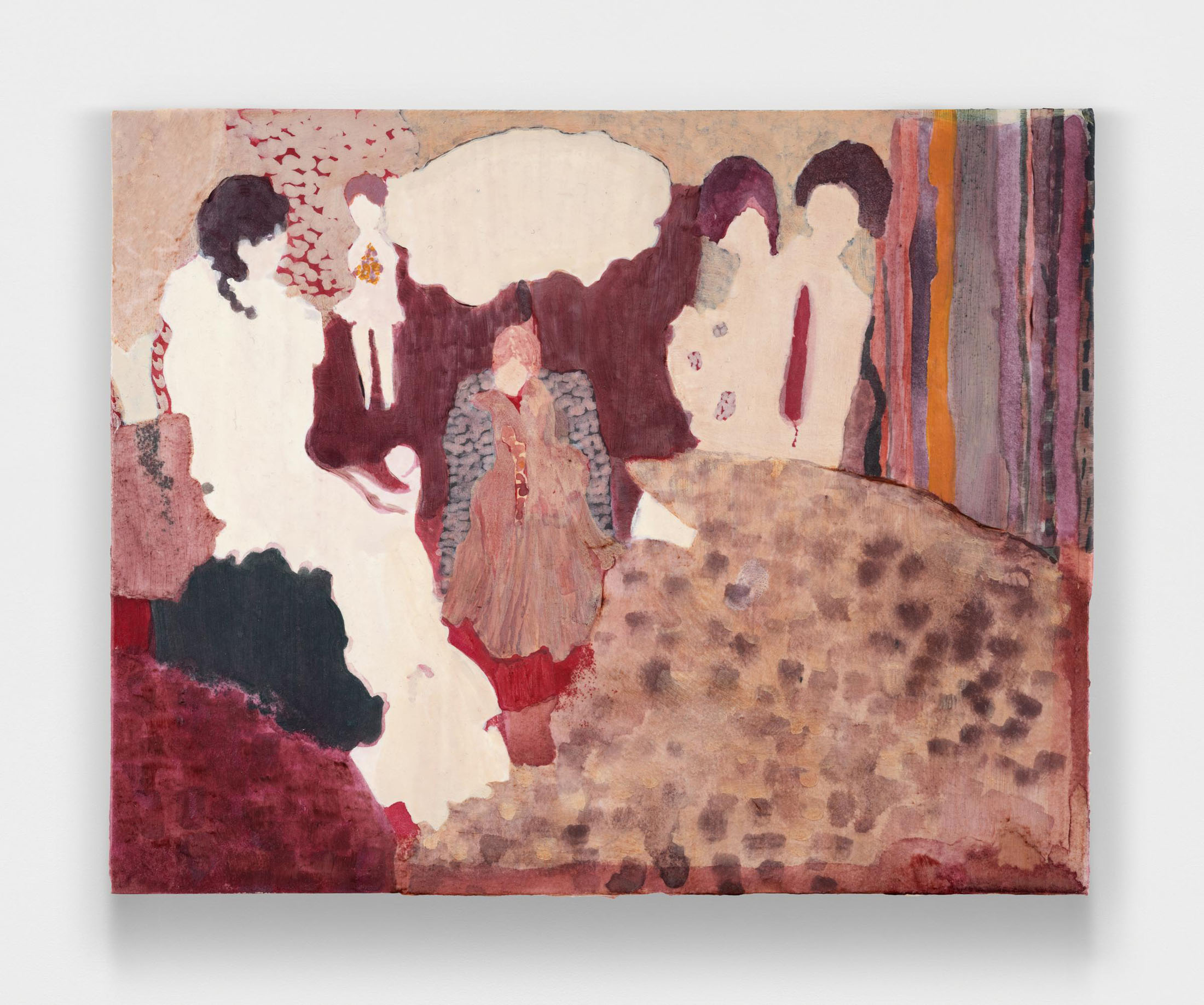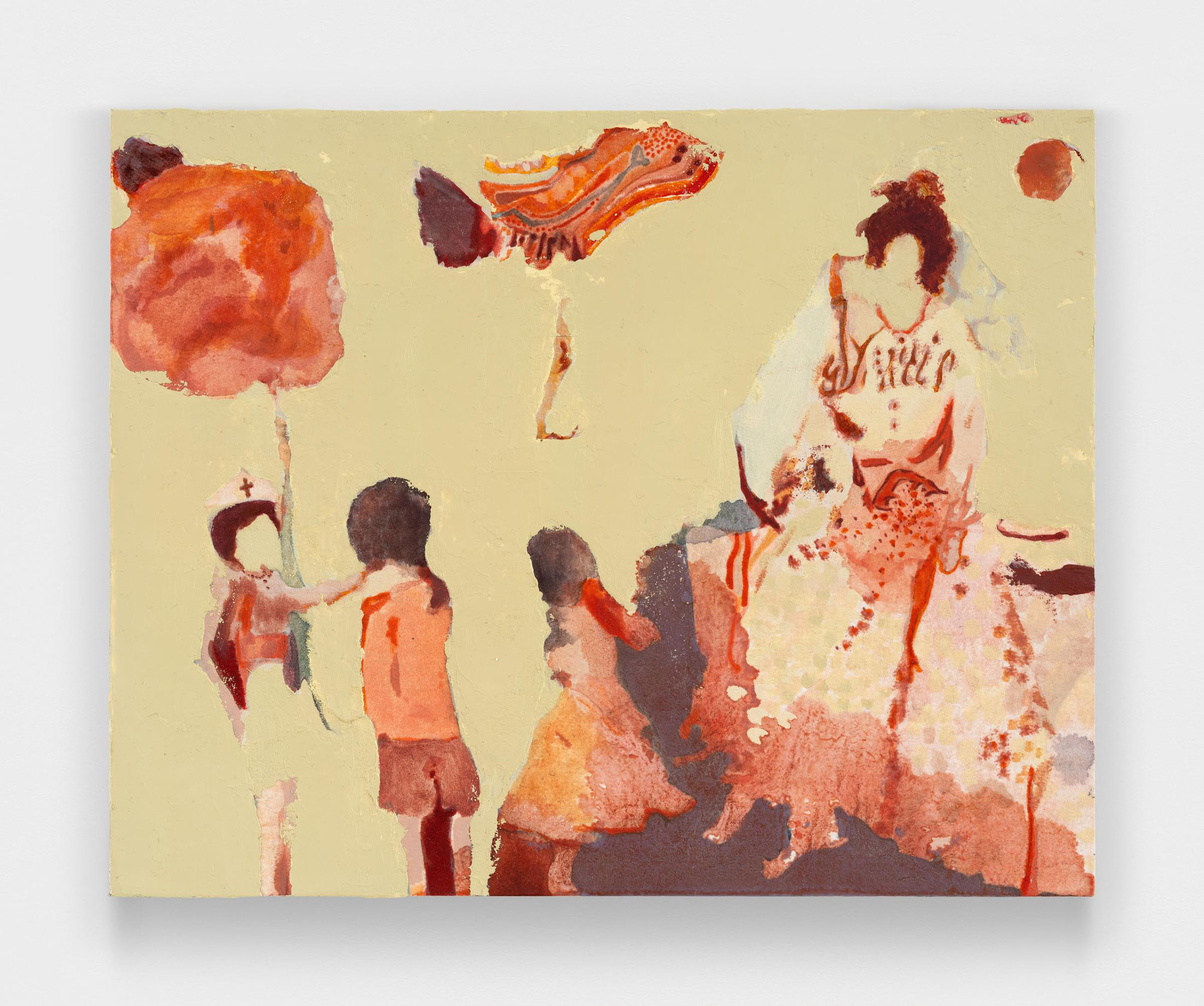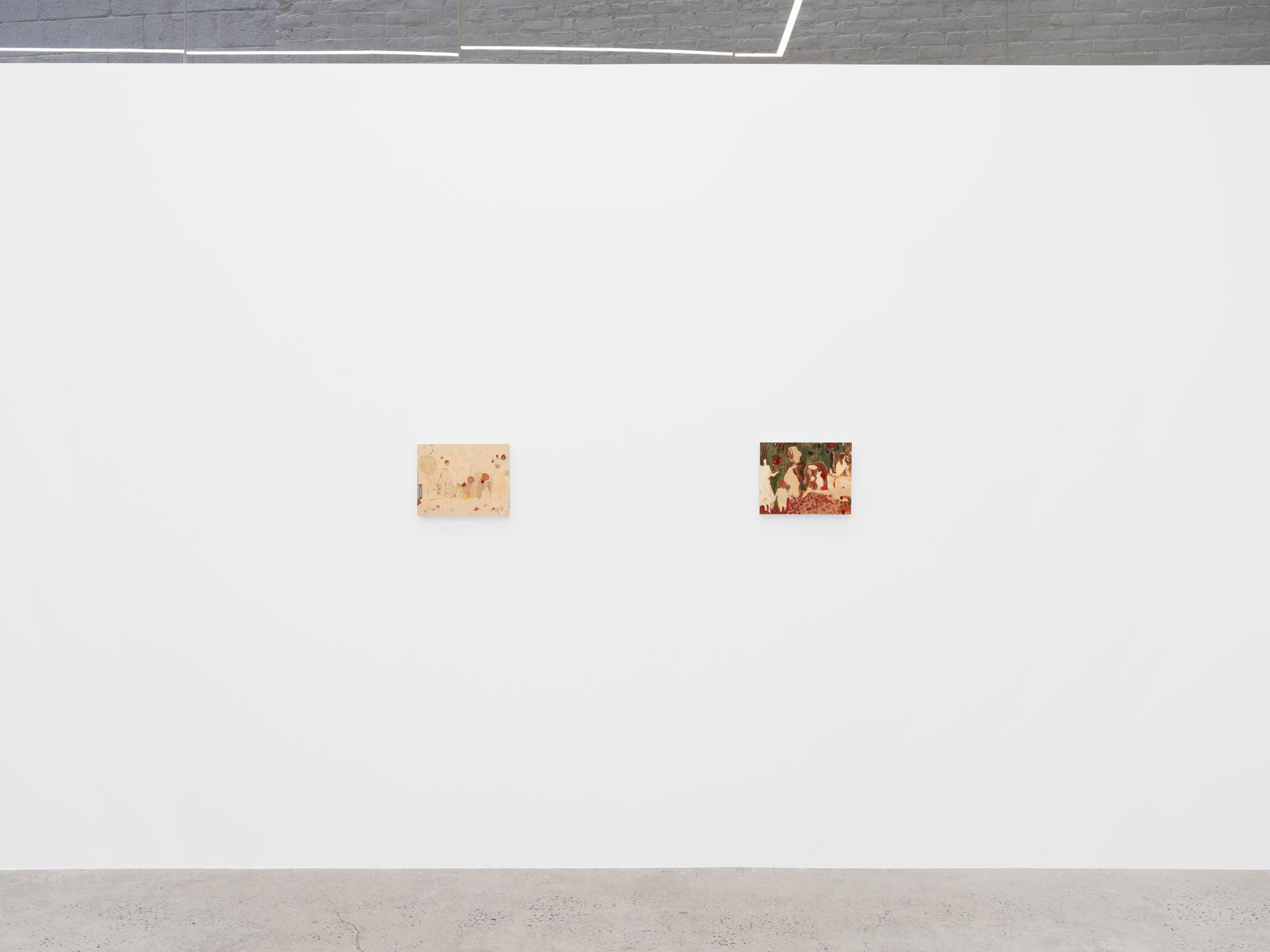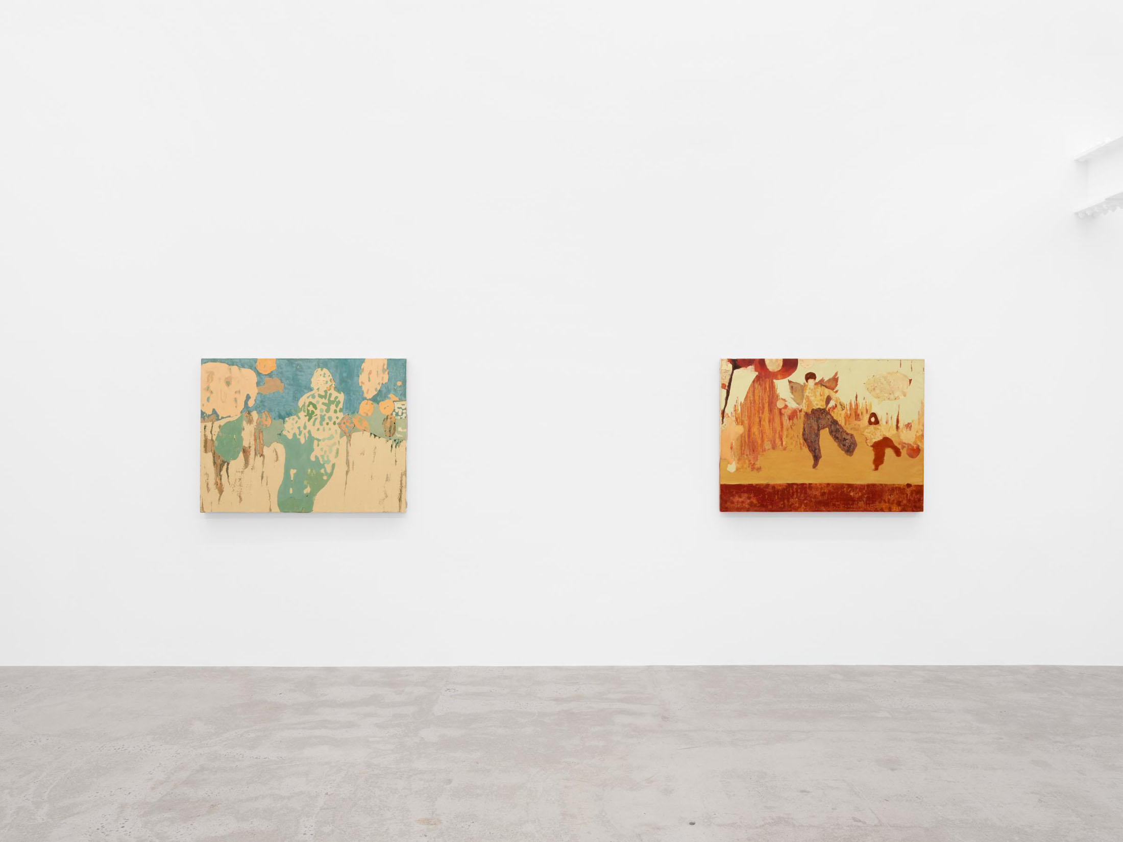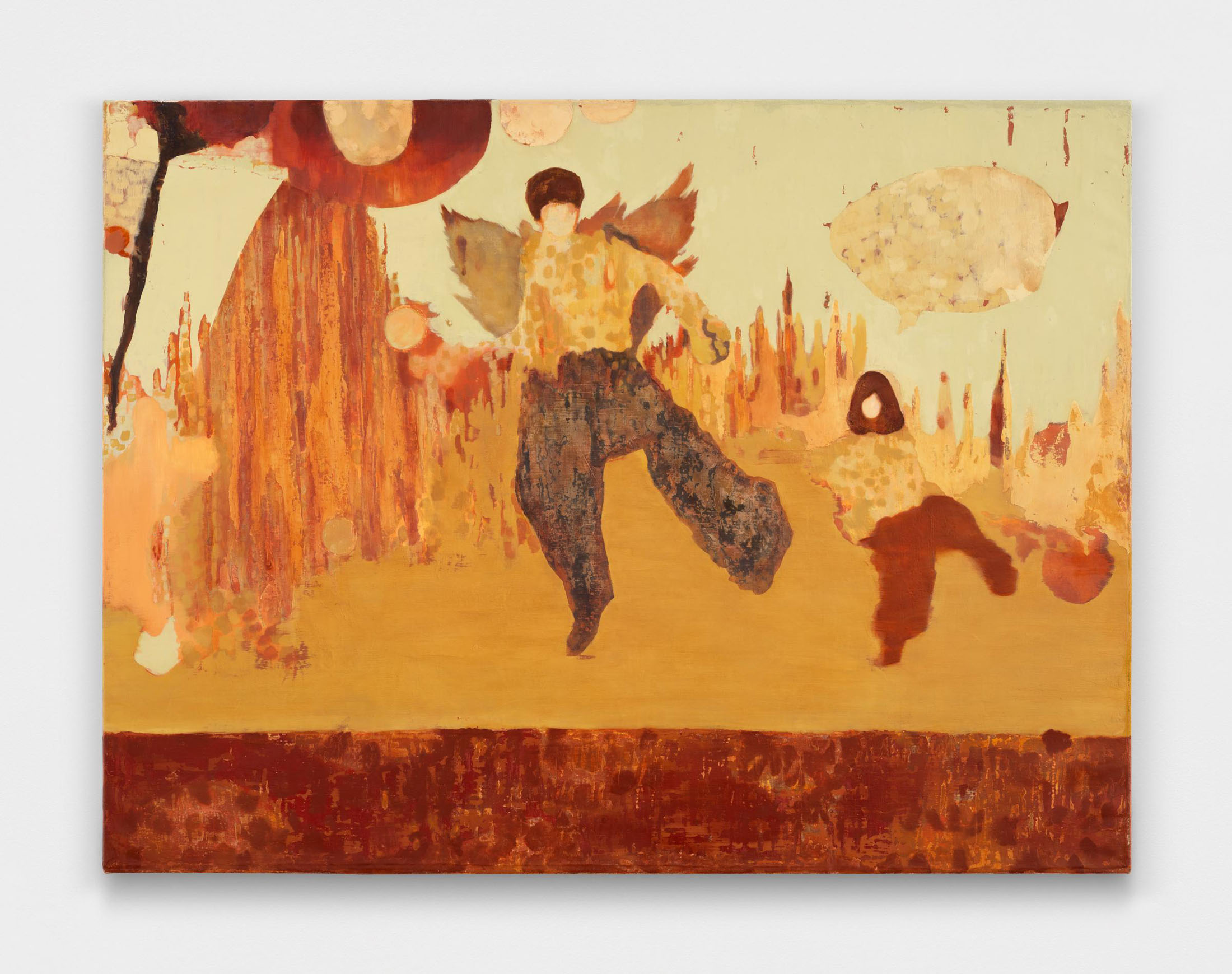 In these pictures, the most crucial points of demarcation that would commonly be added to the surface of a canvas during its preparation—pencil lines that give way to underpainting—appear not as conscious tools of depiction but as slivers of hidden layers, of paintings that once were but are no more. Familiar beings emerge through the violent rending of lumpy masses, via their collision or reluctant union, and what we initially perceive as an arm, a clavicle, a foot, a wrinkled brow, often gives way to something less distinct. e lines that bound and define the body peek through the painting like a violent crimson sunset: encountered in a hairline between two boulders, an arm breaking away from a chest, or the tiny crack of light under a door.