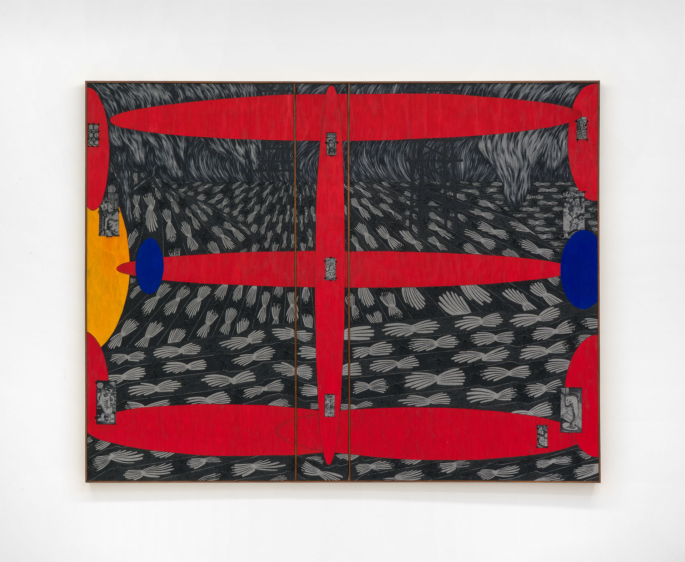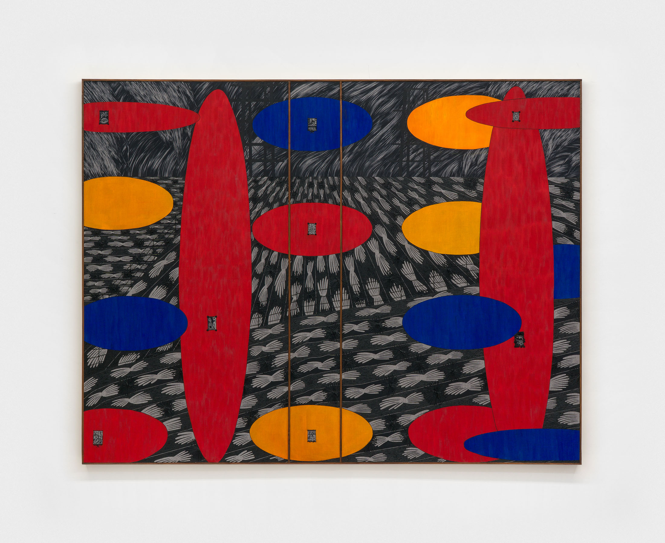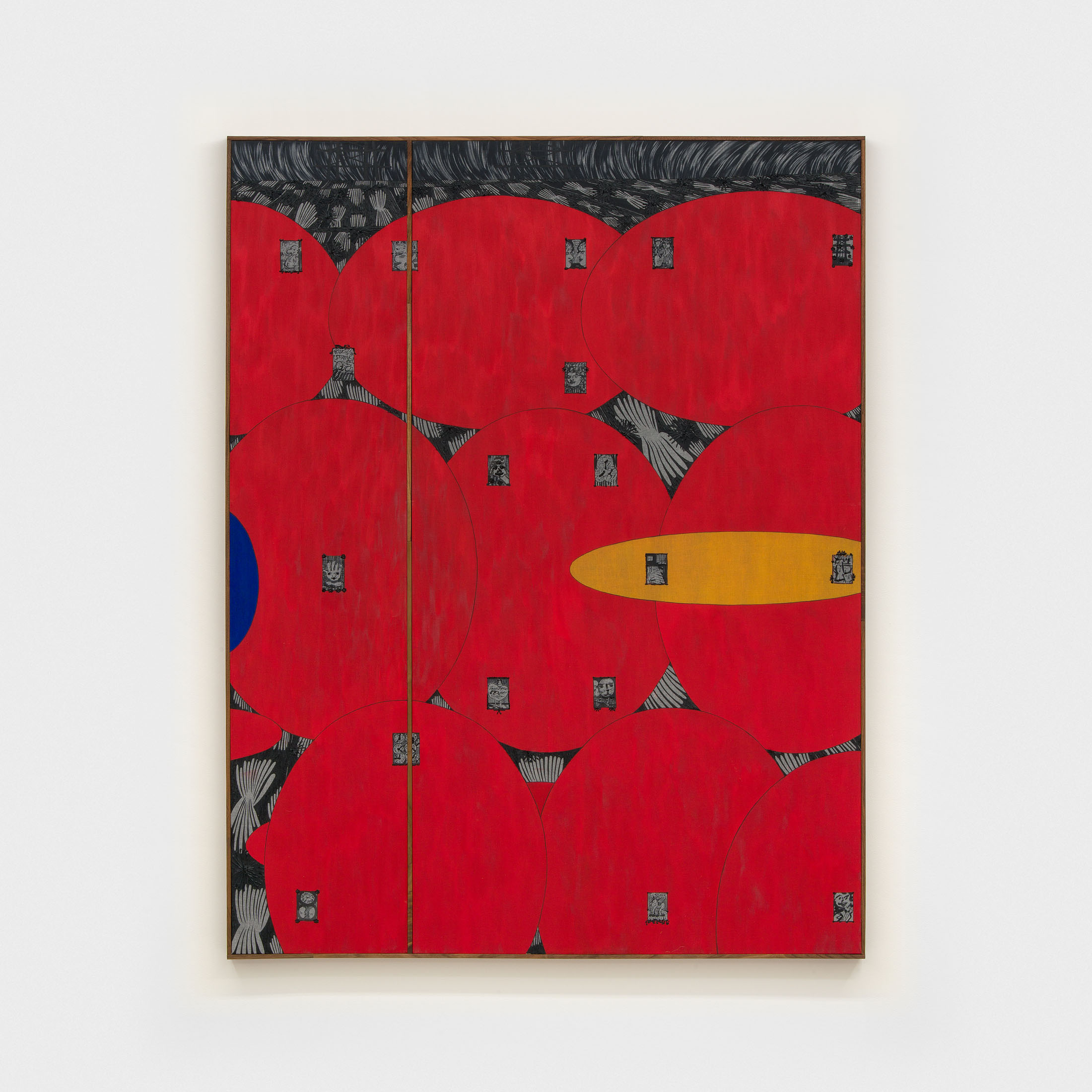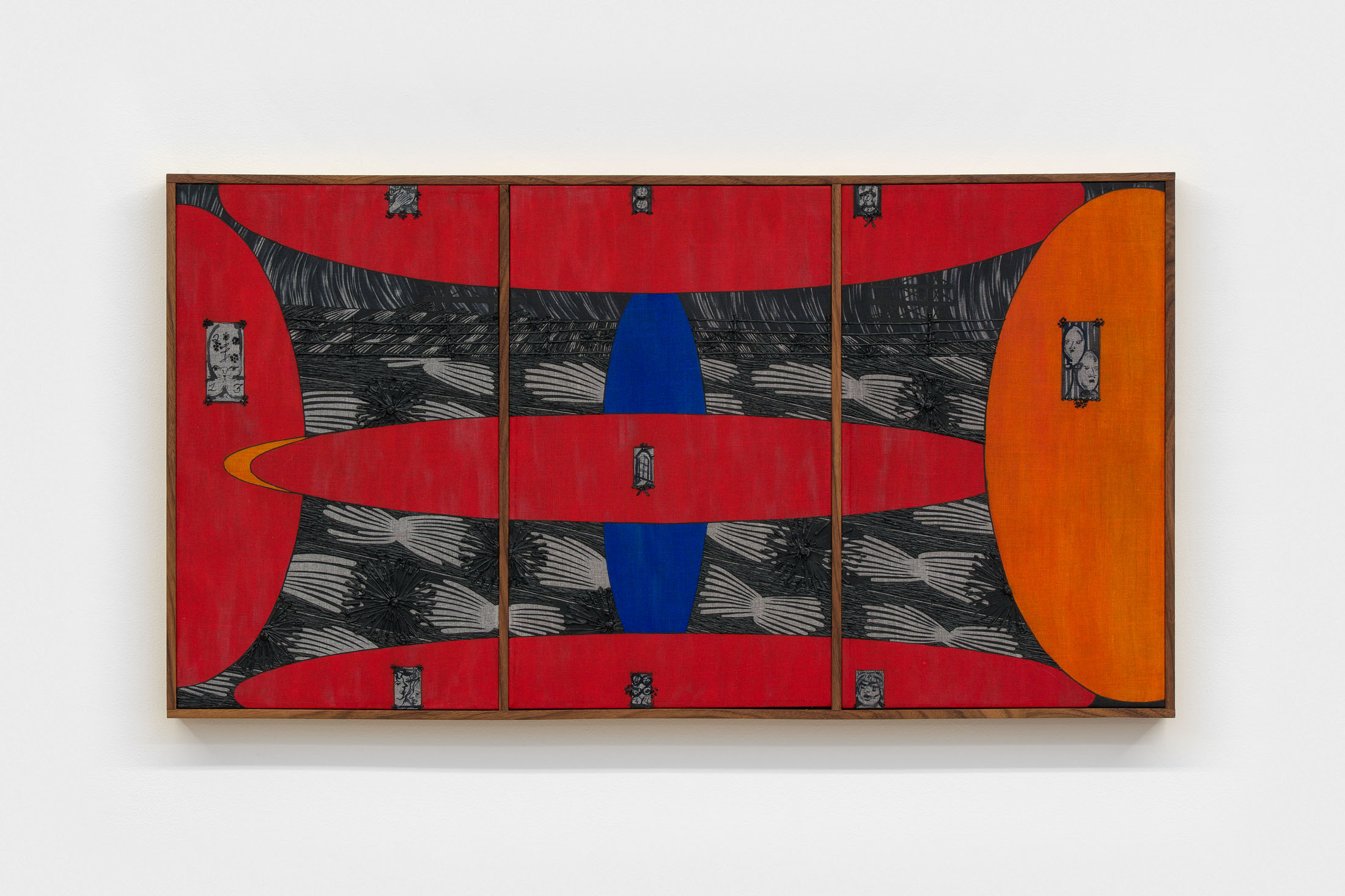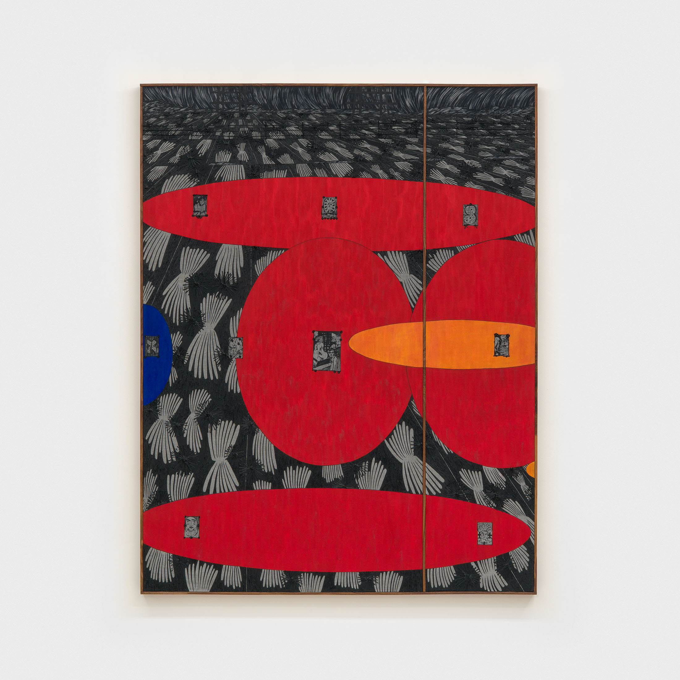 Fields of textured oil paint fall into lines like troops in formation, serving as the building blocks for her expansive landscapes. In works such as Snidley Whiplash (2025), rows of floral motifs tug toward the horizon, a form of repetition that Cook describes as an exercise in tedium. Perhaps suggestive of the working masses, they simultaneously read like a chromosomal body mutated, alienated from its natural form. Her landscapes are otherwise bare if not for the pylon towers, a borrowed Greek term for gatekeeper, acting as lifeline, tether and witness to our increasing detachment from the physical world. Large geometric forms disrupt the terrain, coded in vibrant primary colors that play on systems of categorization, control and the technical language of color.