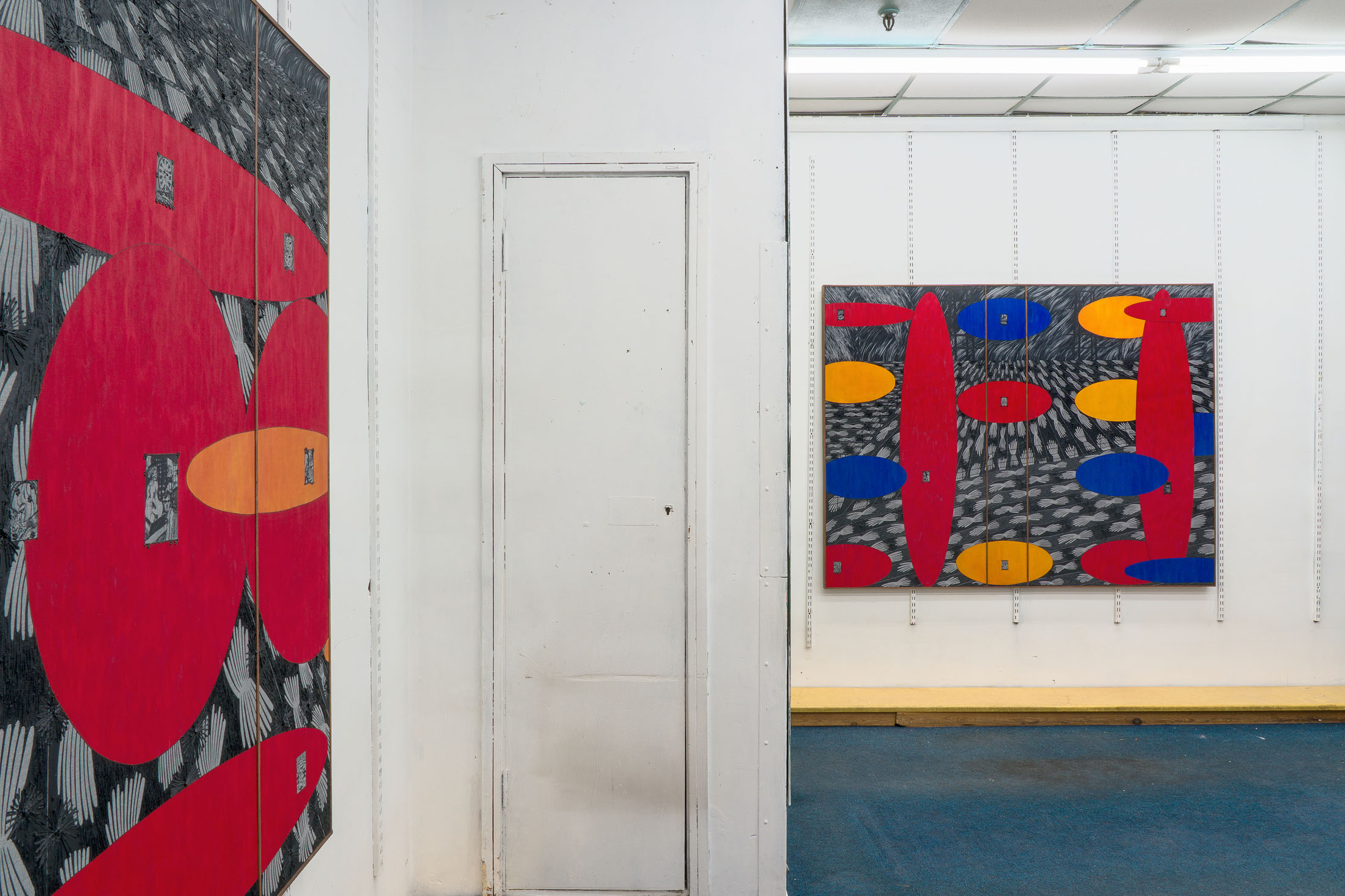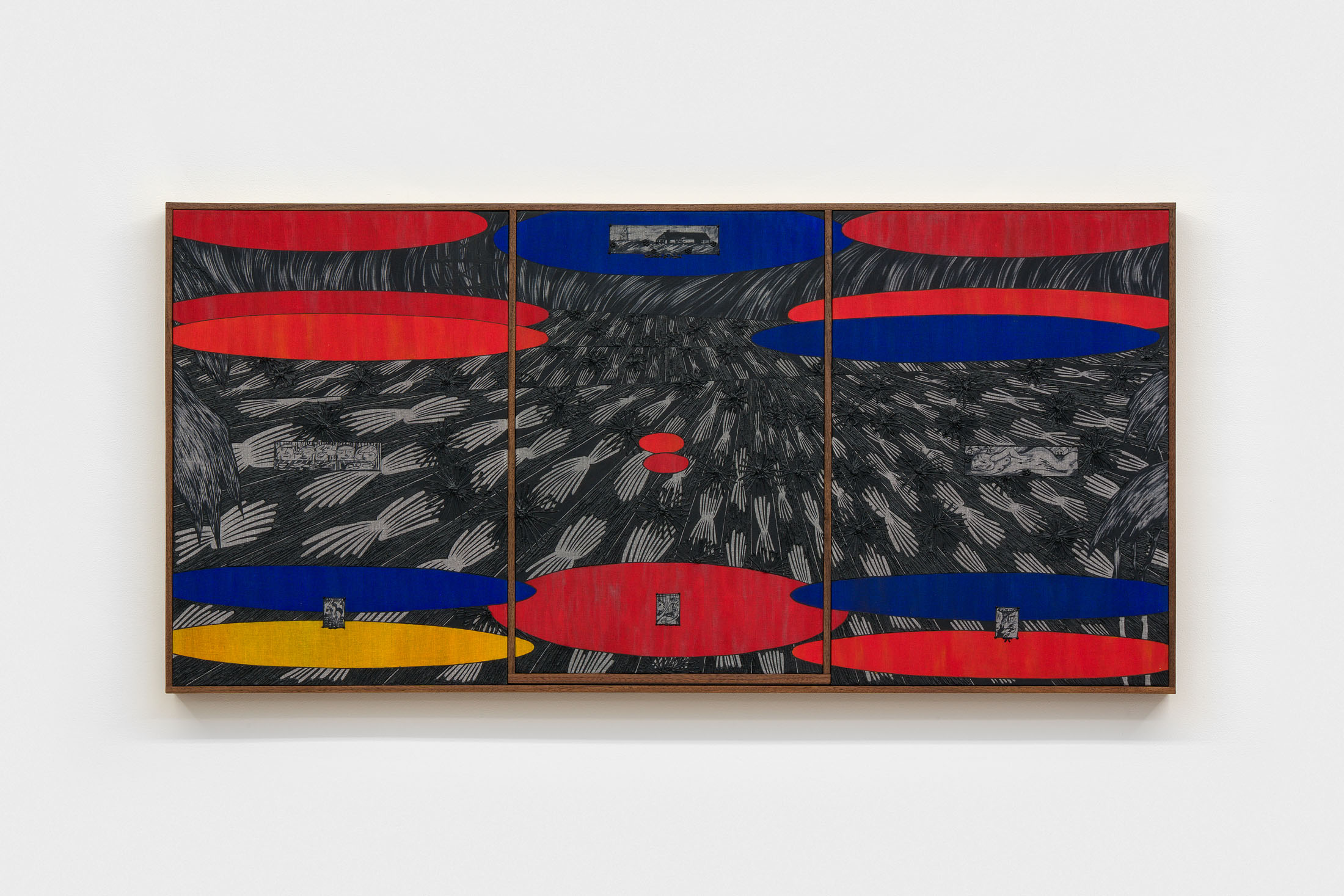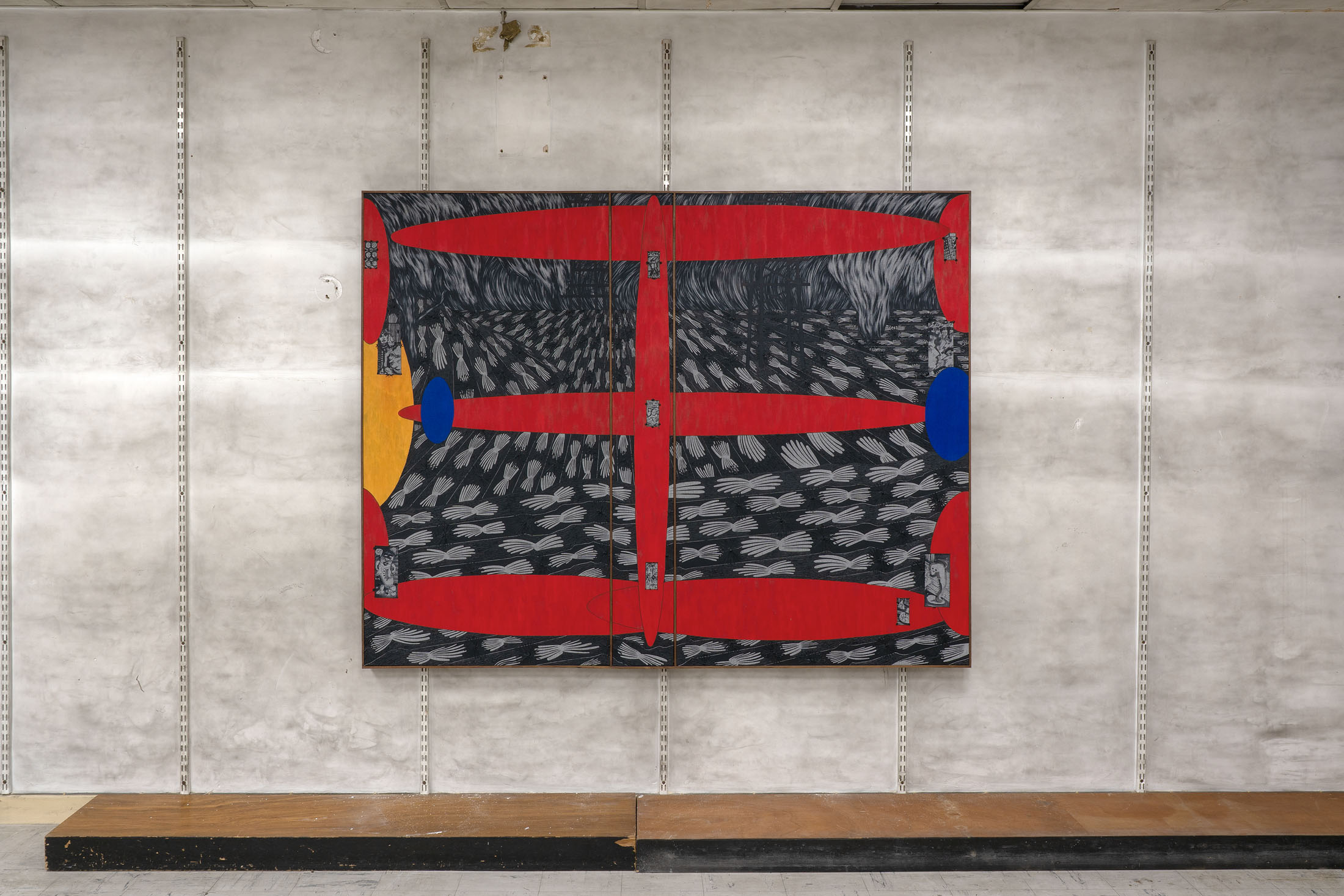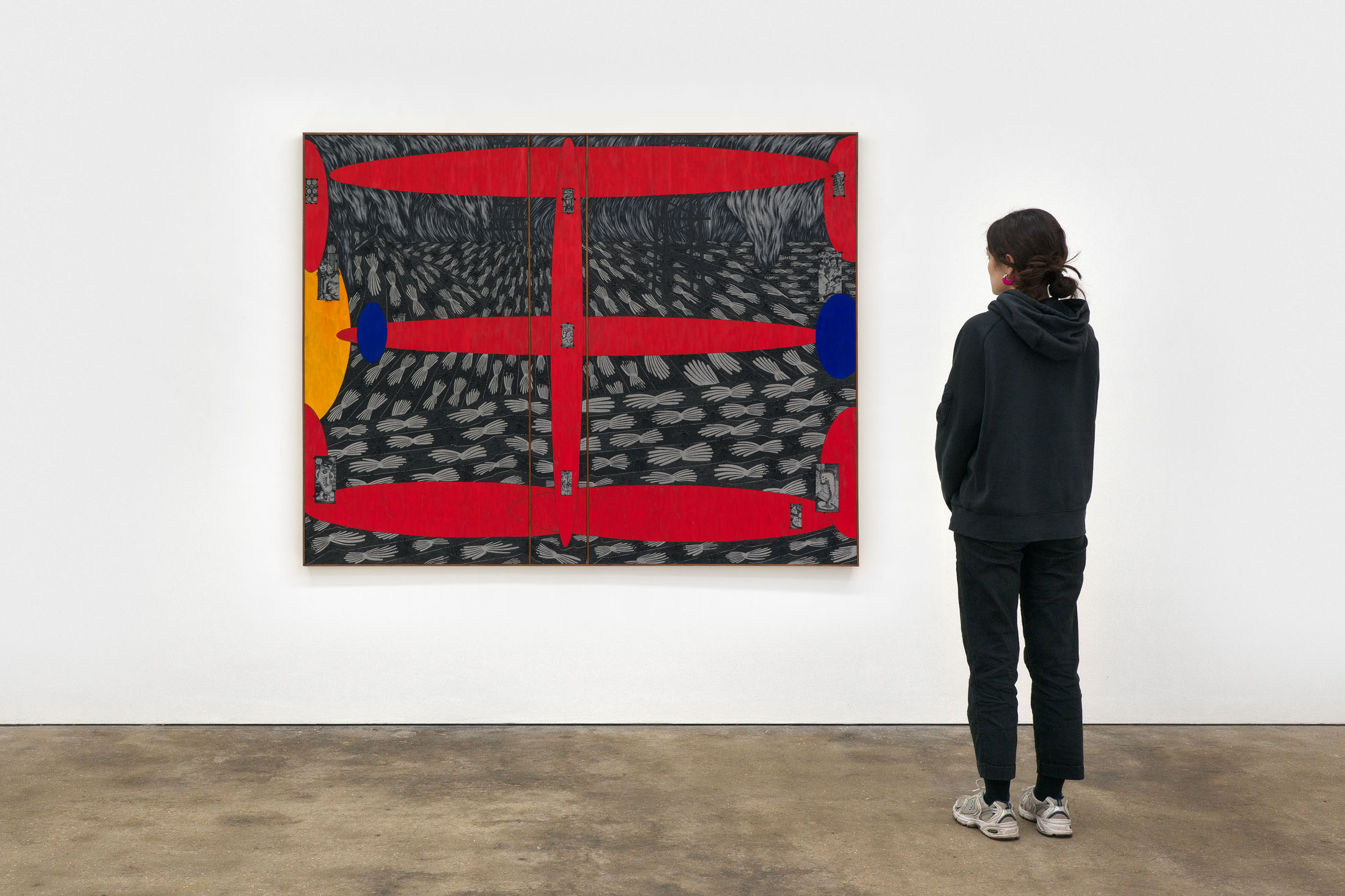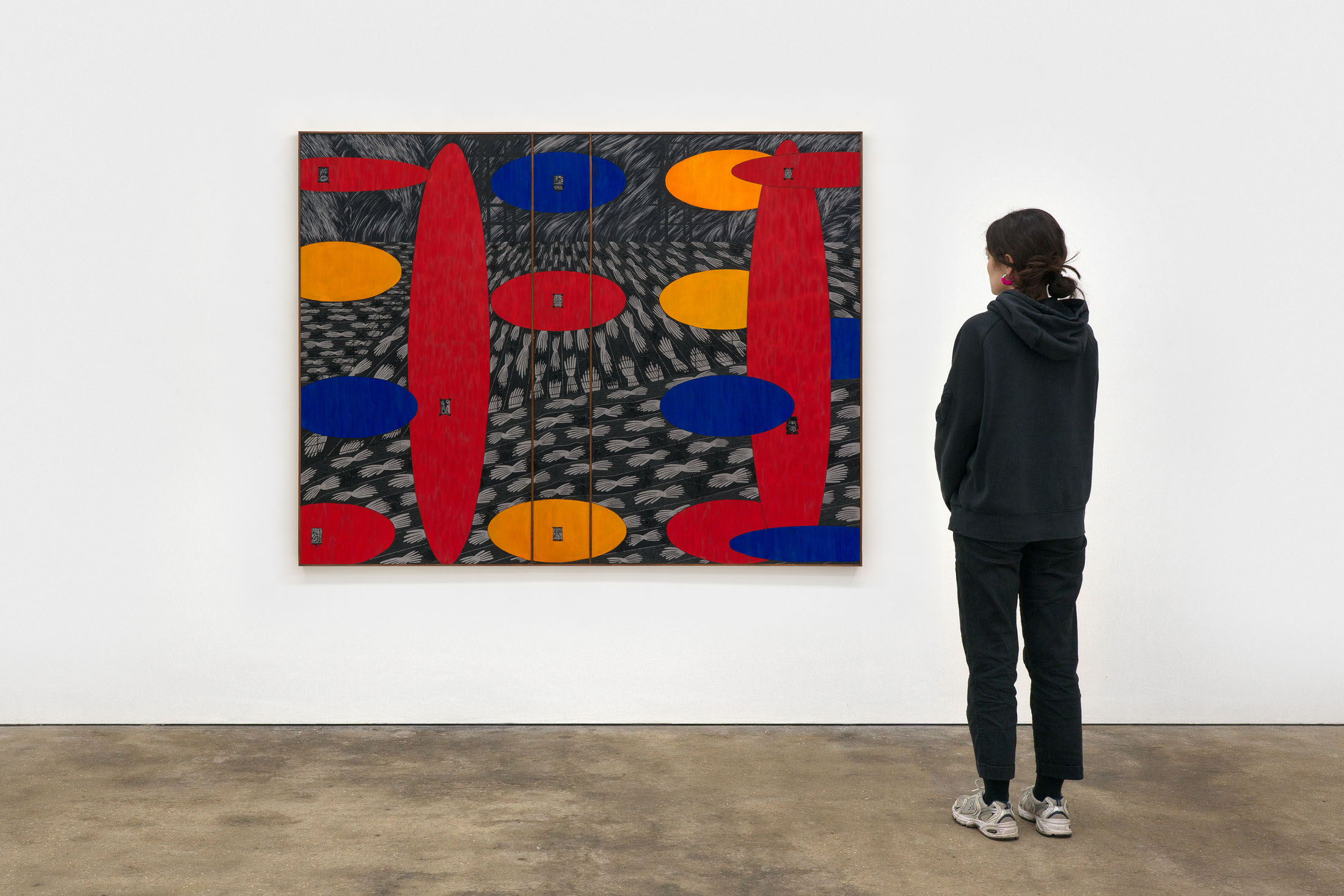 Fields of textured oil paint fall into lines like troops in formation, serving as the building blocks for her expansive landscapes. In works such as Snidley Whiplash (2025), rows of floral motifs tug toward the horizon, a form of repetition that Cook describes as an exercise in tedium. Perhaps suggestive of the working masses, they simultaneously read like a chromosomal body mutated, alienated from its natural form. Her landscapes are otherwise bare if not for the pylon towers, a borrowed Greek term for gatekeeper, acting as lifeline, tether and witness to our increasing detachment from the physical world. Large geometric forms disrupt the terrain, coded in vibrant primary colors that play on systems of categorization, control and the technical language of color.