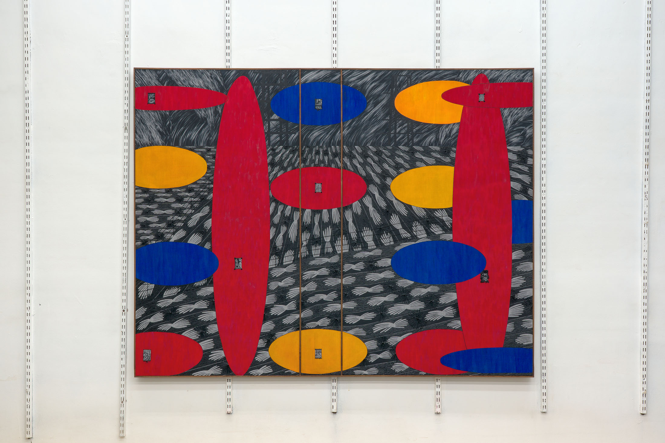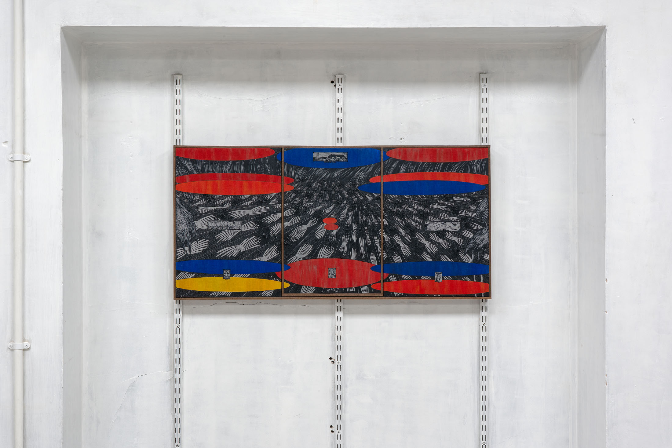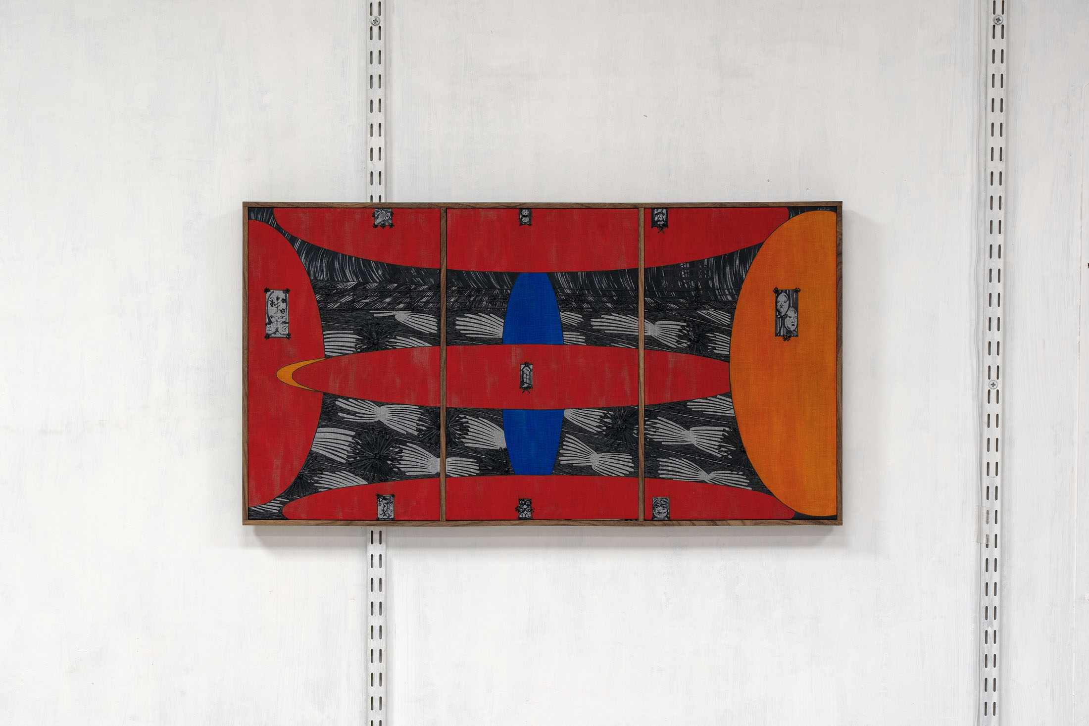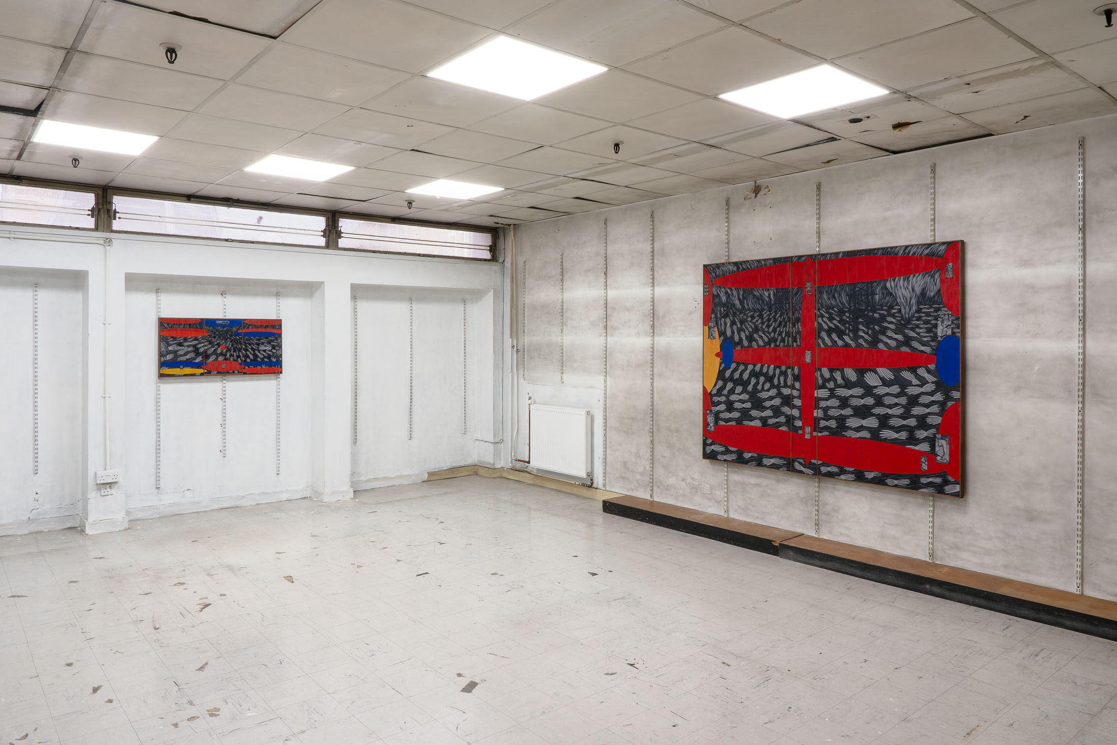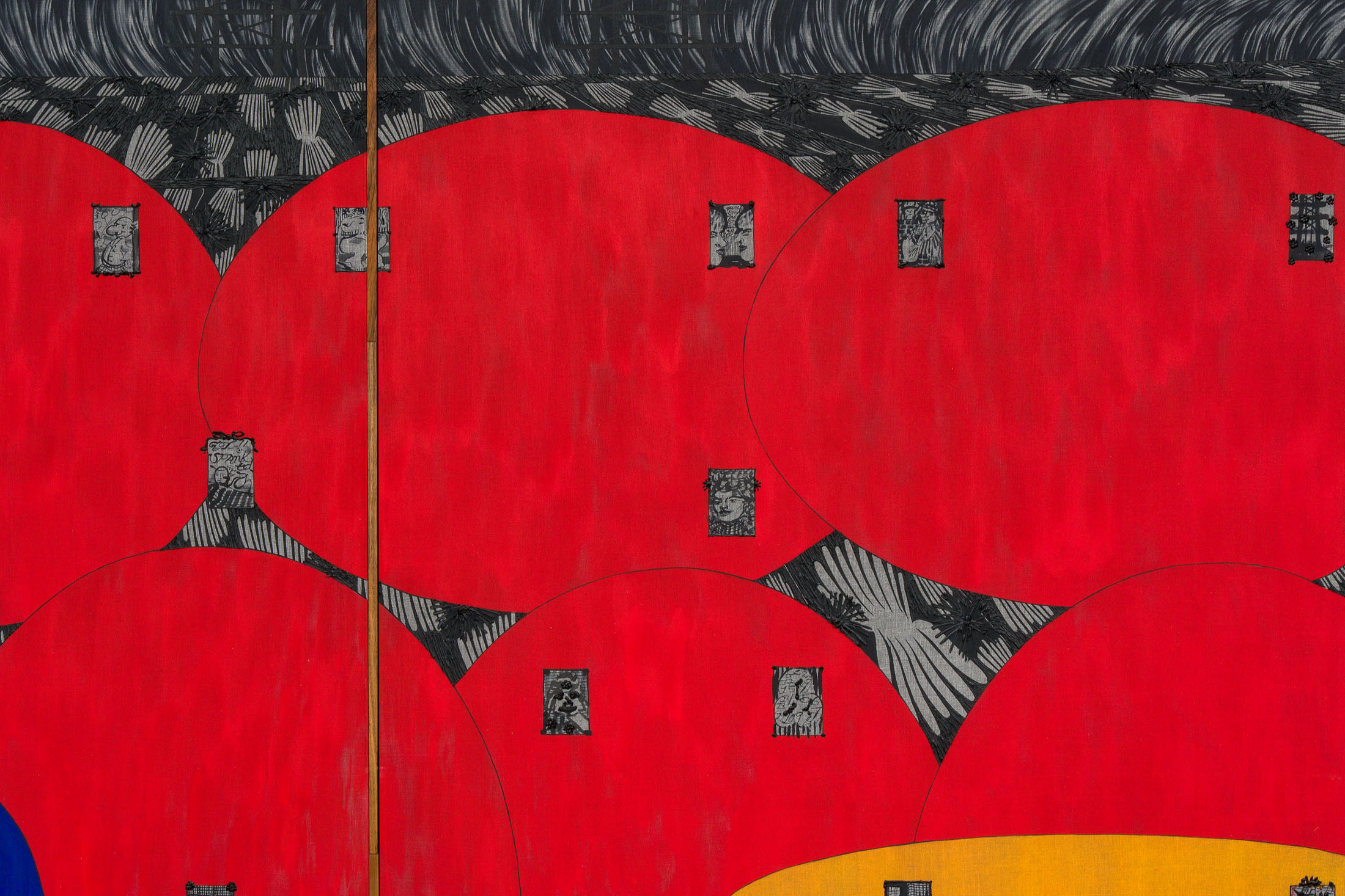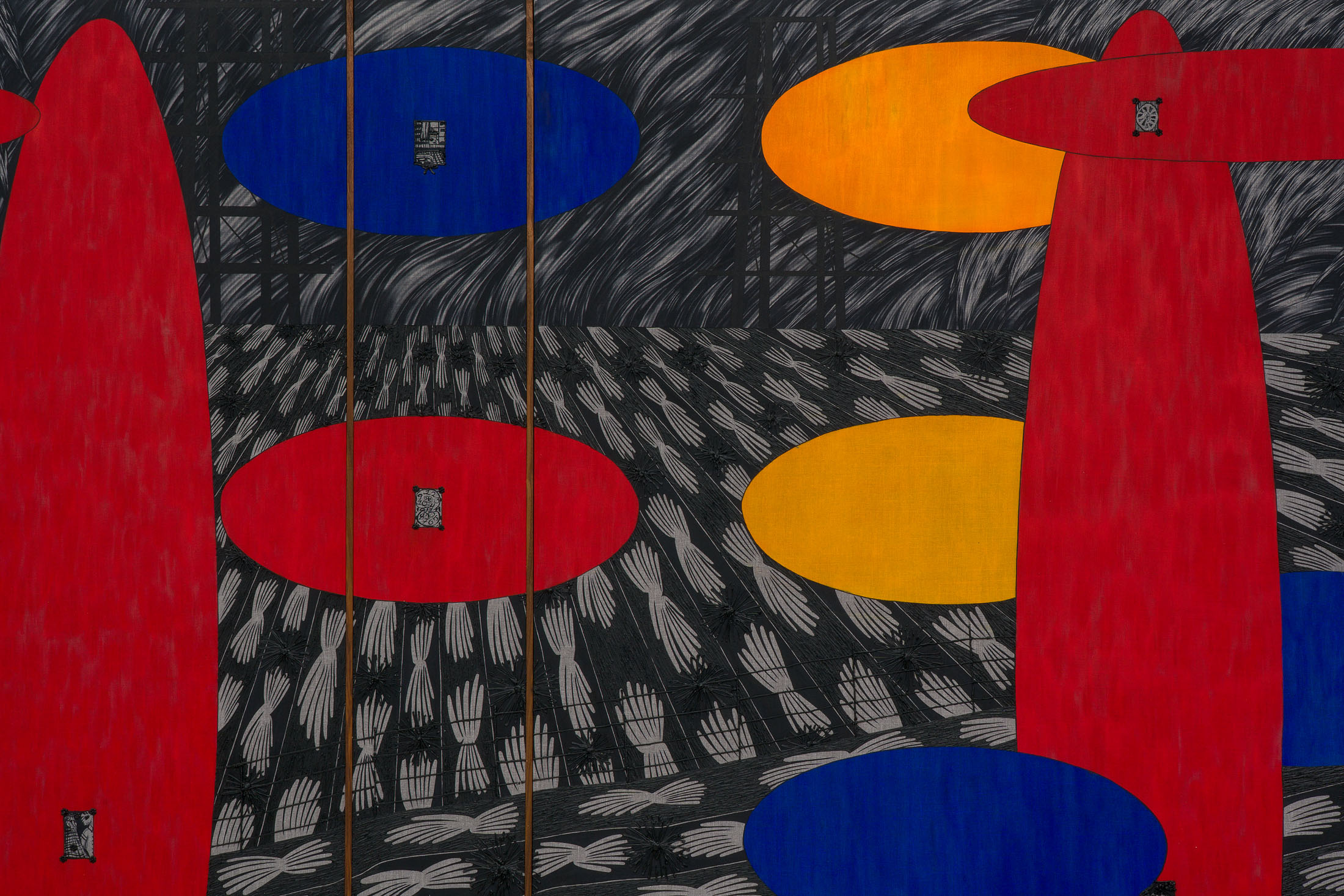 Fields of textured oil paint fall into lines like troops in formation, serving as the building blocks for her expansive landscapes. In works such as Snidley Whiplash (2025), rows of floral motifs tug toward the horizon, a form of repetition that Cook describes as an exercise in tedium. Perhaps suggestive of the working masses, they simultaneously read like a chromosomal body mutated, alienated from its natural form. Her landscapes are otherwise bare if not for the pylon towers, a borrowed Greek term for gatekeeper, acting as lifeline, tether and witness to our increasing detachment from the physical world. Large geometric forms disrupt the terrain, coded in vibrant primary colors that play on systems of categorization, control and the technical language of color.