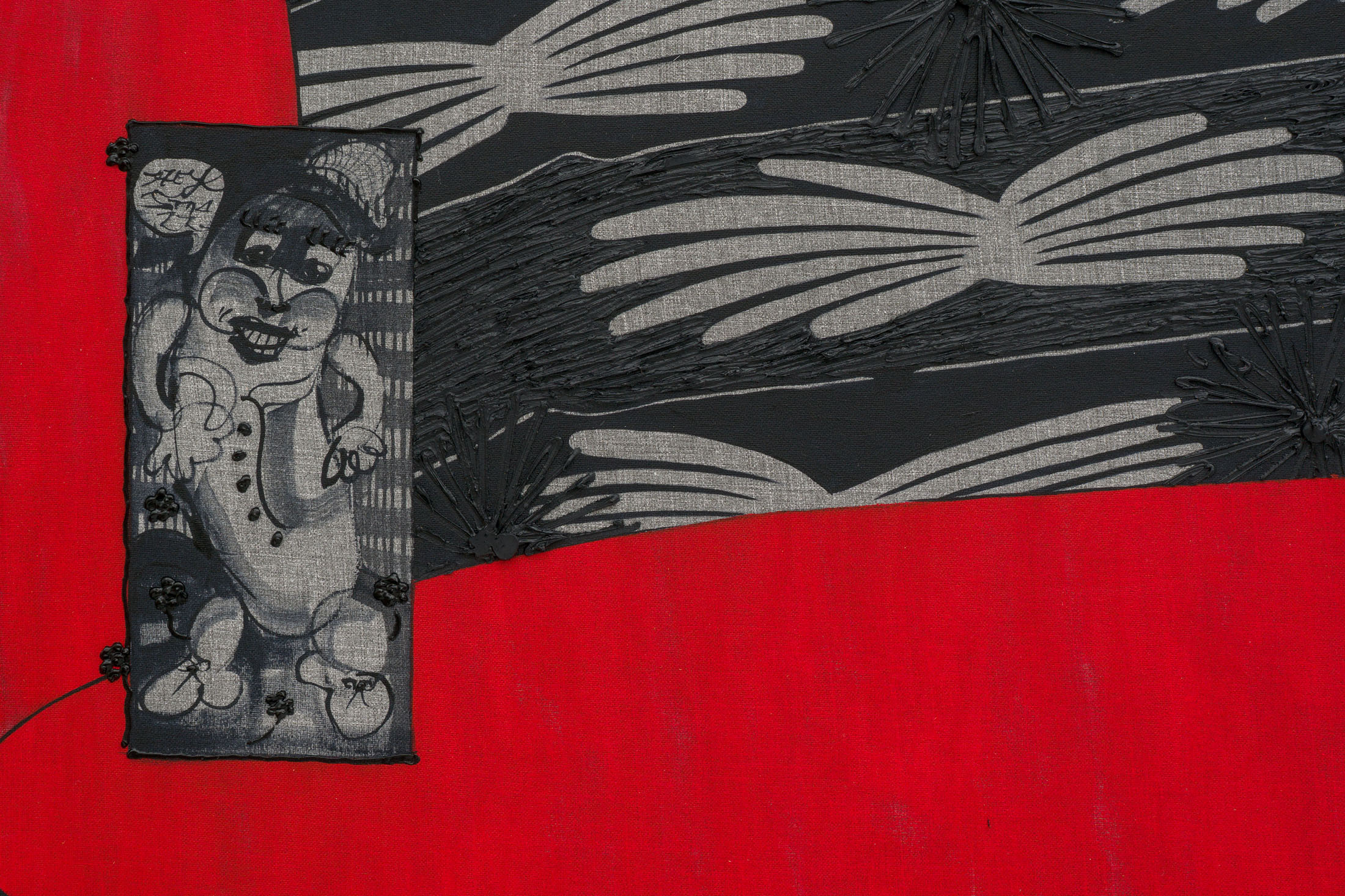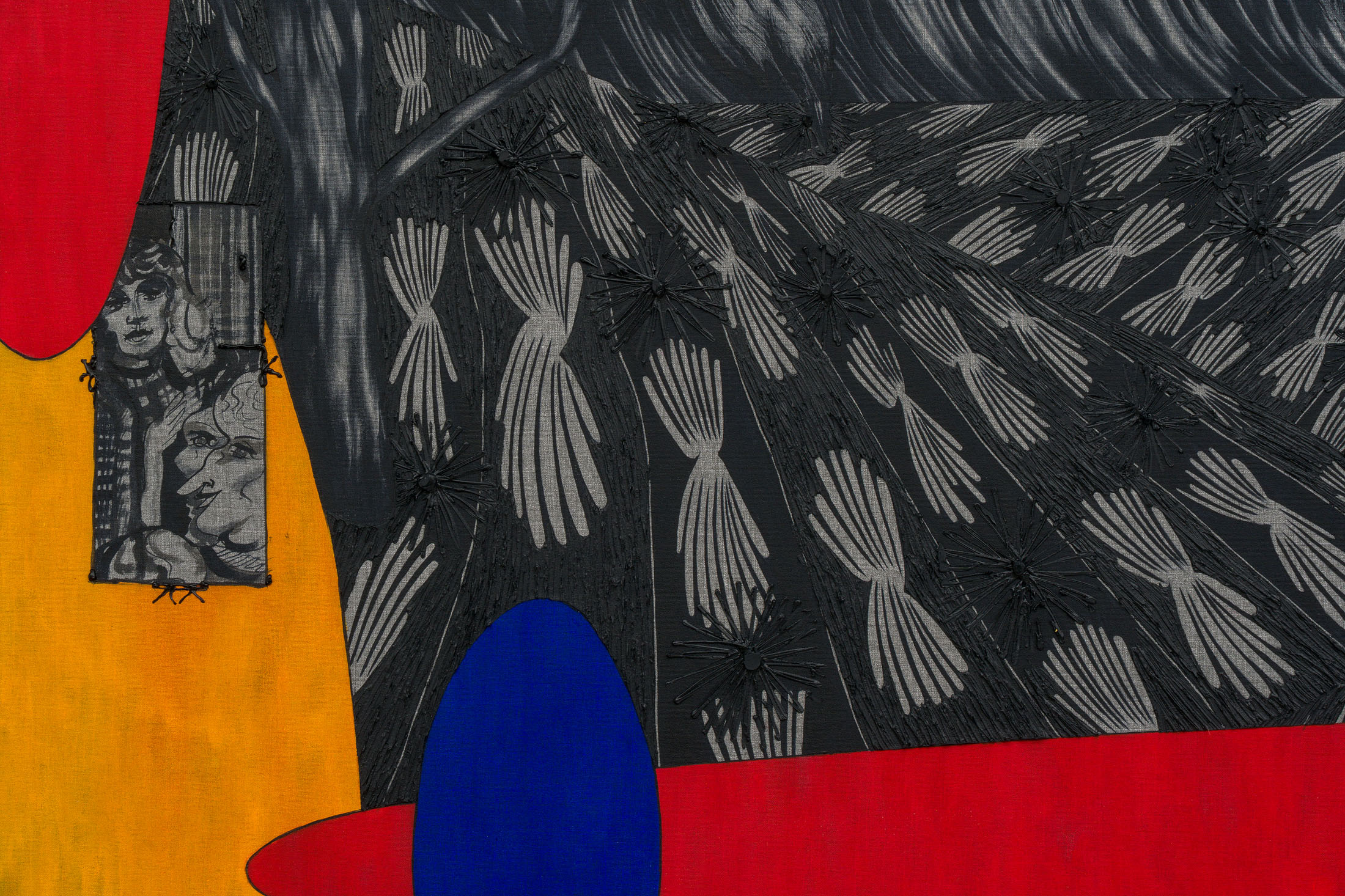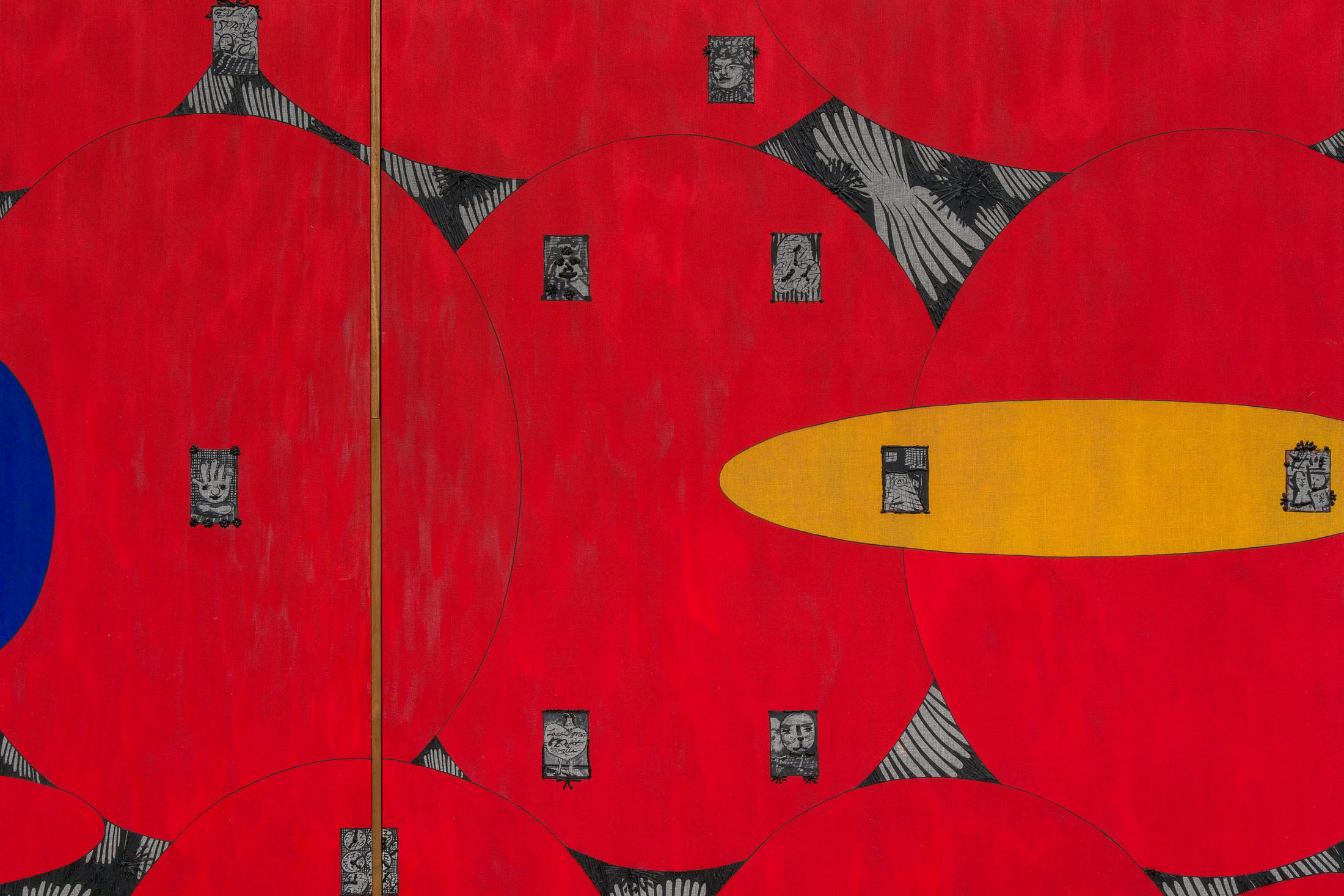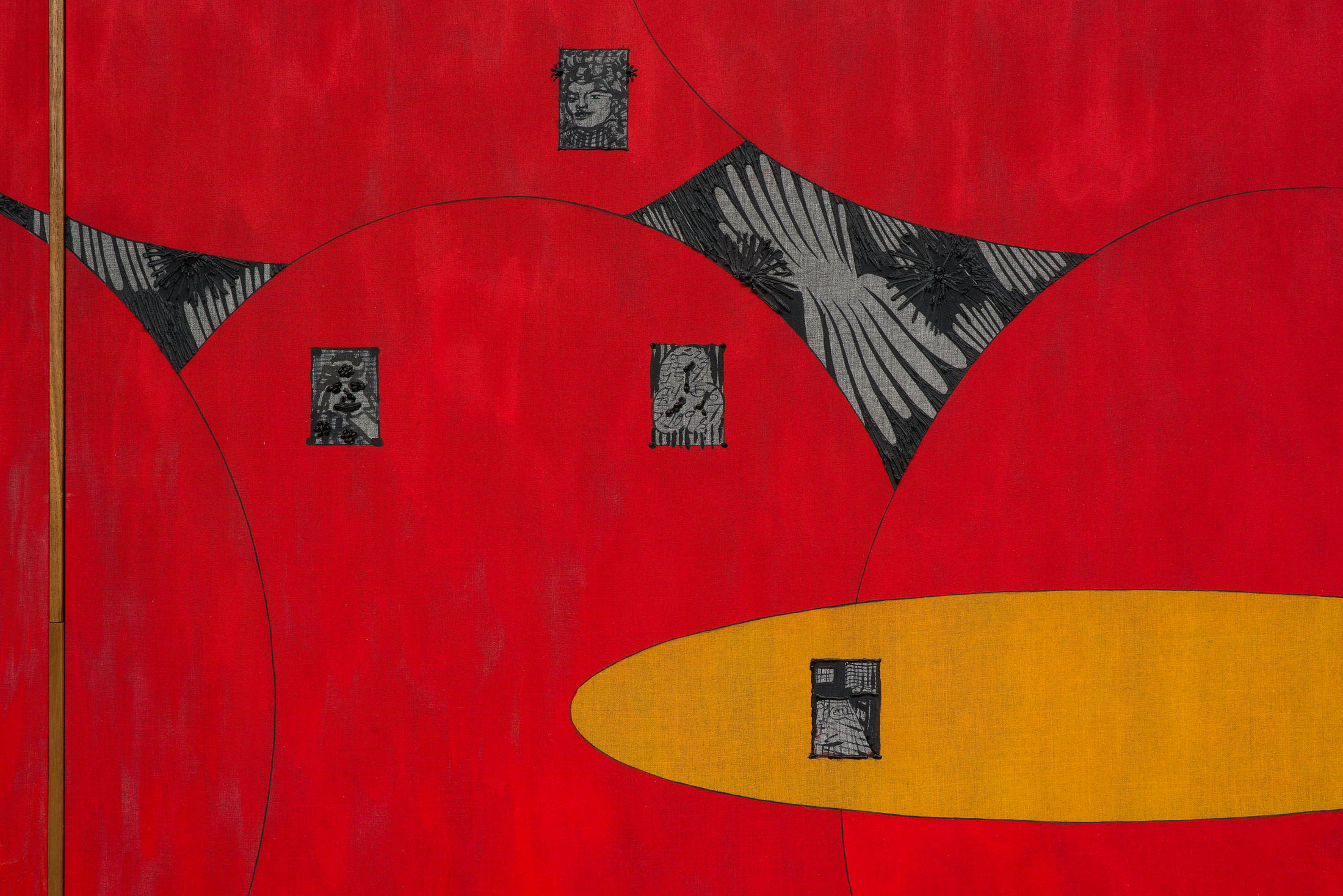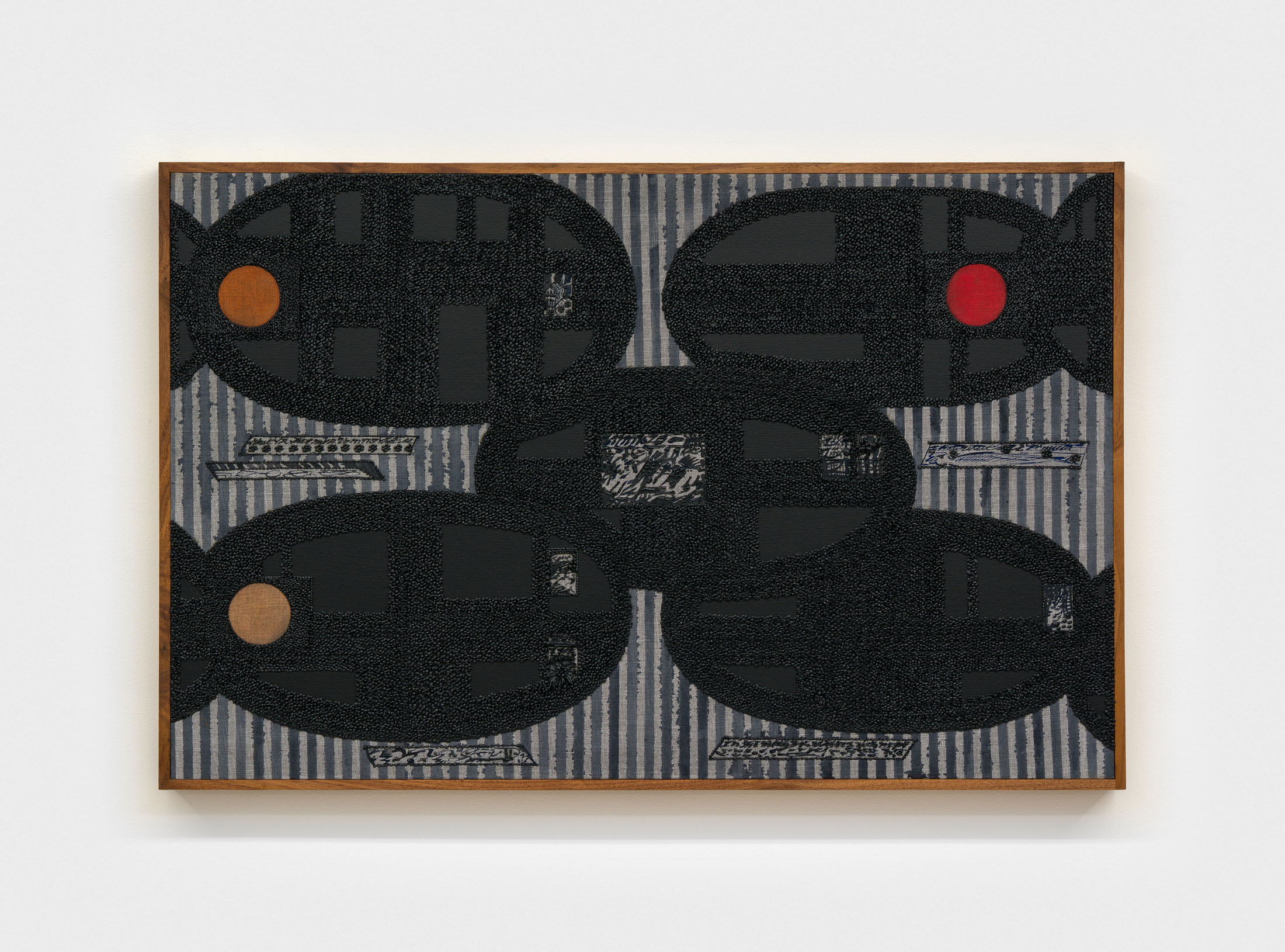 Fields of textured oil paint fall into lines like troops in formation, serving as the building blocks for her expansive landscapes. In works such as Snidley Whiplash (2025), rows of floral motifs tug toward the horizon, a form of repetition that Cook describes as an exercise in tedium. Perhaps suggestive of the working masses, they simultaneously read like a chromosomal body mutated, alienated from its natural form. Her landscapes are otherwise bare if not for the pylon towers, a borrowed Greek term for gatekeeper, acting as lifeline, tether and witness to our increasing detachment from the physical world. Large geometric forms disrupt the terrain, coded in vibrant primary colors that play on systems of categorization, control and the technical language of color.
