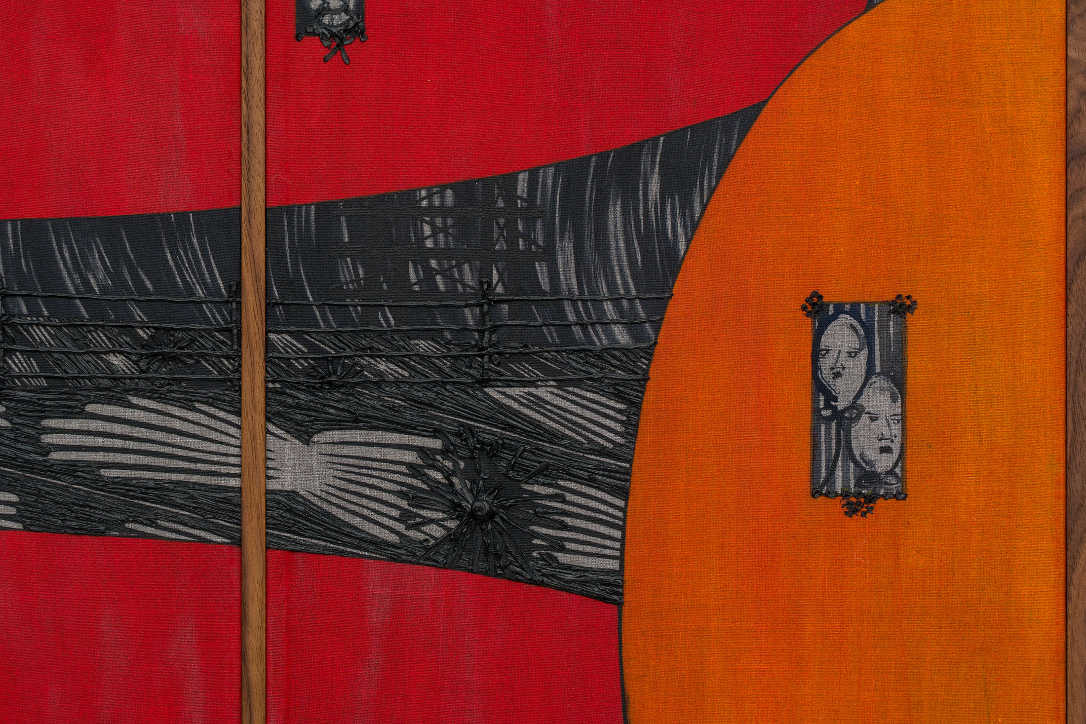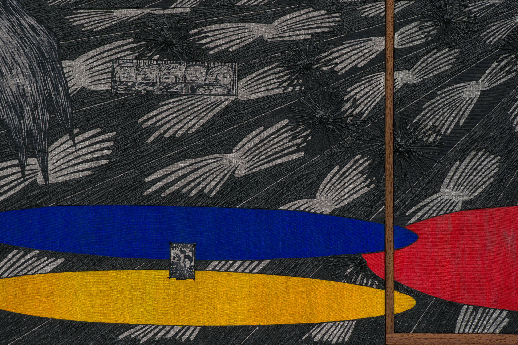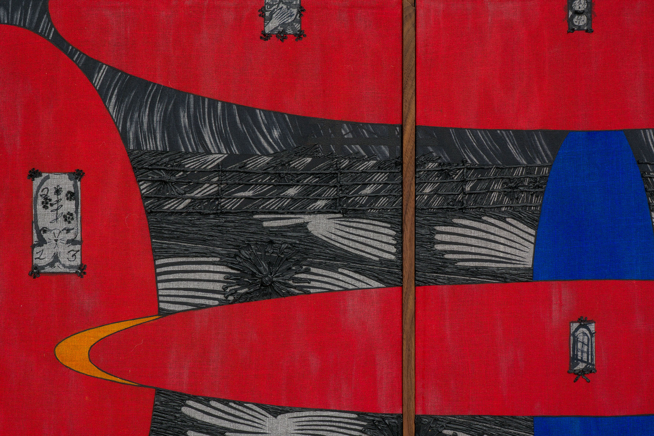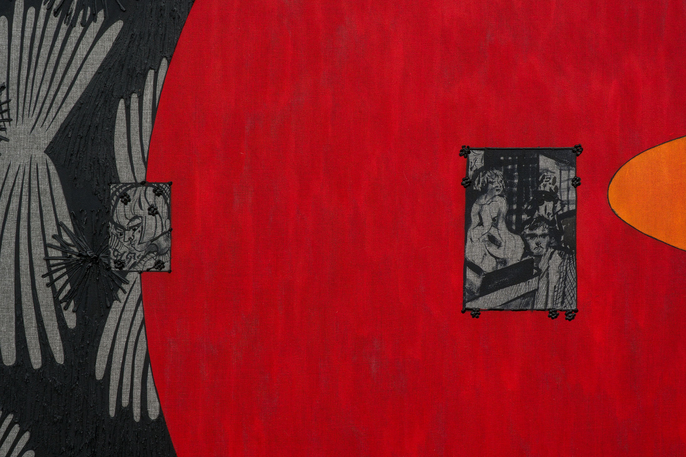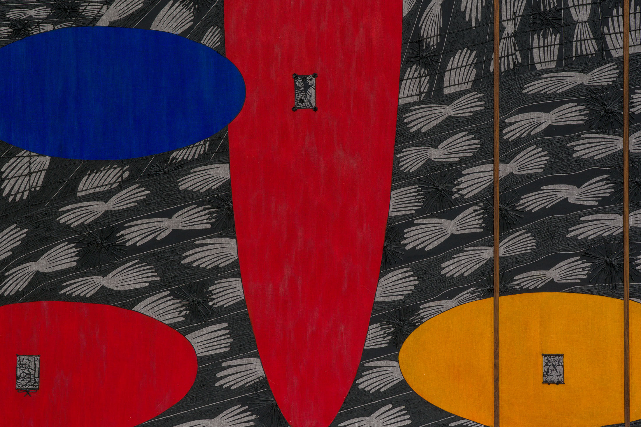 Fields of textured oil paint fall into lines like troops in formation, serving as the building blocks for her expansive landscapes. In works such as Snidley Whiplash (2025), rows of floral motifs tug toward the horizon, a form of repetition that Cook describes as an exercise in tedium. Perhaps suggestive of the working masses, they simultaneously read like a chromosomal body mutated, alienated from its natural form. Her landscapes are otherwise bare if not for the pylon towers, a borrowed Greek term for gatekeeper, acting as lifeline, tether and witness to our increasing detachment from the physical world. Large geometric forms disrupt the terrain, coded in vibrant primary colors that play on systems of categorization, control and the technical language of color.