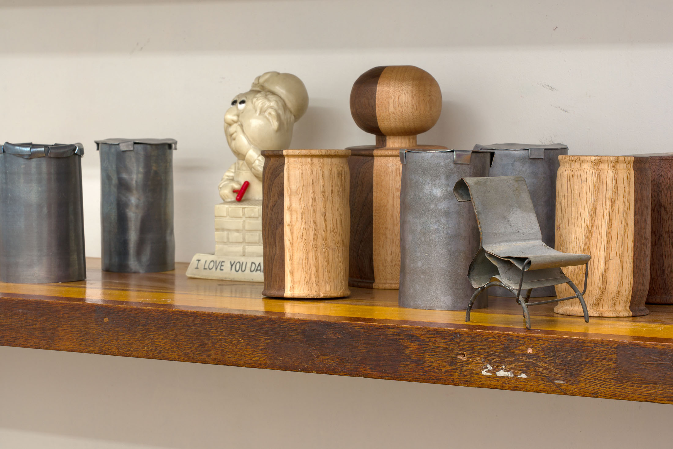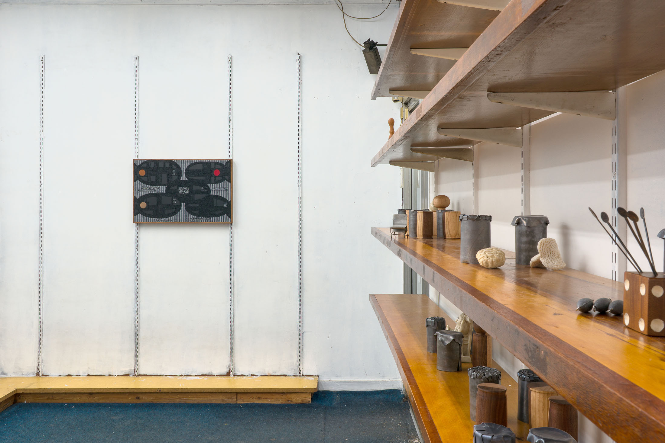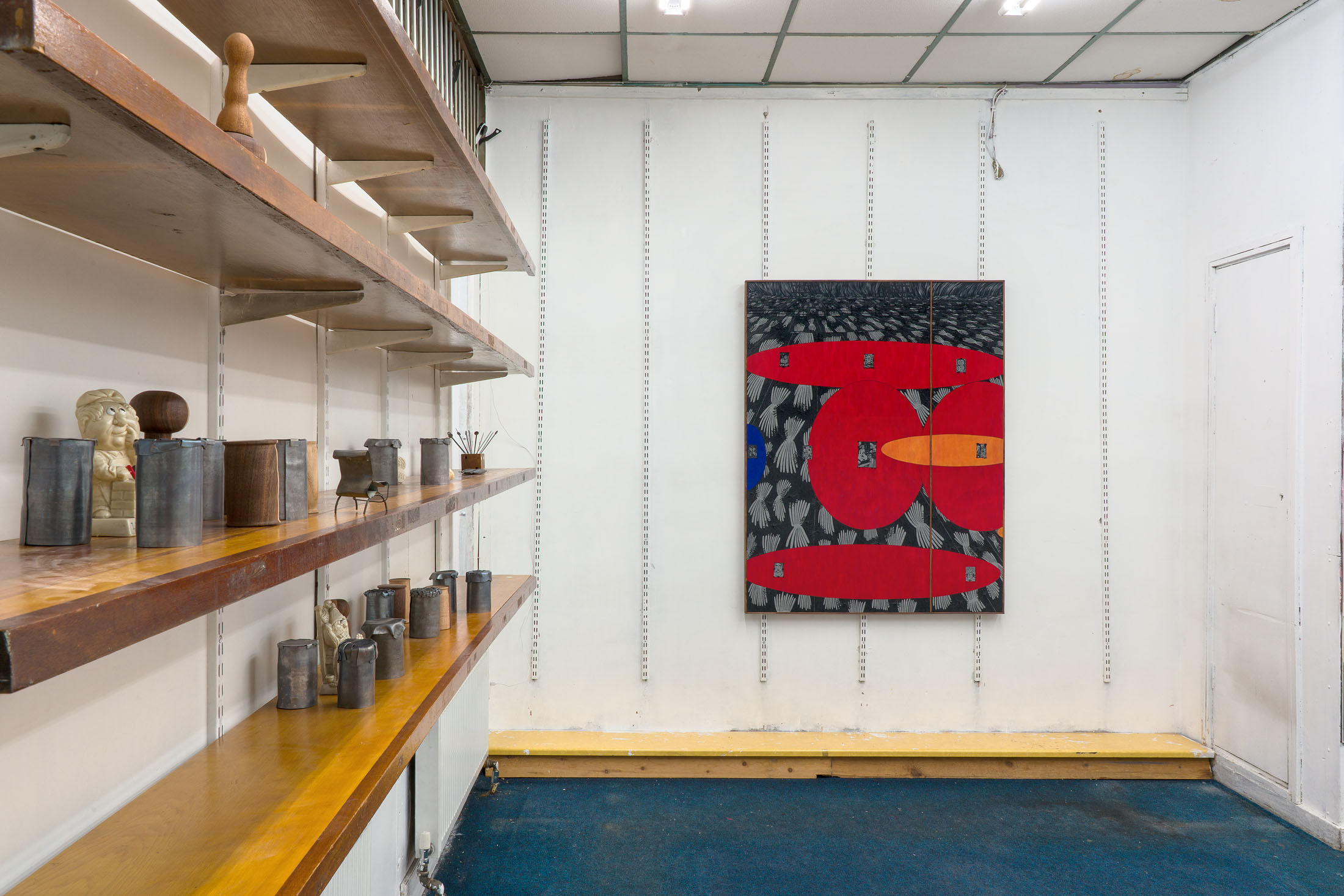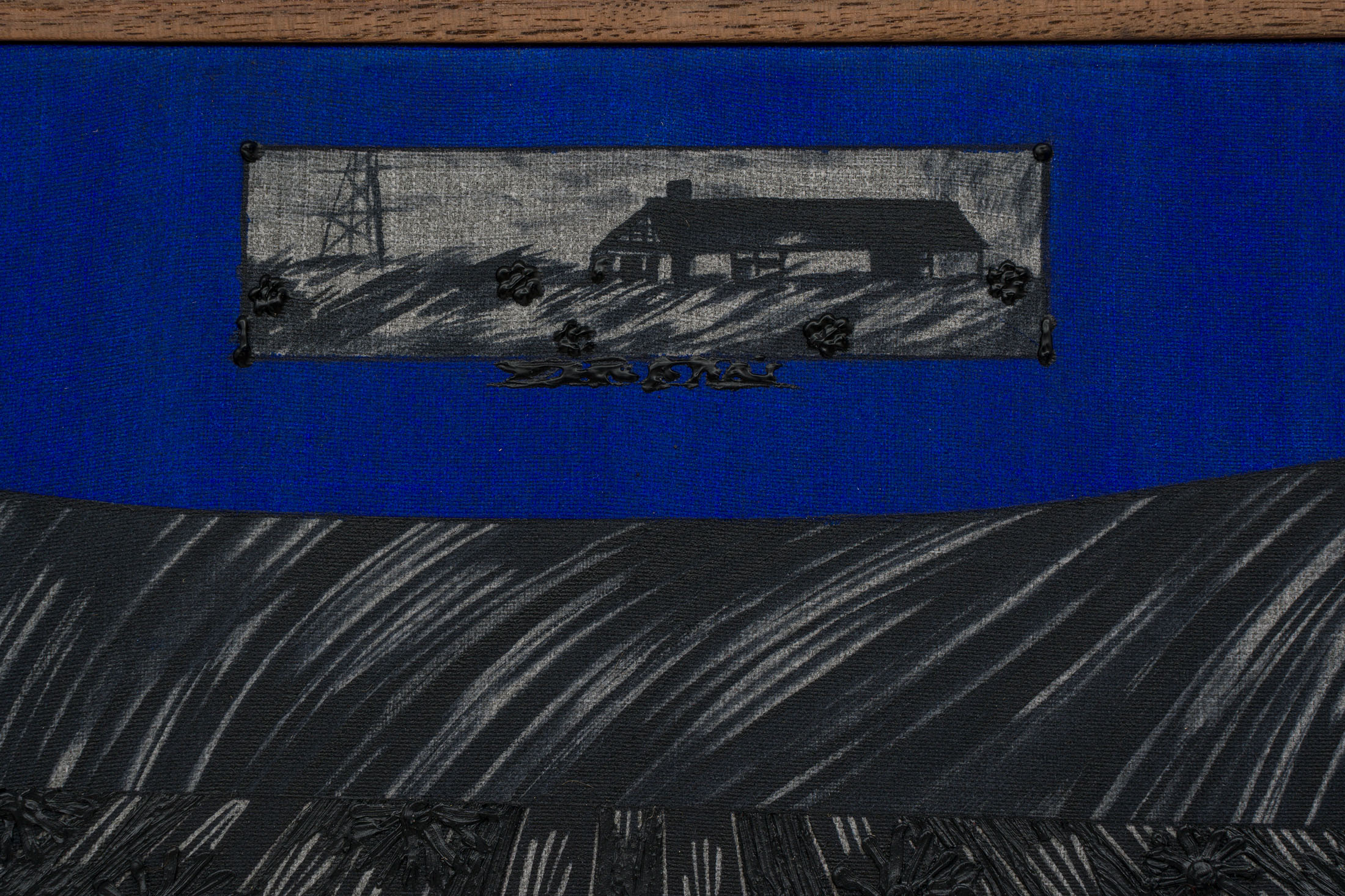 Through parted curtains and across traditional tablescapes, Cook interweaves vignettes of performed domestic life, satirical windows that caricature the working man and the ‘good American’. Lead cans and small jars, like those of a typical grocery display, are arranged across the gallery shelves; toeing the line between light humor and sheer mockery, the artist makes direct reference to the most commonplace toxic household detritus. As a counterbalance or bathetic shift to the dangers she presents, Cook infuses her compositions with the fantastical and otherworldly: in Dudley Do-right (2025), circular irrigation farms start to resemble crop circles, punctuated by oval specters that increasingly read like hovering UFOs. Cook describes the Minnesota sky as colored by mysterious lights and alien activity; in her compositions, stars turn to long streaks, moving at sci-fi level speeds in temporal tension with the otherwise quiet countryside.