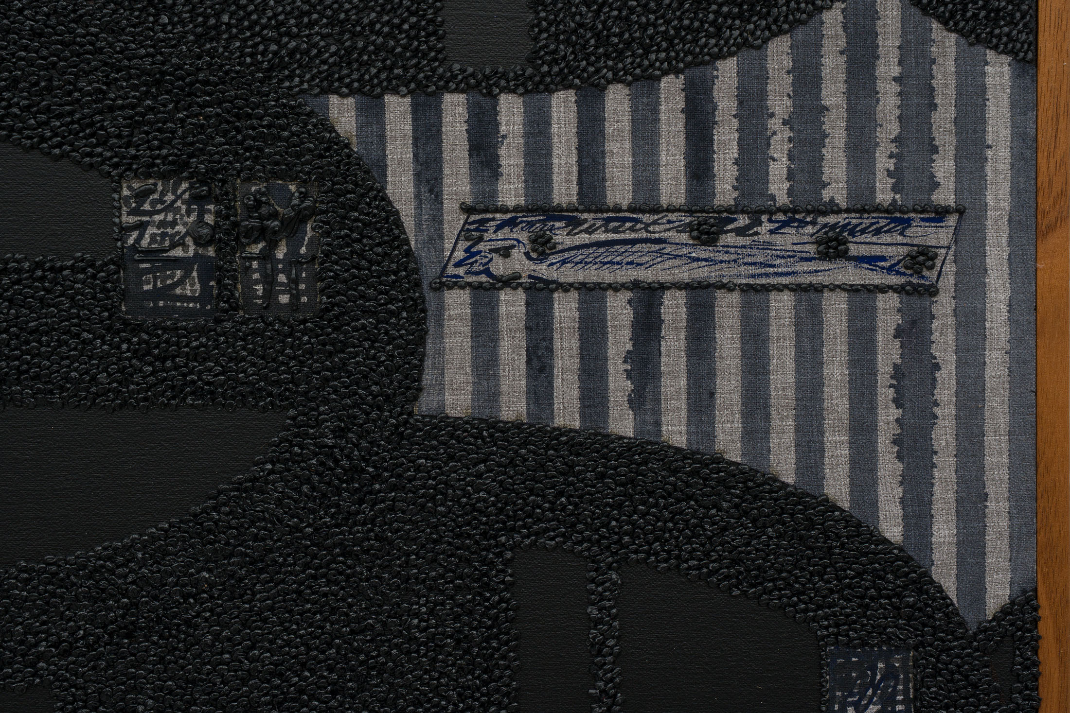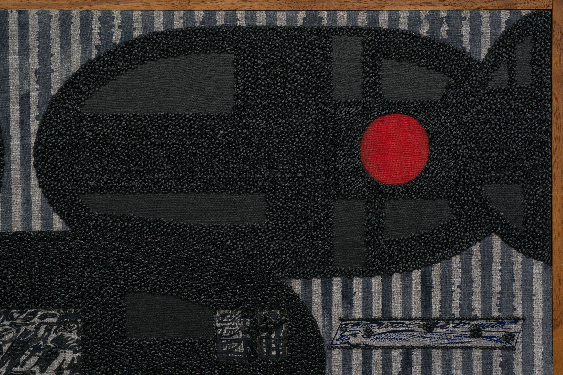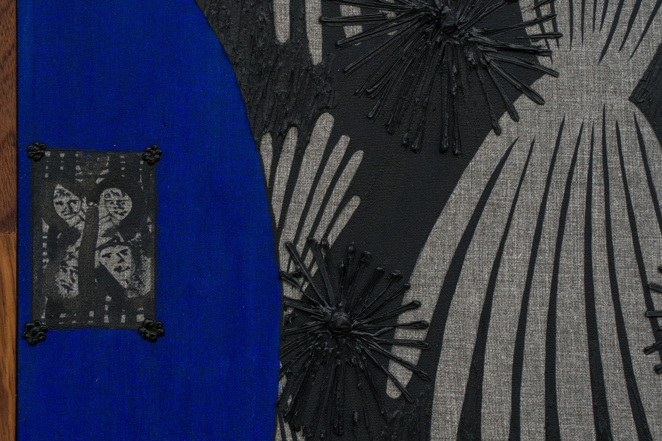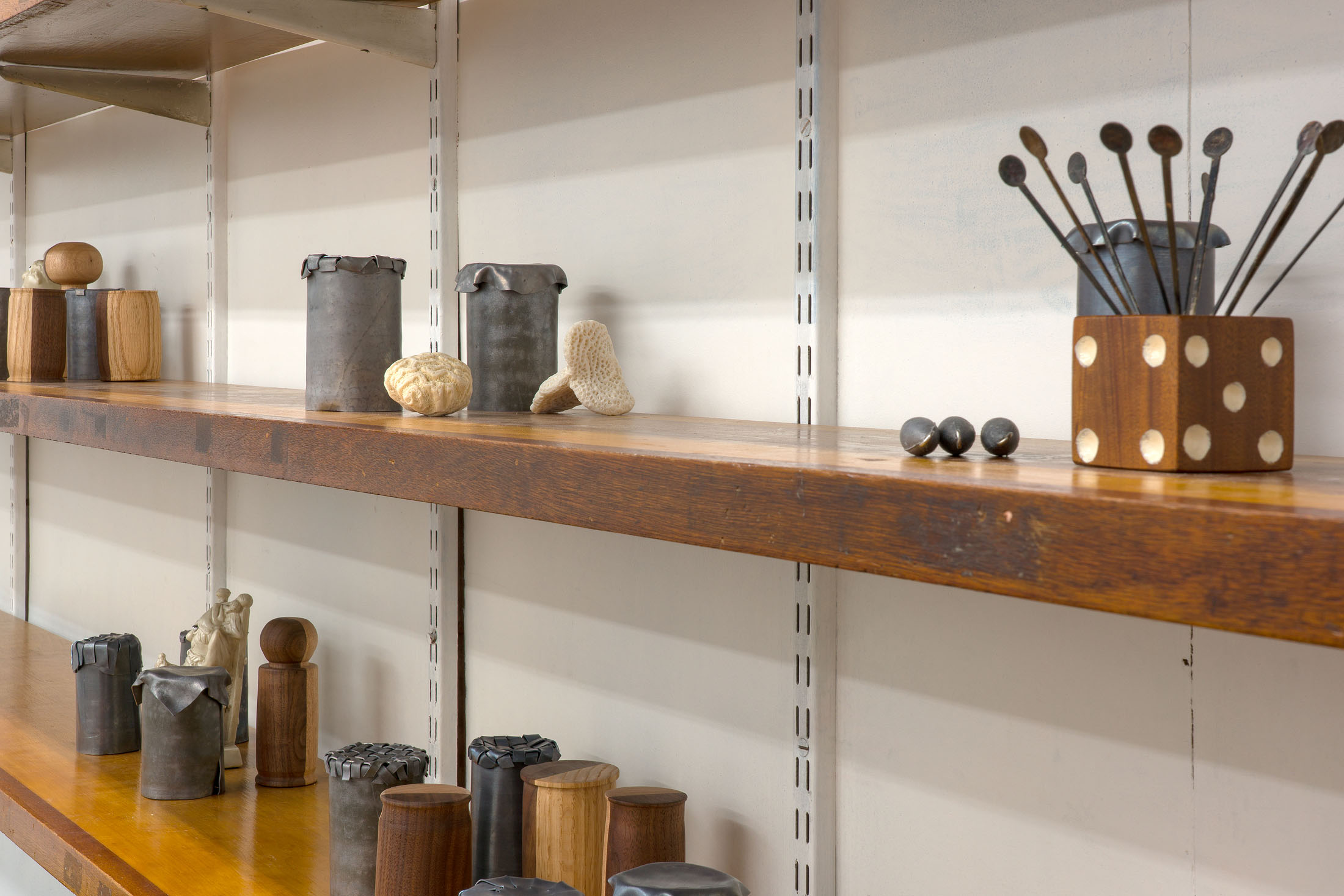 Through parted curtains and across traditional tablescapes, Cook interweaves vignettes of performed domestic life, satirical windows that caricature the working man and the ‘good American’. Lead cans and small jars, like those of a typical grocery display, are arranged across the gallery shelves; toeing the line between light humor and sheer mockery, the artist makes direct reference to the most commonplace toxic household detritus. As a counterbalance or bathetic shift to the dangers she presents, Cook infuses her compositions with the fantastical and otherworldly: in Dudley Do-right (2025), circular irrigation farms start to resemble crop circles, punctuated by oval specters that increasingly read like hovering UFOs. Cook describes the Minnesota sky as colored by mysterious lights and alien activity; in her compositions, stars turn to long streaks, moving at sci-fi level speeds in temporal tension with the otherwise quiet countryside.