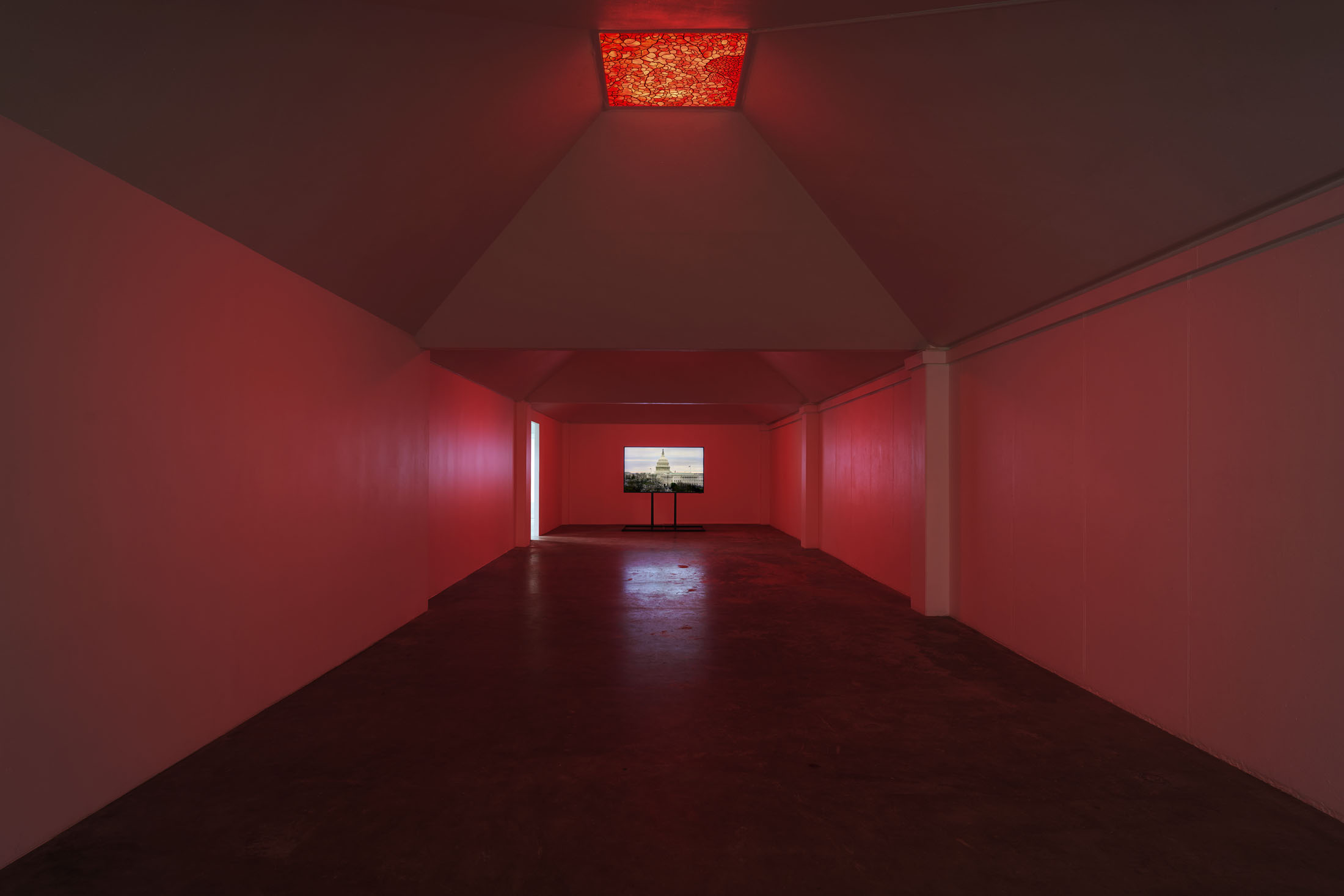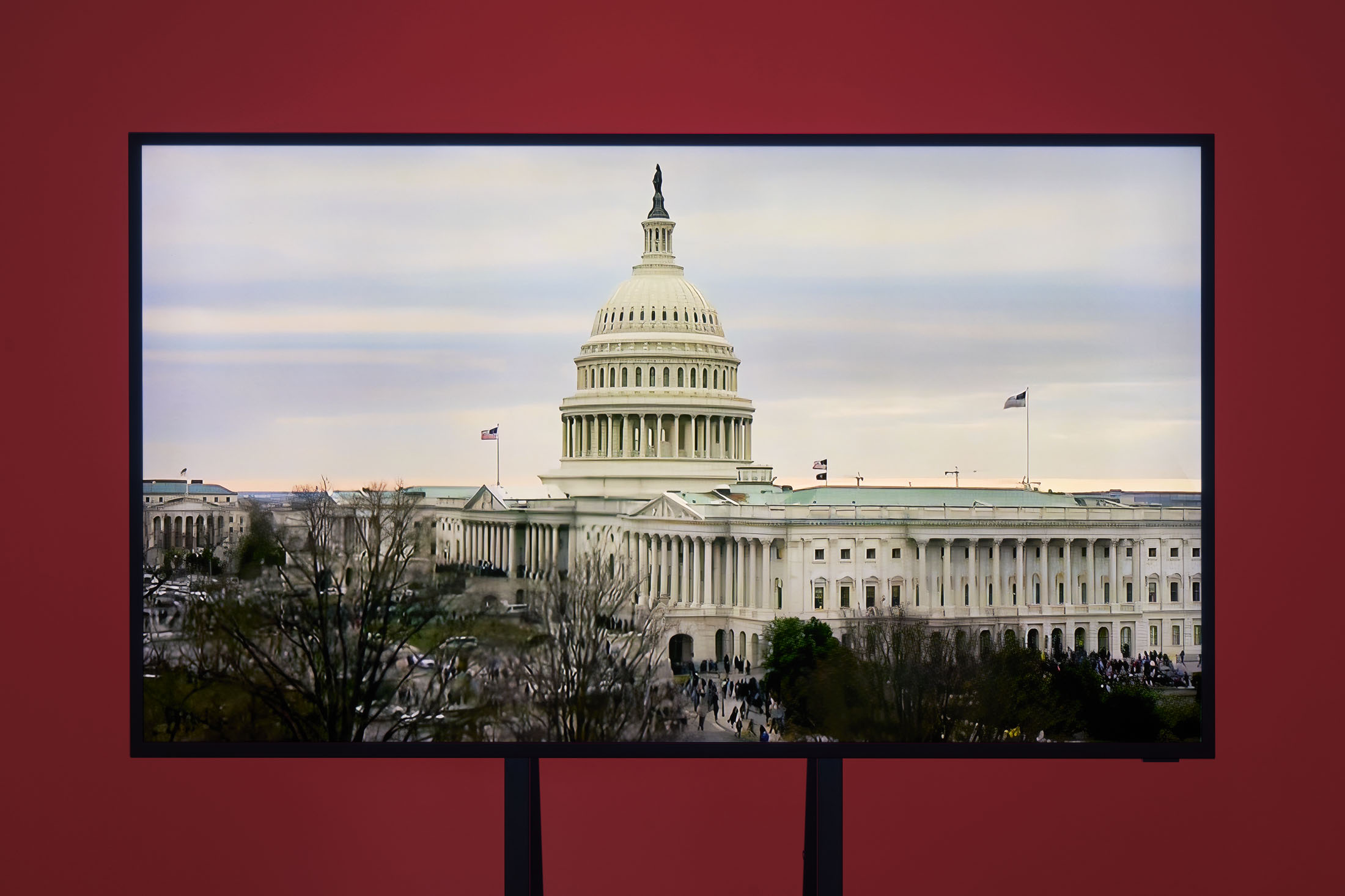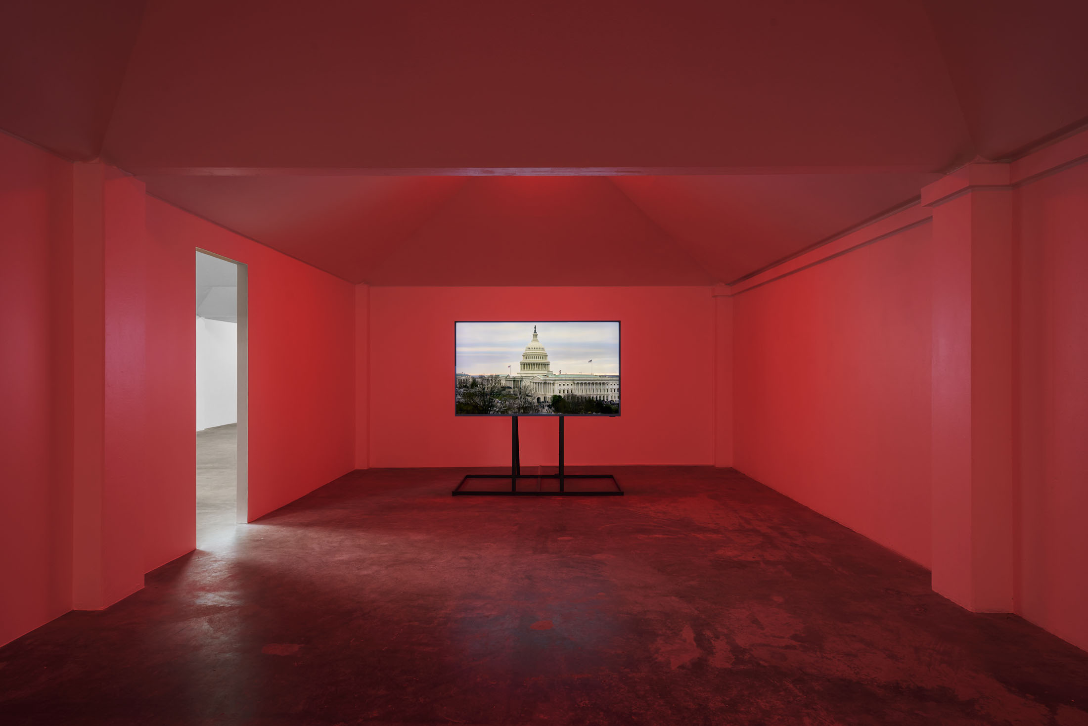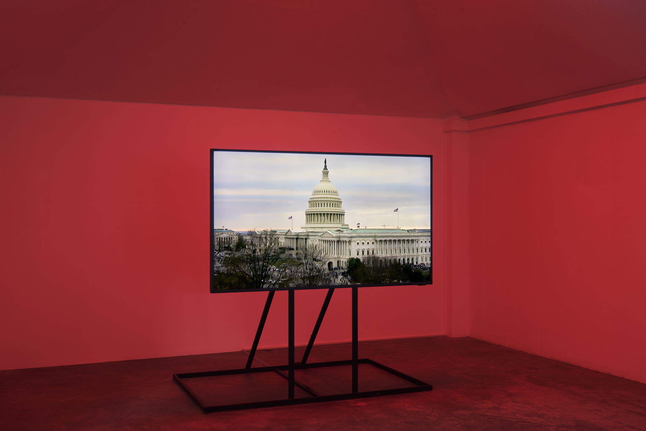 Rindon Johnson turns his attention to a symbol of democratic representation: the Capitol in Washington, D.C. In an AI-assisted live-stream video work, the riots on January 6th 2021 is rendered from a distance, its actors appearing almost like streams of ants. Meanwhile this detached perspective belies the profound fracture it signifies: a society driven by polarisation, where democratic institutions are disregarded or eroded. Johnson transforms this moment into a symbol of technologically amplified rupture (by algorithmic manipulation) – a real, but digitally intensified, assault on democracy’s foundations. His hand-crafted glass ceiling pieces, produced in Ukraine, enter into dialogue with the video by echoing the patterns of brain cancer cells. In doing so, Johnson opens up a discussion on the physical and psychological weakening of systems, and raises questions about interruption, containment, and the possibility of healing.