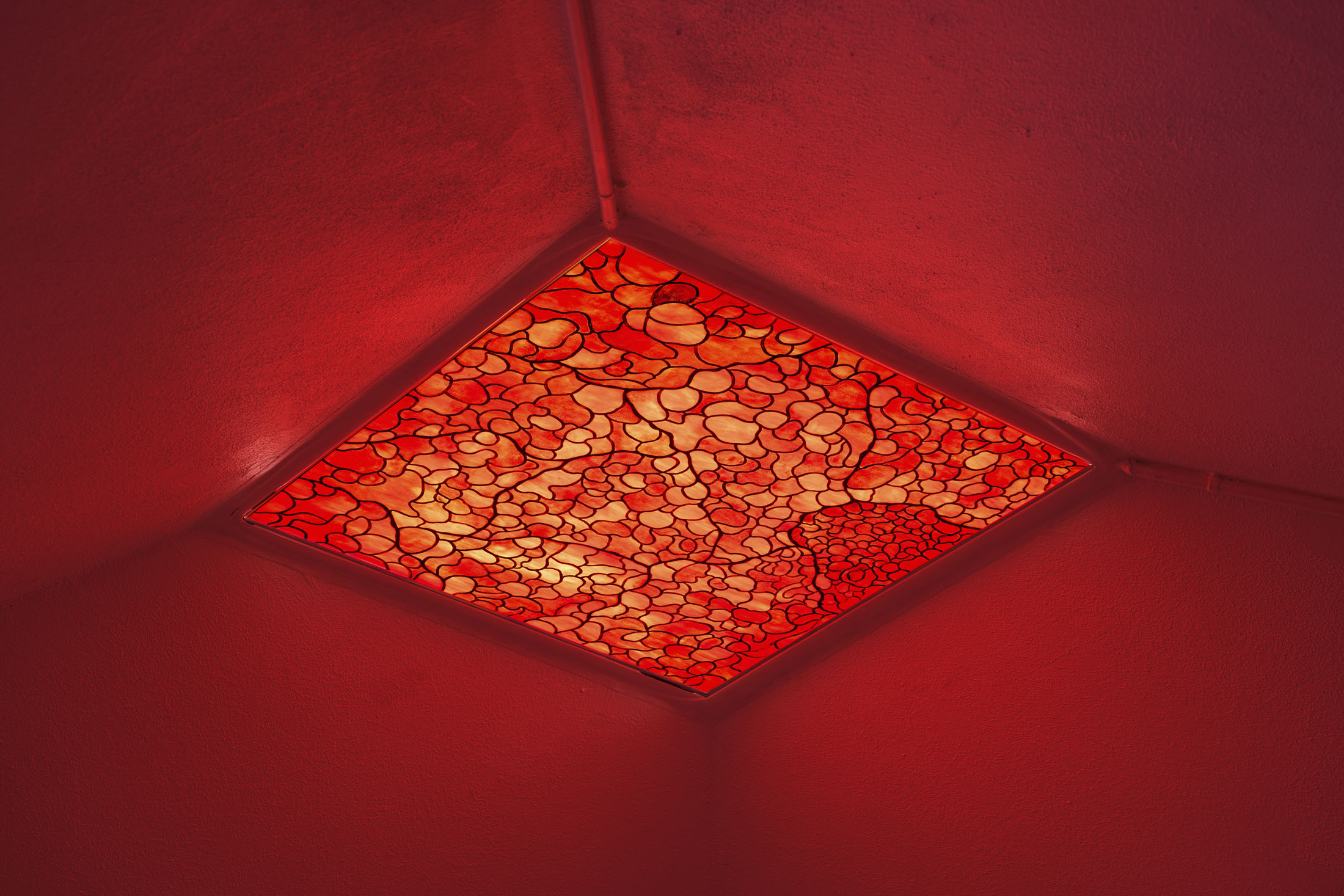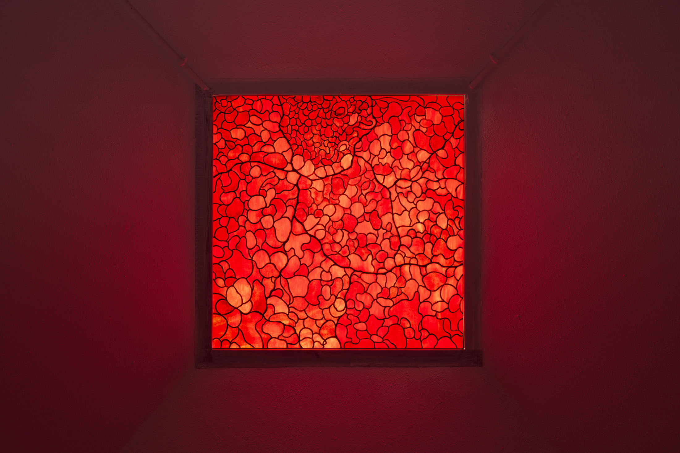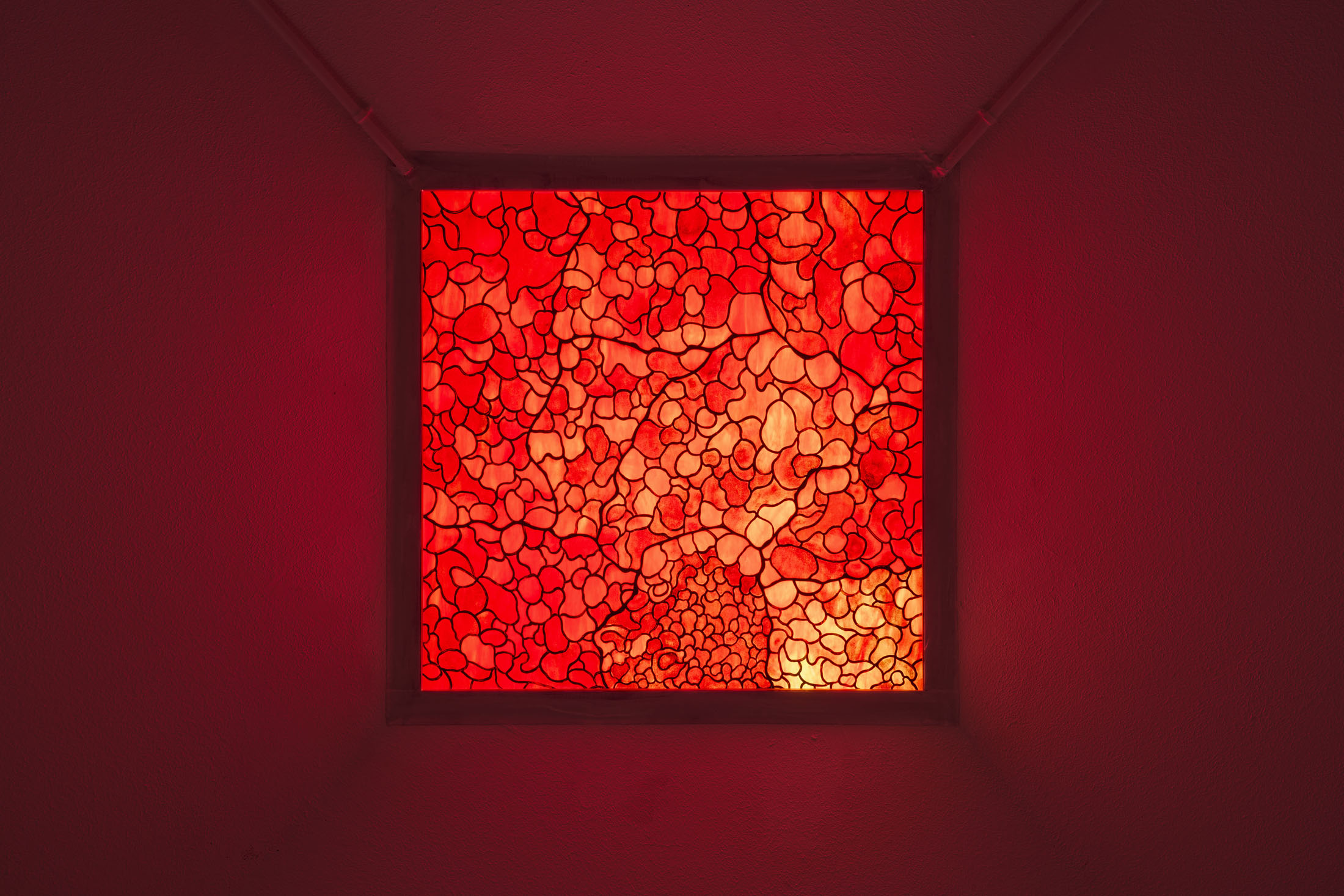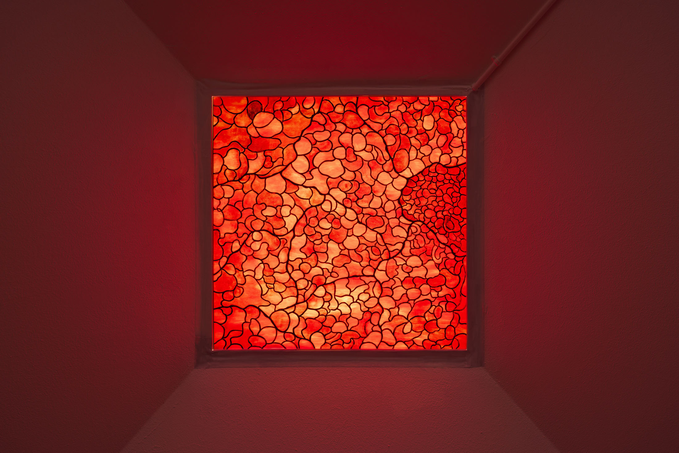 Rindon Johnson turns his attention to a symbol of democratic representation: the Capitol in Washington, D.C. In an AI-assisted live-stream video work, the riots on January 6th 2021 is rendered from a distance, its actors appearing almost like streams of ants. Meanwhile this detached perspective belies the profound fracture it signifies: a society driven by polarisation, where democratic institutions are disregarded or eroded. Johnson transforms this moment into a symbol of technologically amplified rupture (by algorithmic manipulation) – a real, but digitally intensified, assault on democracy’s foundations. His hand-crafted glass ceiling pieces, produced in Ukraine, enter into dialogue with the video by echoing the patterns of brain cancer cells. In doing so, Johnson opens up a discussion on the physical and psychological weakening of systems, and raises questions about interruption, containment, and the possibility of healing.