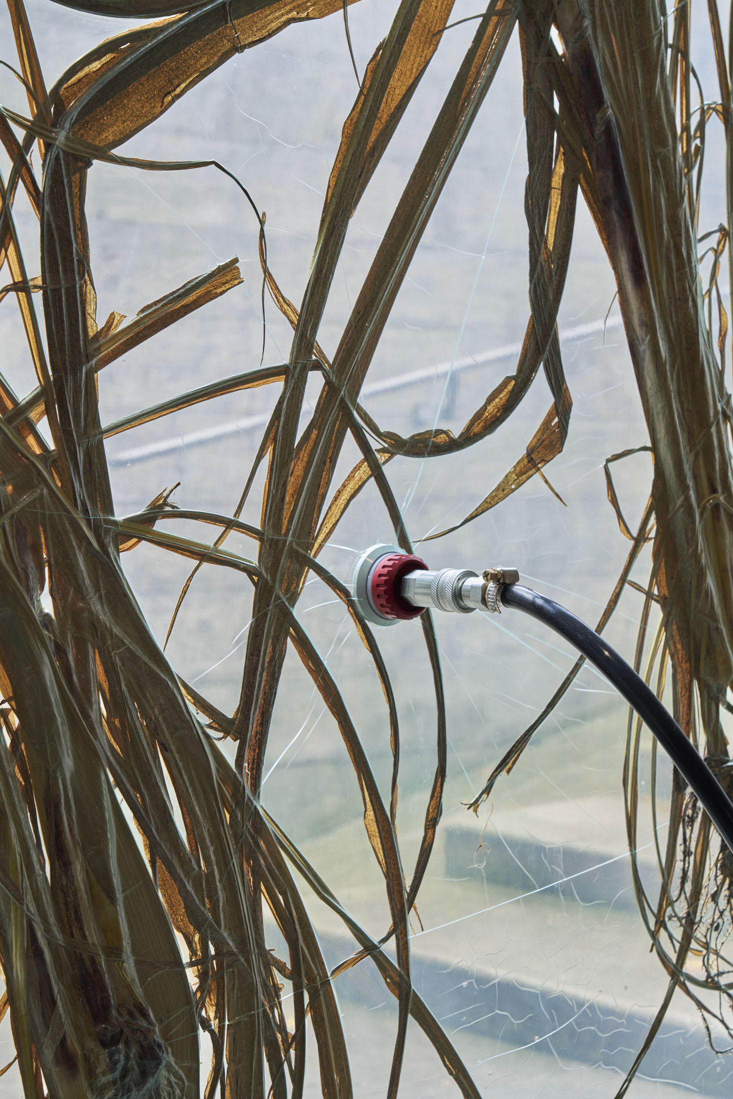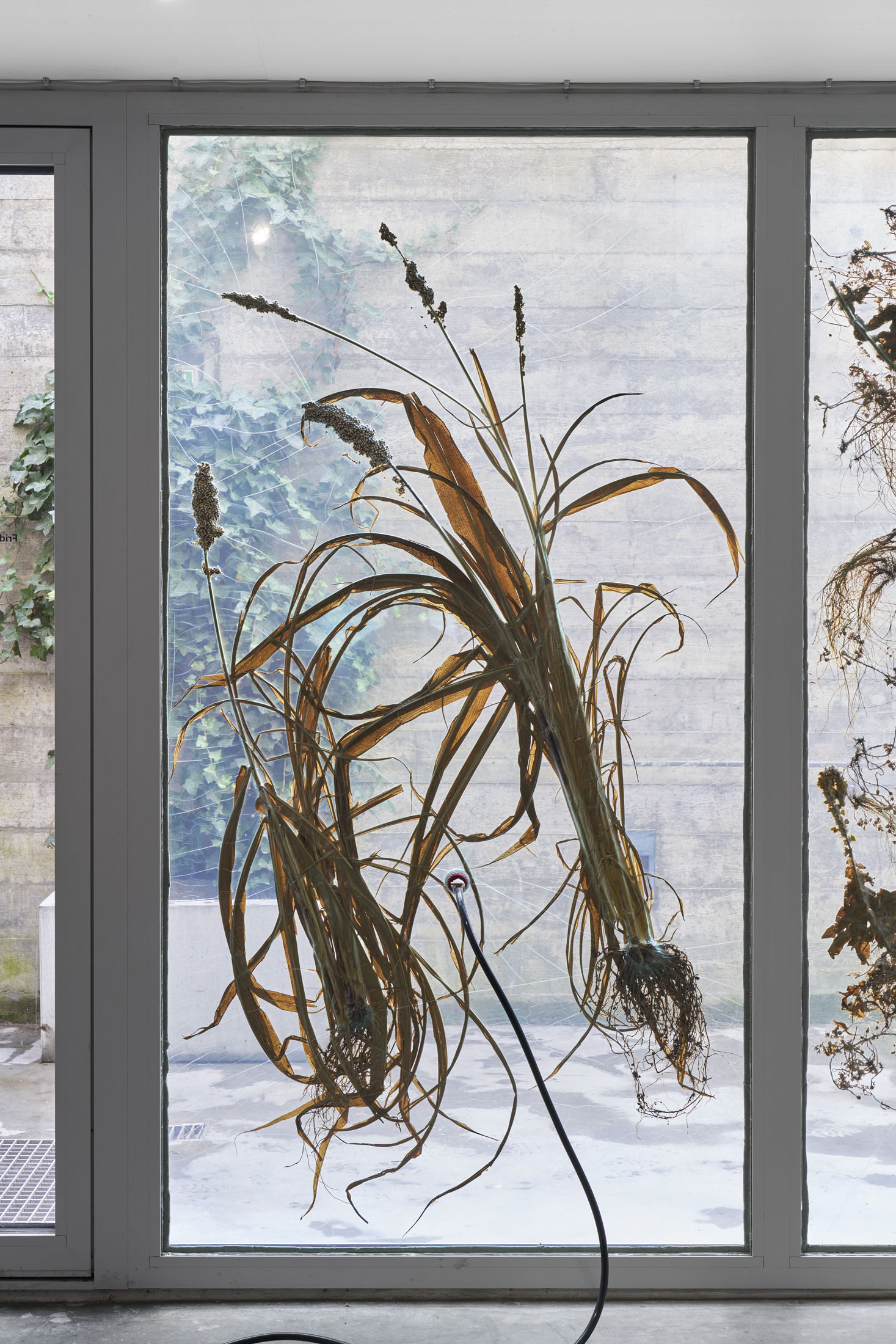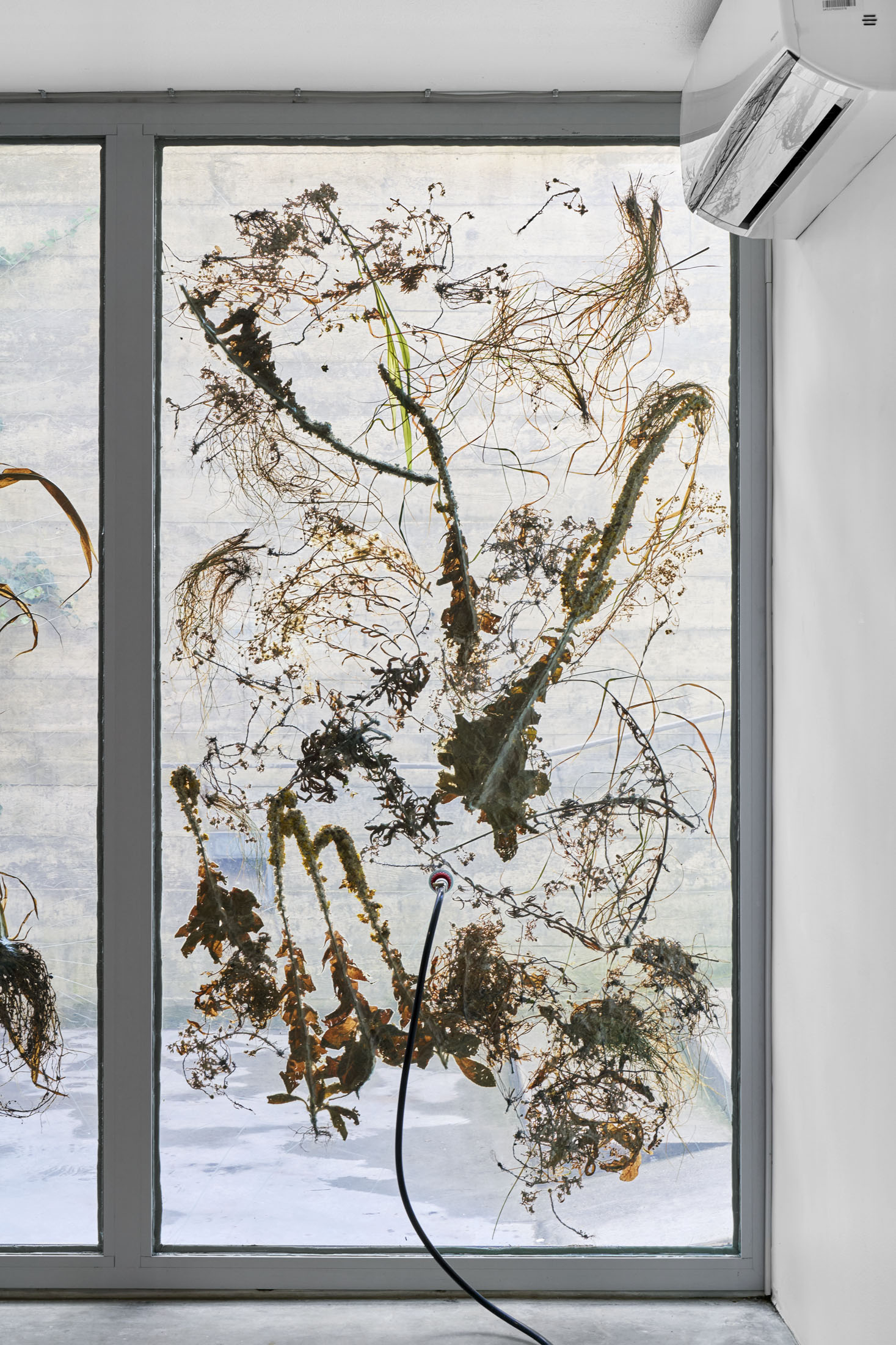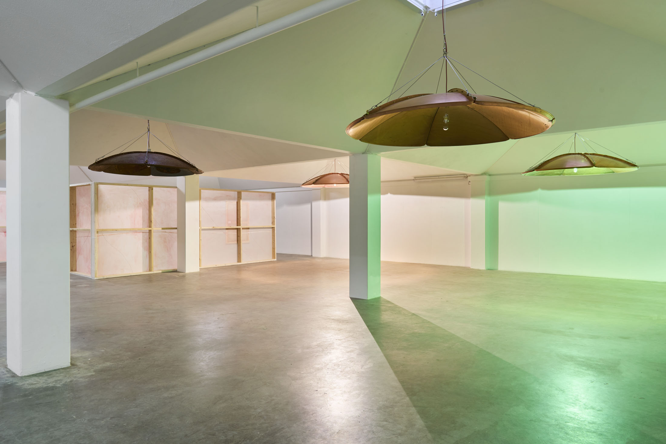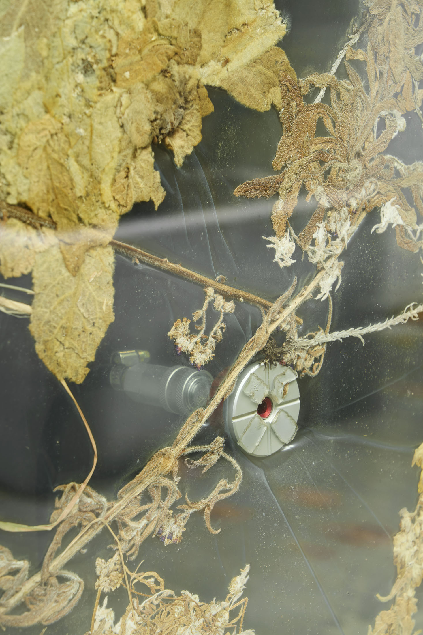 Amitai Romm and Bjarke Hvass Kure explore imaginaries of future landscapes. Their vacuum installation preserves Danish plant specimens from a wild fallow field alongside sorghum – a non-native yet resilient cereal that thrives in heat, drought, and intense light. The plants have been part of an artistic experiment in a climate simulation facility that controls temperature, CO₂, humidity, and light. Here they were exposed to scenarios ranging from the onset of a new ice age to prolonged heatwaves. In this way, the plants become witnesses to a speculative and accelerated play with the climatic parameters of reality. Now enclosed without air, they are preserved as images, stopped in time. In the rear of the exhibition, ceiling sculptures by Romm continue the theme, using lamps from a climate simulator in a series of parabolic forms designed to transmit and receive information.