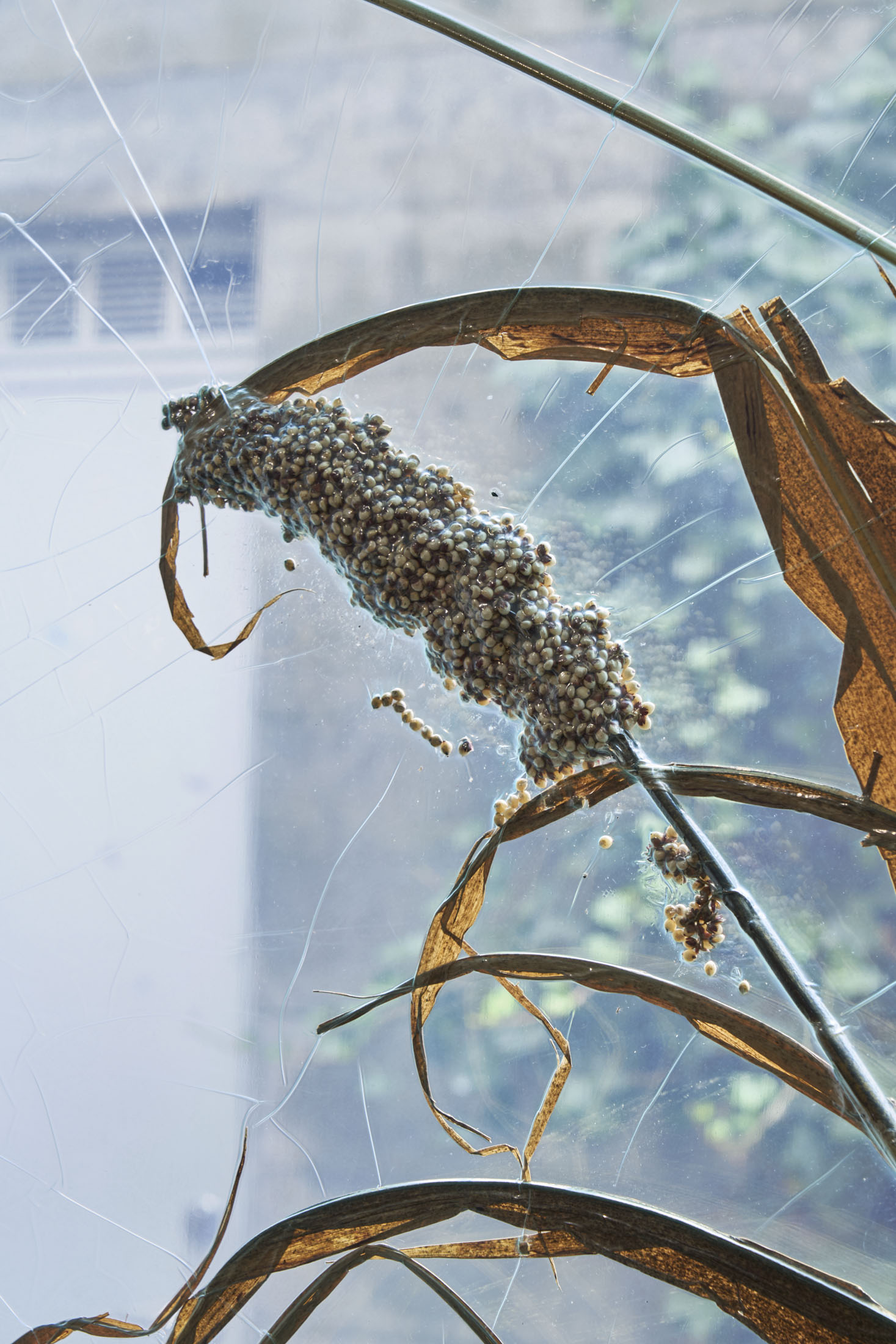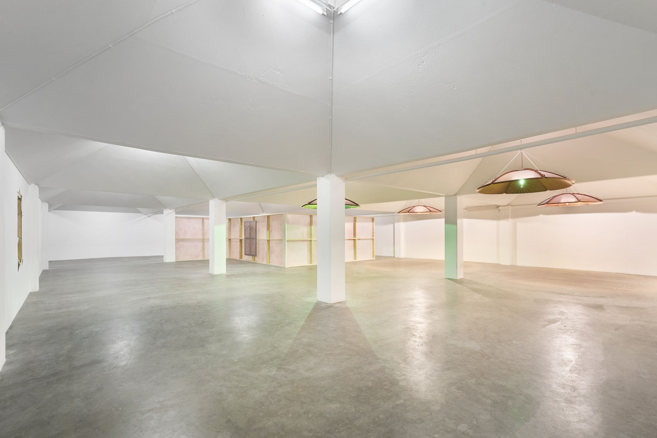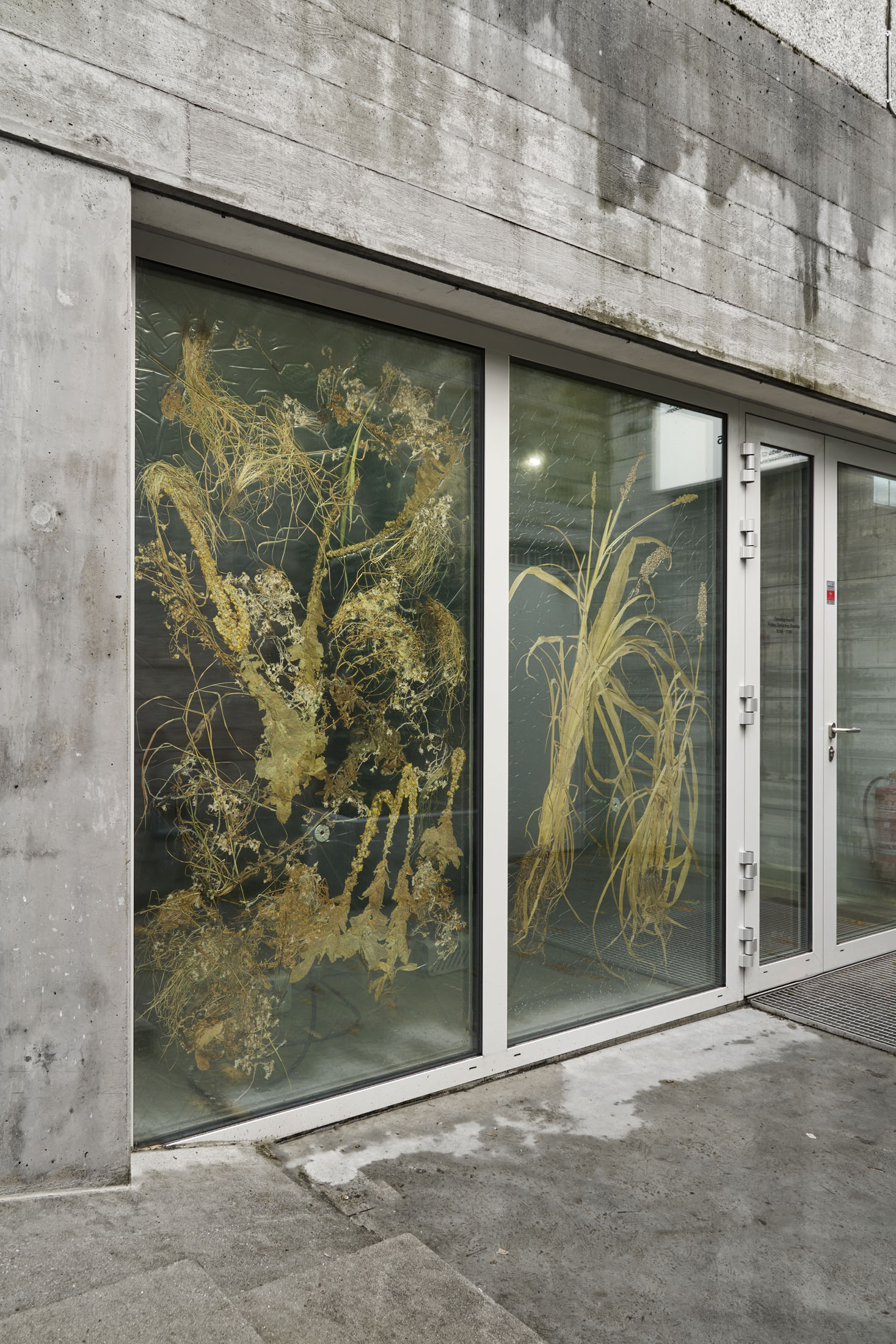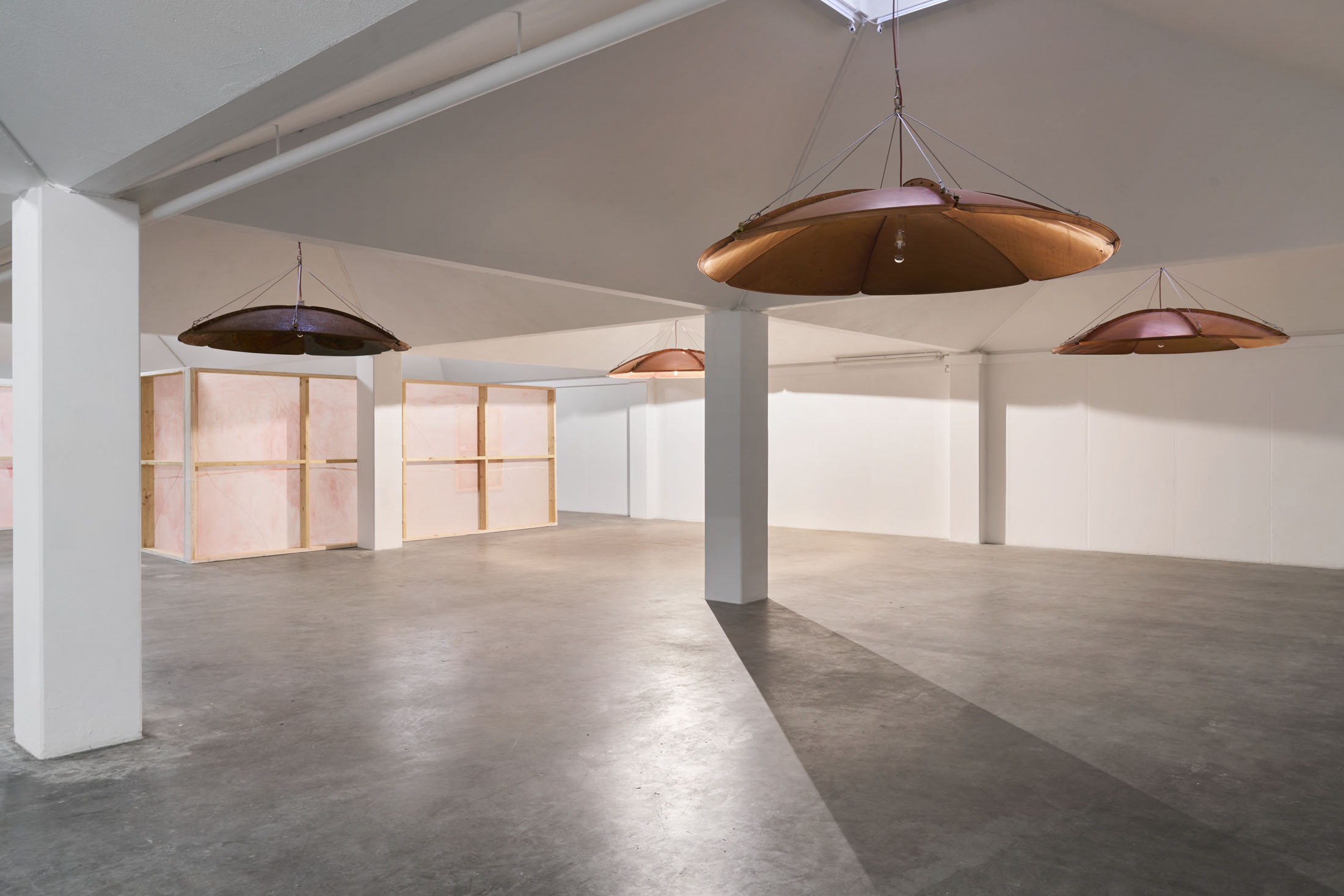 Amitai Romm and Bjarke Hvass Kure explore imaginaries of future landscapes. Their vacuum installation preserves Danish plant specimens from a wild fallow field alongside sorghum – a non-native yet resilient cereal that thrives in heat, drought, and intense light. The plants have been part of an artistic experiment in a climate simulation facility that controls temperature, CO₂, humidity, and light. Here they were exposed to scenarios ranging from the onset of a new ice age to prolonged heatwaves. In this way, the plants become witnesses to a speculative and accelerated play with the climatic parameters of reality. Now enclosed without air, they are preserved as images, stopped in time. In the rear of the exhibition, ceiling sculptures by Romm continue the theme, using lamps from a climate simulator in a series of parabolic forms designed to transmit and receive information.