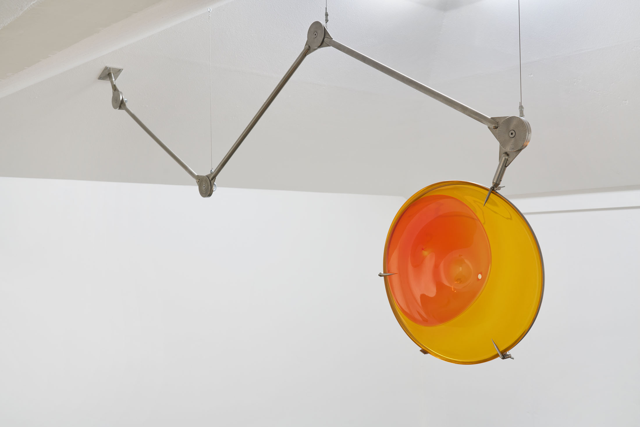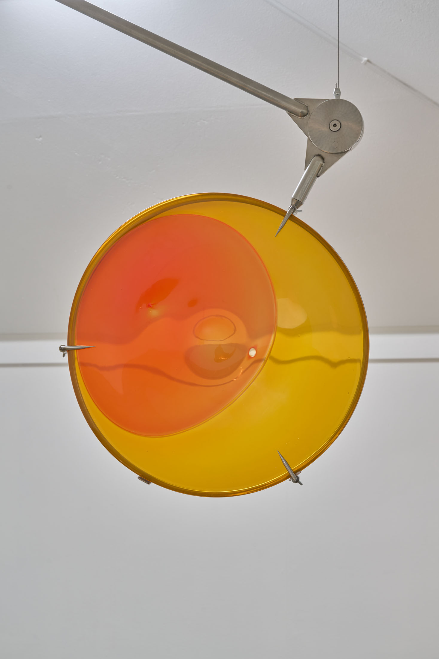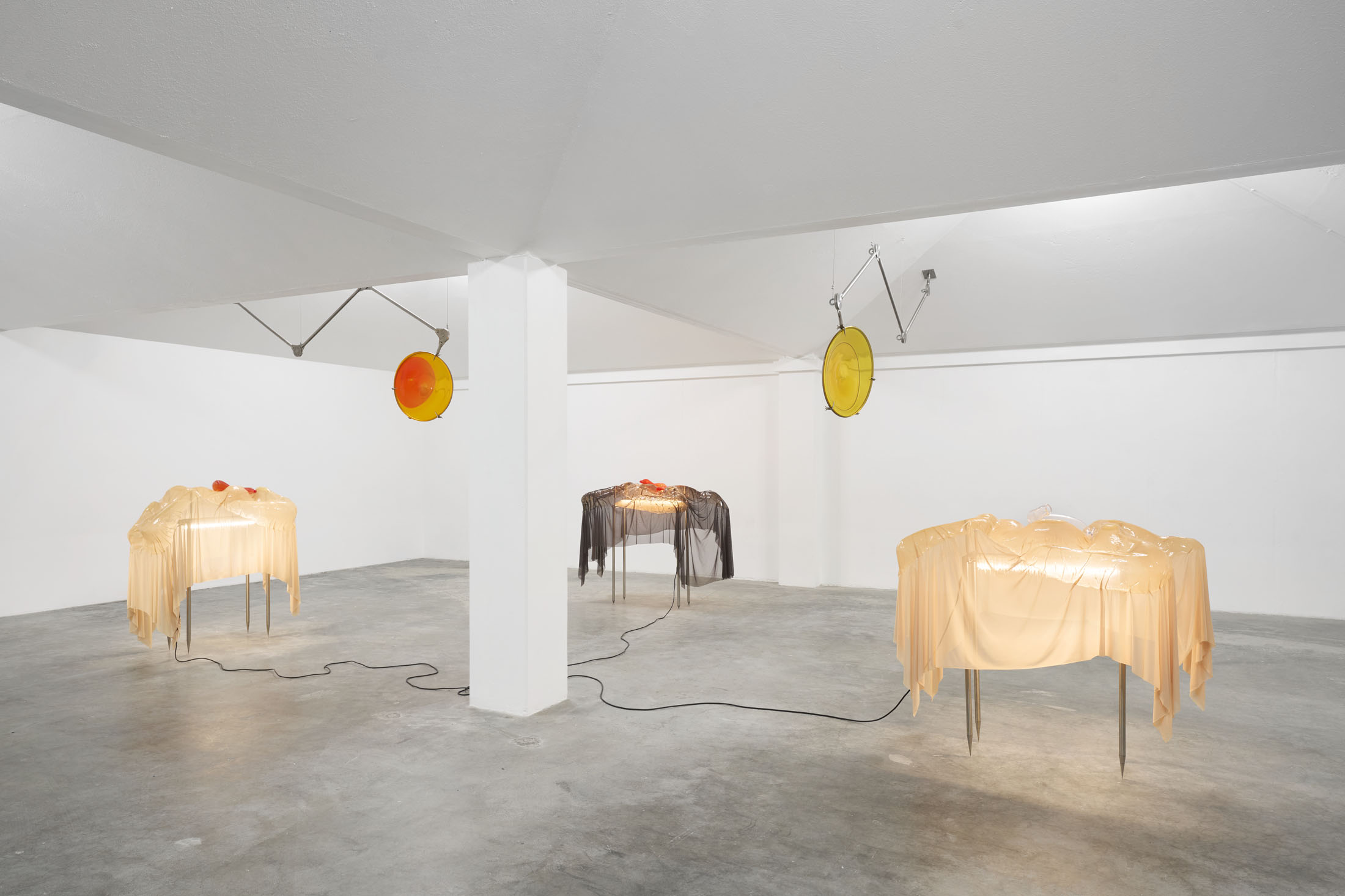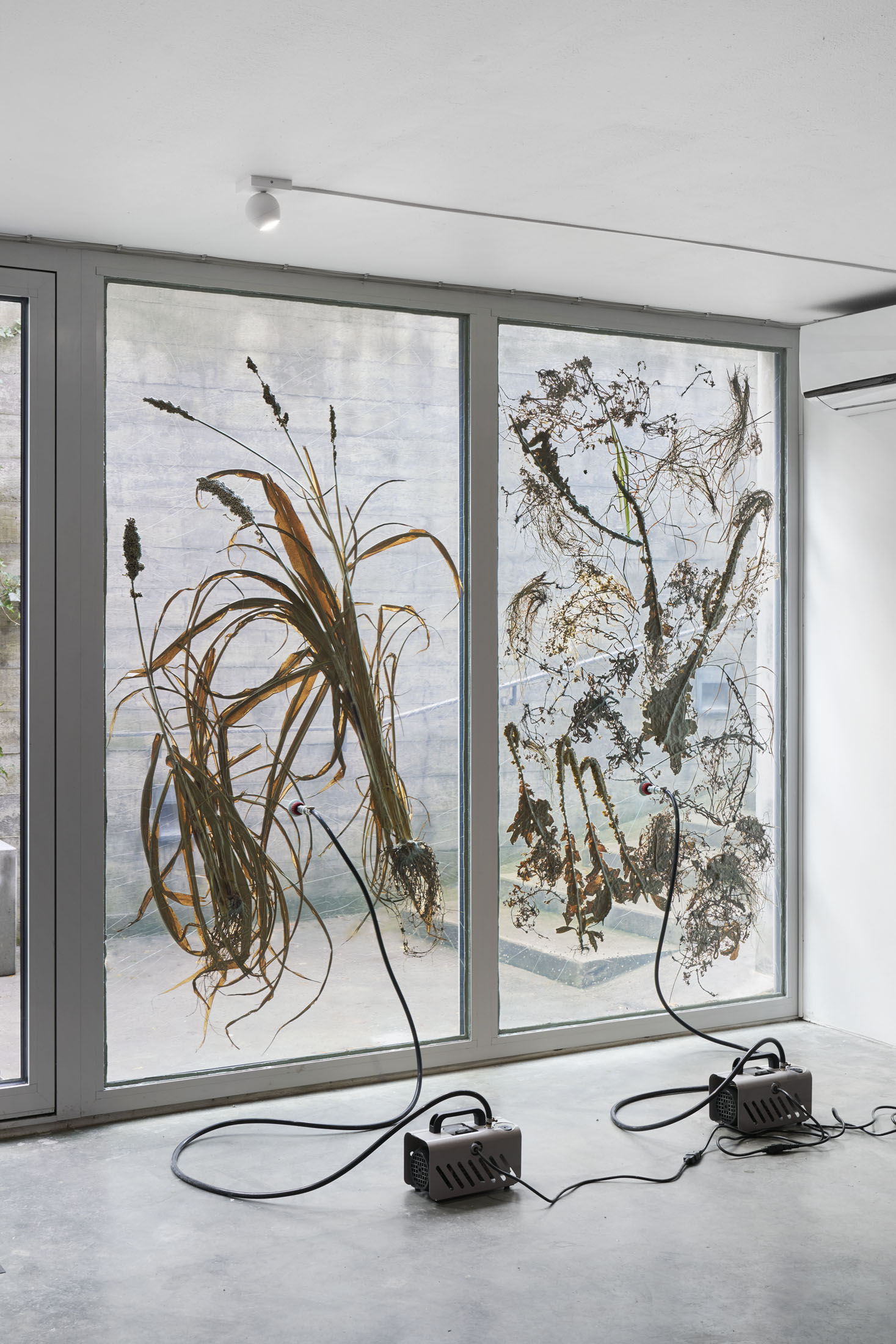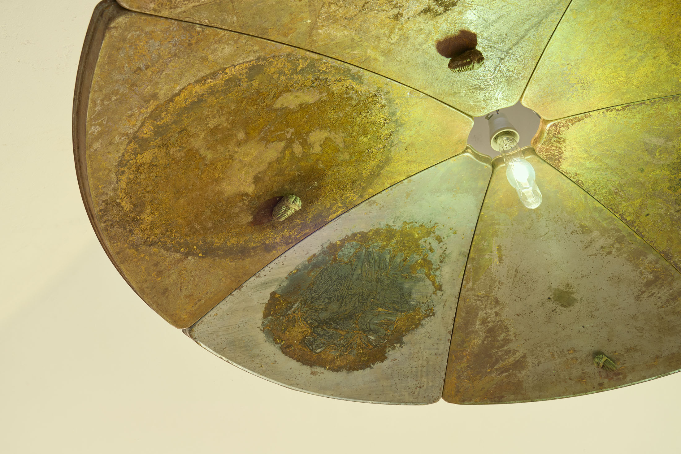 Amitai Romm and Bjarke Hvass Kure explore imaginaries of future landscapes. Their vacuum installation preserves Danish plant specimens from a wild fallow field alongside sorghum – a non-native yet resilient cereal that thrives in heat, drought, and intense light. The plants have been part of an artistic experiment in a climate simulation facility that controls temperature, CO₂, humidity, and light. Here they were exposed to scenarios ranging from the onset of a new ice age to prolonged heatwaves. In this way, the plants become witnesses to a speculative and accelerated play with the climatic parameters of reality. Now enclosed without air, they are preserved as images, stopped in time. In the rear of the exhibition, ceiling sculptures by Romm continue the theme, using lamps from a climate simulator in a series of parabolic forms designed to transmit and receive information.