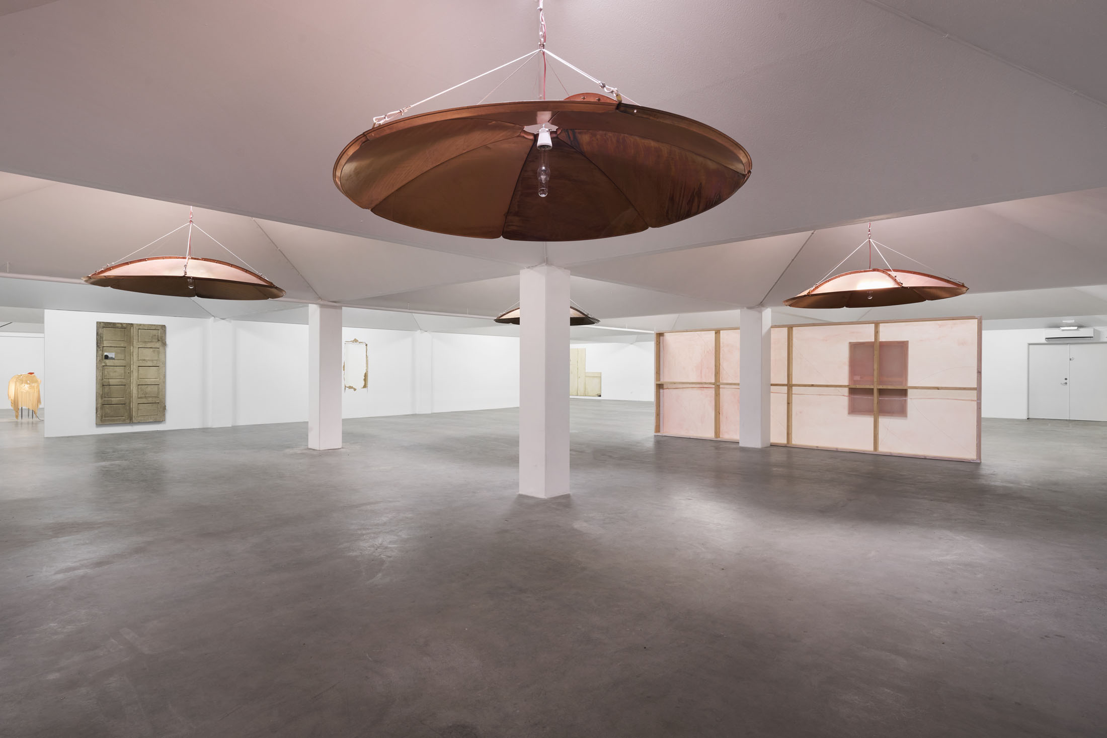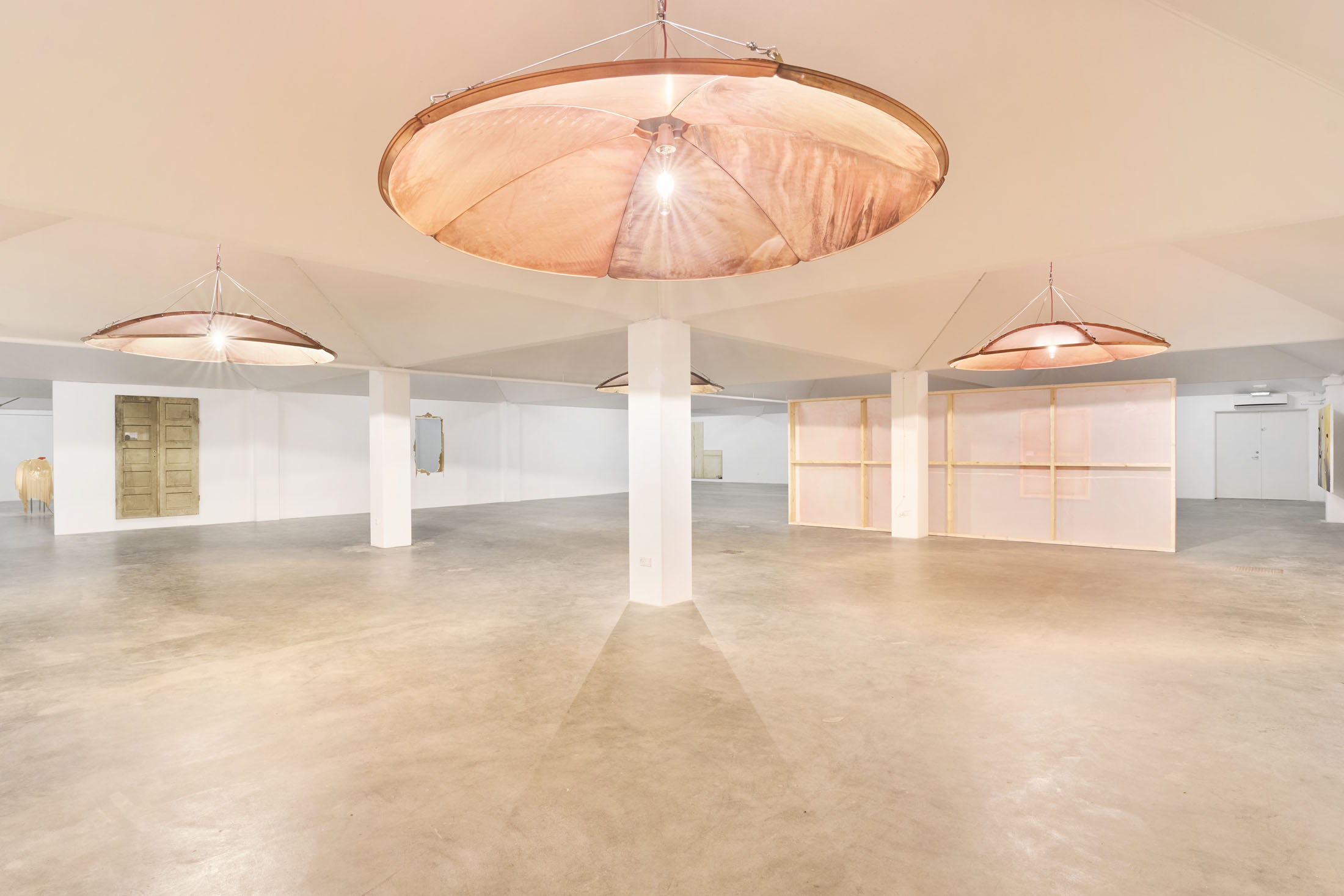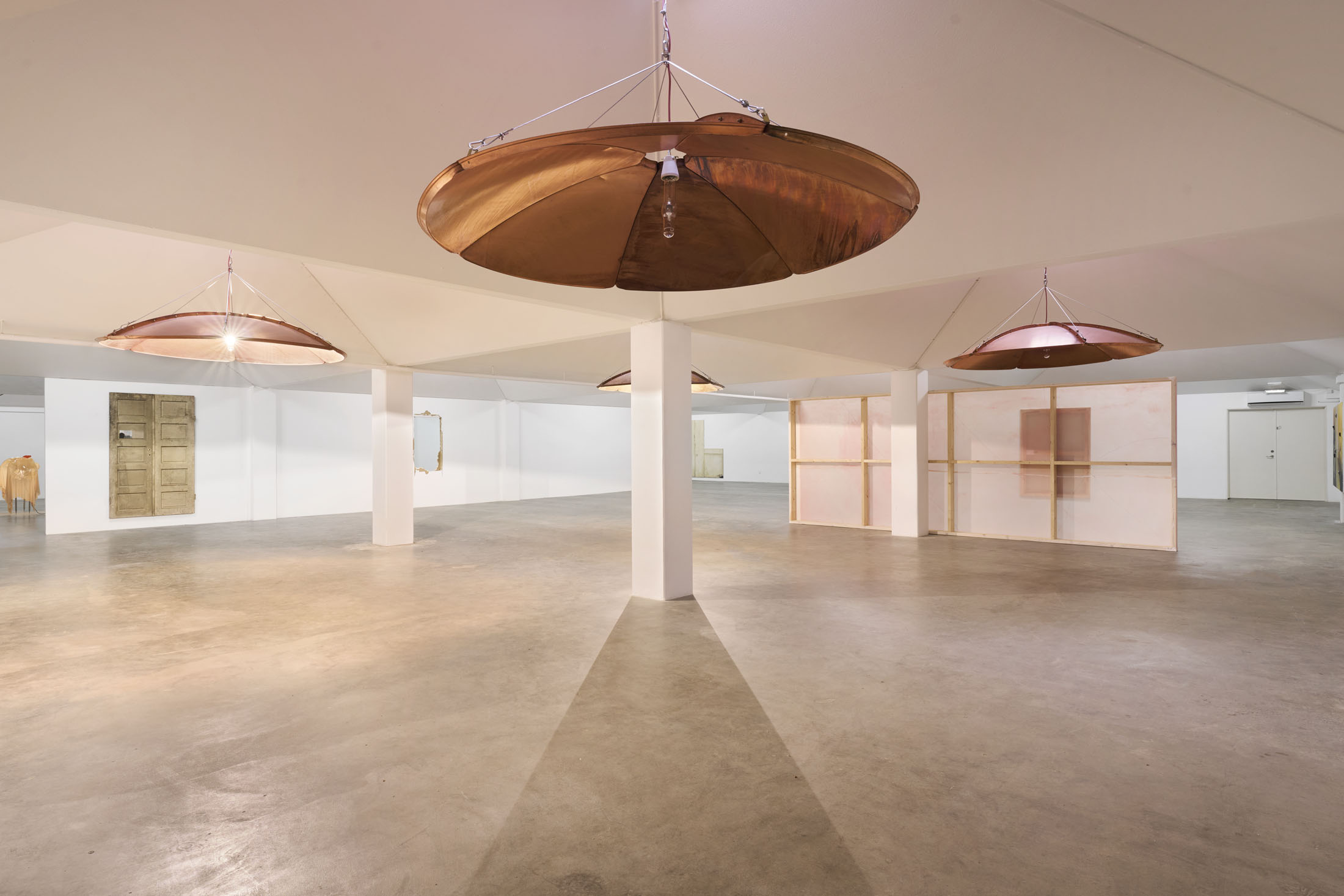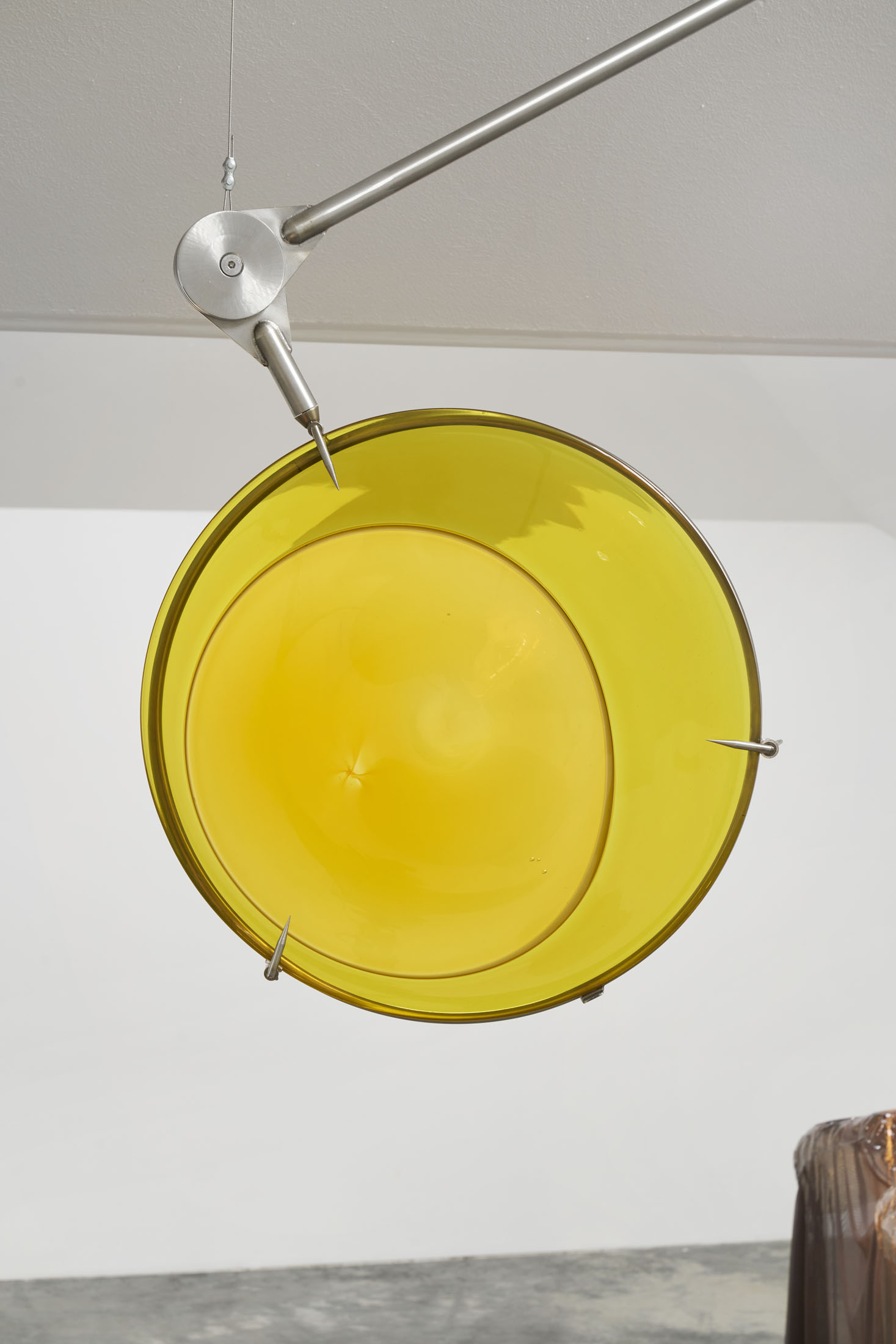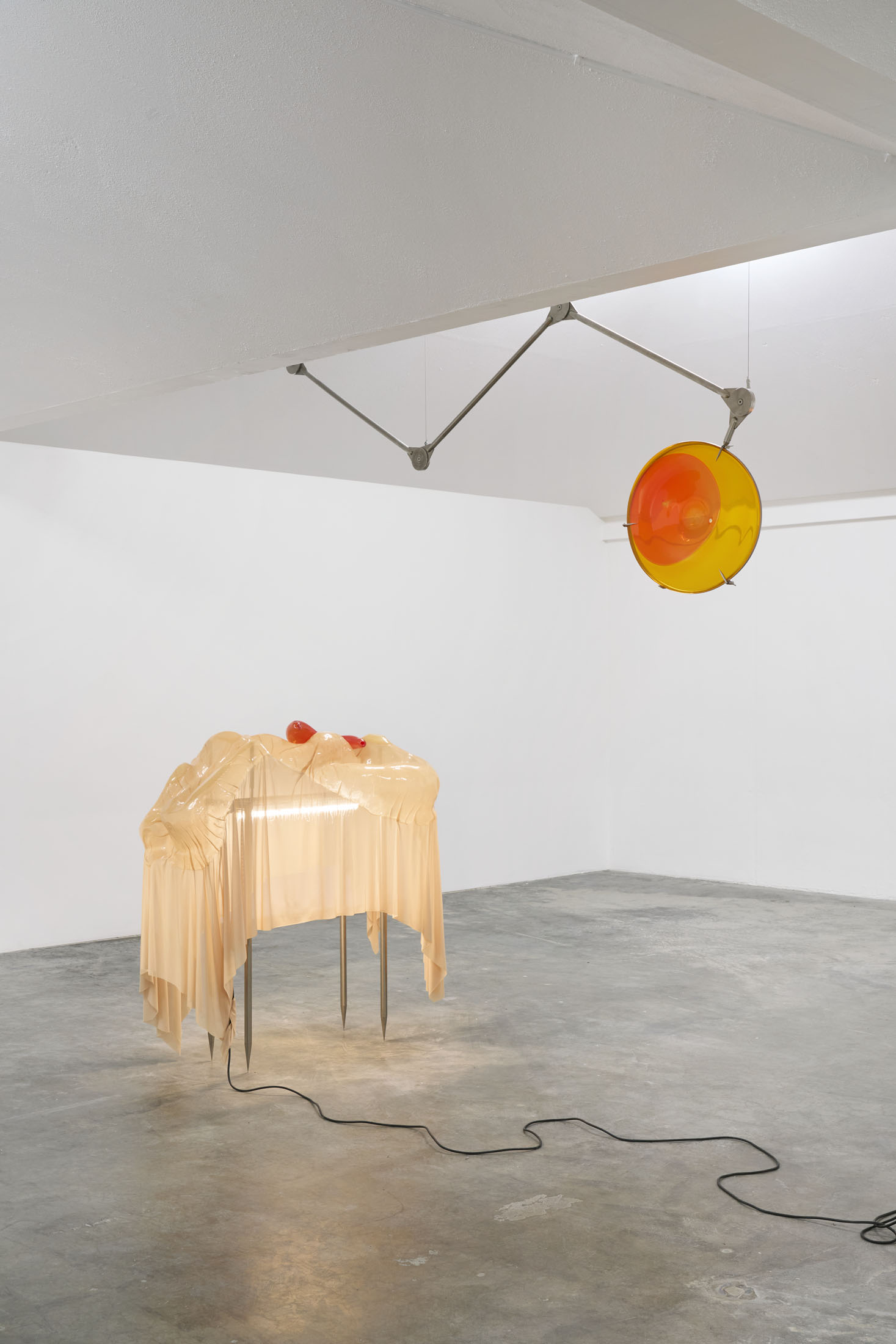 Amitai Romm and Bjarke Hvass Kure explore imaginaries of future landscapes. Their vacuum installation preserves Danish plant specimens from a wild fallow field alongside sorghum – a non-native yet resilient cereal that thrives in heat, drought, and intense light. The plants have been part of an artistic experiment in a climate simulation facility that controls temperature, CO₂, humidity, and light. Here they were exposed to scenarios ranging from the onset of a new ice age to prolonged heatwaves. In this way, the plants become witnesses to a speculative and accelerated play with the climatic parameters of reality. Now enclosed without air, they are preserved as images, stopped in time. In the rear of the exhibition, ceiling sculptures by Romm continue the theme, using lamps from a climate simulator in a series of parabolic forms designed to transmit and receive information.