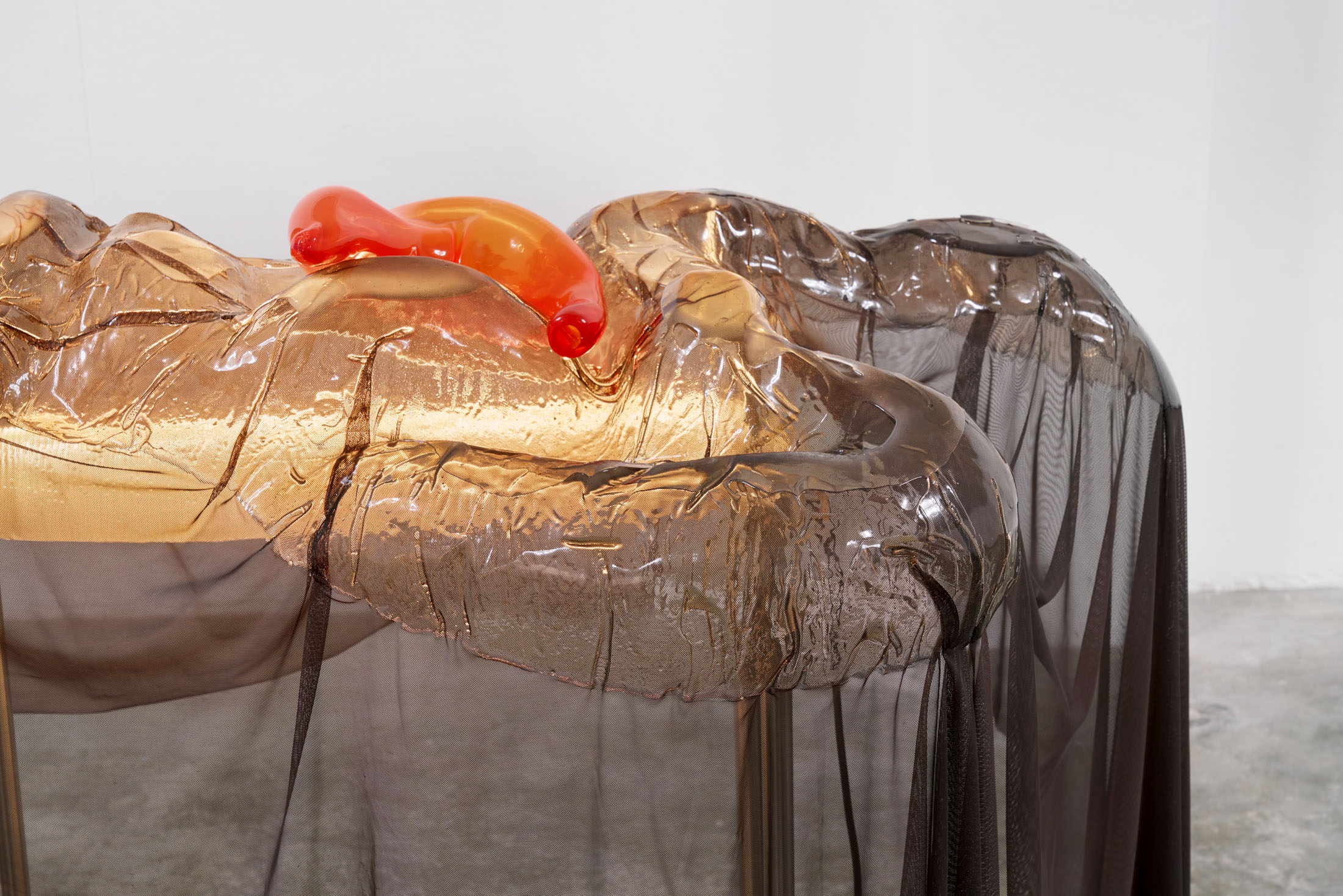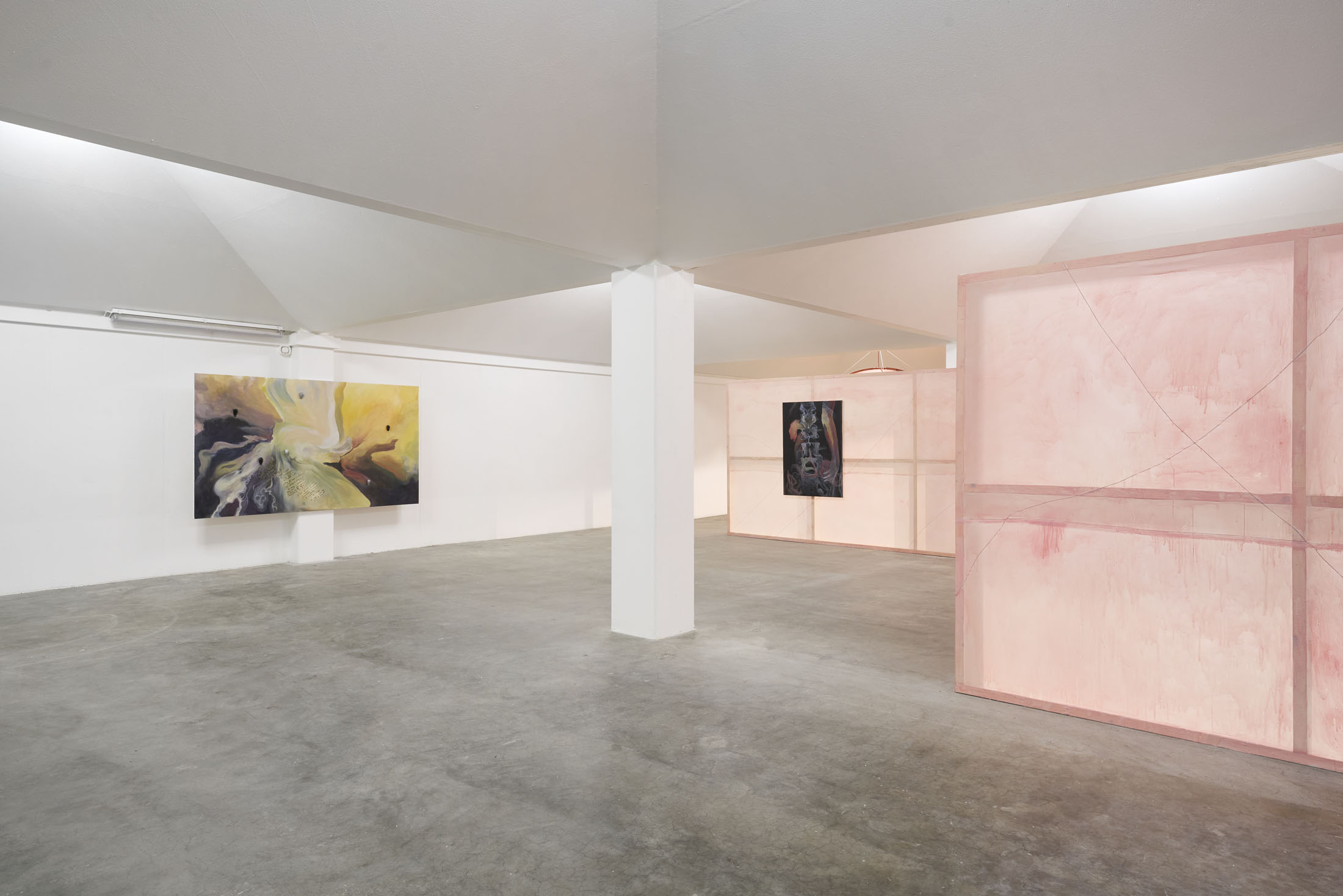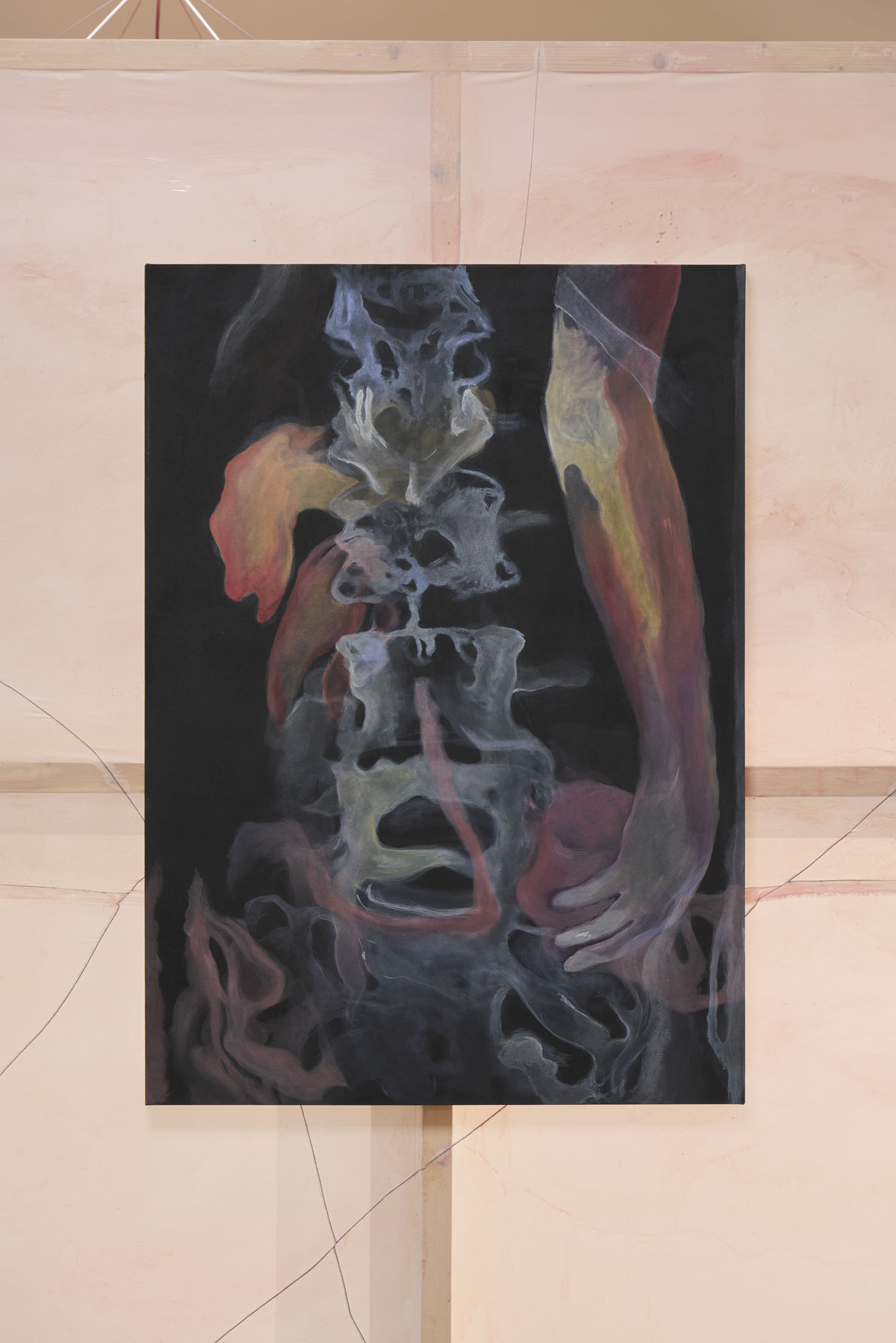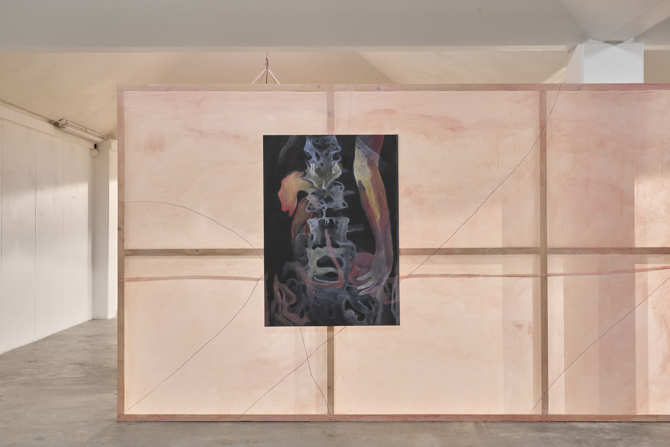 Leda Bourgogne also foregrounds the body – positioned between sensory perception, resistance, and psychoanalytic depth. Her installation and paintings draw attention to the prefrontal cortex – the brain region that converts sensory input into decision-making. Latex-coated canvases stretch through the exhibition space like membranes: reactive, elastic, exposed. Latex – a material that snaps back into shape after deformation – becomes a metaphor for resilience, a recurring motif in Bourgogne’s inquiry into the overstimulated subject, sensitivity and empowerment.