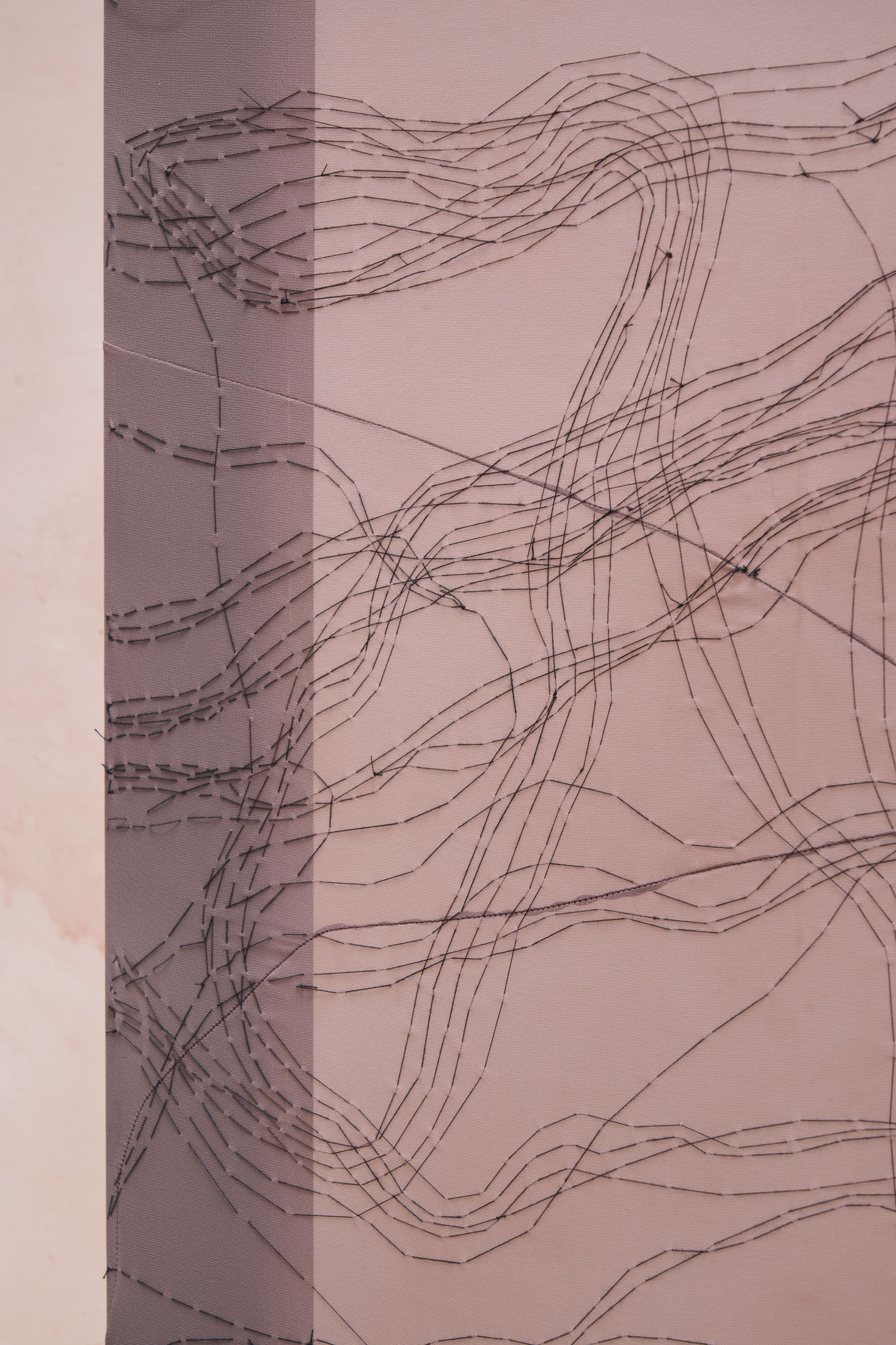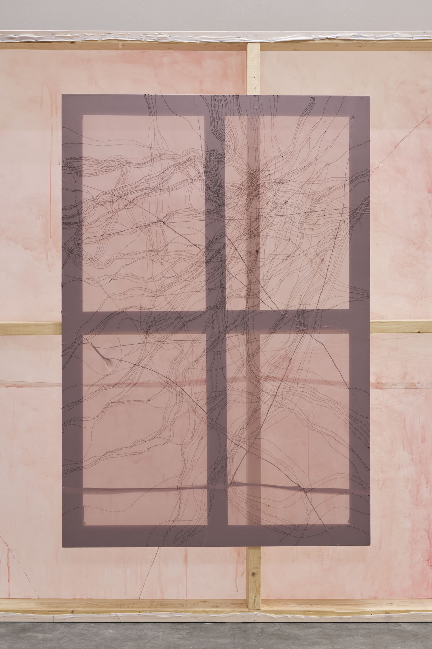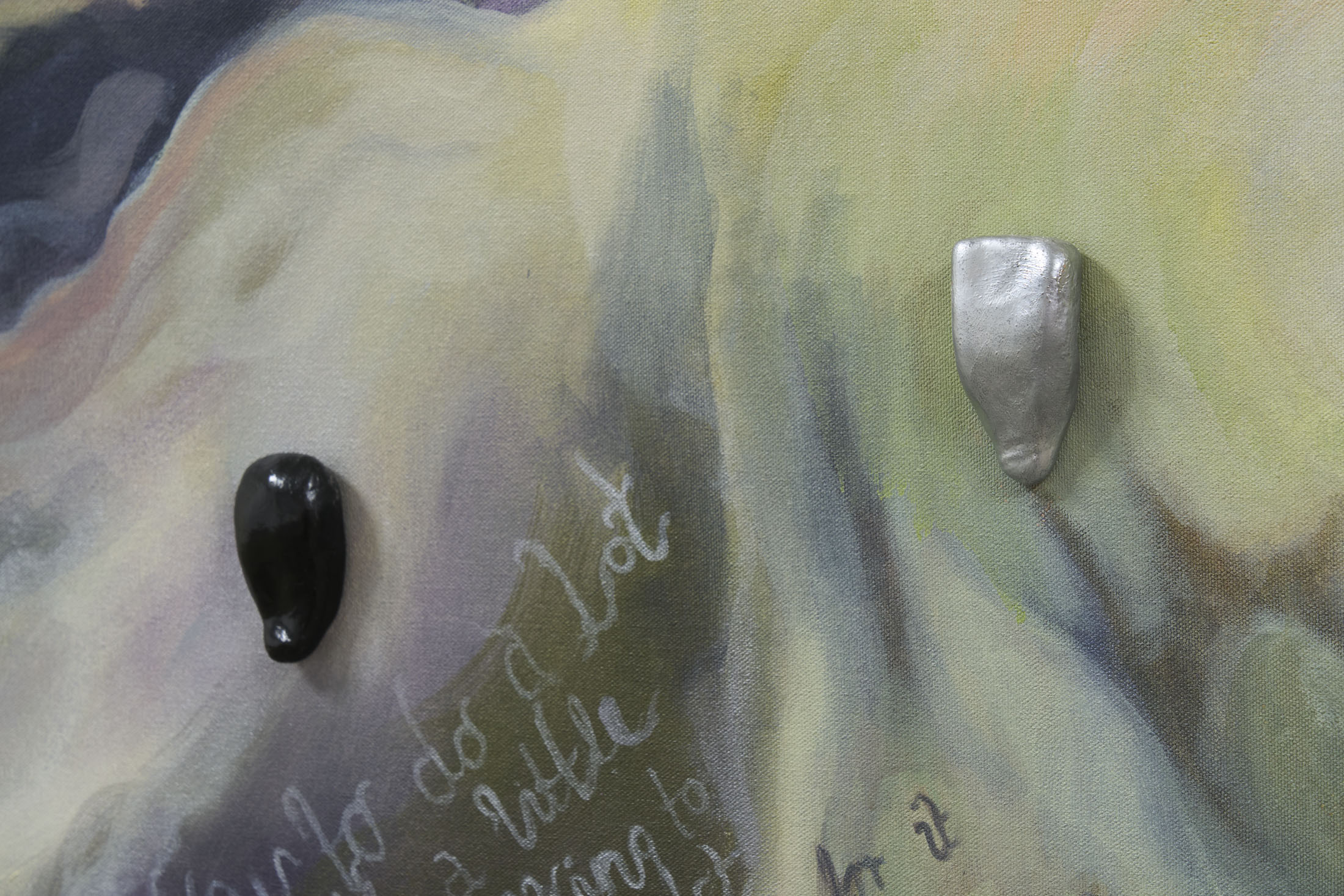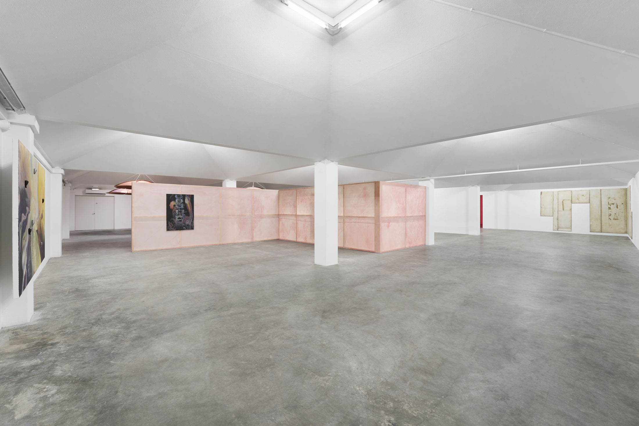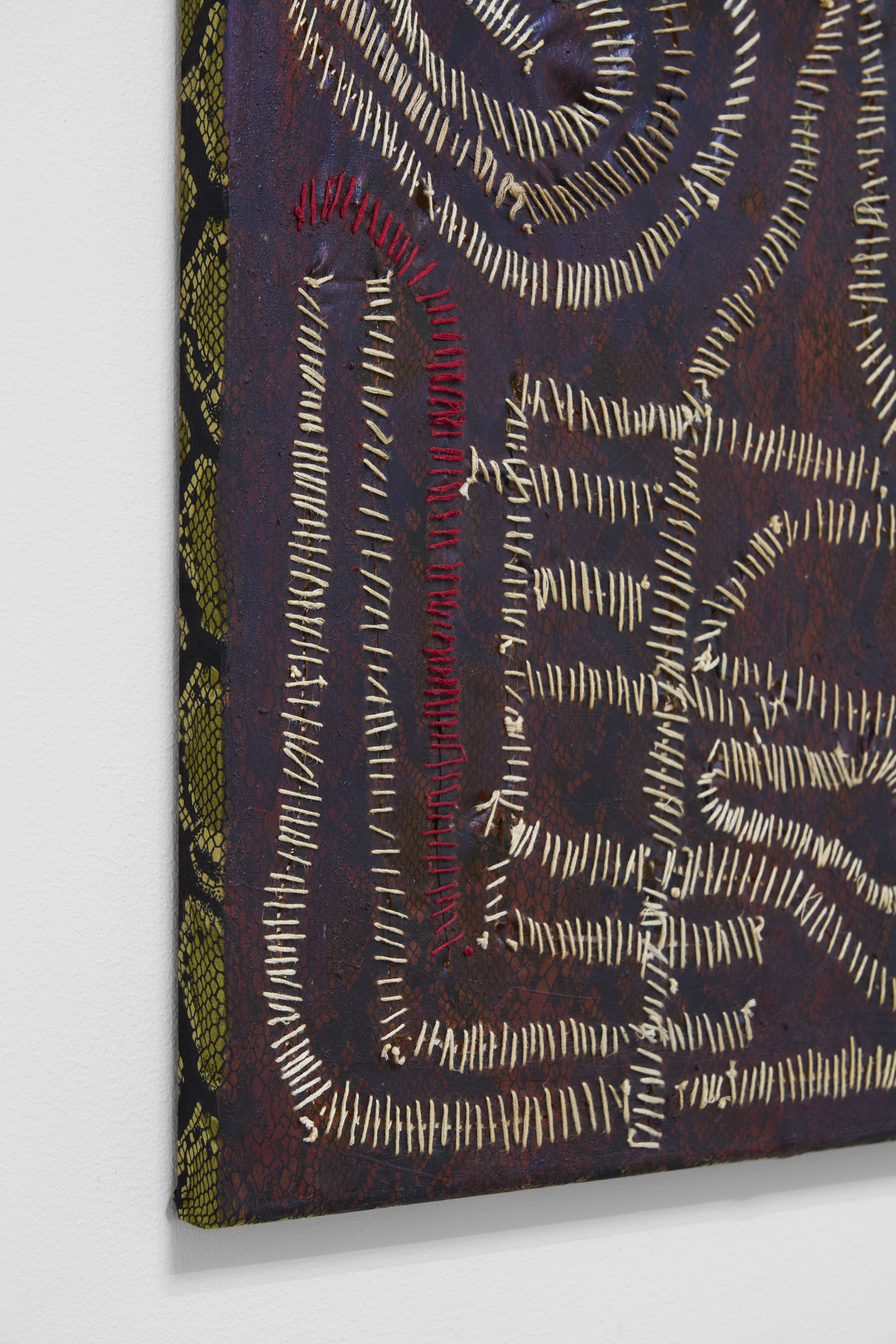 Leda Bourgogne also foregrounds the body – positioned between sensory perception, resistance, and psychoanalytic depth. Her installation and paintings draw attention to the prefrontal cortex – the brain region that converts sensory input into decision-making. Latex-coated canvases stretch through the exhibition space like membranes: reactive, elastic, exposed. Latex – a material that snaps back into shape after deformation – becomes a metaphor for resilience, a recurring motif in Bourgogne’s inquiry into the overstimulated subject, sensitivity and empowerment.