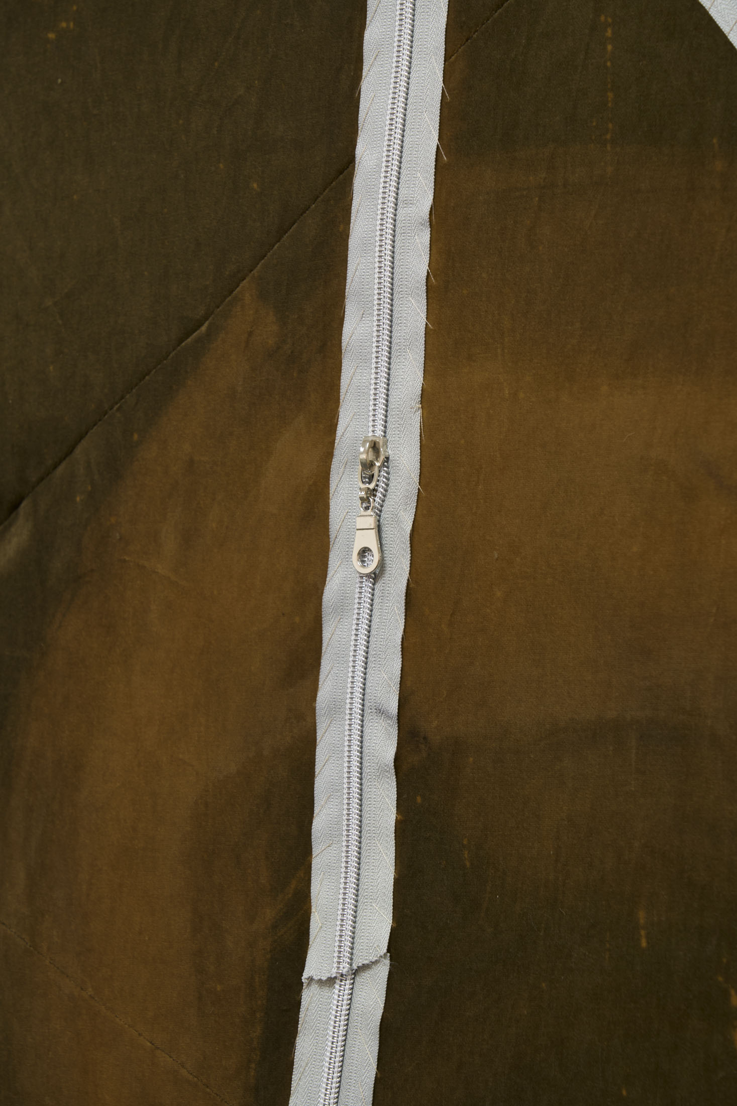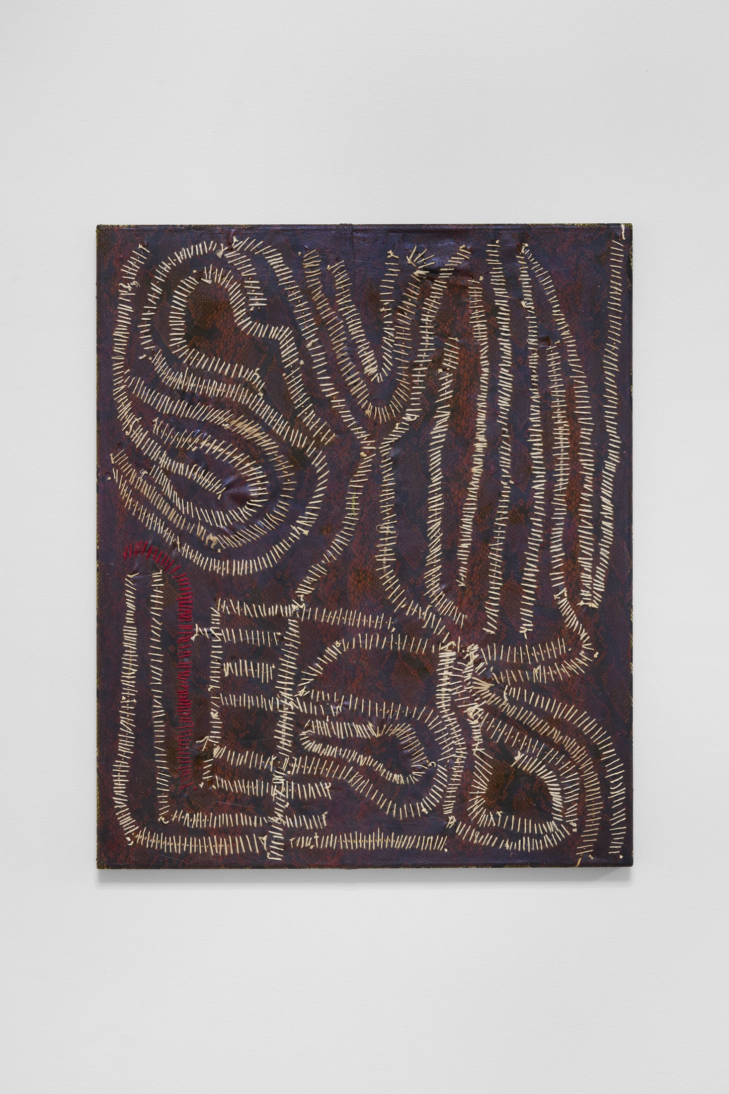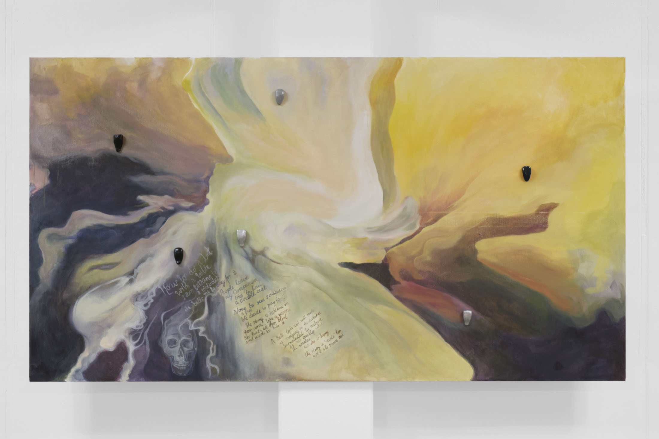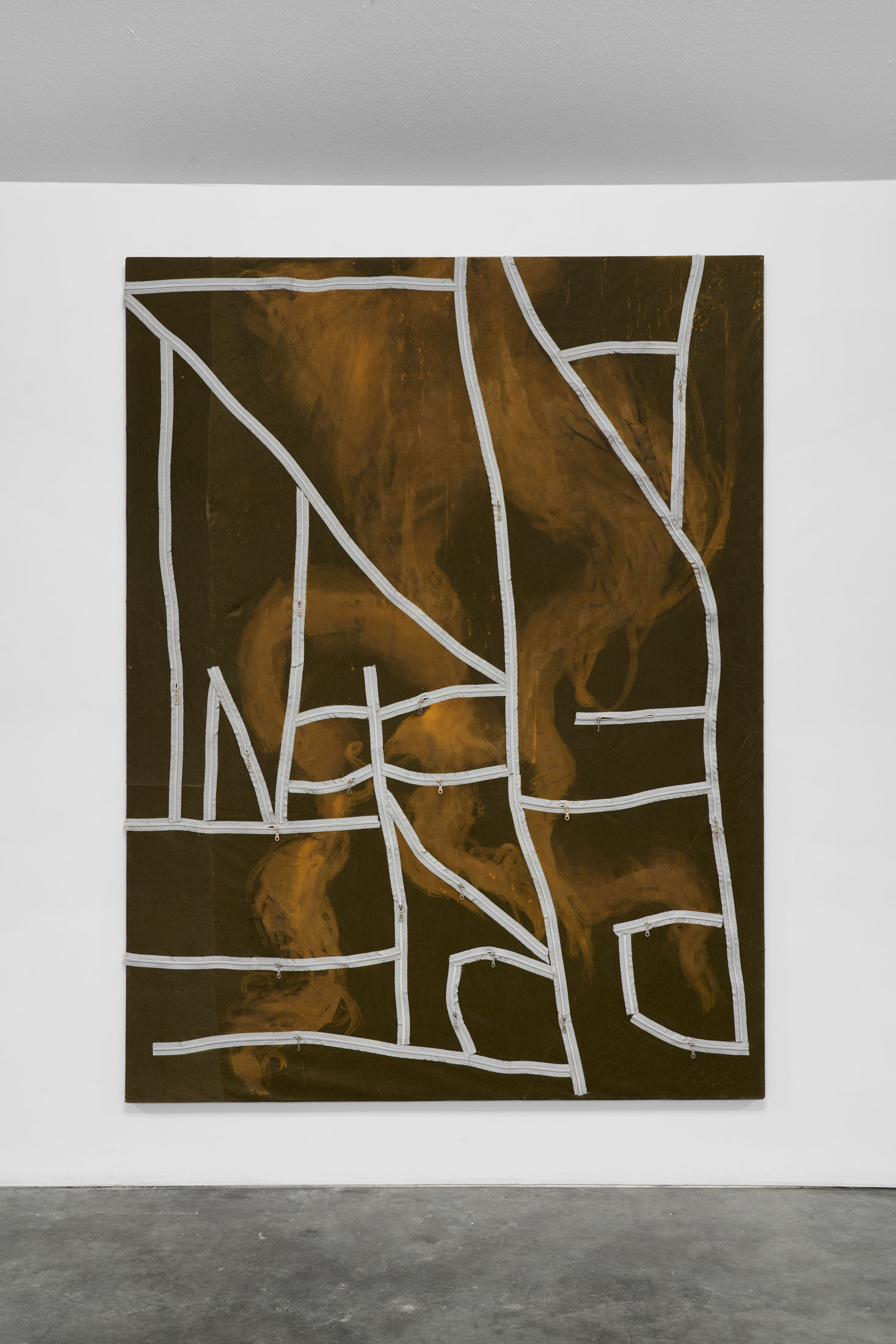 Leda Bourgogne also foregrounds the body – positioned between sensory perception, resistance, and psychoanalytic depth. Her installation and paintings draw attention to the prefrontal cortex – the brain region that converts sensory input into decision-making. Latex-coated canvases stretch through the exhibition space like membranes: reactive, elastic, exposed. Latex – a material that snaps back into shape after deformation – becomes a metaphor for resilience, a recurring motif in Bourgogne’s inquiry into the overstimulated subject, sensitivity and empowerment.