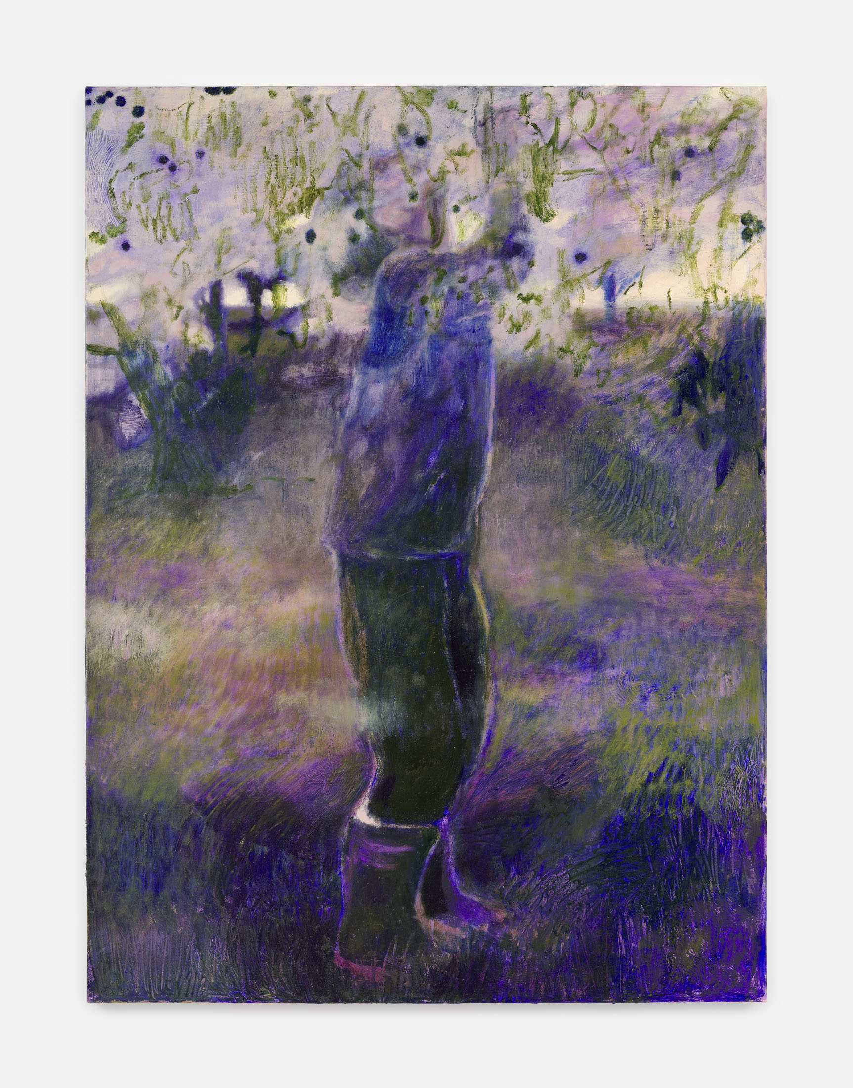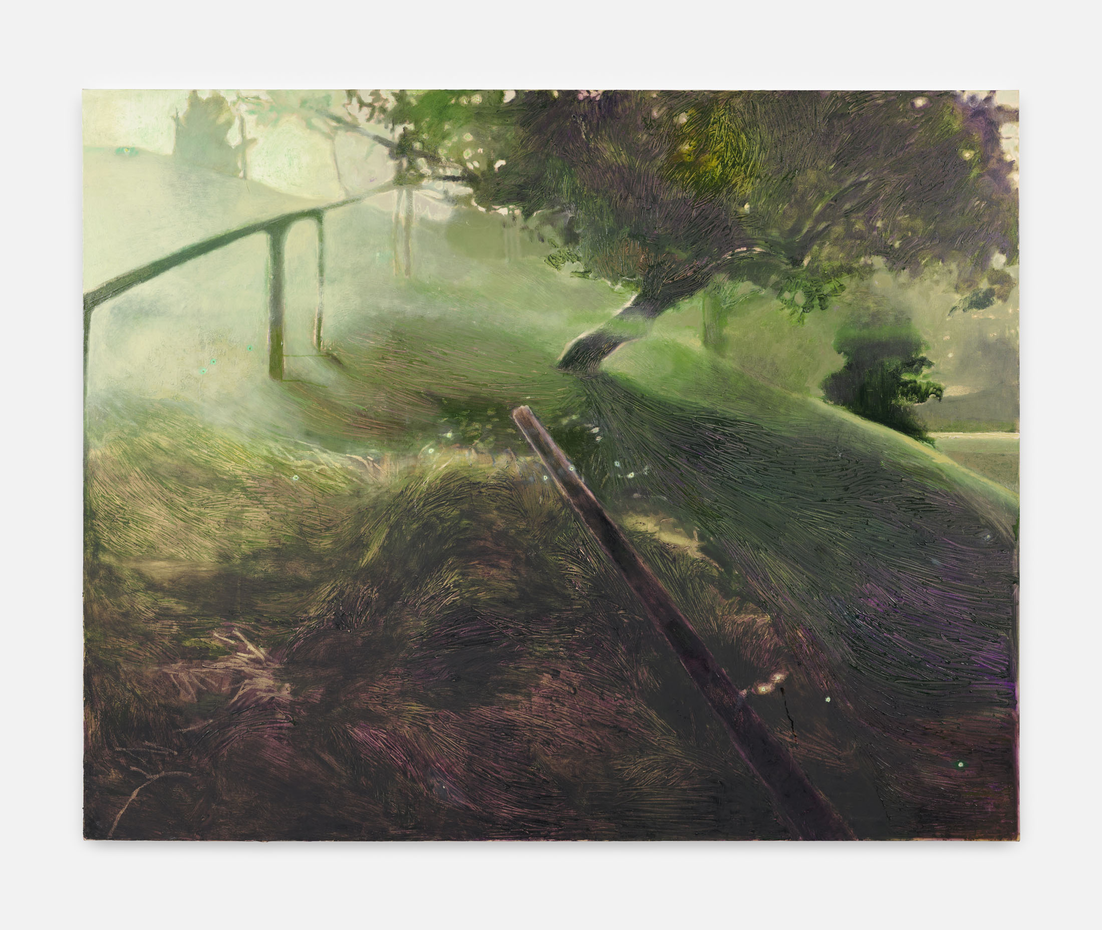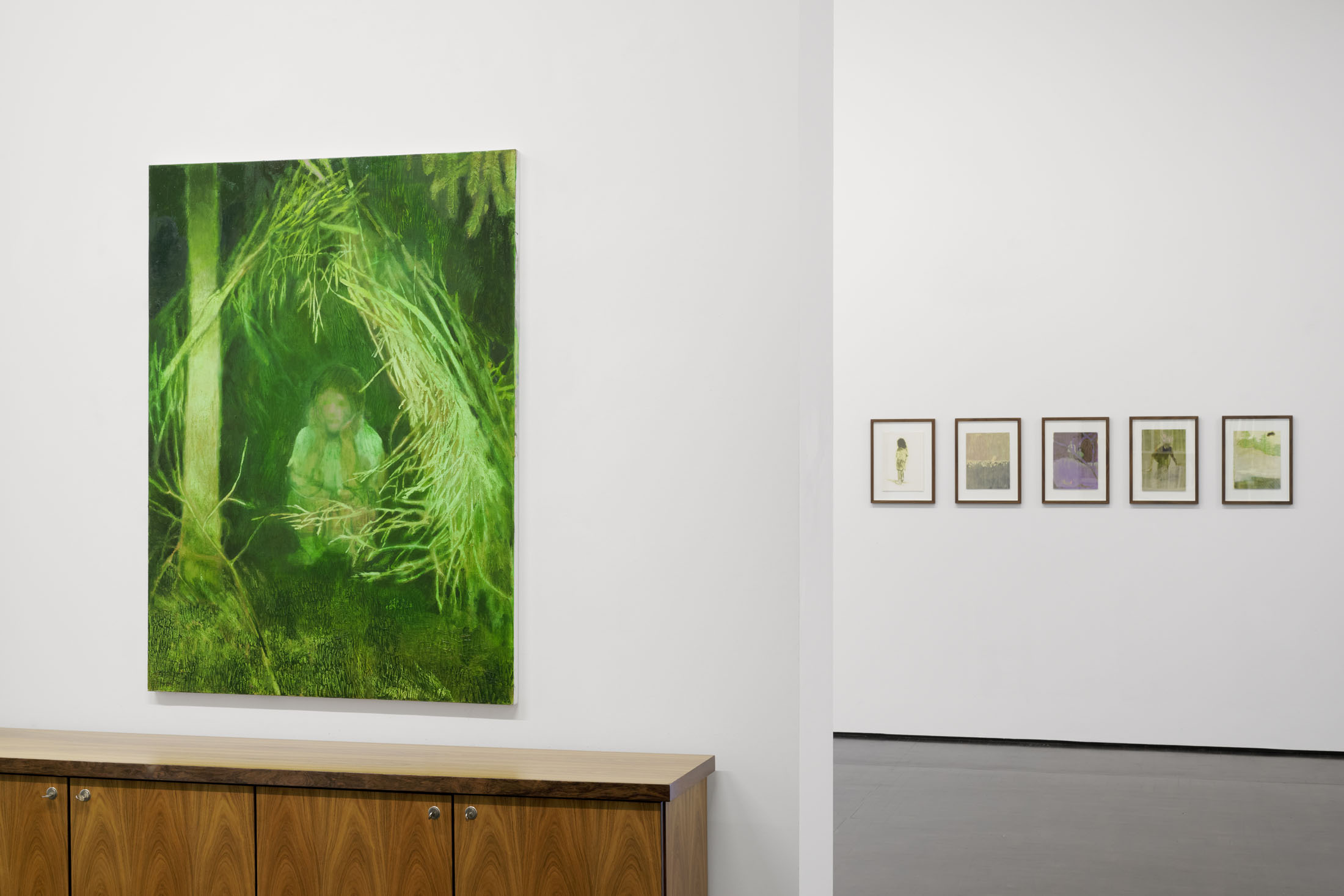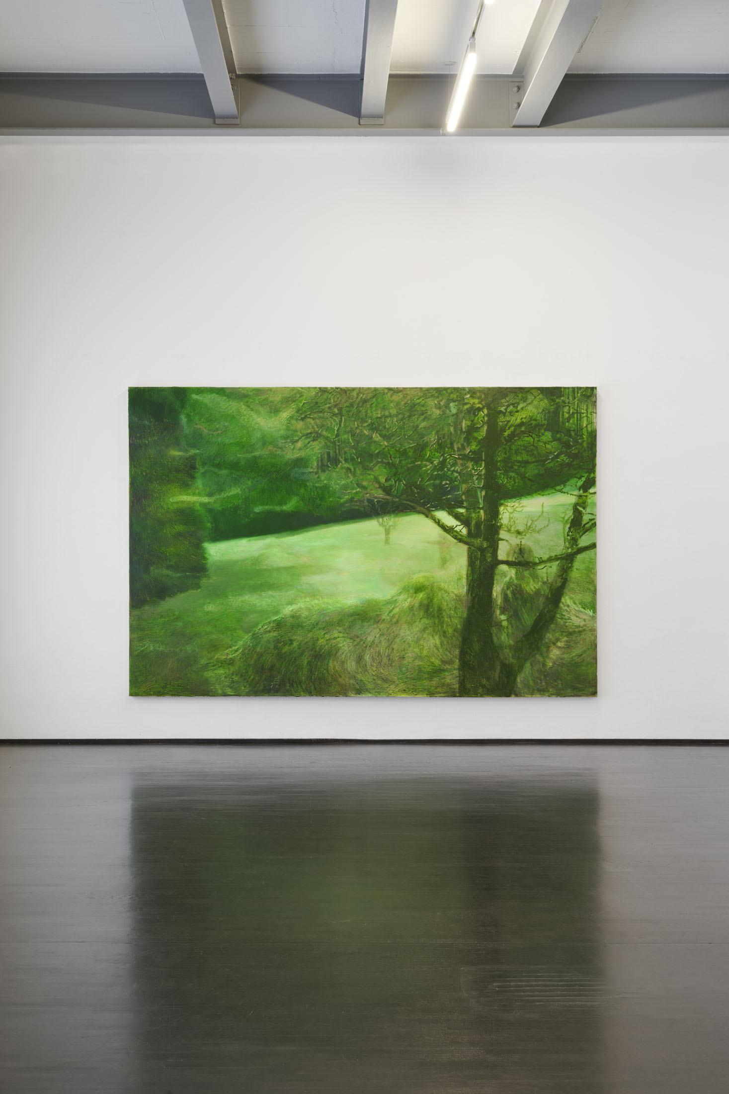 A girl, painted in silhouette, peers out over a haystack at a clearing in the forest. Depicted from behind and partially obscured by the branches of a tree, her exact appearance remains hidden. On the sunlit meadow, another child, only vaguely hinted at, takes a running start to jump. It blends in with its grass-colored surroundings. A dense forest borders the brightly lit plain, isolating it from the outside world. Following the girl’s gaze, we, the viewers, are drawn into the landscape’s unreal atmosphere.