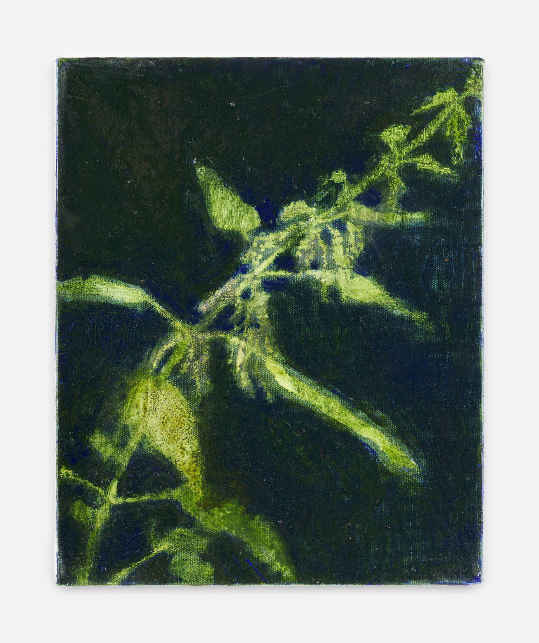 The format of each canvas is of particular importance to the painter. When interpreted as a frame, it defines the boundaries of what is depicted. Rather than adapting the image to the format, figures and other elements are cropped to fit the edges of the canvas. The remaining section of the image captures what Knapová considers essential. Sometimes this is an entire scene, as in Letters from Home (2025); at other times, it is a zoomed-in detail, as in Nettle V (2025). In this way, she draws a formal parallel with amateur photographs from family albums and their special authenticity. Knapová’s depictions of children, in particular, have something unposed and intimate about them. Feeling unobserved, in On the Surface (2025), a girl swims in a lake; in Hiding Place (2025), a toddler hides in a self-built hut made of branches in the forest; and in Black Cherries (2025), a boy tastes cherries from a tree. The children’s eyes often appear striking: as in Wind/Pain (2025), they are either unrecognizable or, as in Jester (2025), they look through us, the viewers, with great emptiness. In contrast, we can observe the children as if through a peephole.
