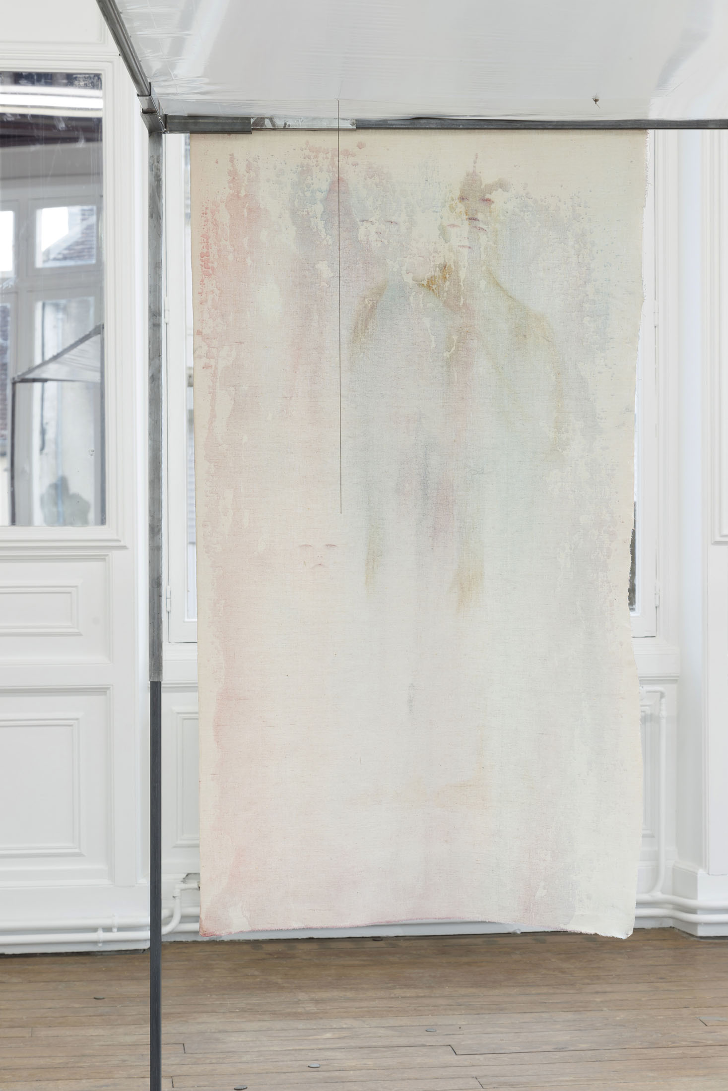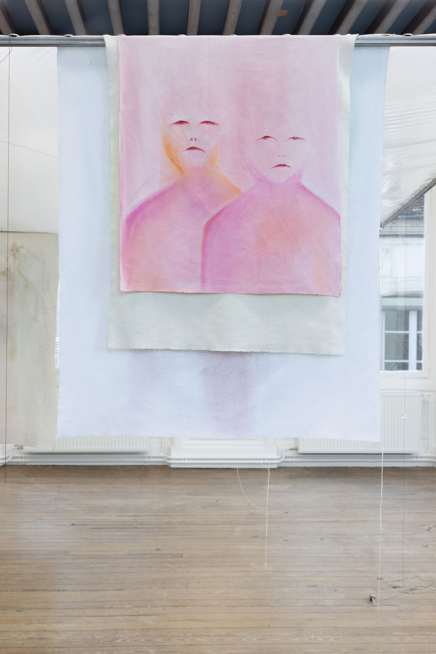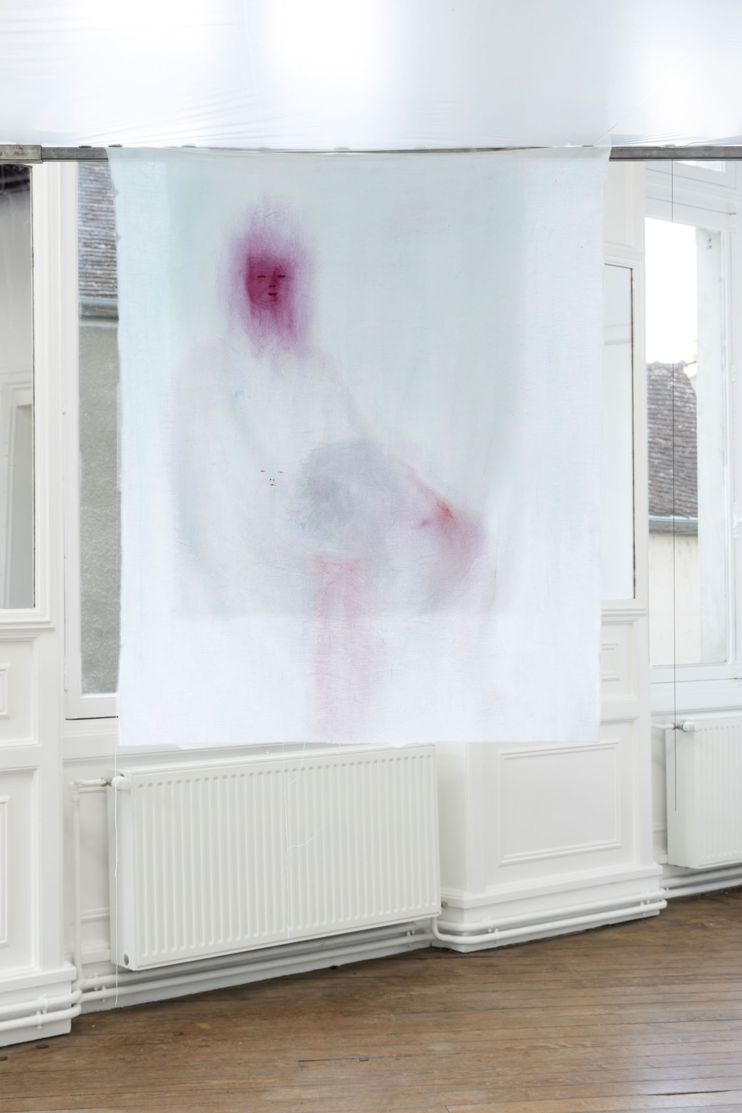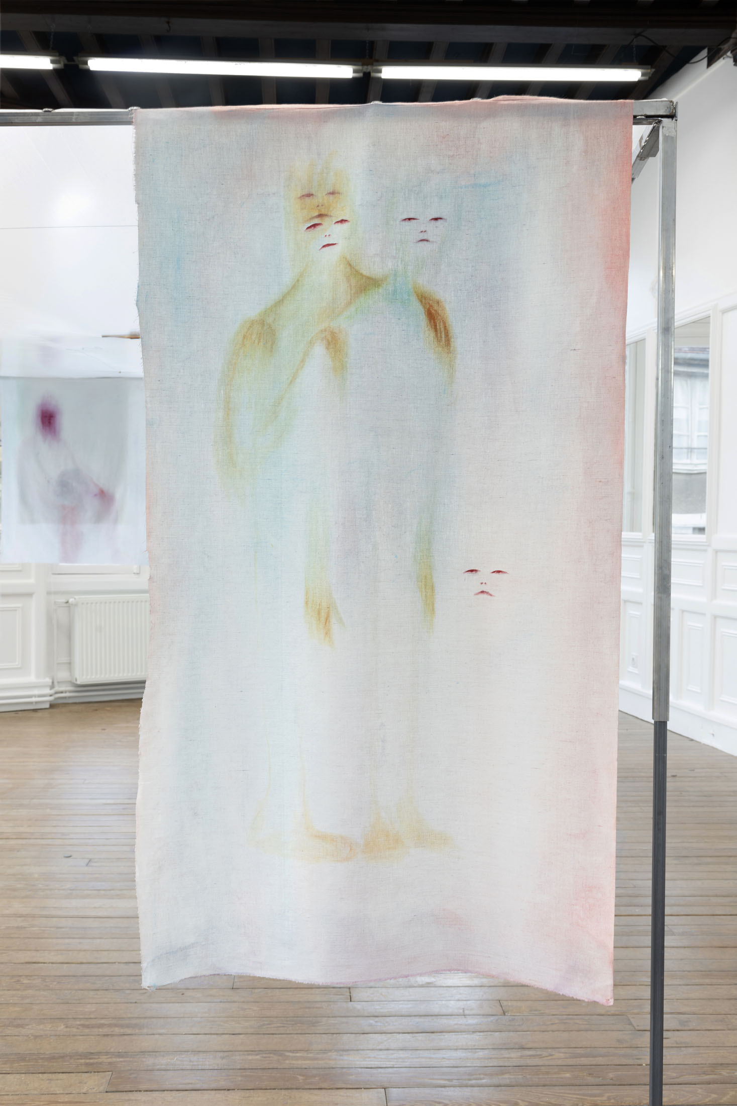 One must also mention the artist’s obsessive relationship with the painted subject, which recurs repeatedly throughout her work. The faces represented by Eva Ayache-Vanderhorst appear on the canvas and imprint themselves on pre-found textile fibers: bedsheets still bearing the traces of others, inhabited by irregularities that endow them with a kind of historicity. The artist conjures up genderless, identity-less faces and bodies—bodies whose traces cannot be positioned on any map nor in any sky, simply because they do not belong to anything locatable, except perhaps to the frontier itself, a third, liminal space: floating, unanchored, between what appears and what vanishes. Though these vaporous bodies inscribe themselves within a genealogy of forms developed by Eva Ayache-Vanderhorst, they seem extracted from History, as if removed from reality and from all forms of temporality, as if born “in the placeless place of their dreams.”1