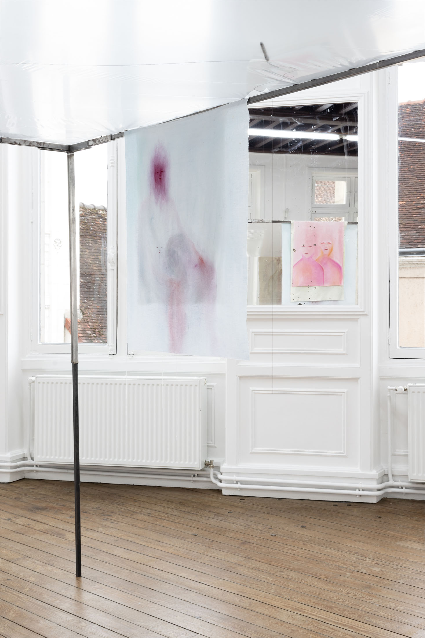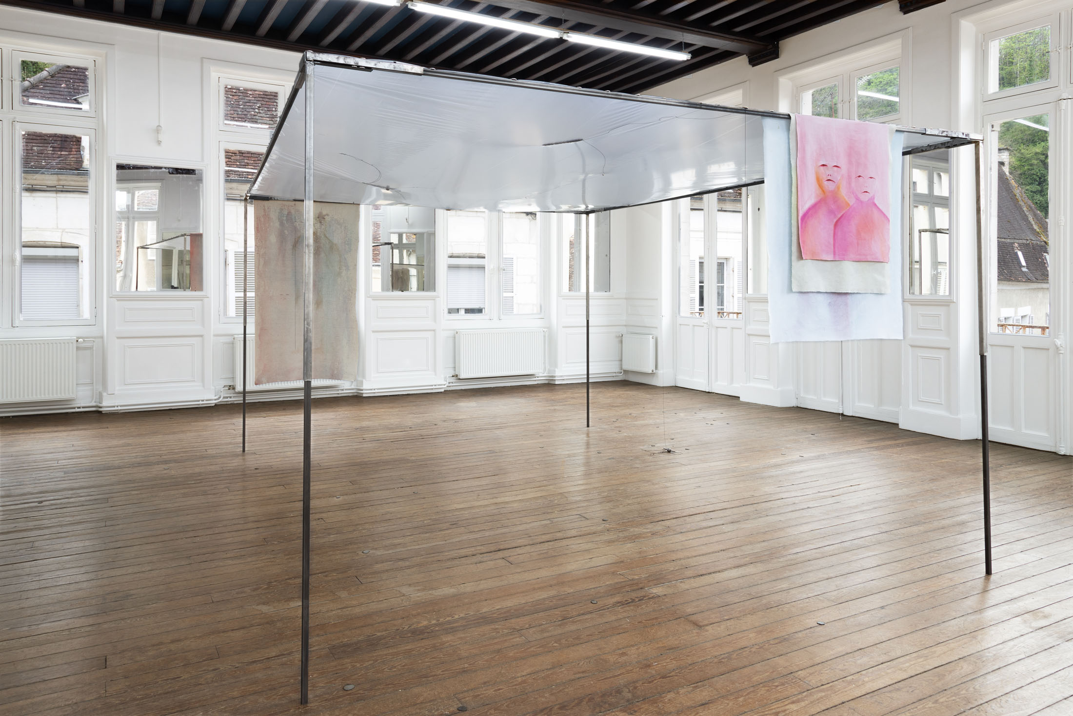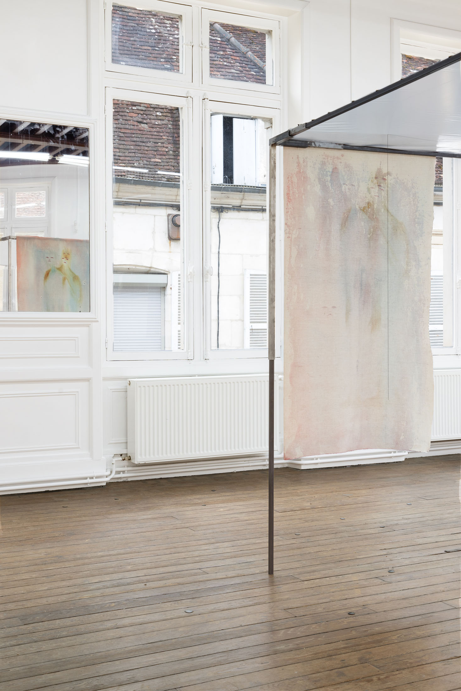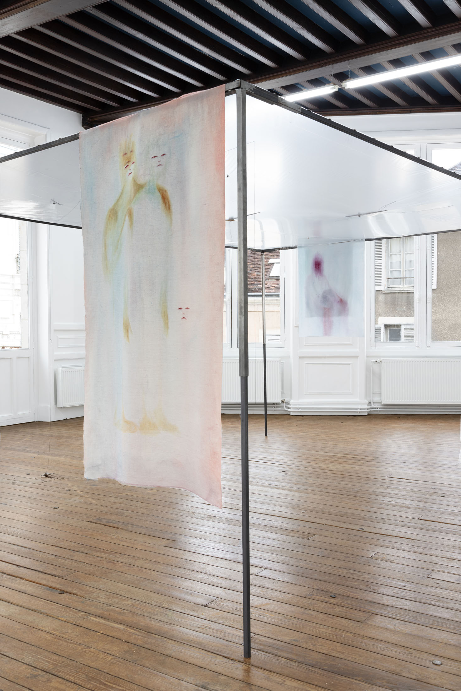 One must also mention the artist’s obsessive relationship with the painted subject, which recurs repeatedly throughout her work. The faces represented by Eva Ayache-Vanderhorst appear on the canvas and imprint themselves on pre-found textile fibers: bedsheets still bearing the traces of others, inhabited by irregularities that endow them with a kind of historicity. The artist conjures up genderless, identity-less faces and bodies—bodies whose traces cannot be positioned on any map nor in any sky, simply because they do not belong to anything locatable, except perhaps to the frontier itself, a third, liminal space: floating, unanchored, between what appears and what vanishes. Though these vaporous bodies inscribe themselves within a genealogy of forms developed by Eva Ayache-Vanderhorst, they seem extracted from History, as if removed from reality and from all forms of temporality, as if born “in the placeless place of their dreams.”1