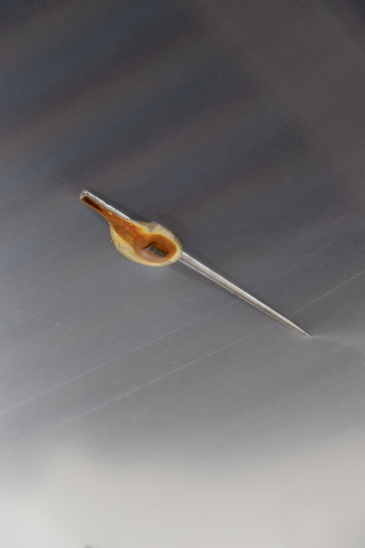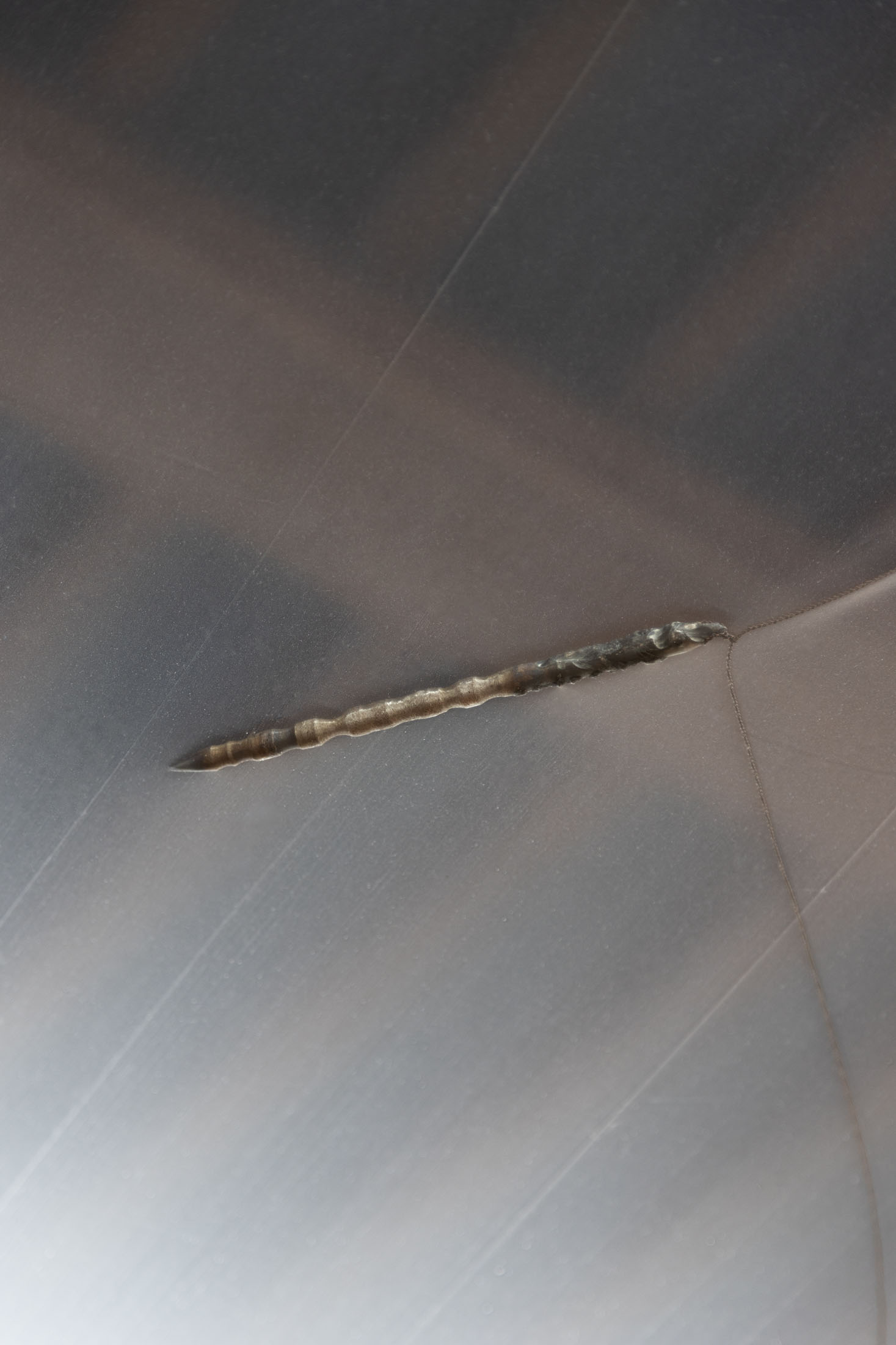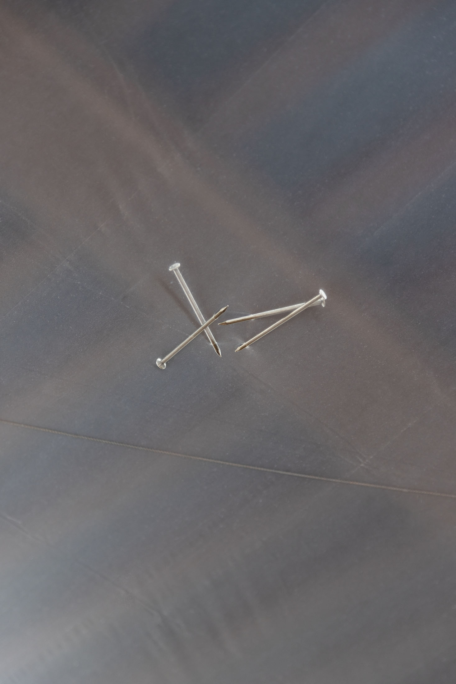 We could begin by saying that Eva Ayache-Vanderhorst’s proposal is an installation where metal and painting merge and absorb one another in a miscible blend, where the artist’s gesture allows the two techniques to interpenetrate and reciprocally intertwine. Constellations 2 imposes a spectral presence: the floating bodies of the paintings double and fragment within the large mirrors of the Café des Glaces, evoking a kind of panoptic and omniscient power. The central metallic sculpture, a penetrable zone positioned at the threshold between outside and inside, asserts itself as an ambiguous territory where everything remains to be thought through under the looming threat of hanging pendulums—though disarmed—within a relation to time held in suspension by the muffled force of gravity. Thus, the exhibition space asserts itself as a circulatory territory where the viewer is invited to observe frontally, but also to discover through the reverse and through reflection these presences with incised eyes, merging with the metal structure.