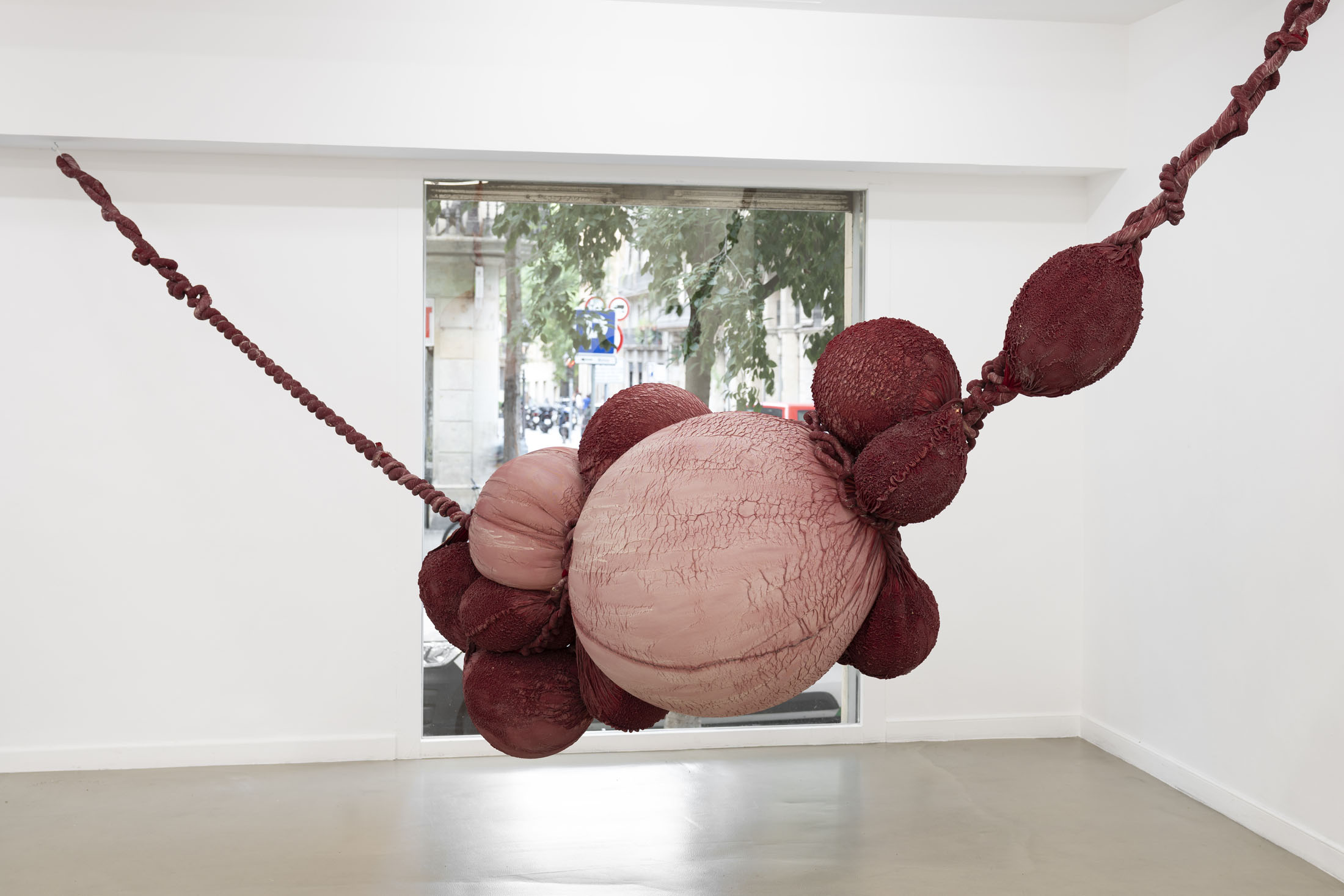 The idea of tension is intensified by the texture of the sculptures: the skin of the works appears cracked, almost eroded, resembling a dense network of blood vessels, forming a surface akin to visceral tissue. For a moment, we wonder if they belong to the space they are in with us — or if they escaped a body and landed in the space after numerous adventures. Looking at them, we know we do not belong to the same realm. They belong “inside,” while the gallery space — and we — are in a dimension we can call “outside,” or public. If you look at them carefully, you can sense that they are forming groups — and that they seem to be protecting each other. At times, the pieces resemble spheroids or organoids, clusters of neural cells mimicking brain tissue. At times, they look like germinal centers, like the lymph nodes containing spherical clusters of immune cells. At times, they look like kidneys. They are connected by rope-like, bulging veins similar to the ones we sometimes see winding beneath the surface of the skin — coarse, tense, and serpentine.