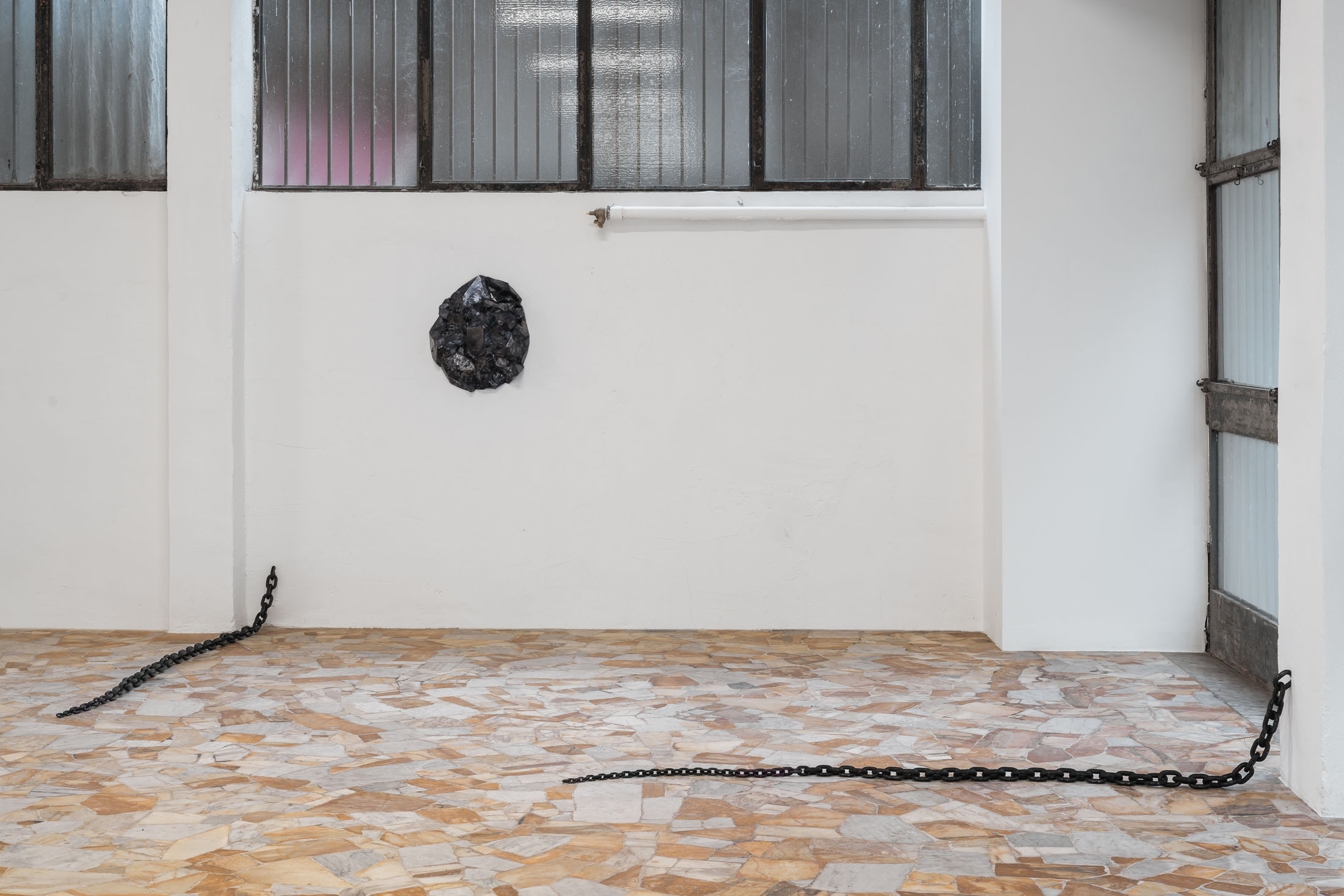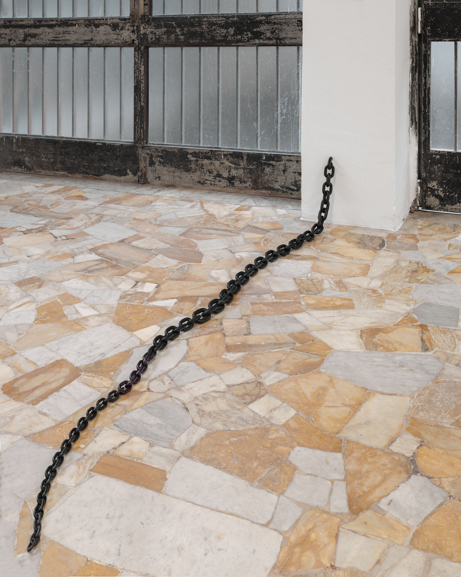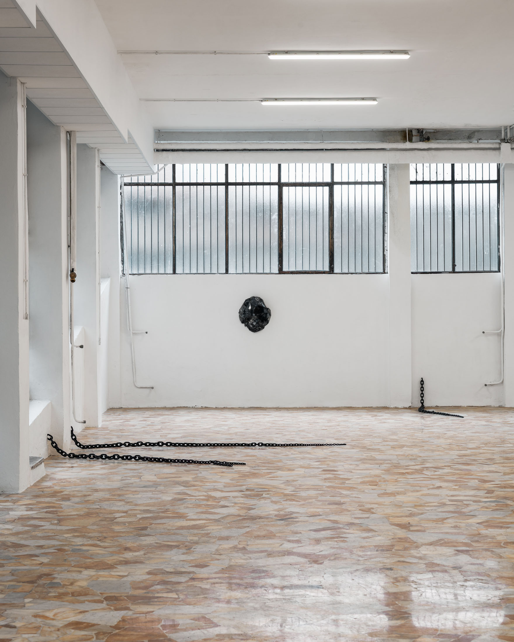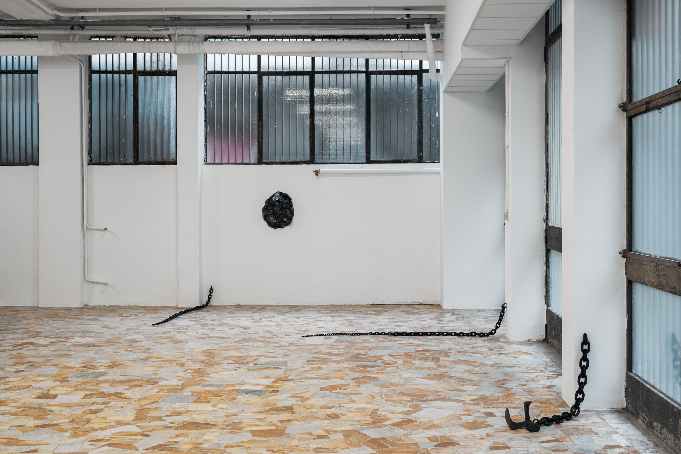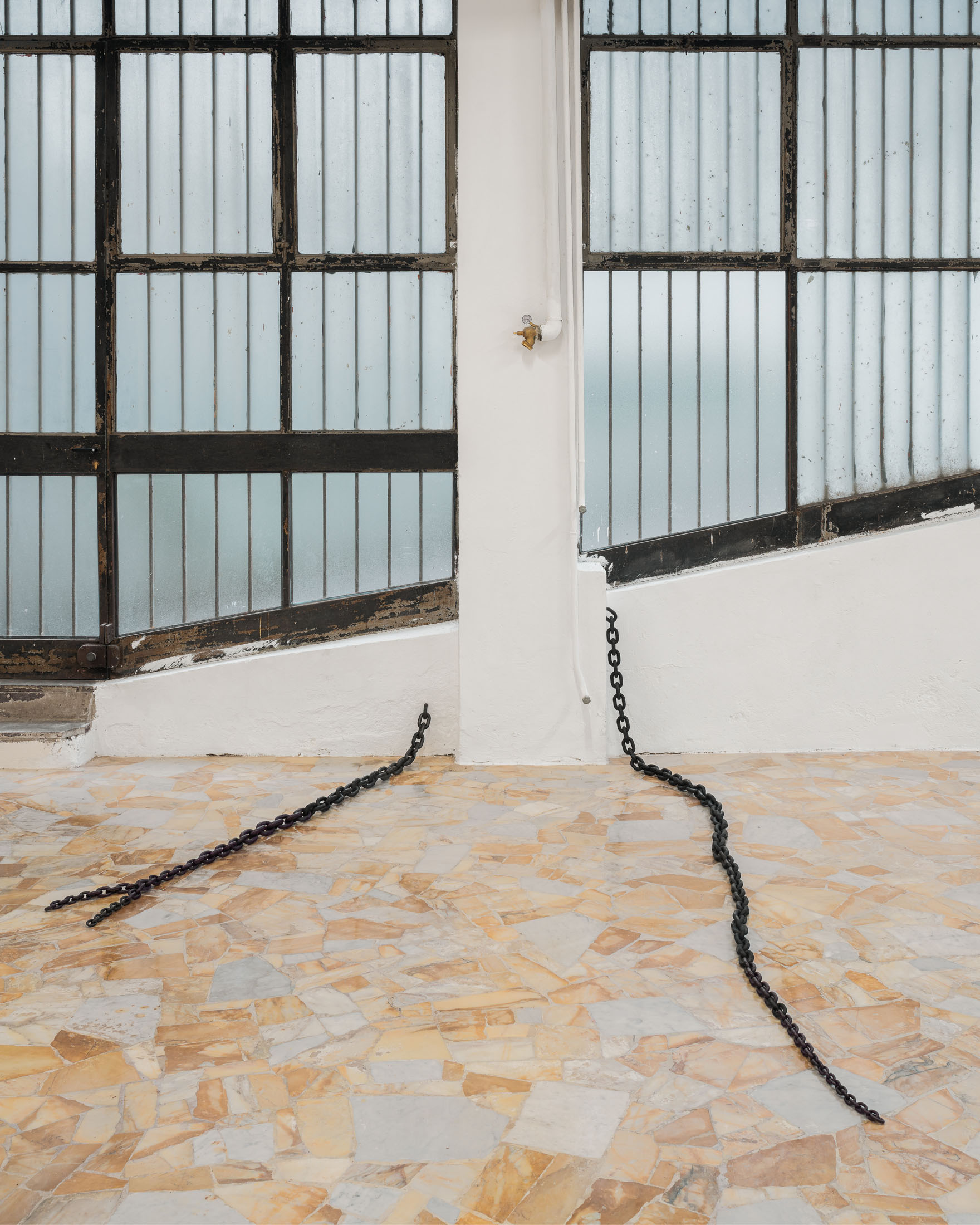 Running through the exhibition as a spatial extension of this photographic work is Untitled (2011), a set of seven metal chains that emerge from the gallery walls and rest on the floor like long tails. The decision to include this body of work was inspired by the architecture of the space itself: pipes, cables, and bars that cut across the windows and assert themselves as structural facts. The chains, Löfdahl notes in our correspondence, can “stand such strong elements.” They read as part of the building’s vocabulary: a latent mechanism of connection, a two-way channel between the gallery interior and what lies outside. Here, the chain becomes both an object and an infrastructure. Installed in relation to the photographs, it extends the exhibition’s logic of seriality into physical space. That meaning is further unsettled by the way the chains taper into thinner, almost tentacle-like ends, as if the jellyfish’s oral arms had sprouted through the walls.