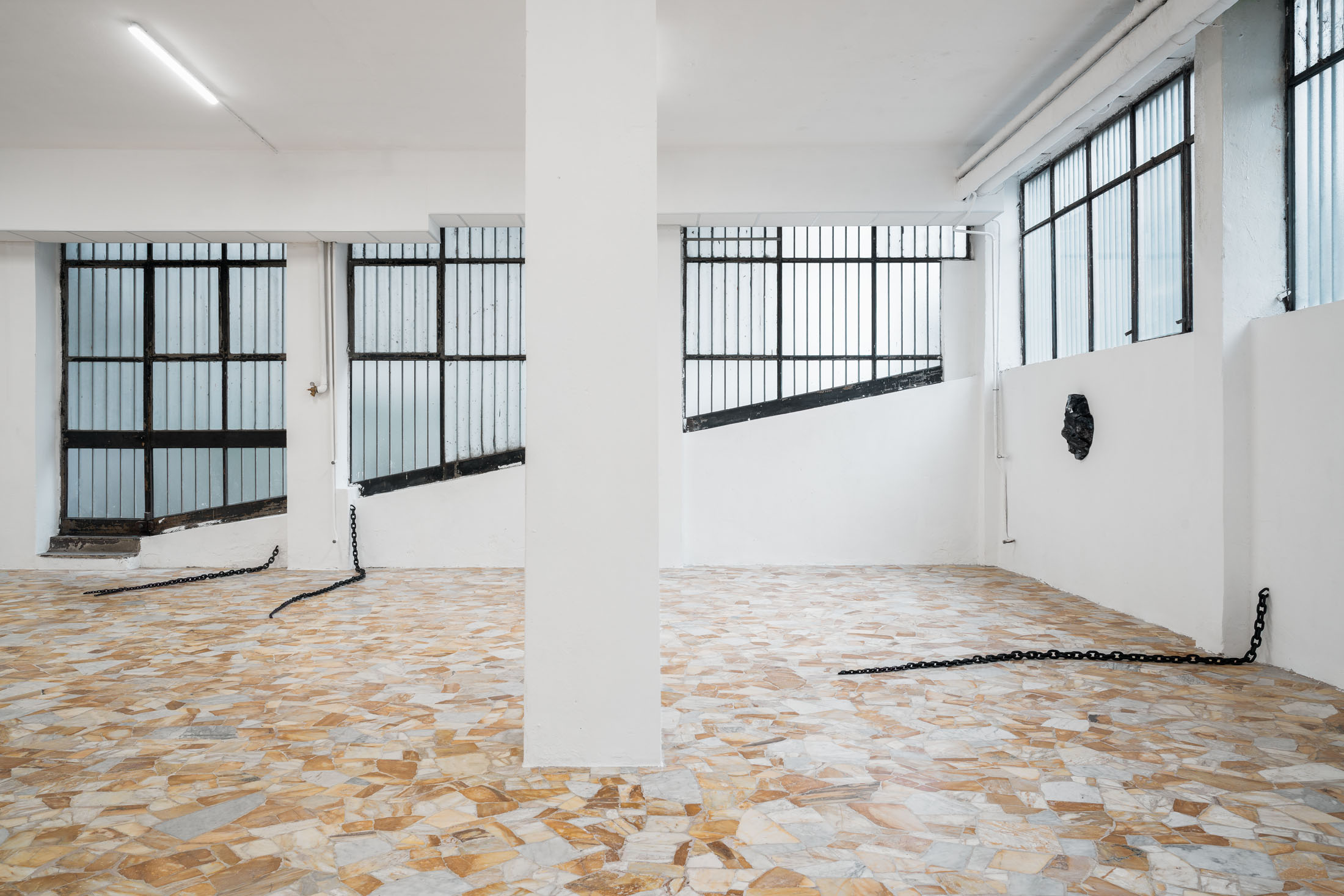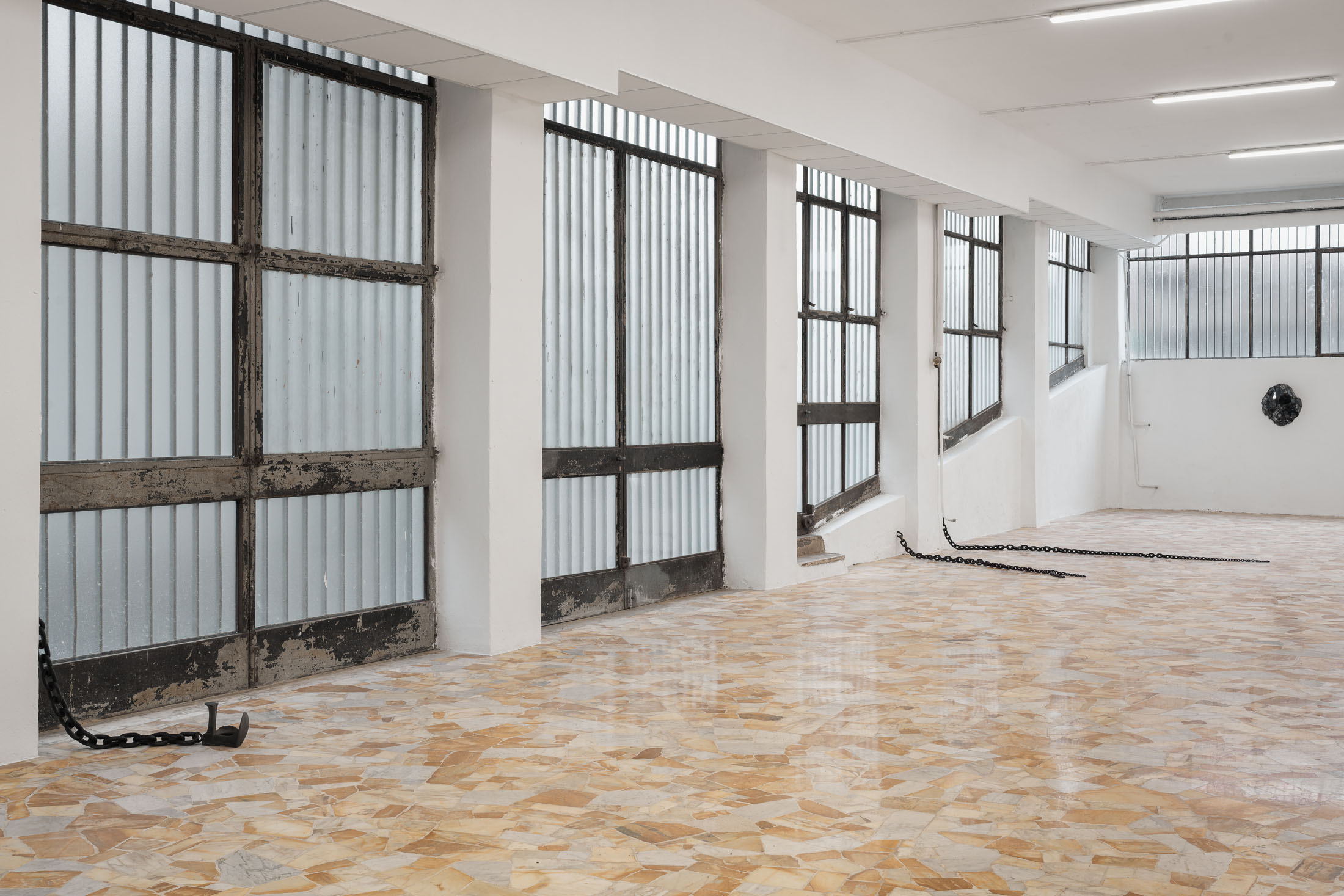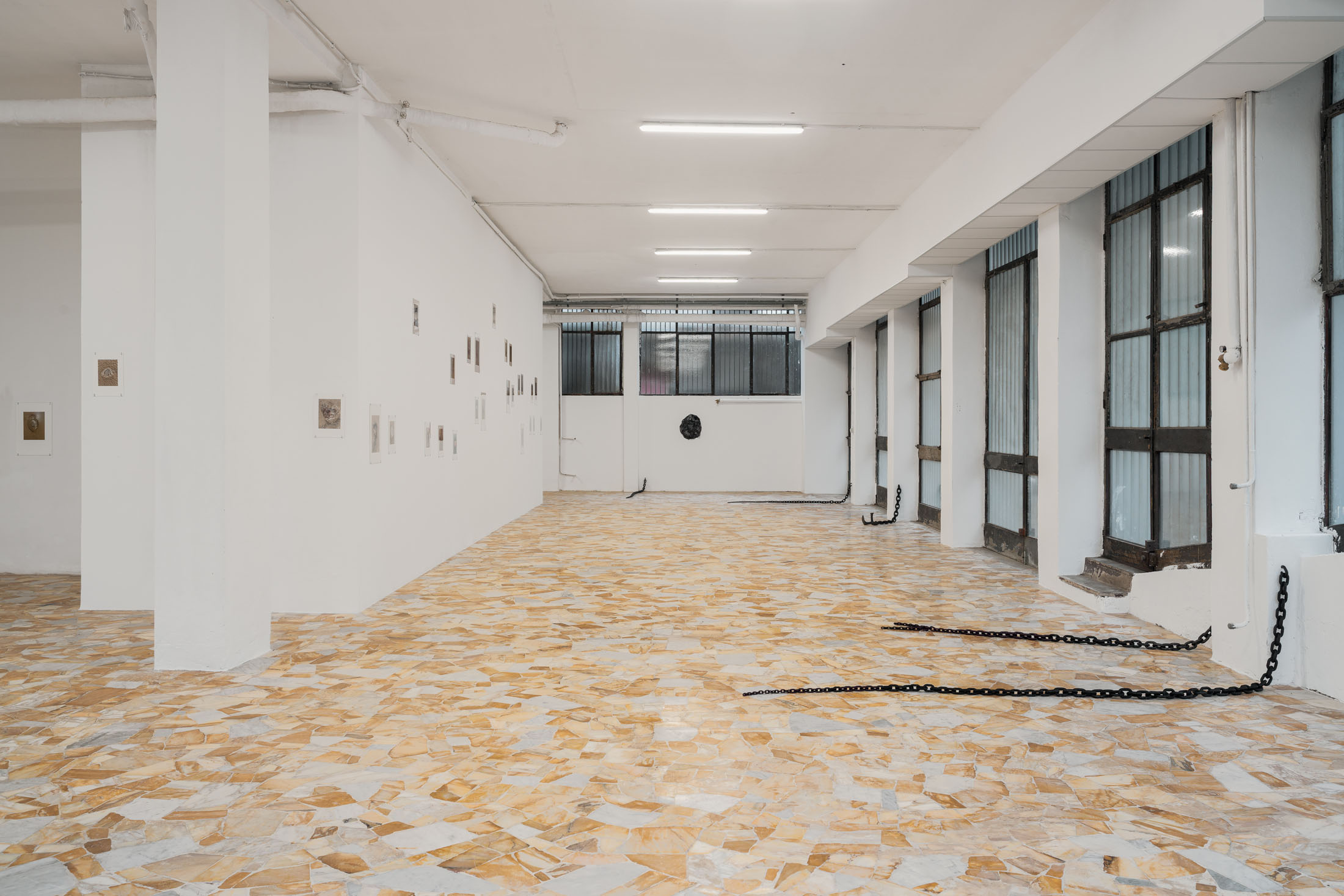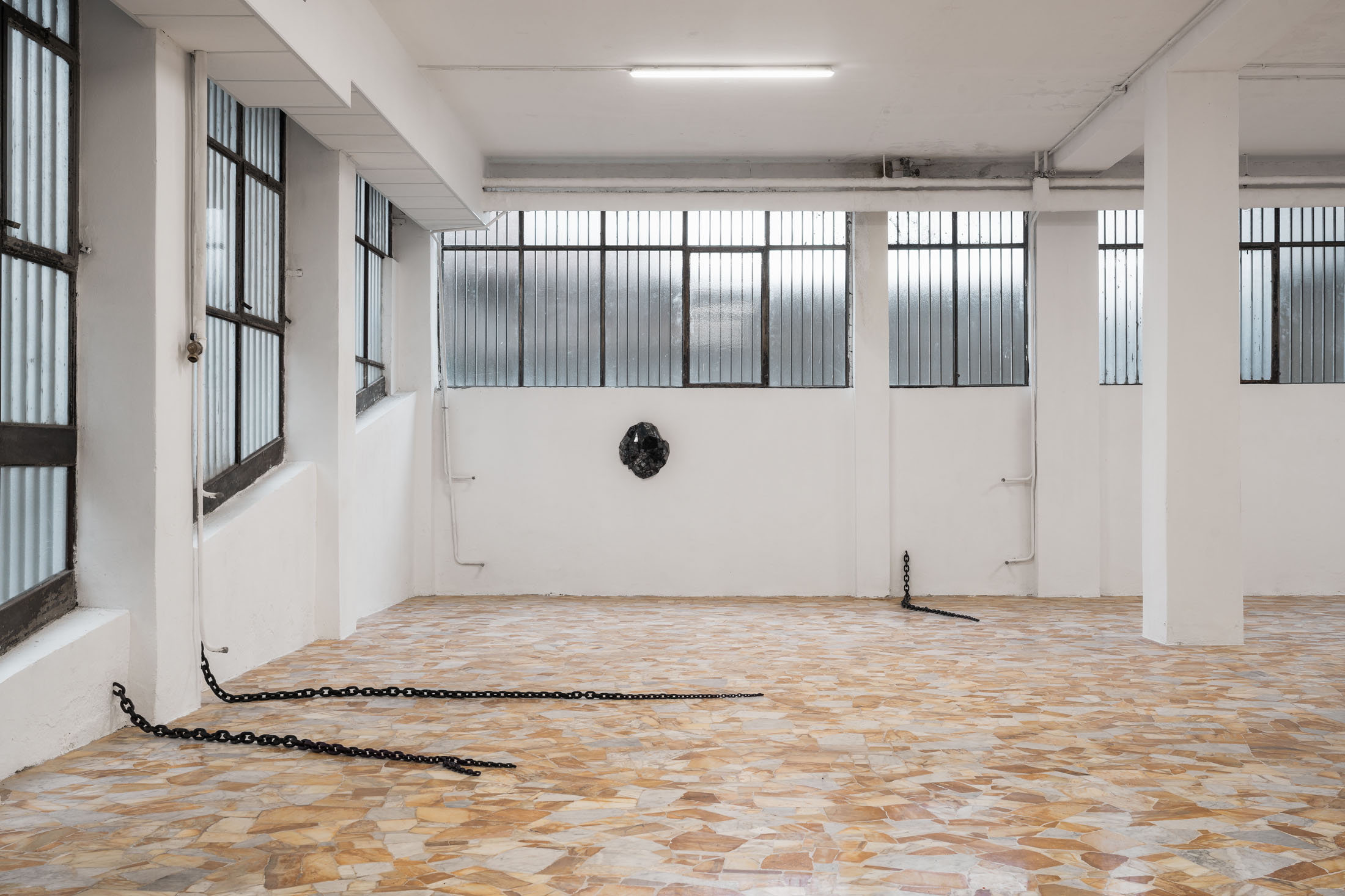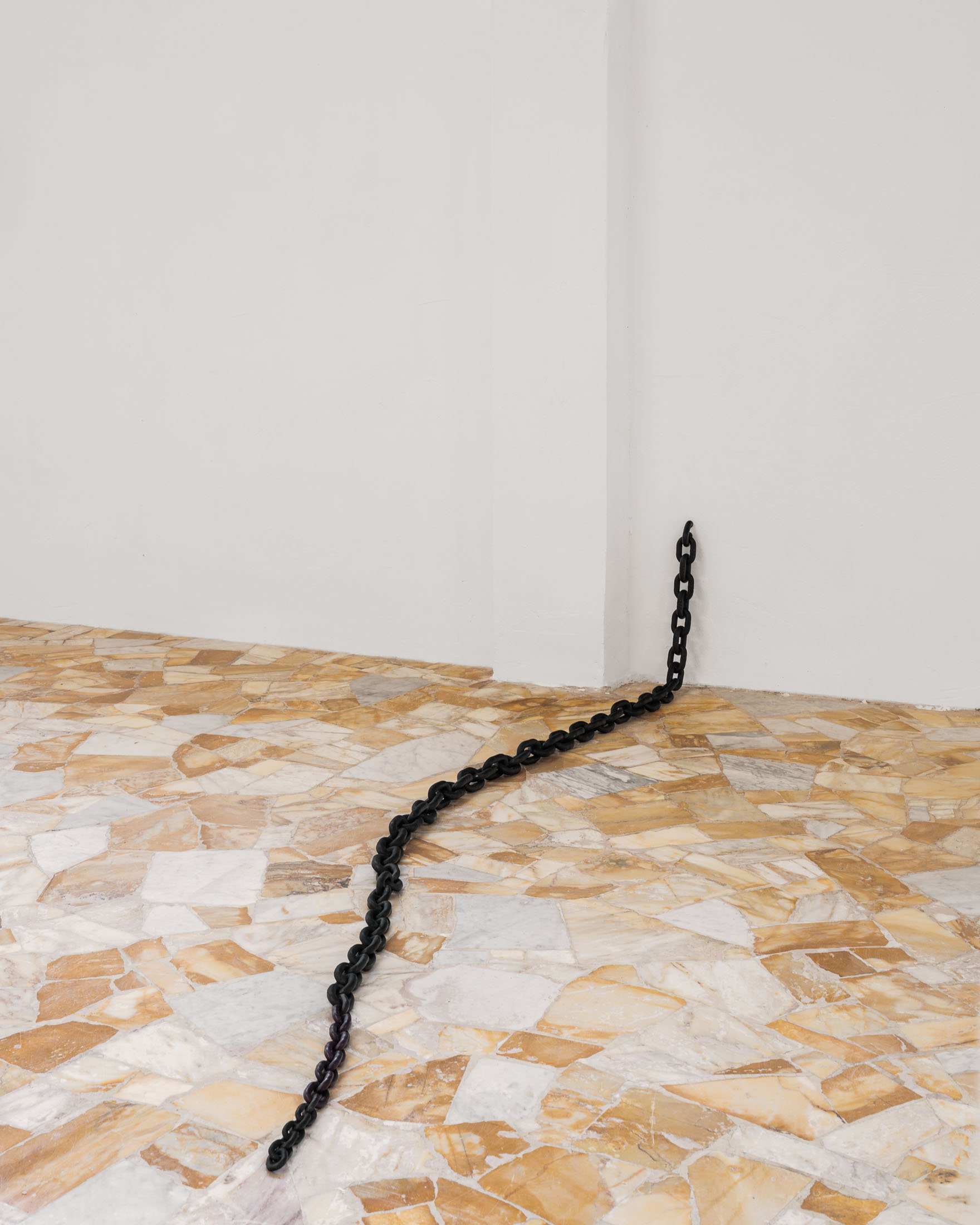 Running through the exhibition as a spatial extension of this photographic work is Untitled (2011), a set of seven metal chains that emerge from the gallery walls and rest on the floor like long tails. The decision to include this body of work was inspired by the architecture of the space itself: pipes, cables, and bars that cut across the windows and assert themselves as structural facts. The chains, Löfdahl notes in our correspondence, can “stand such strong elements.” They read as part of the building’s vocabulary: a latent mechanism of connection, a two-way channel between the gallery interior and what lies outside. Here, the chain becomes both an object and an infrastructure. Installed in relation to the photographs, it extends the exhibition’s logic of seriality into physical space. That meaning is further unsettled by the way the chains taper into thinner, almost tentacle-like ends, as if the jellyfish’s oral arms had sprouted through the walls.
