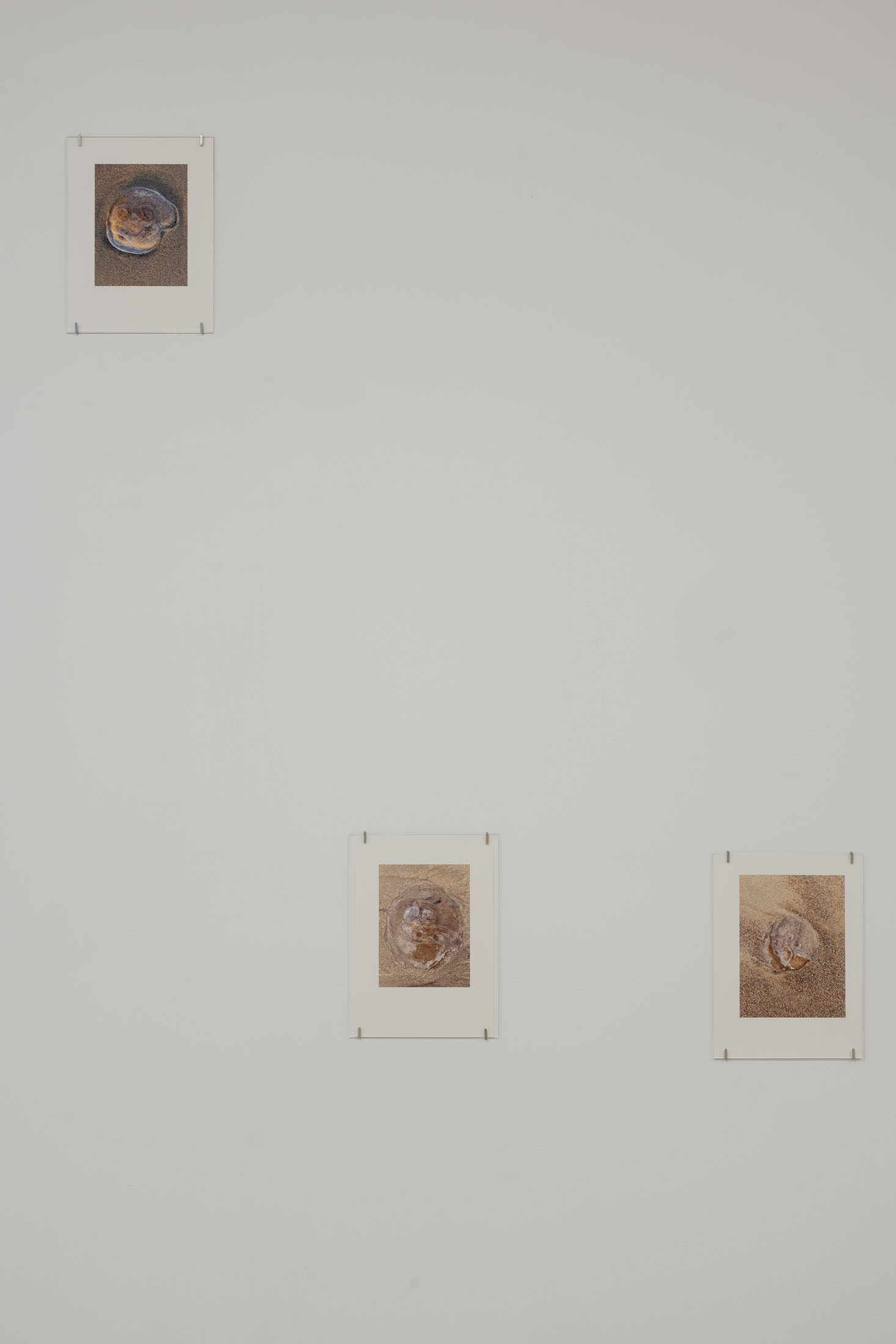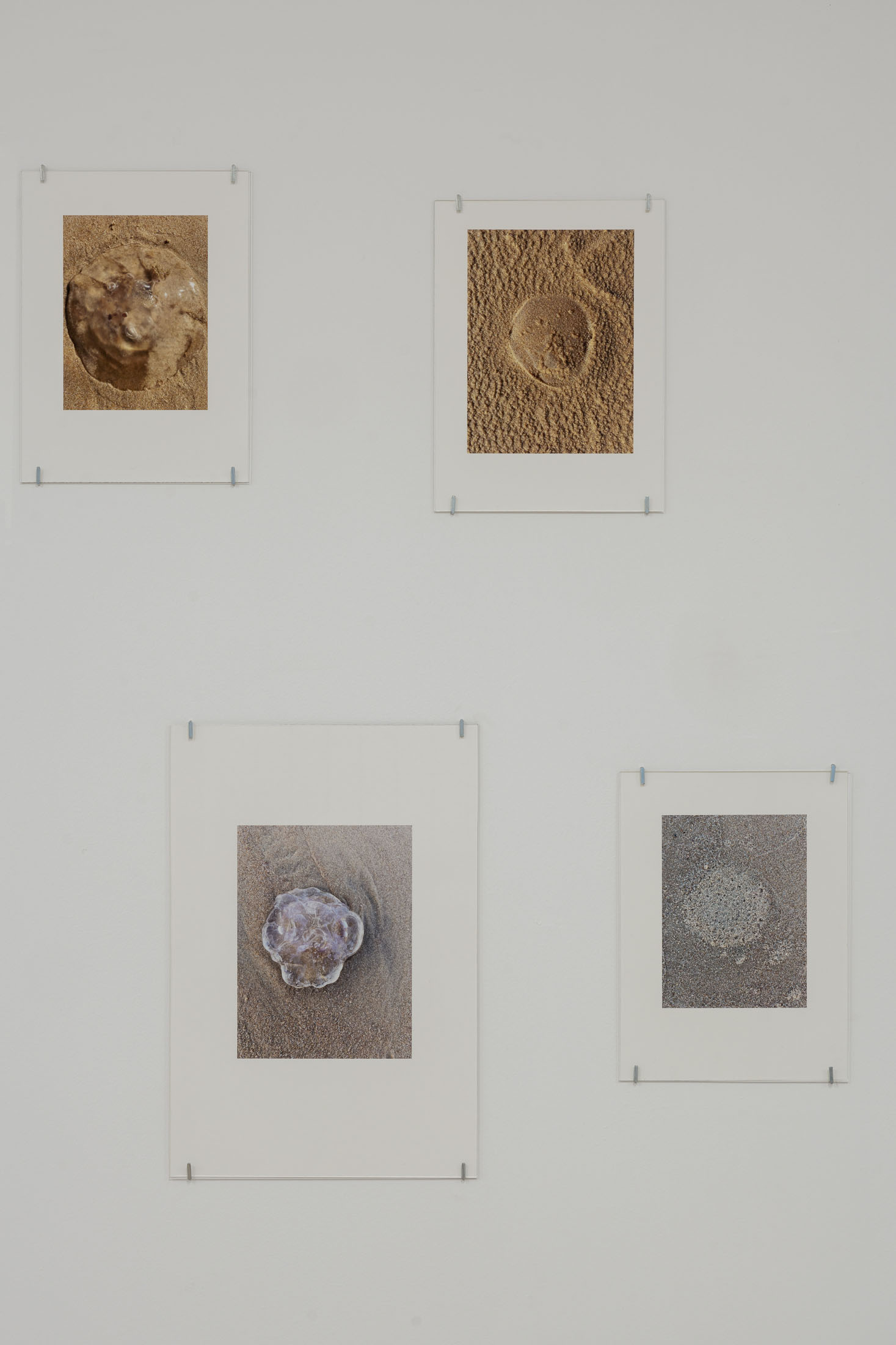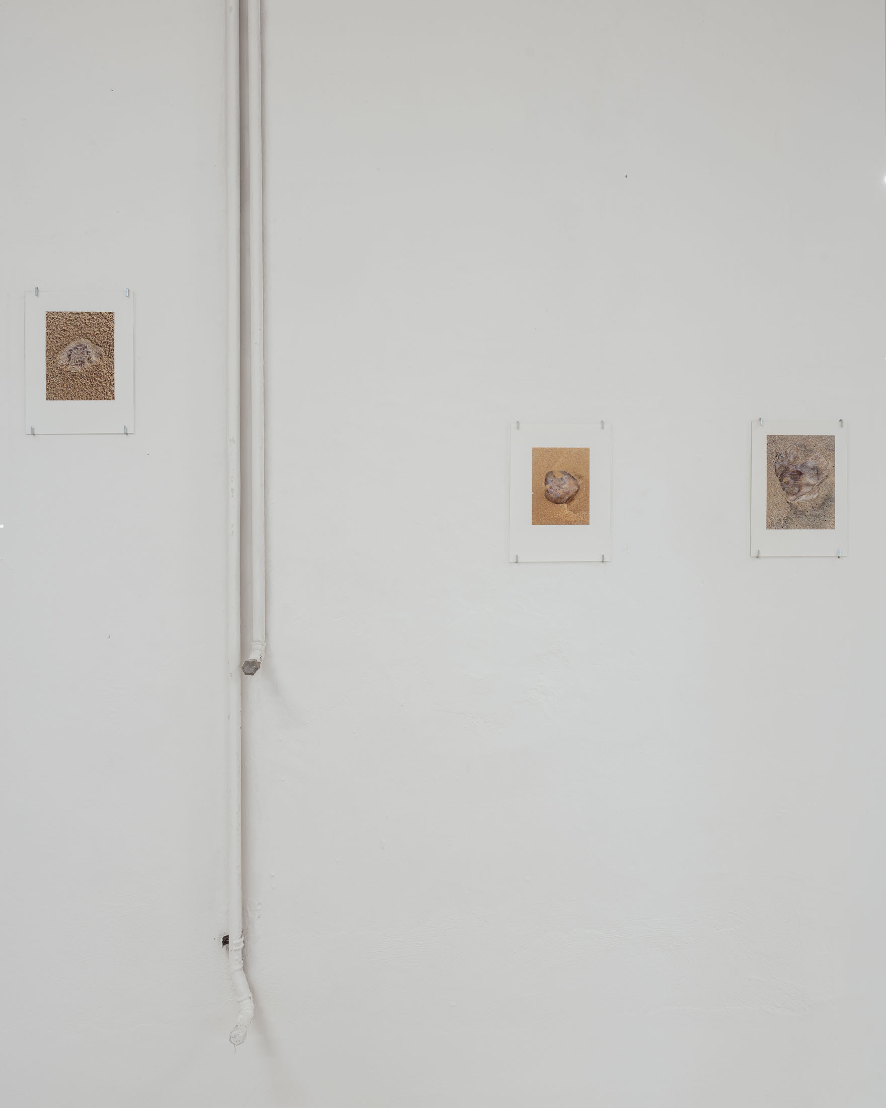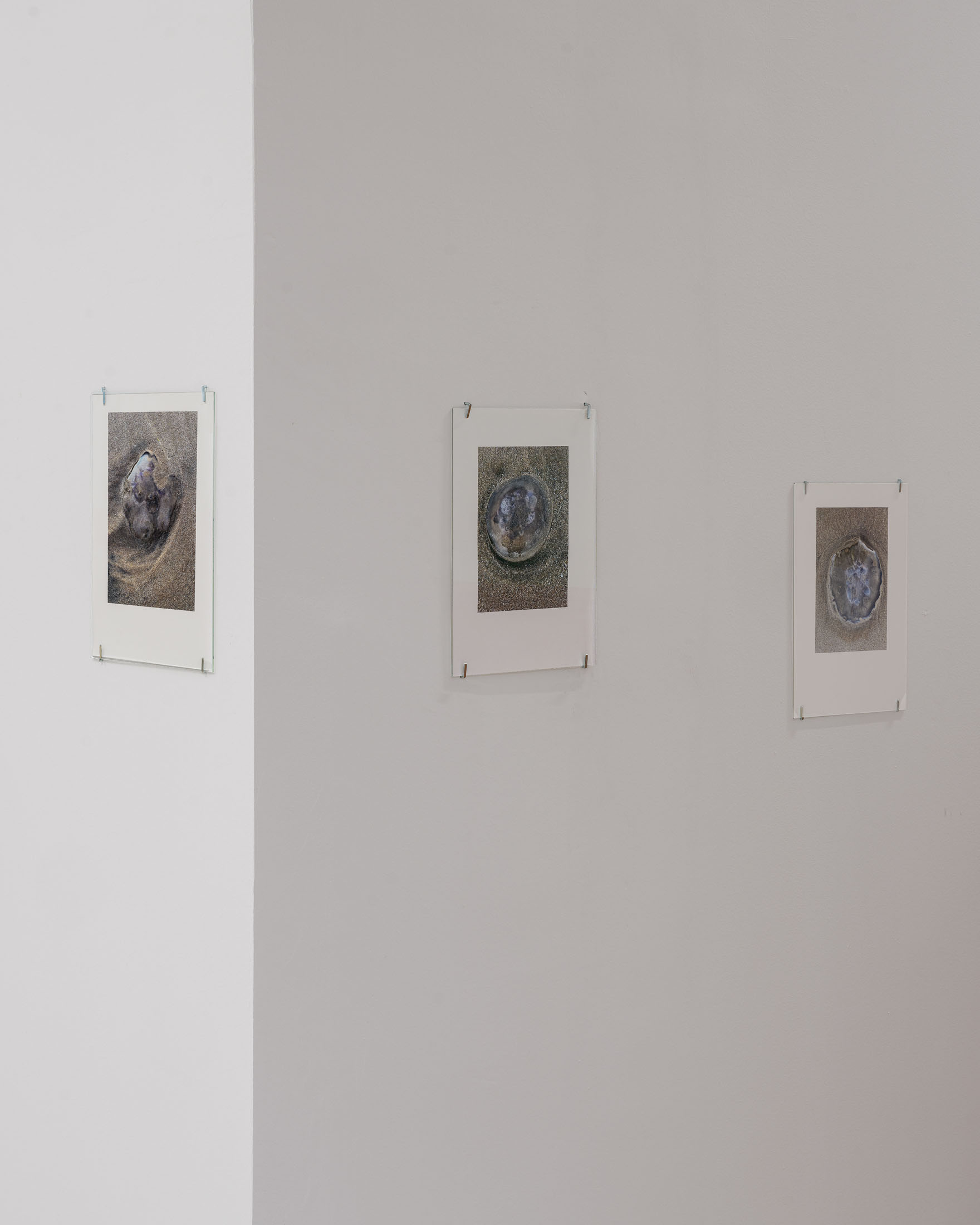 The exhibition brings together three overlapping bodies of work. At its centre is An Audile Double (2022–2024), a series of 33 photographs of jellyfish washed up on a beach. Distributed across the gallery, the unframed images extend over eighteen metres along one wall and into a niche, appearing almost incidental at first, yet calibrated so that each jellyfish can be encountered as its own singular form. Stranded on the shore – some still living, most already dead- the photographs show the translucent jellyfish reflecting the light of the sun, turning their gelatinous shapes into temporary lenses. The species, Aurelia aurita, is commonly known as the “ear jellyfish,” named after aurita, which translates as “having ears,” in reference to the tiny ear-like structures on its body. The title, An Audile Double, thus implies an identification with the jellyfish through the sense of hearing, offering an unexpected point of departure for interpreting the work.