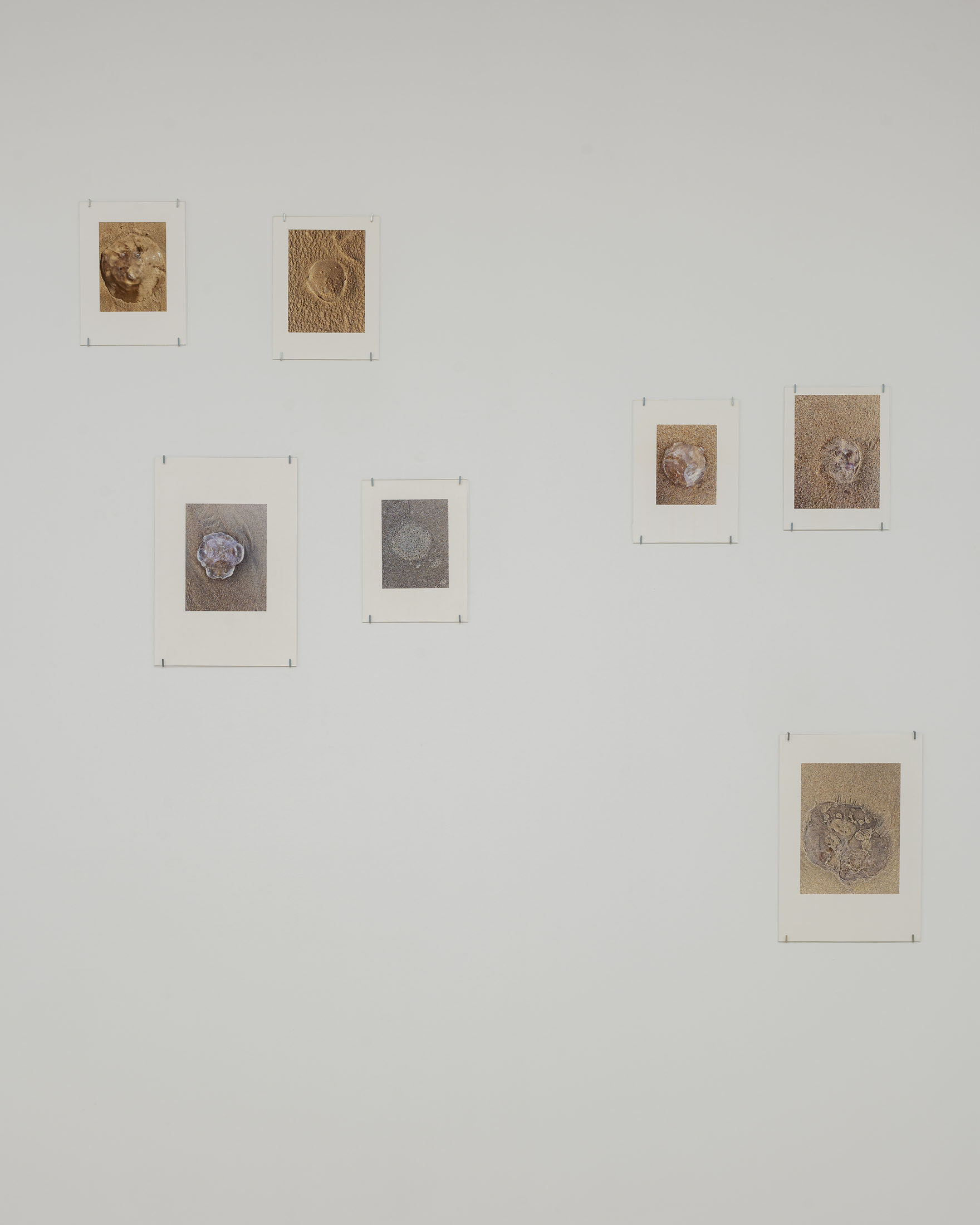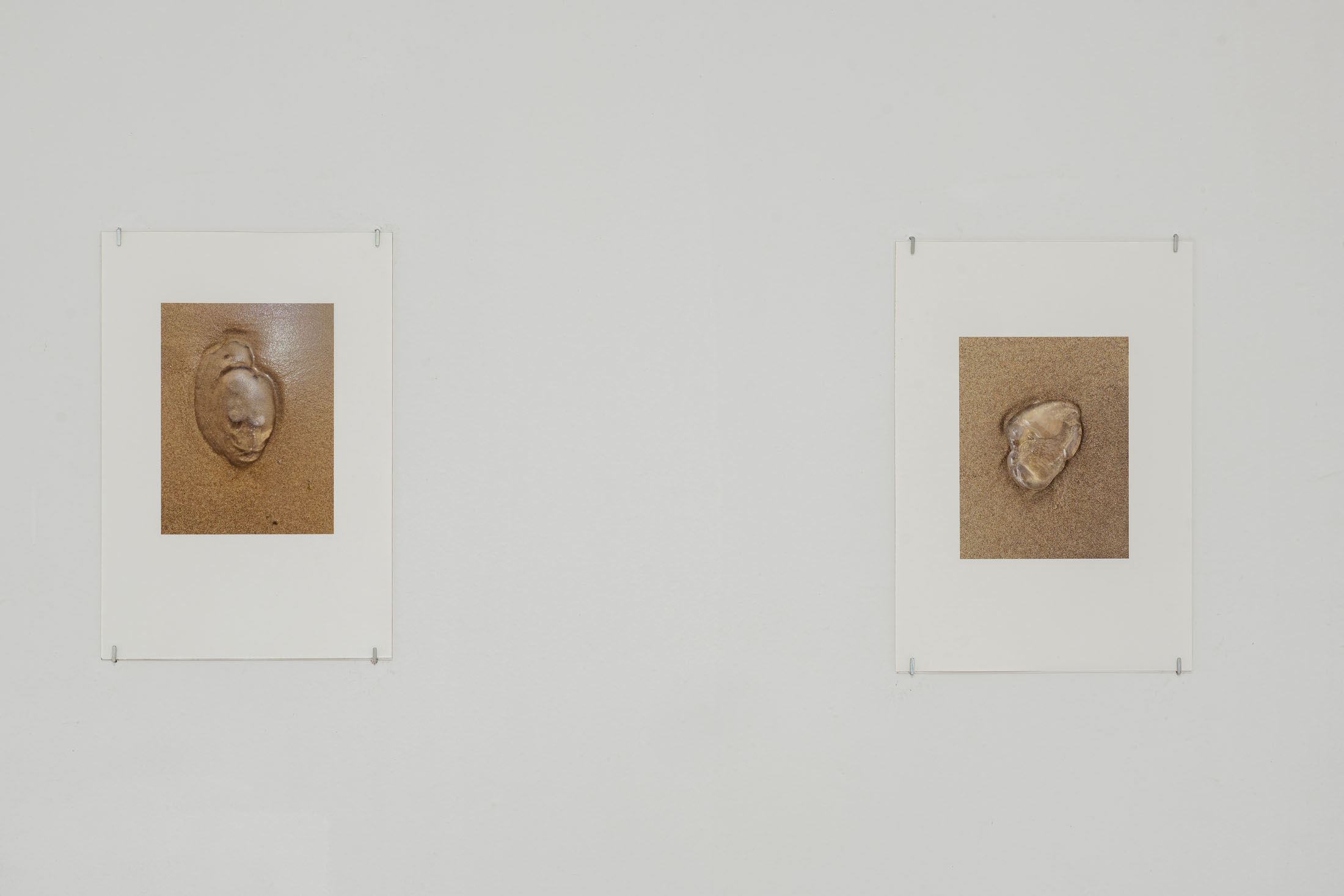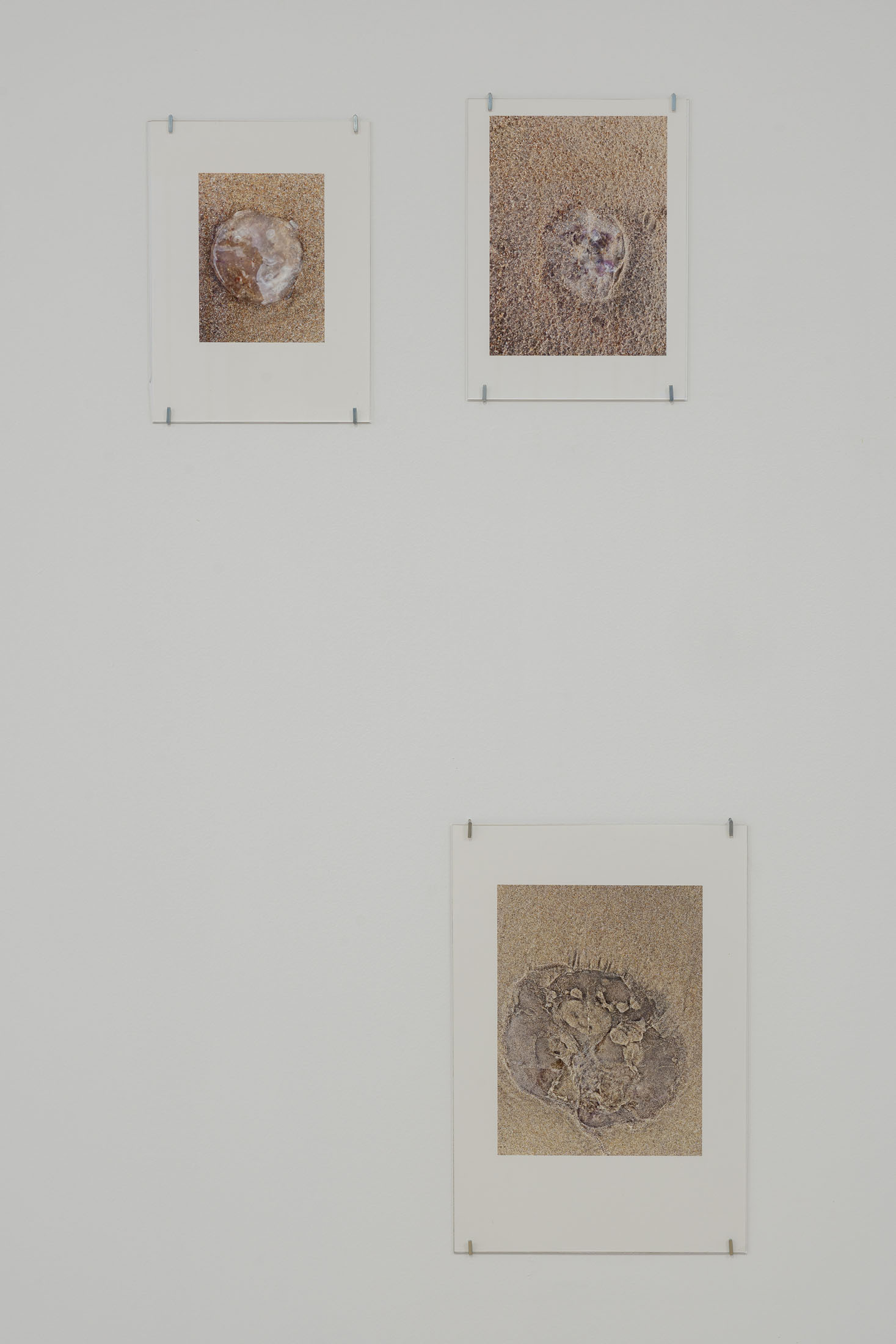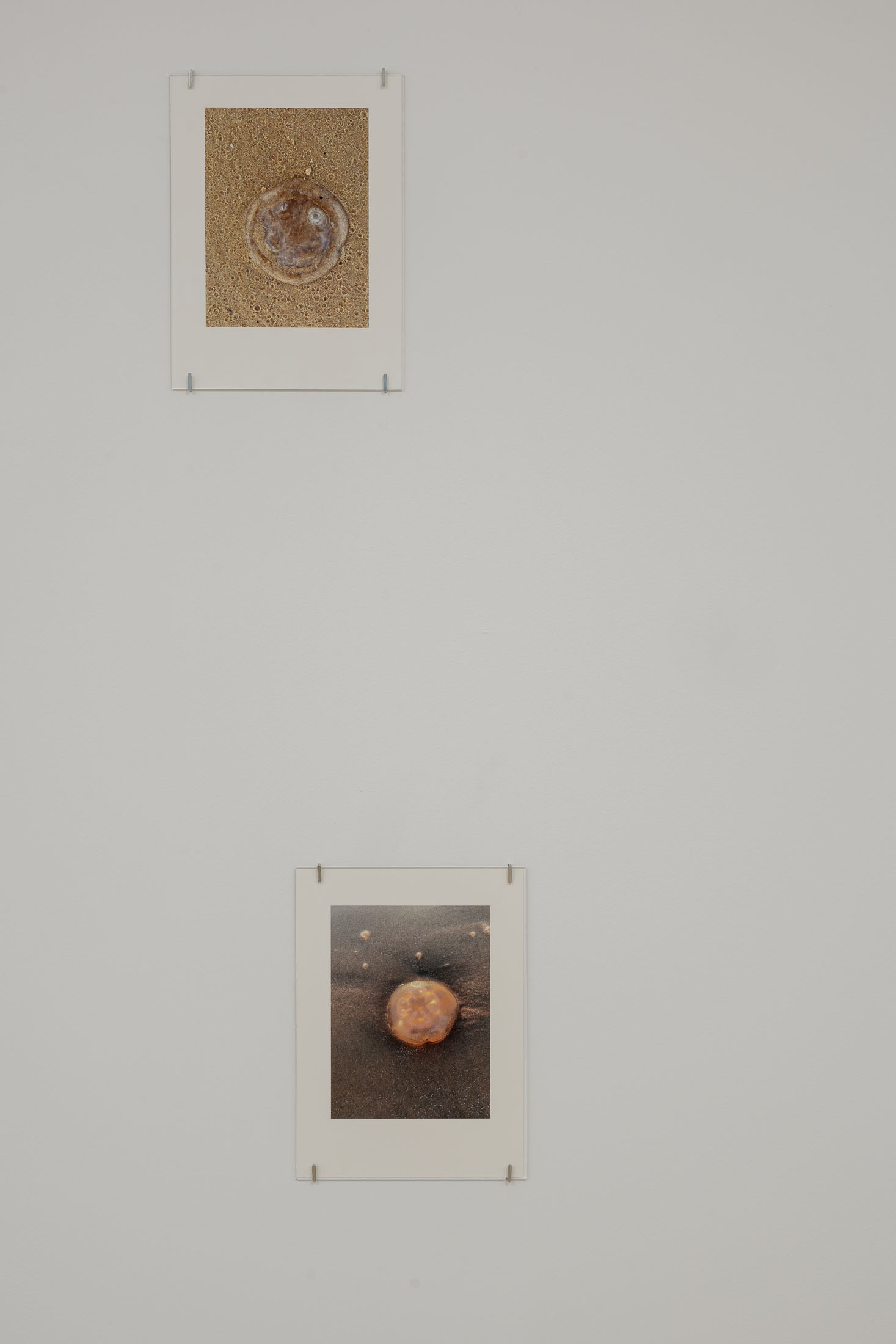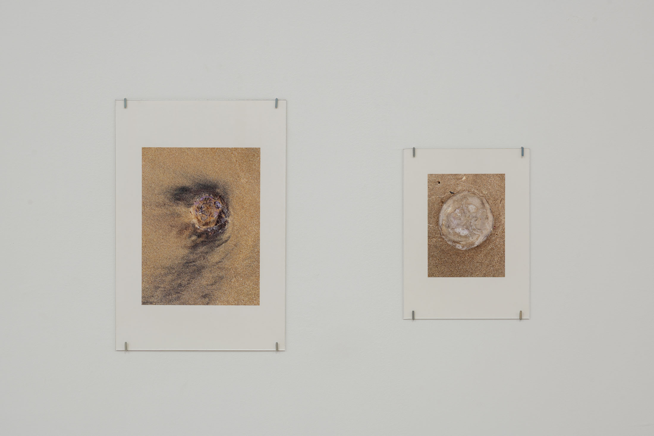 The exhibition brings together three overlapping bodies of work. At its centre is An Audile Double (2022–2024), a series of 33 photographs of jellyfish washed up on a beach. Distributed across the gallery, the unframed images extend over eighteen metres along one wall and into a niche, appearing almost incidental at first, yet calibrated so that each jellyfish can be encountered as its own singular form. Stranded on the shore – some still living, most already dead- the photographs show the translucent jellyfish reflecting the light of the sun, turning their gelatinous shapes into temporary lenses. The species, Aurelia aurita, is commonly known as the “ear jellyfish,” named after aurita, which translates as “having ears,” in reference to the tiny ear-like structures on its body. The title, An Audile Double, thus implies an identification with the jellyfish through the sense of hearing, offering an unexpected point of departure for interpreting the work.