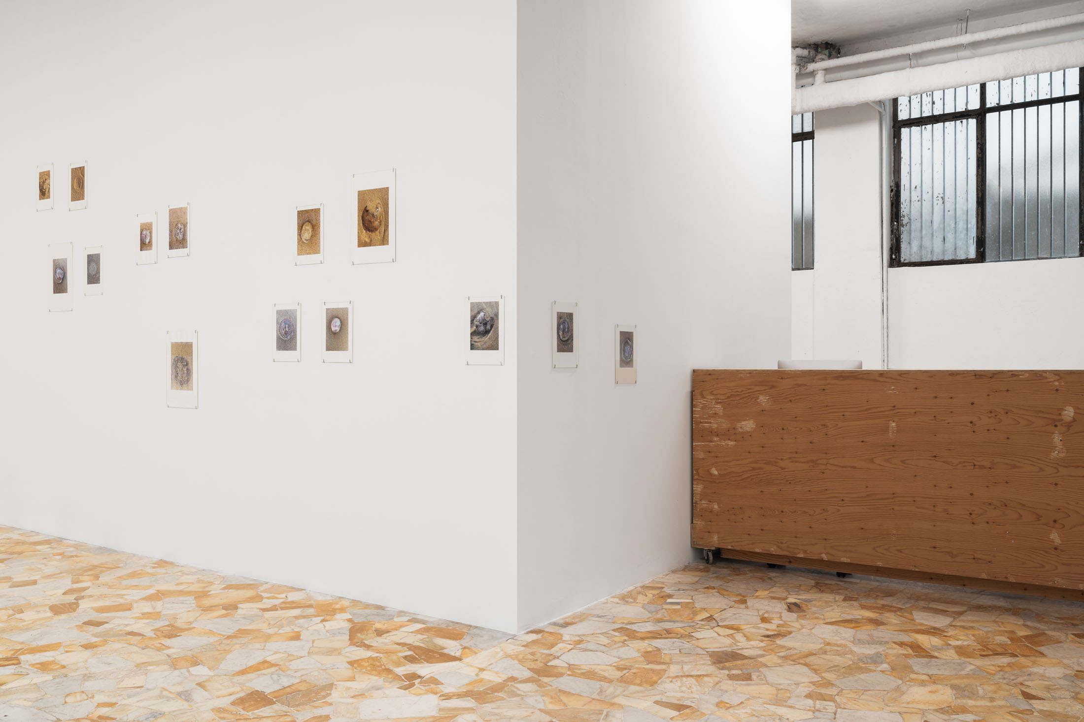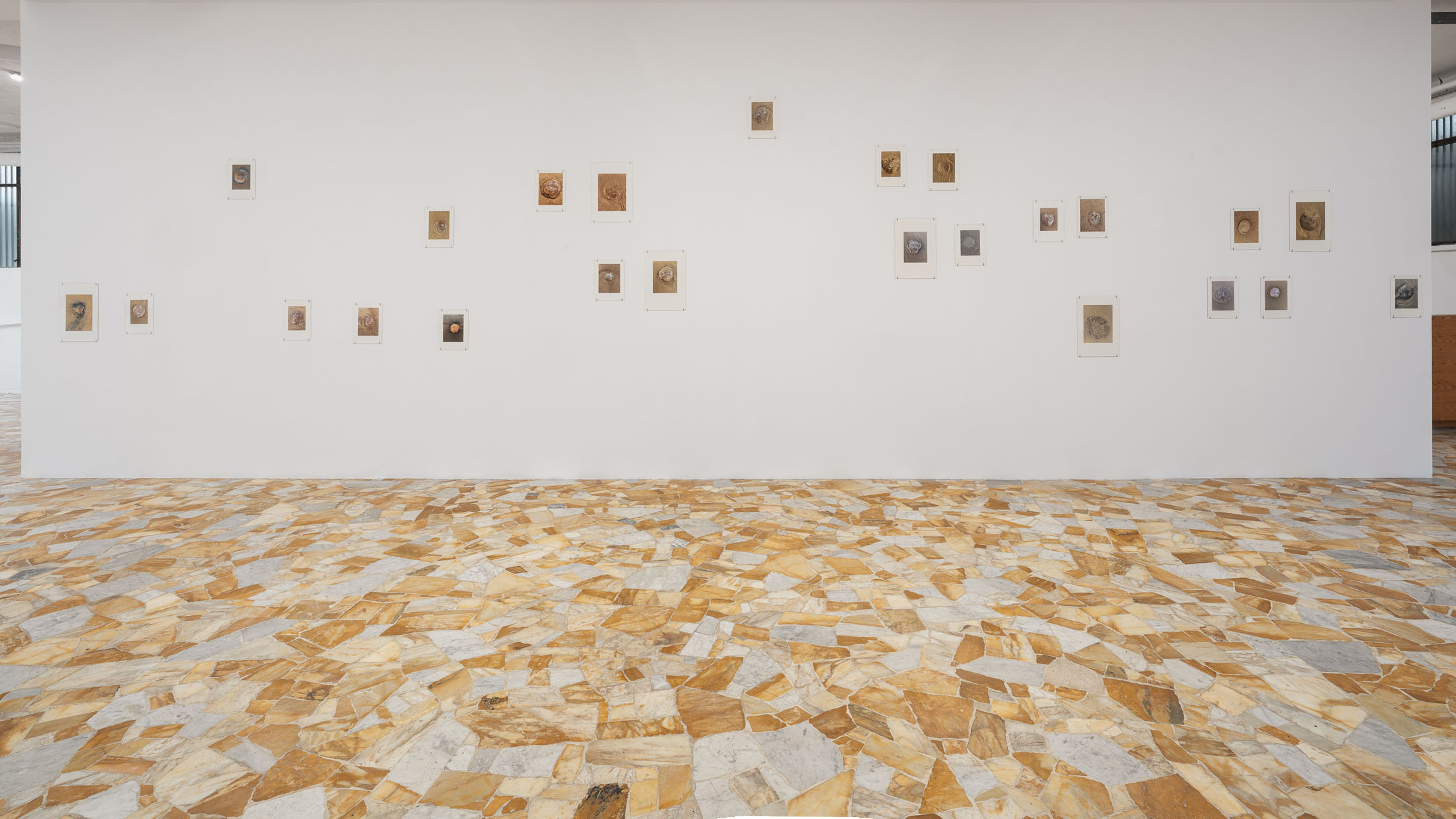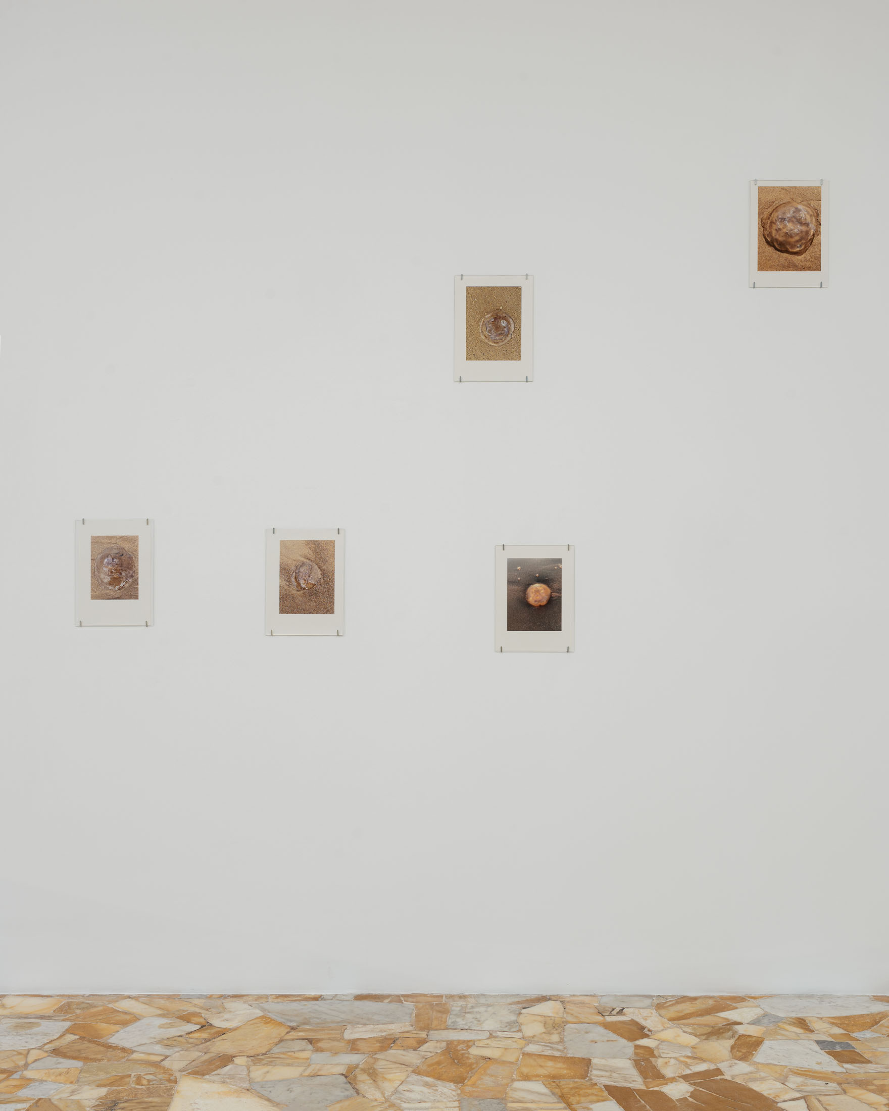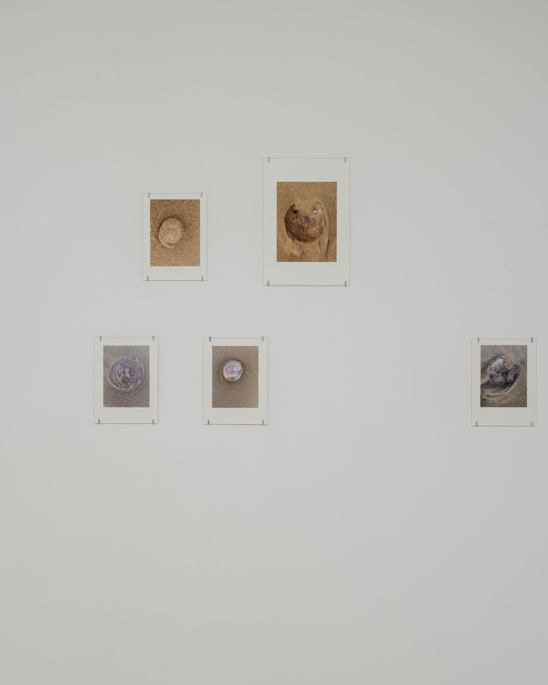 The exhibition brings together three overlapping bodies of work. At its centre is An Audile Double (2022–2024), a series of 33 photographs of jellyfish washed up on a beach. Distributed across the gallery, the unframed images extend over eighteen metres along one wall and into a niche, appearing almost incidental at first, yet calibrated so that each jellyfish can be encountered as its own singular form. Stranded on the shore – some still living, most already dead- the photographs show the translucent jellyfish reflecting the light of the sun, turning their gelatinous shapes into temporary lenses. The species, Aurelia aurita, is commonly known as the “ear jellyfish,” named after aurita, which translates as “having ears,” in reference to the tiny ear-like structures on its body. The title, An Audile Double, thus implies an identification with the jellyfish through the sense of hearing, offering an unexpected point of departure for interpreting the work.