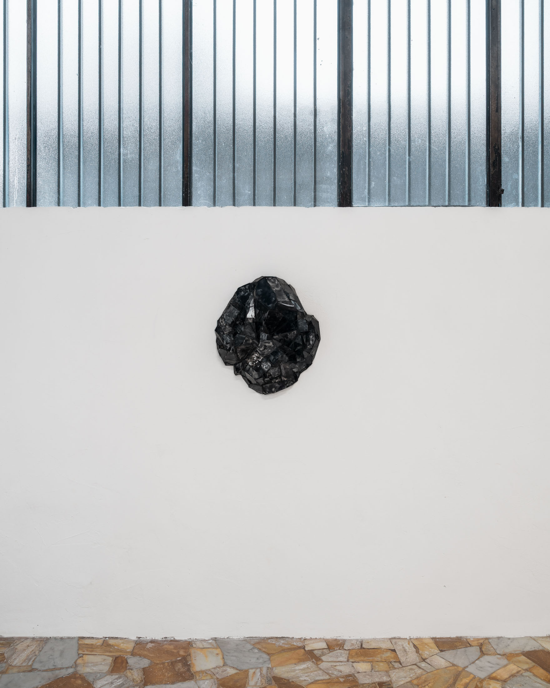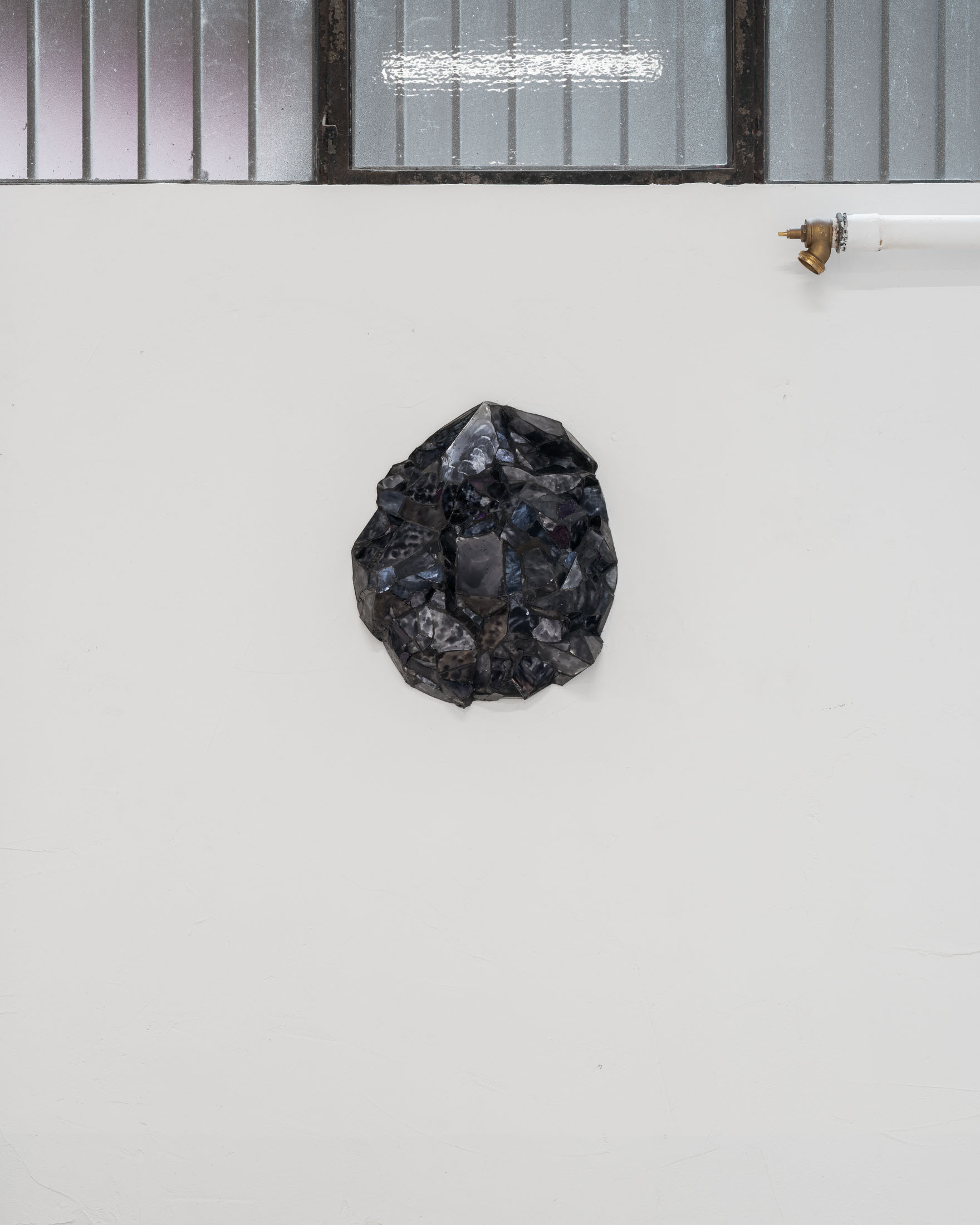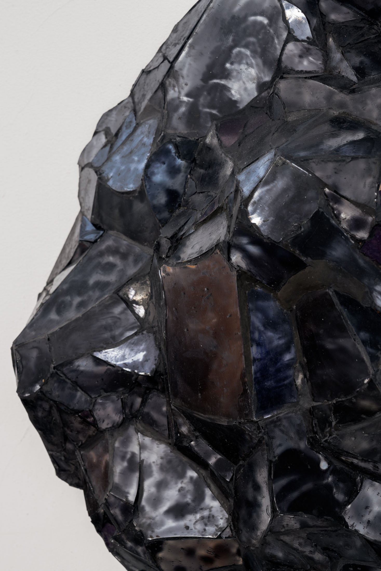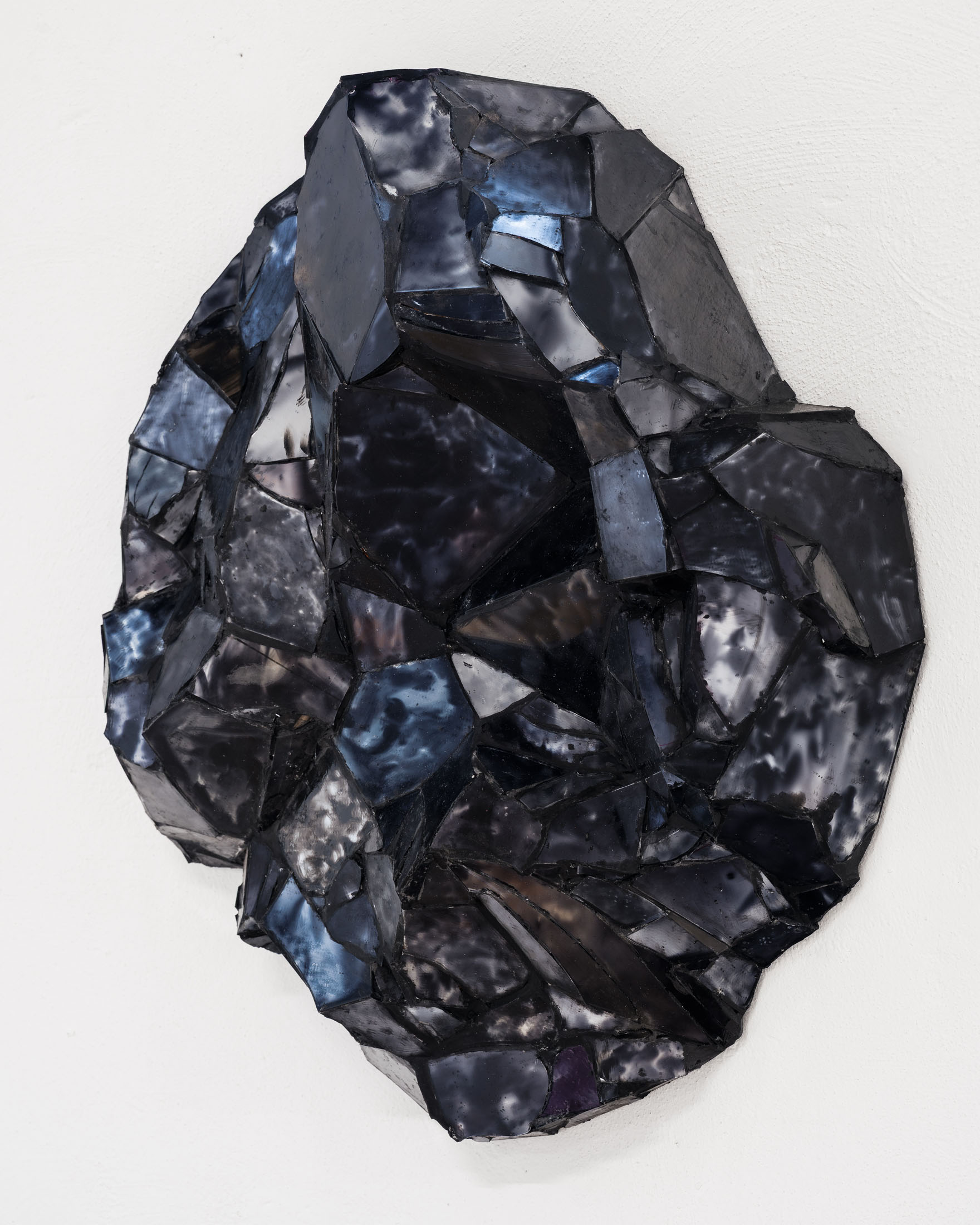 Completing the exhibition are two new works, Untitled (2025), which introduce another kind of perceptual shift. From a distance, these compact forms, which are constructed from painted mirror glass, broken and reassembled into a three-dimensional, topographical structure, may resemble mineral fragments or geological matter. Up close, they reveal their hand-made facture: fractured planes, joined edges, and a surface that refuses a single, fixed image. Löfdahl describes them as “topographical/cubist,” appearing to change dramatically with small shifts in light, depending on the viewer’s position. Their instability is not an effect layered onto the object, but embedded in its construction: reflection and painting collapse into one another, producing a material that behaves like an image, and an image that insists on being material.