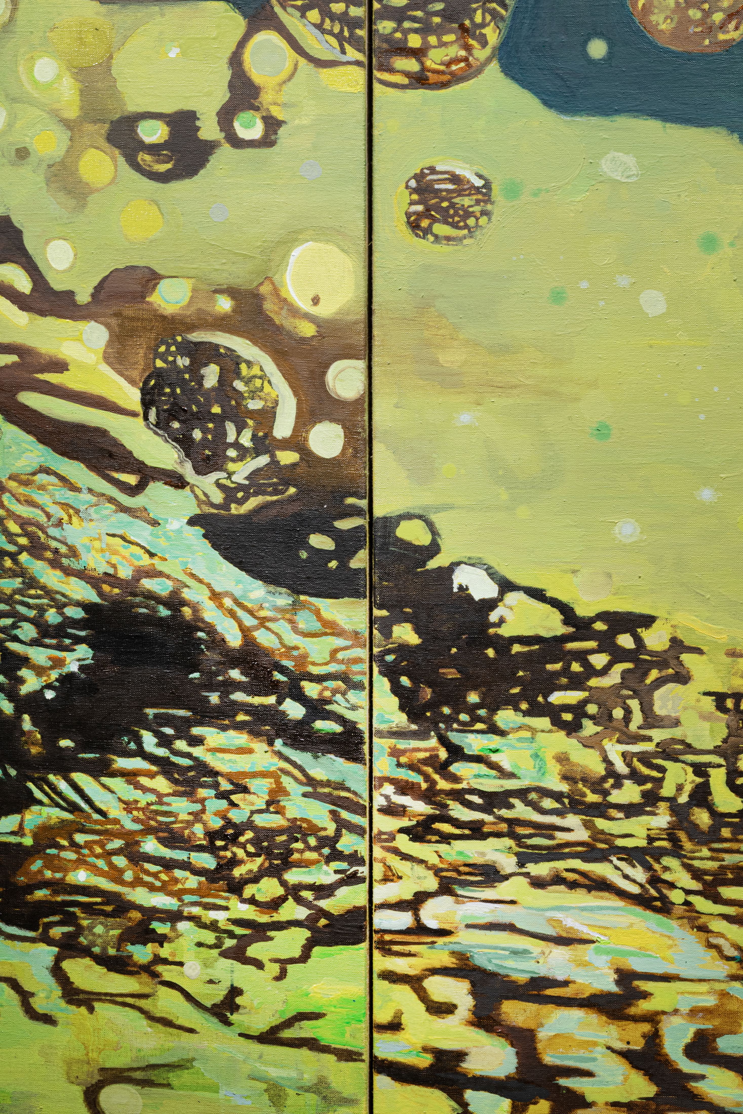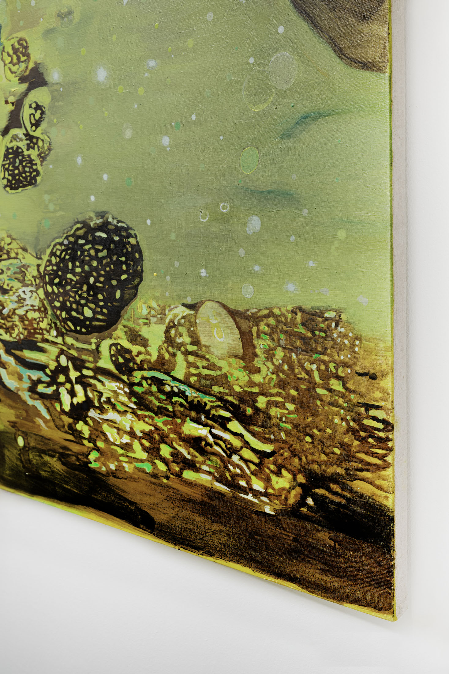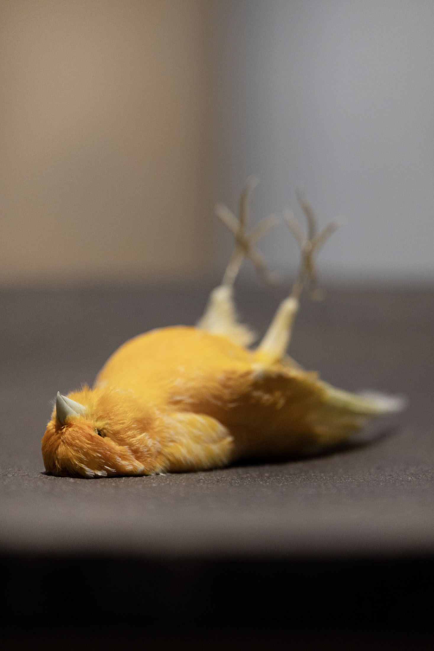 In relation to this trajectory, a canary appears alongside the paintings, recalling the history of mines, where these birds signaled the presence of toxic gases, becoming sensitive indicators of danger. In this role, its presence assumes a strong symbolic as well as perceptual value, configuring itself as a liminal point—a threshold marking the alternation between a state of control and one of risk.