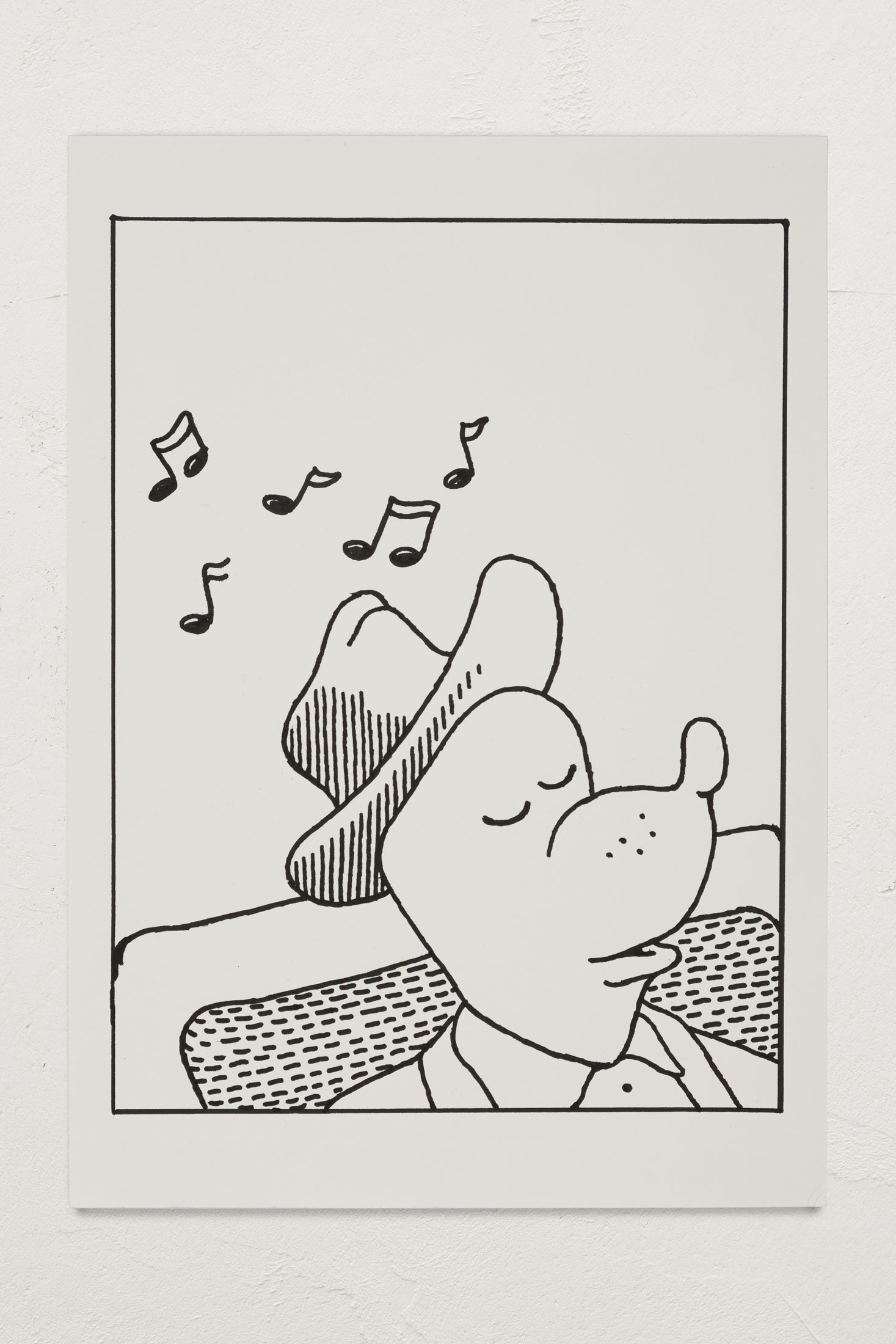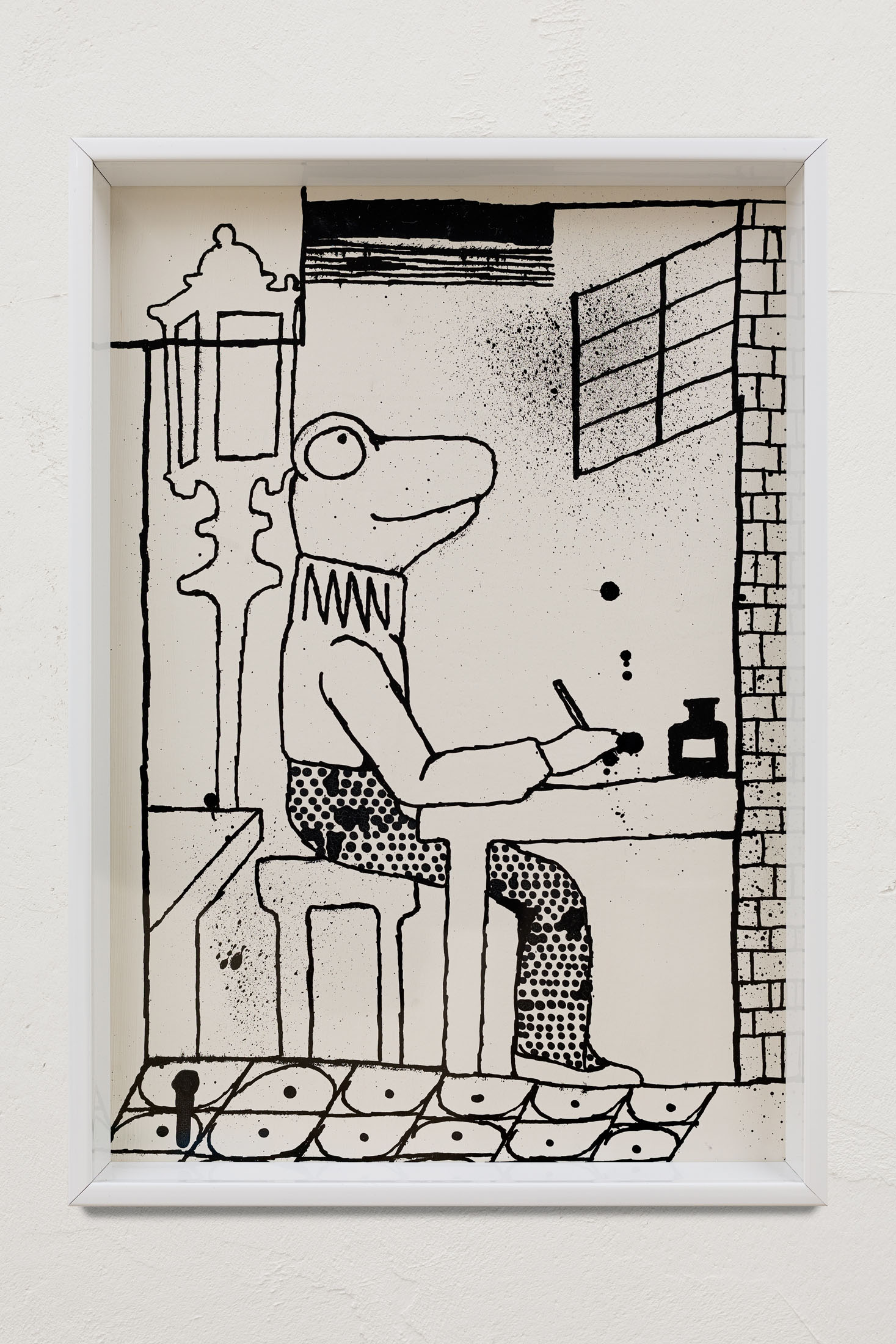 This openness holds a willingness to share his creative flow and allow us to become part of it. In our reading, two threads seem to resonate across his universe: the mystery of life, sometimes embodied by dice, playing cards or detective-like figures; and the bliss, found in the small pleasures of the day to day, the cozyness of a cup of tea, the joy of a walk, or a conversation with a cloud.