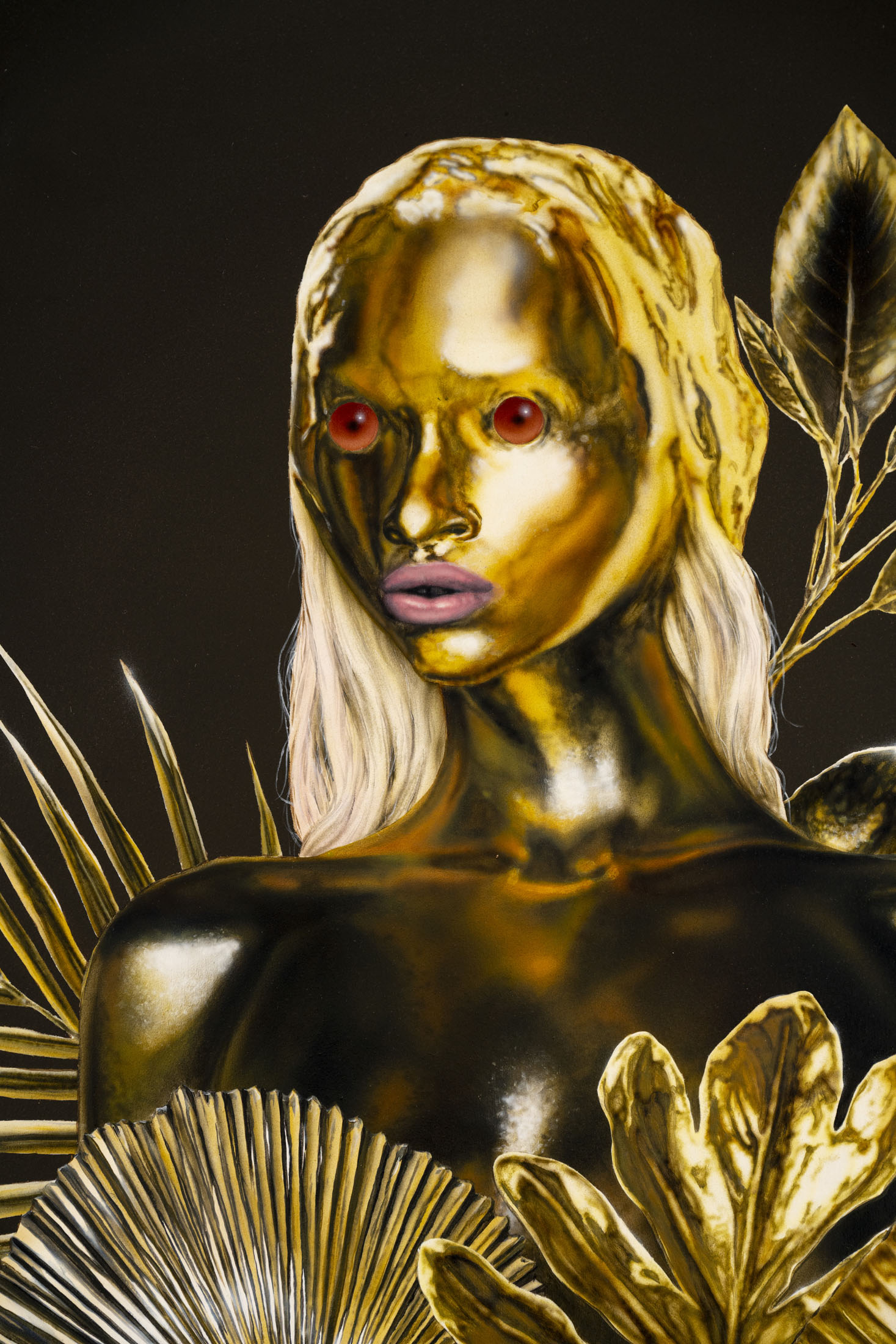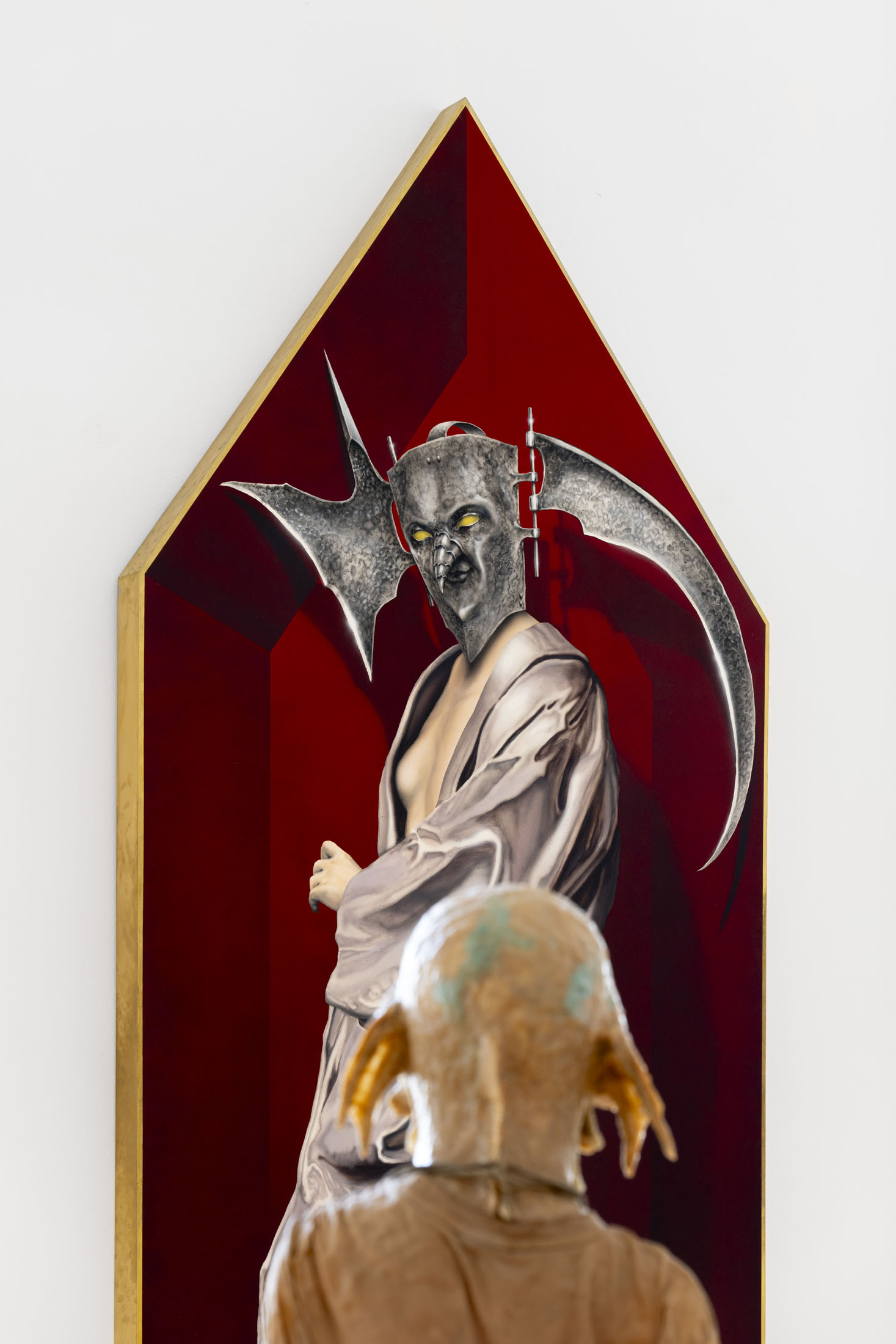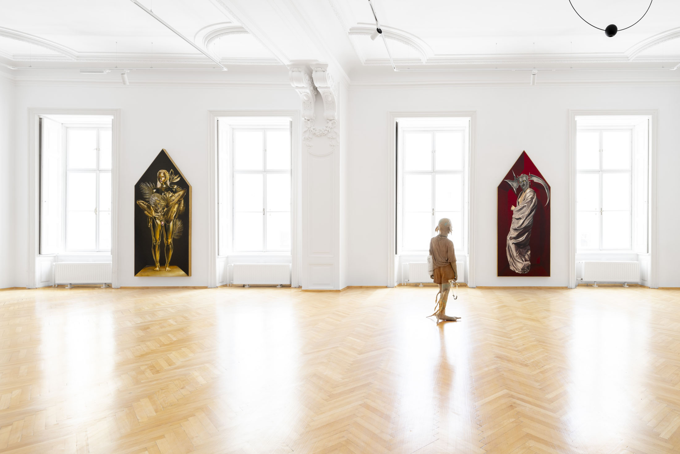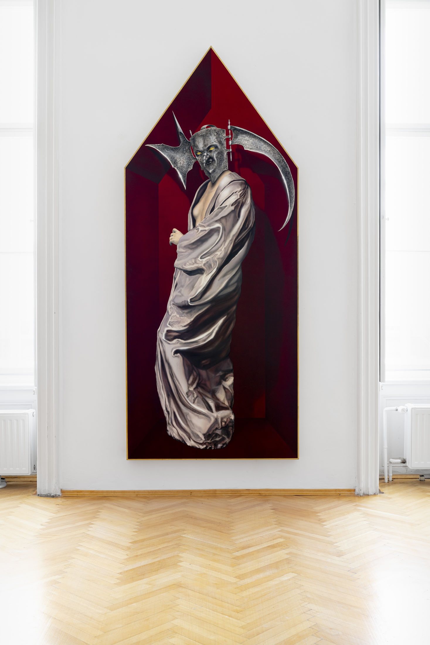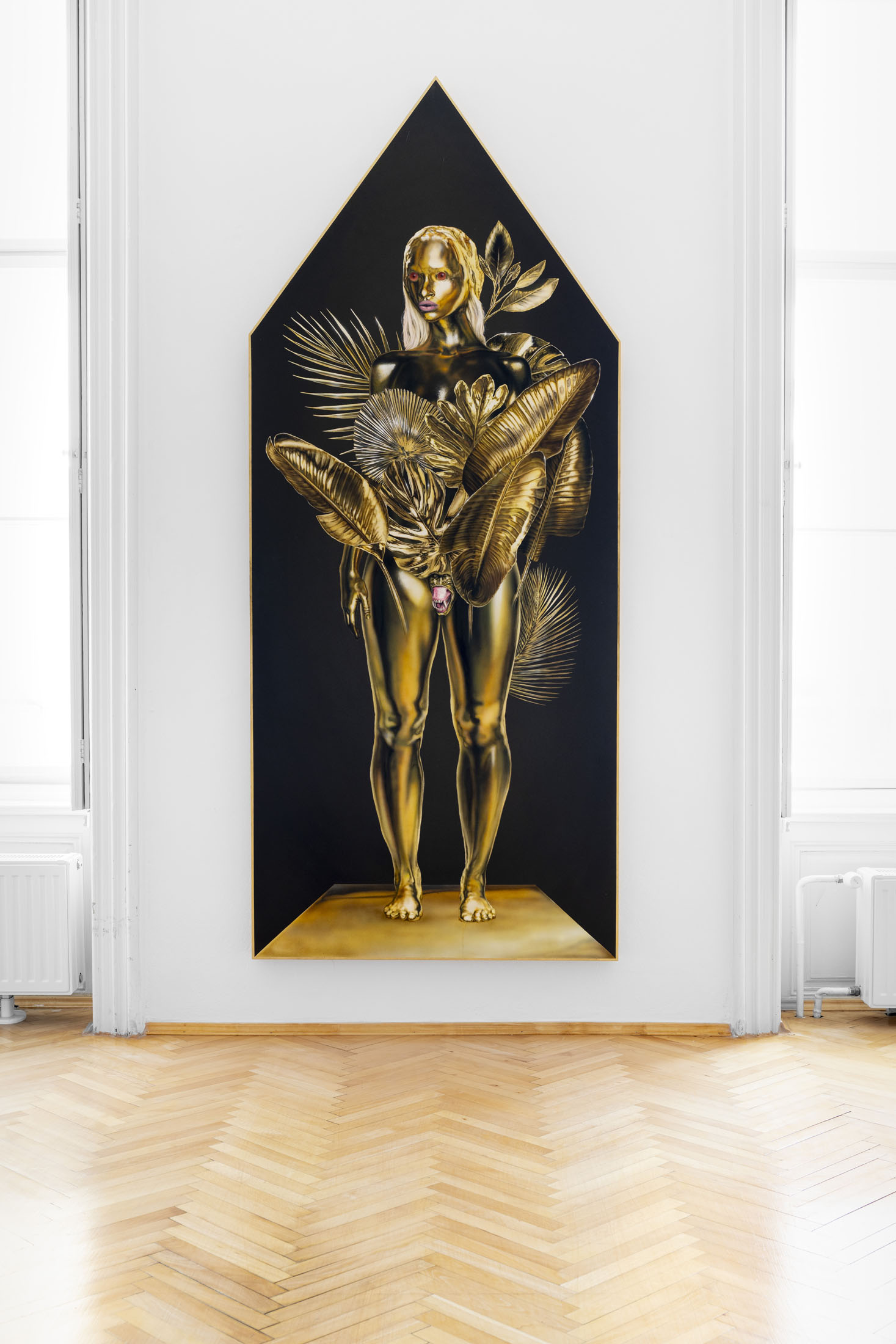 Áron Lőrincz (b. 1985, Budapest) explores the realm of sleep paralysis and hallucinations through the lens of mythological demonic beings in his Succubus series. His monumental acrylic paintings on wooden panels – evoking the architecture of chapel interiors – depict figures that are at once sensual and disquieting, marked by hybrid anatomies and physical anomalies. These visually appealing yet haunting forms emerge from the perspective of demonology, appearing within dreams to seduce men and drain them of their life force and soul. Lőrincz probes the delicate boundary between science and mysticism through his work, while also reflecting on the deeply personal experience of intense nocturnal states.