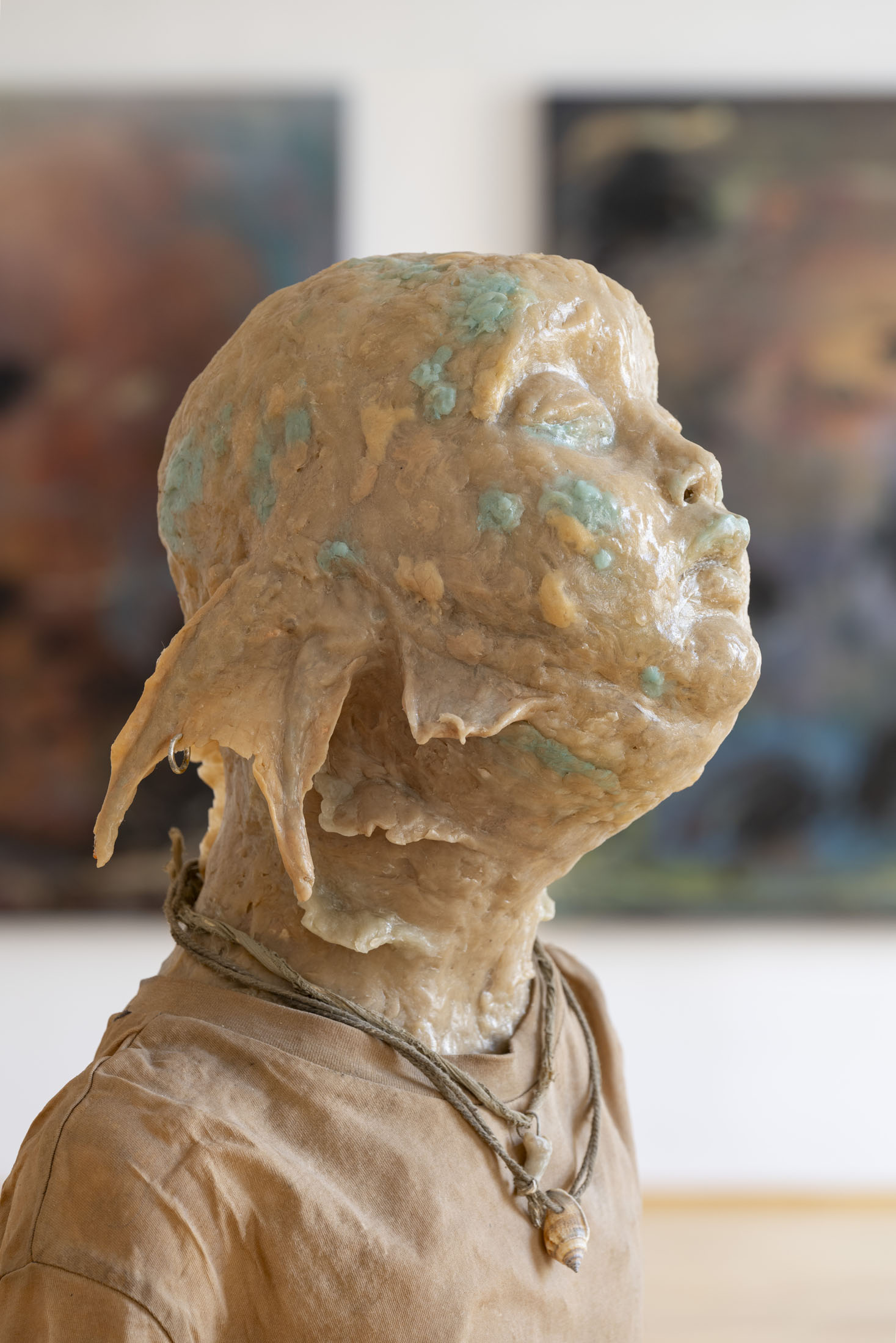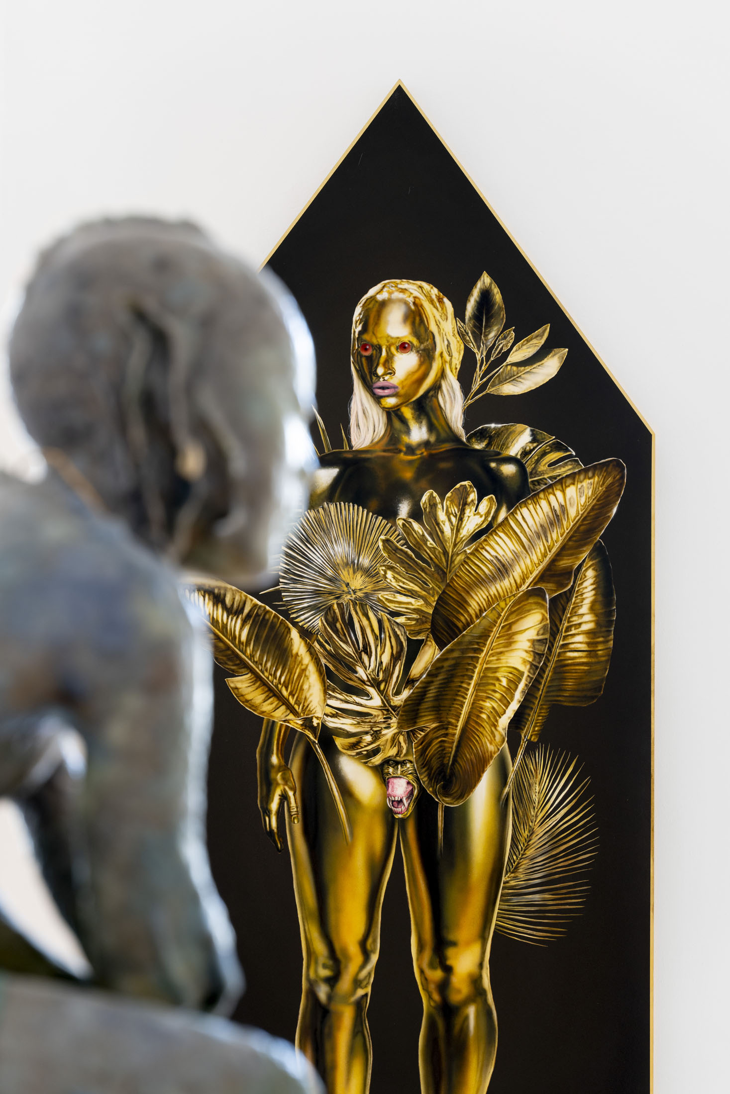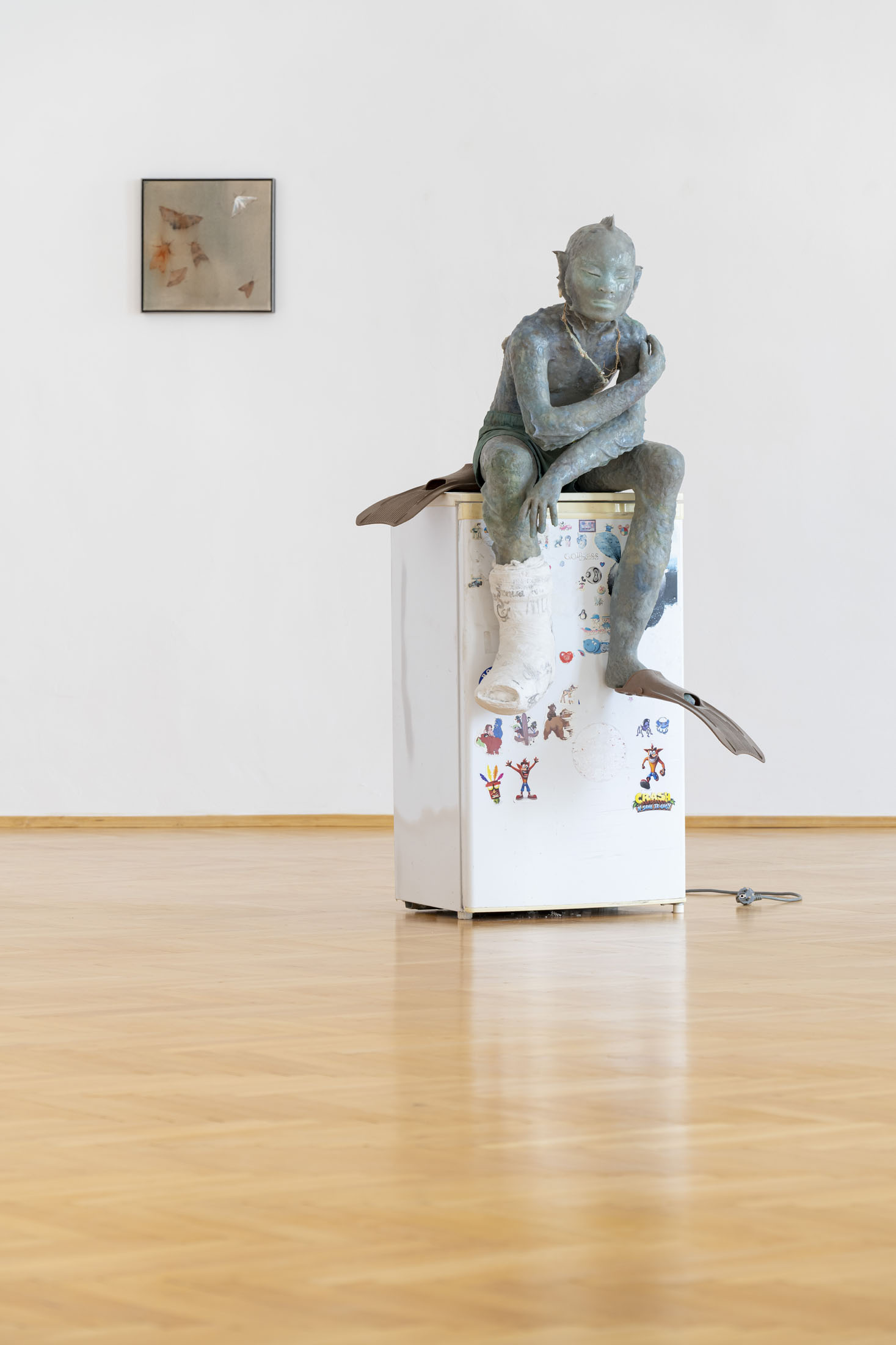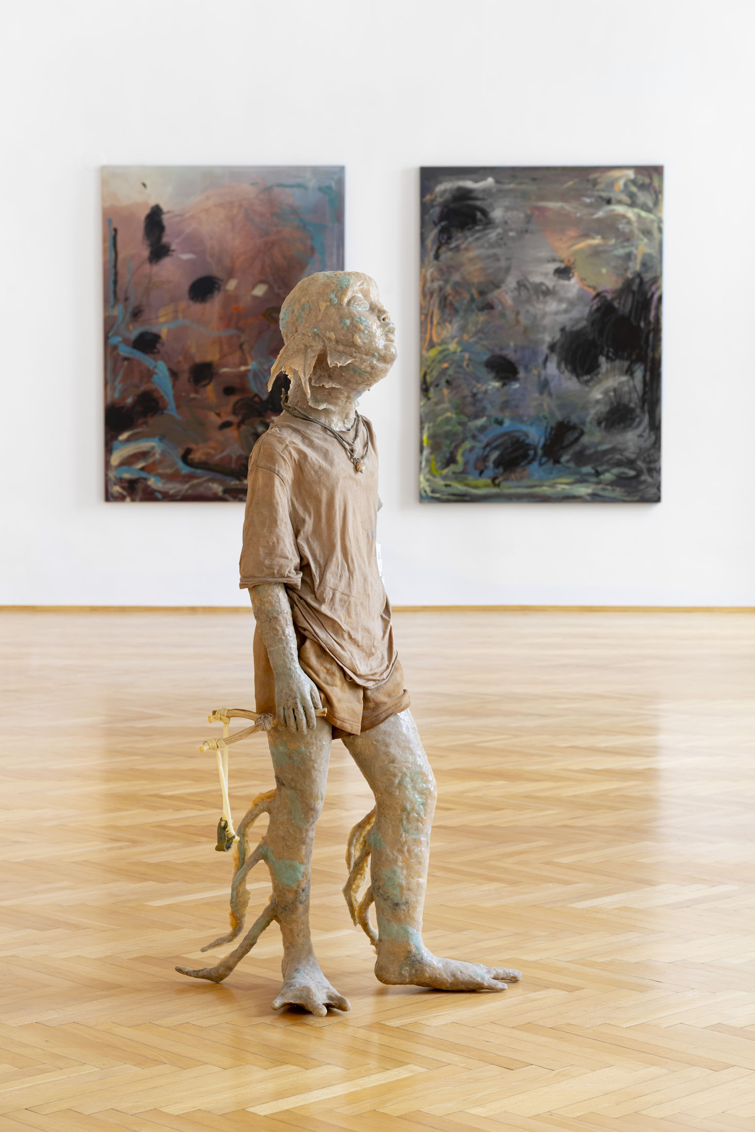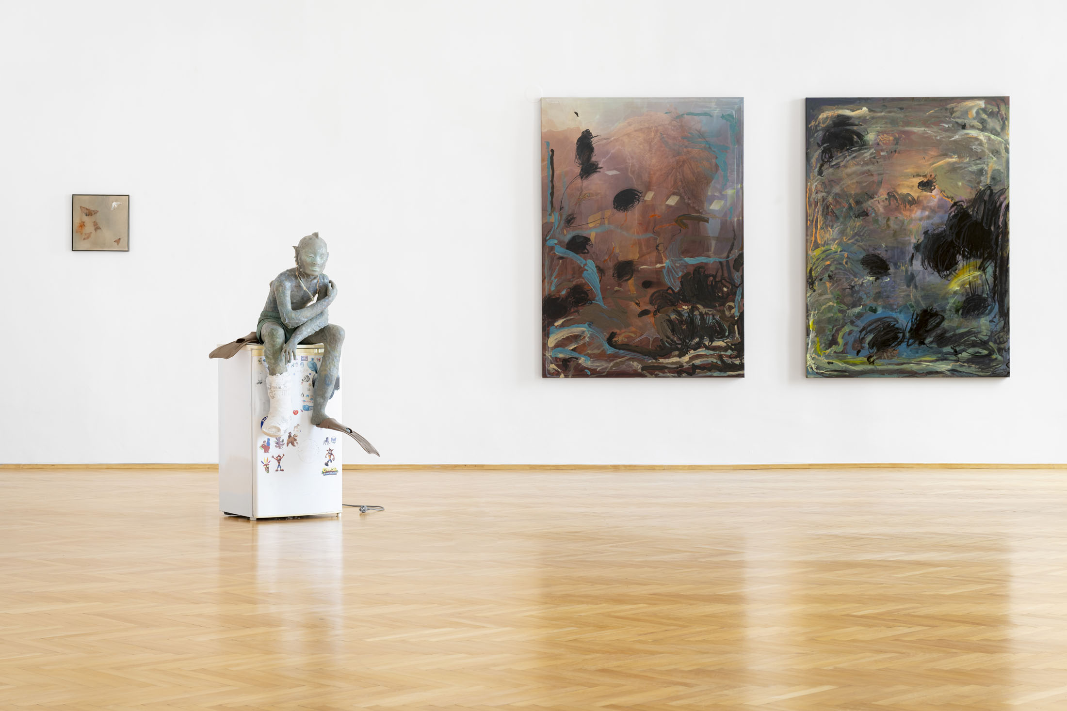 Michele Gabriele (b. 1983, Fondi, lives in Milan) creates fragmentary narratives set in an elusive space-time between the past, the future and a parallel present that comes before the apocalypse or lingers after it. In his original line of hyper-realistic figurative sculptures, he connects mythological creatures – Tritons – with sci-fi and pop culture references and museum aesthetics. The figures appear dreamlike, silent and contemplative. We do not know their origin or fate, yet their presence carries the power of an archaeological find from the future. He complements his vision of his own world with a series of abstract paintings in which gestural strokes and minute details transform noise and digital layers into an intuitive discovery of meanings, drawing on the surrealist practice of decalcomania.