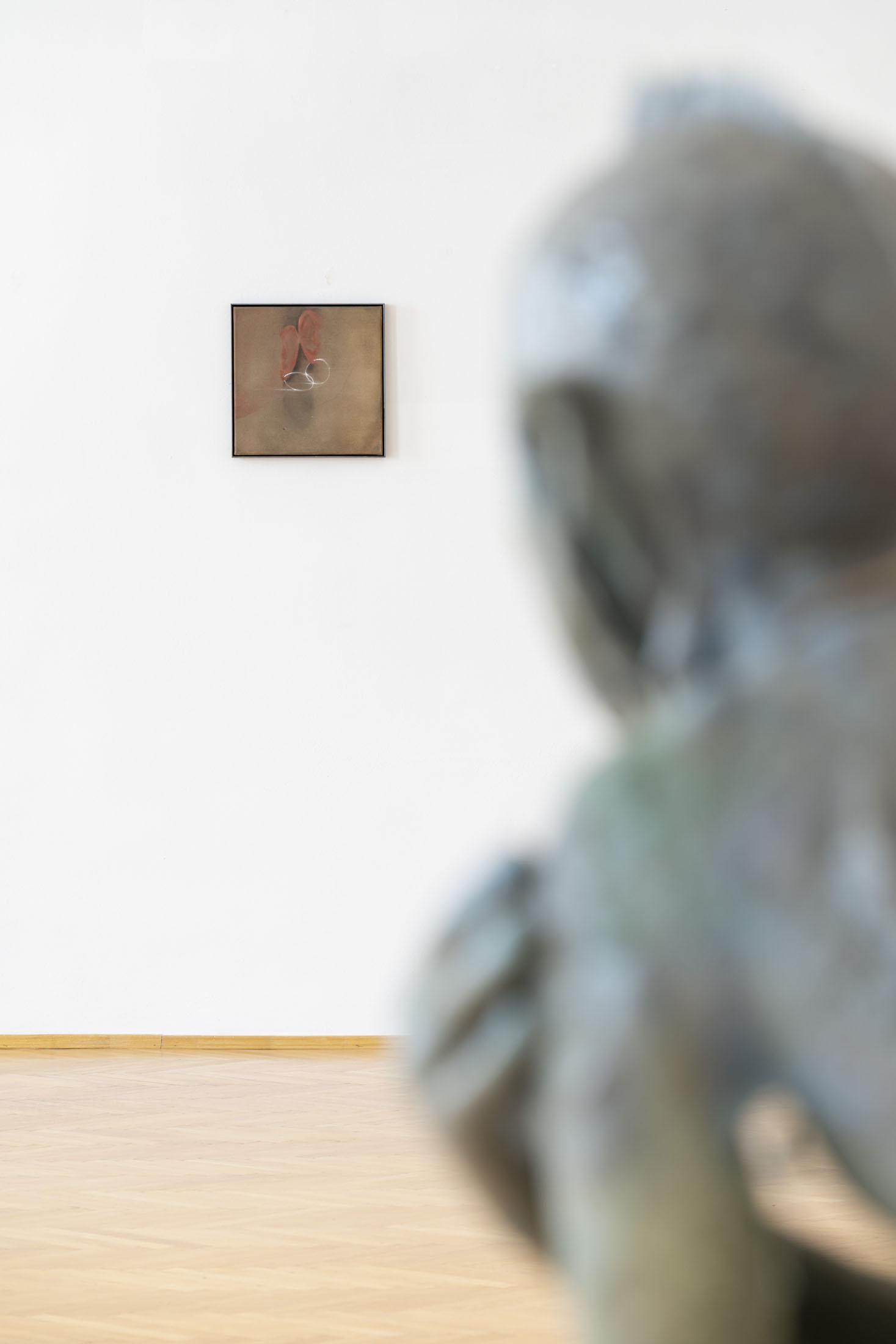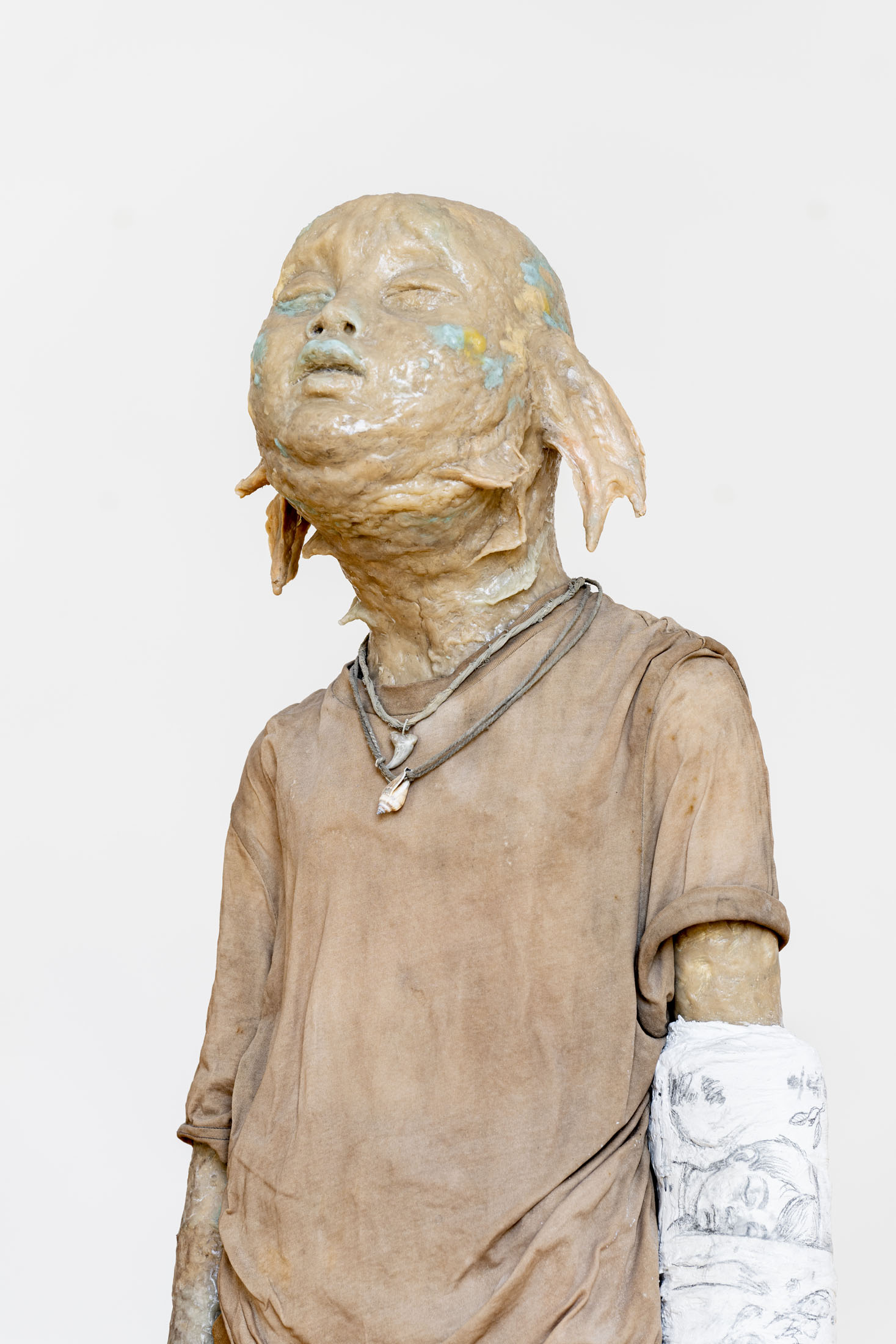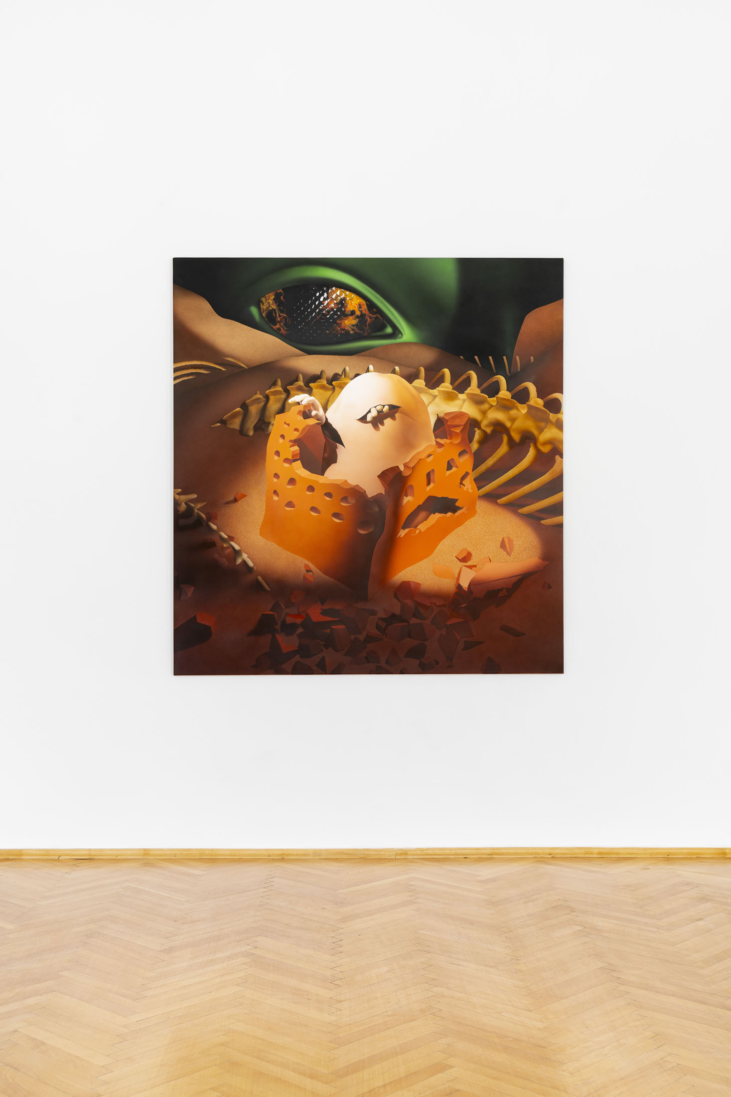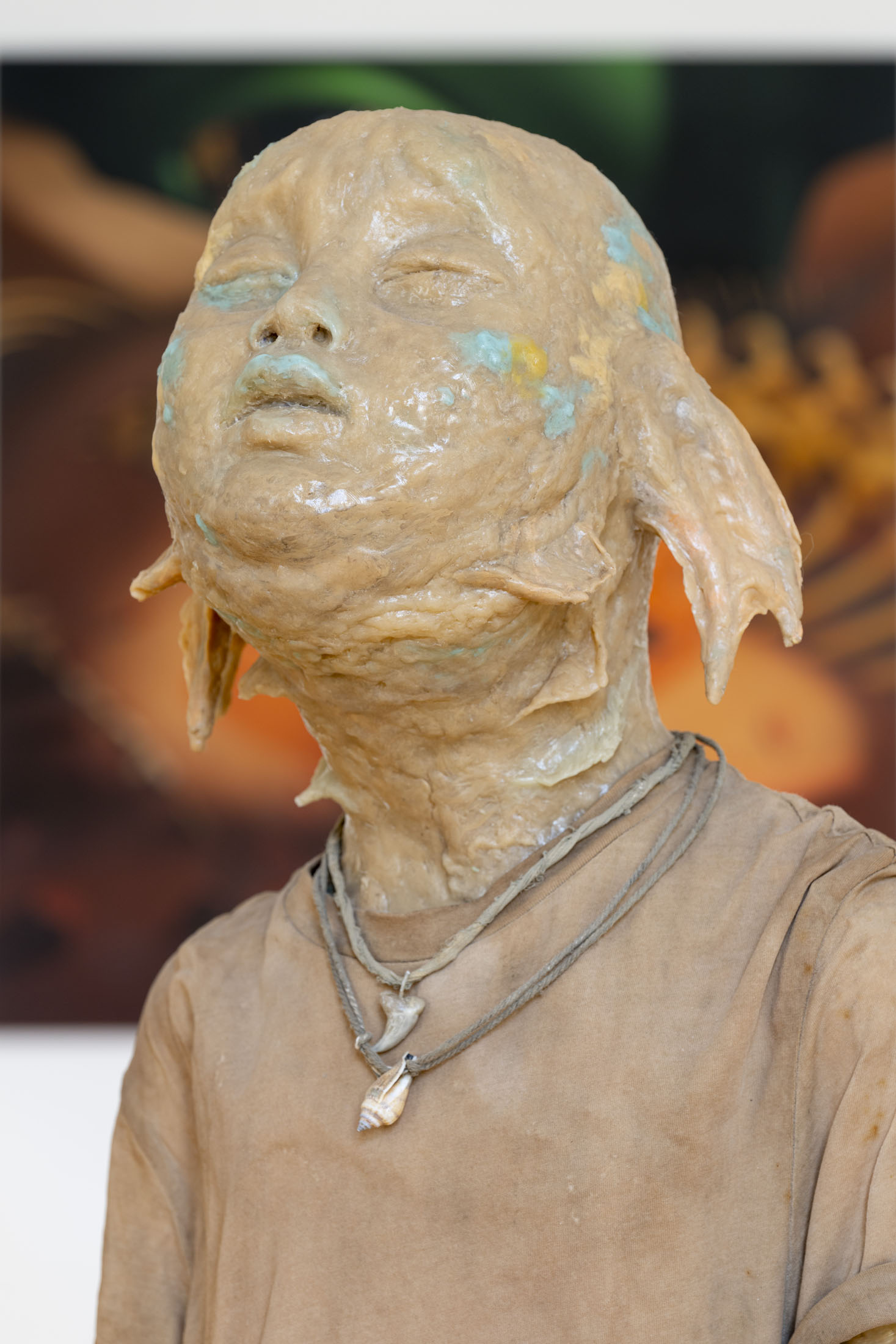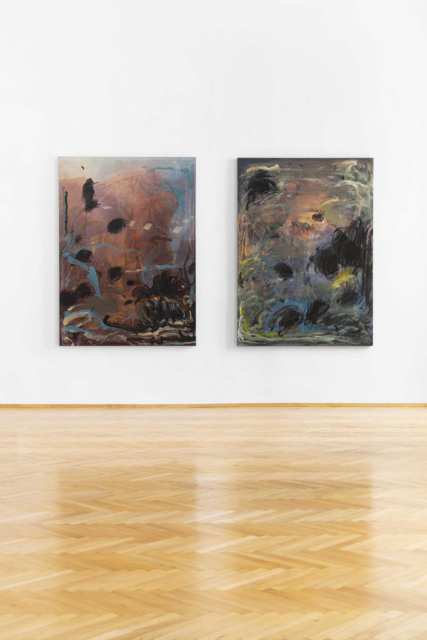 Michele Gabriele (b. 1983, Fondi, lives in Milan) creates fragmentary narratives set in an elusive space-time between the past, the future and a parallel present that comes before the apocalypse or lingers after it. In his original line of hyper-realistic figurative sculptures, he connects mythological creatures – Tritons – with sci-fi and pop culture references and museum aesthetics. The figures appear dreamlike, silent and contemplative. We do not know their origin or fate, yet their presence carries the power of an archaeological find from the future. He complements his vision of his own world with a series of abstract paintings in which gestural strokes and minute details transform noise and digital layers into an intuitive discovery of meanings, drawing on the surrealist practice of decalcomania.