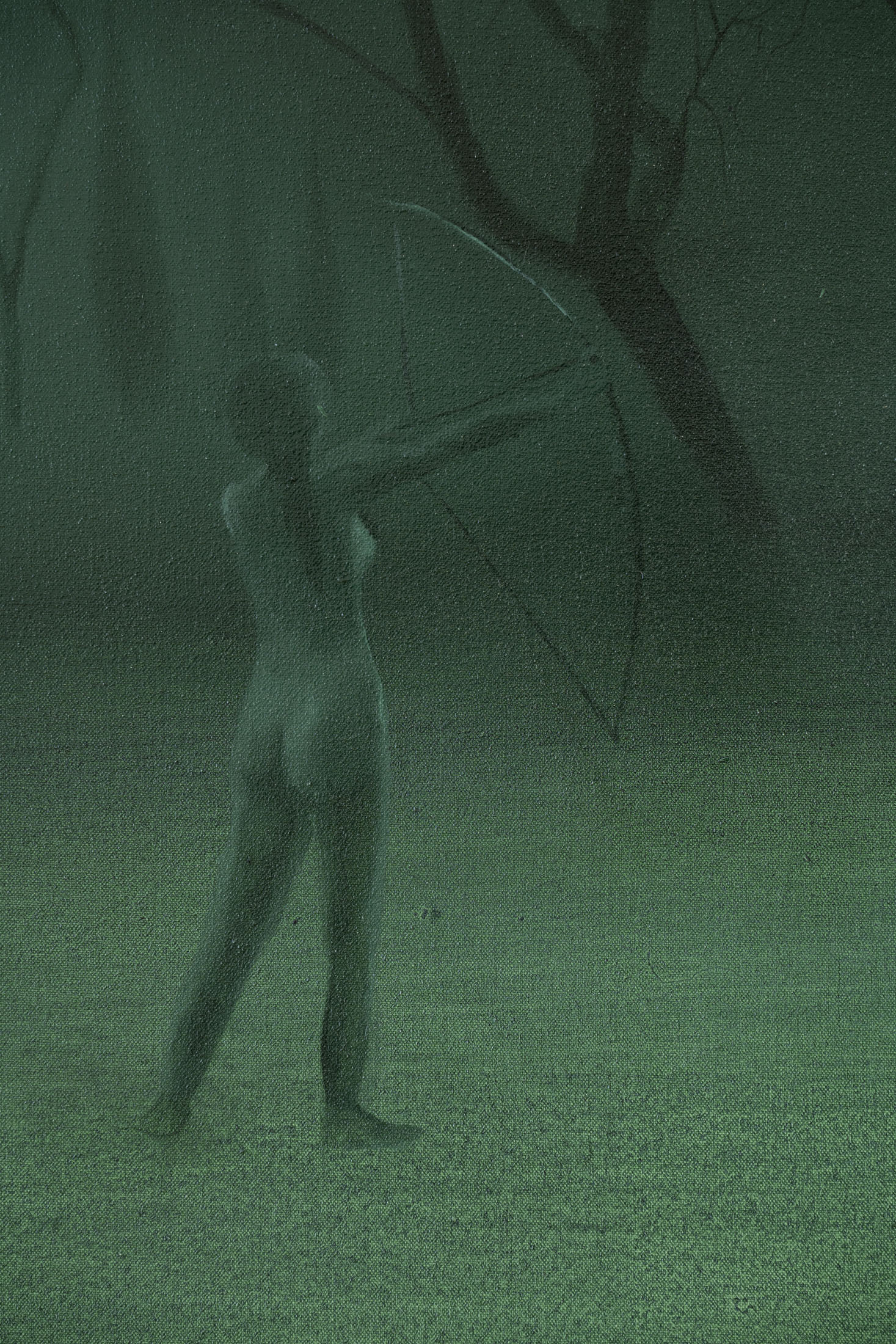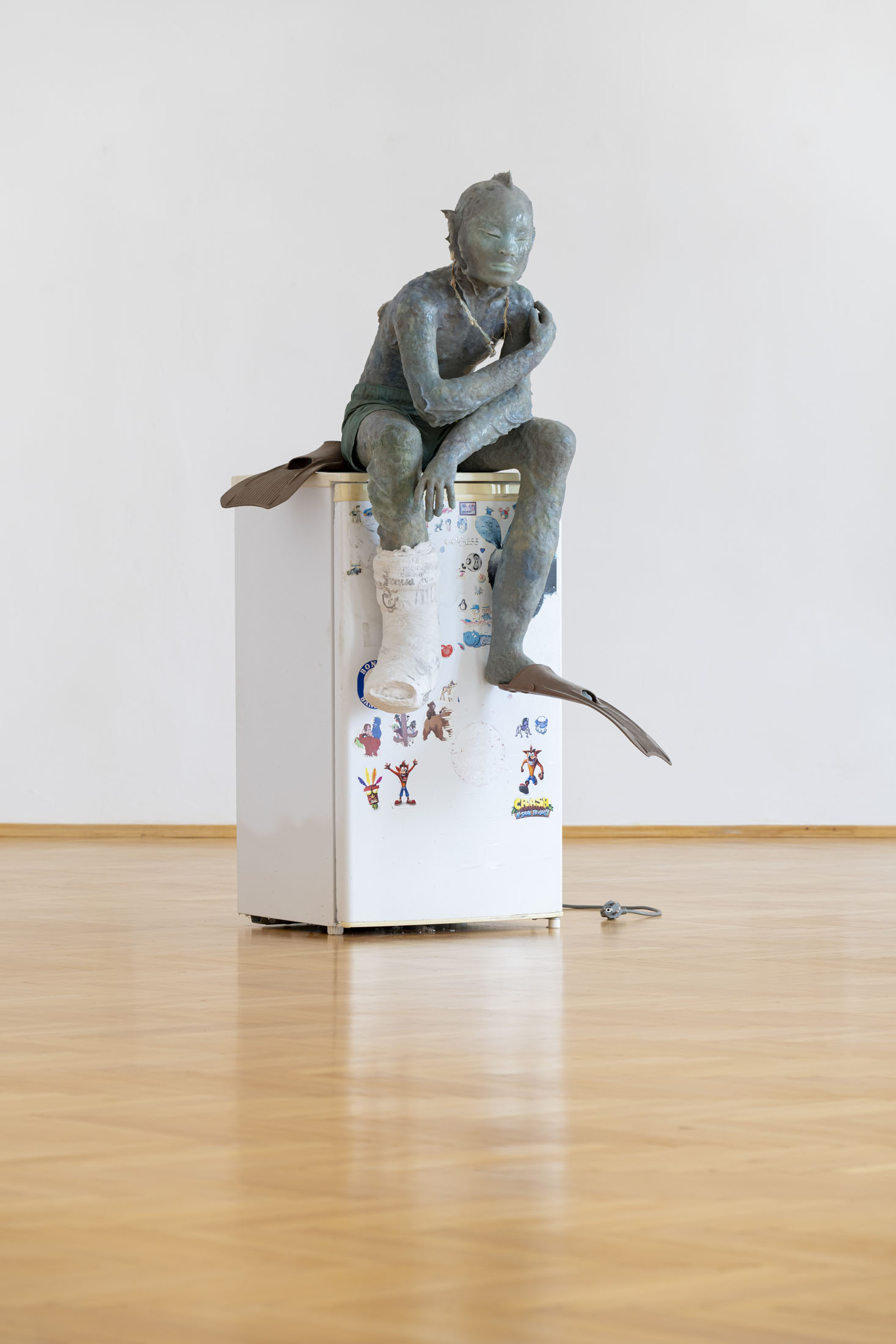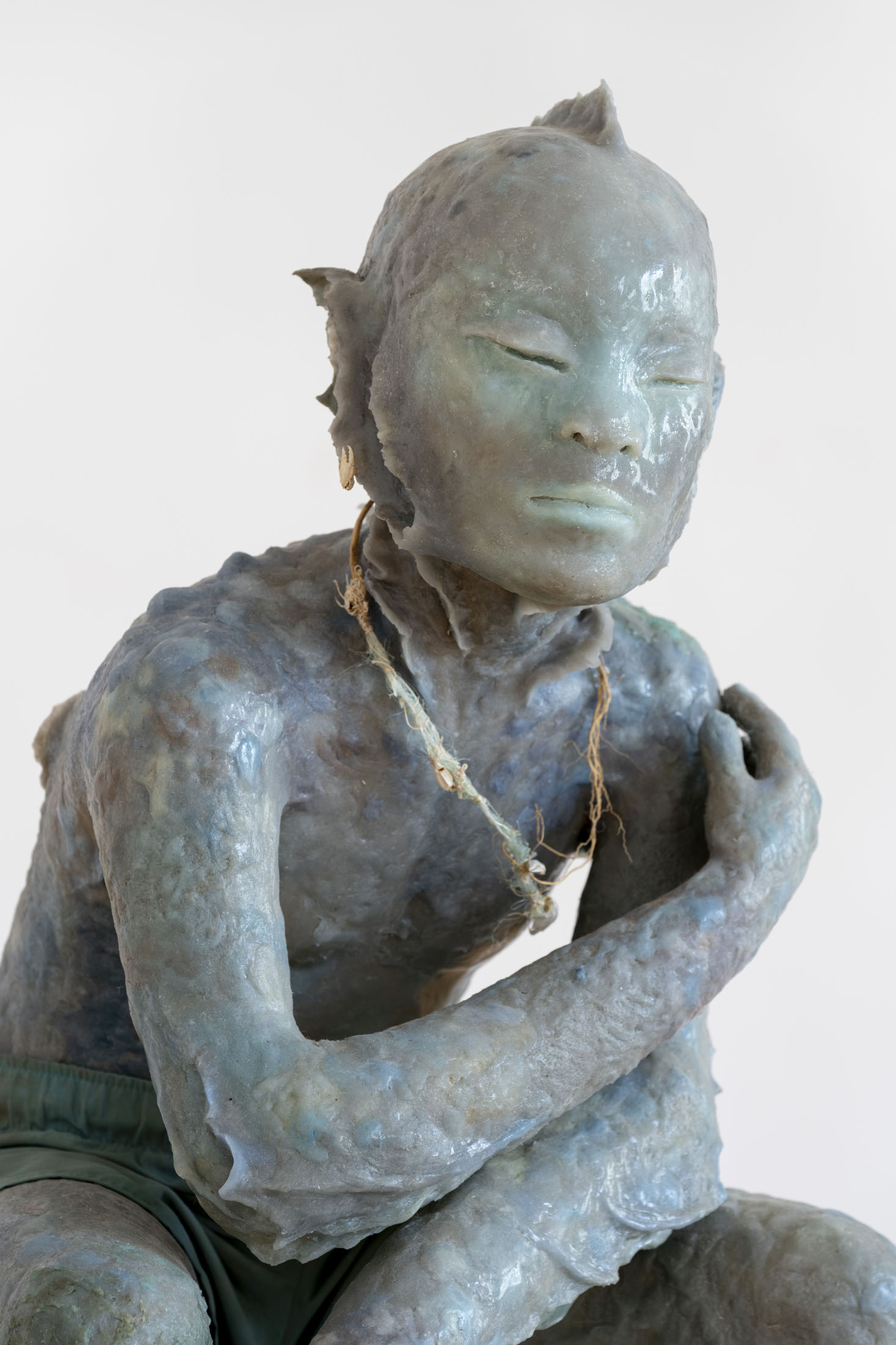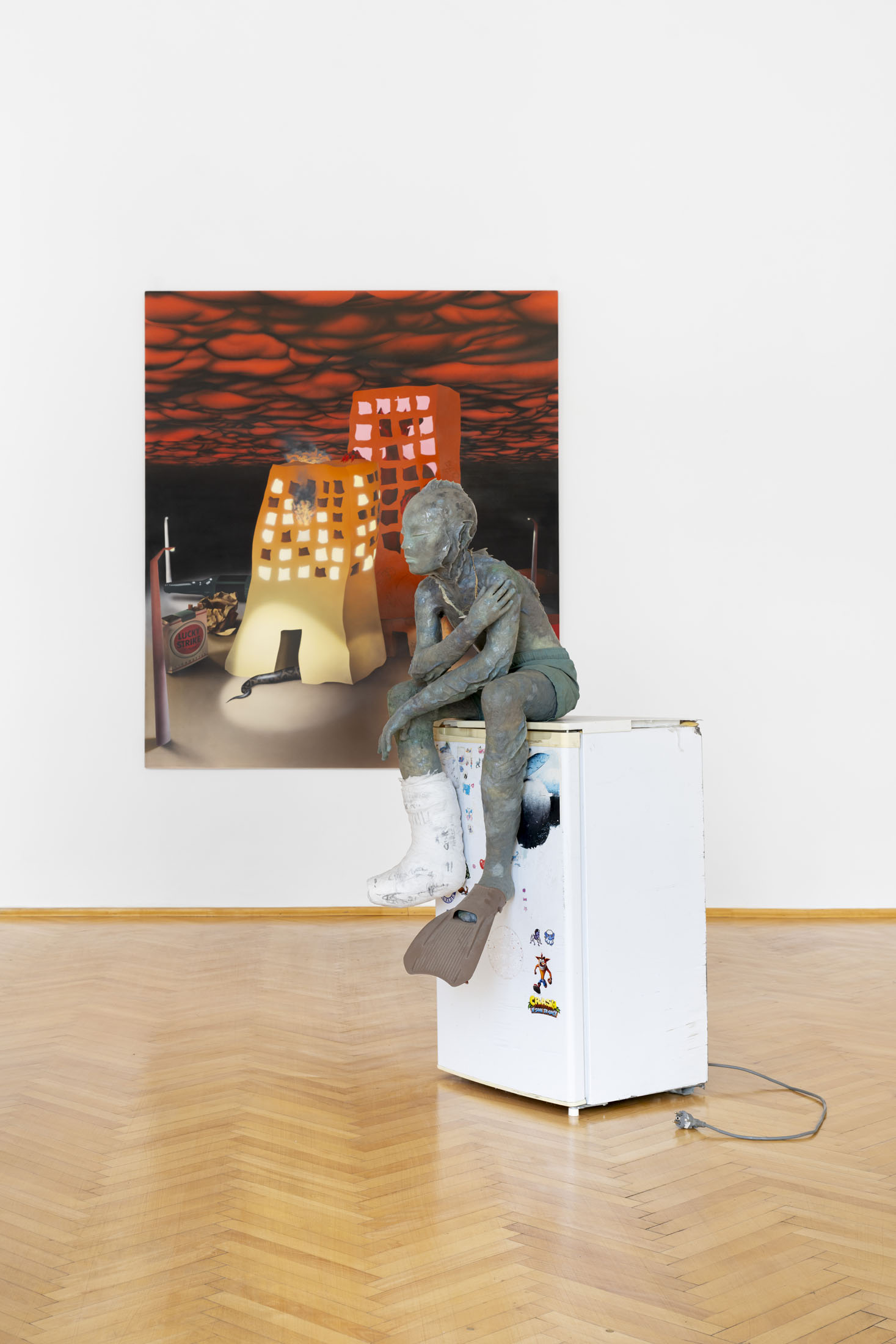Michele Gabriele (b. 1983, Fondi, lives in Milan) creates fragmentary narratives set in an elusive space-time between the past, the future and a parallel present that comes before the apocalypse or lingers after it. In his original line of hyper-realistic figurative sculptures, he connects mythological creatures – Tritons – with sci-fi and pop culture references and museum aesthetics. The figures appear dreamlike, silent and contemplative. We do not know their origin or fate, yet their presence carries the power of an archaeological find from the future. He complements his vision of his own world with a series of abstract paintings in which gestural strokes and minute details transform noise and digital layers into an intuitive discovery of meanings, drawing on the surrealist practice of decalcomania.