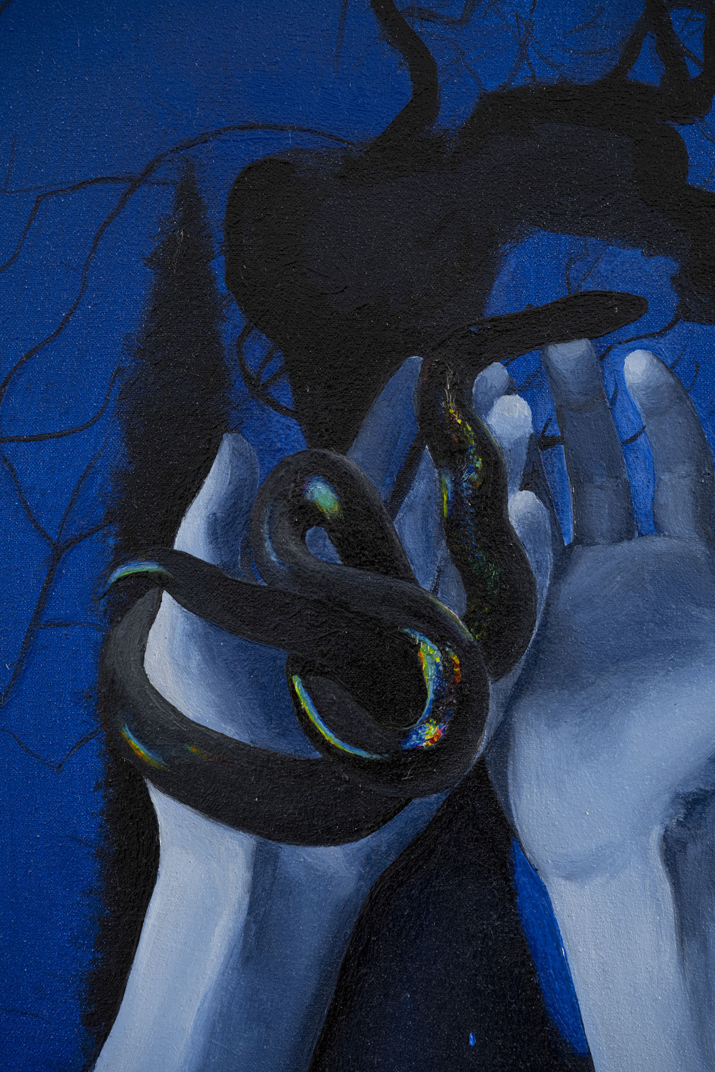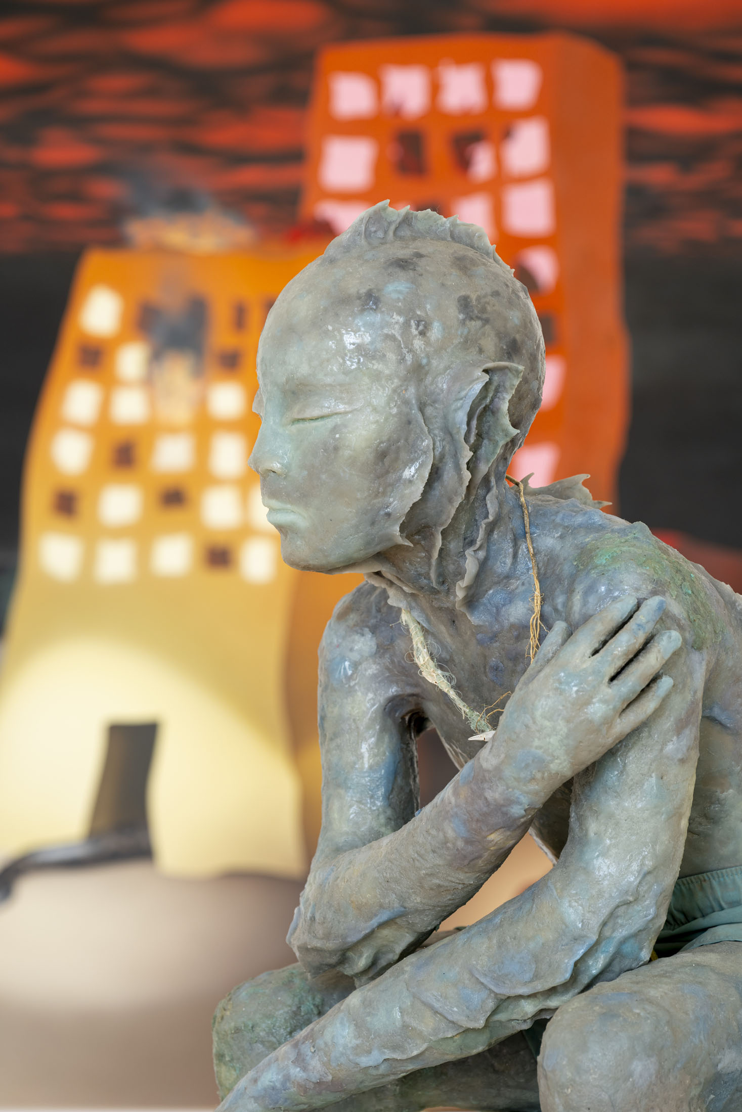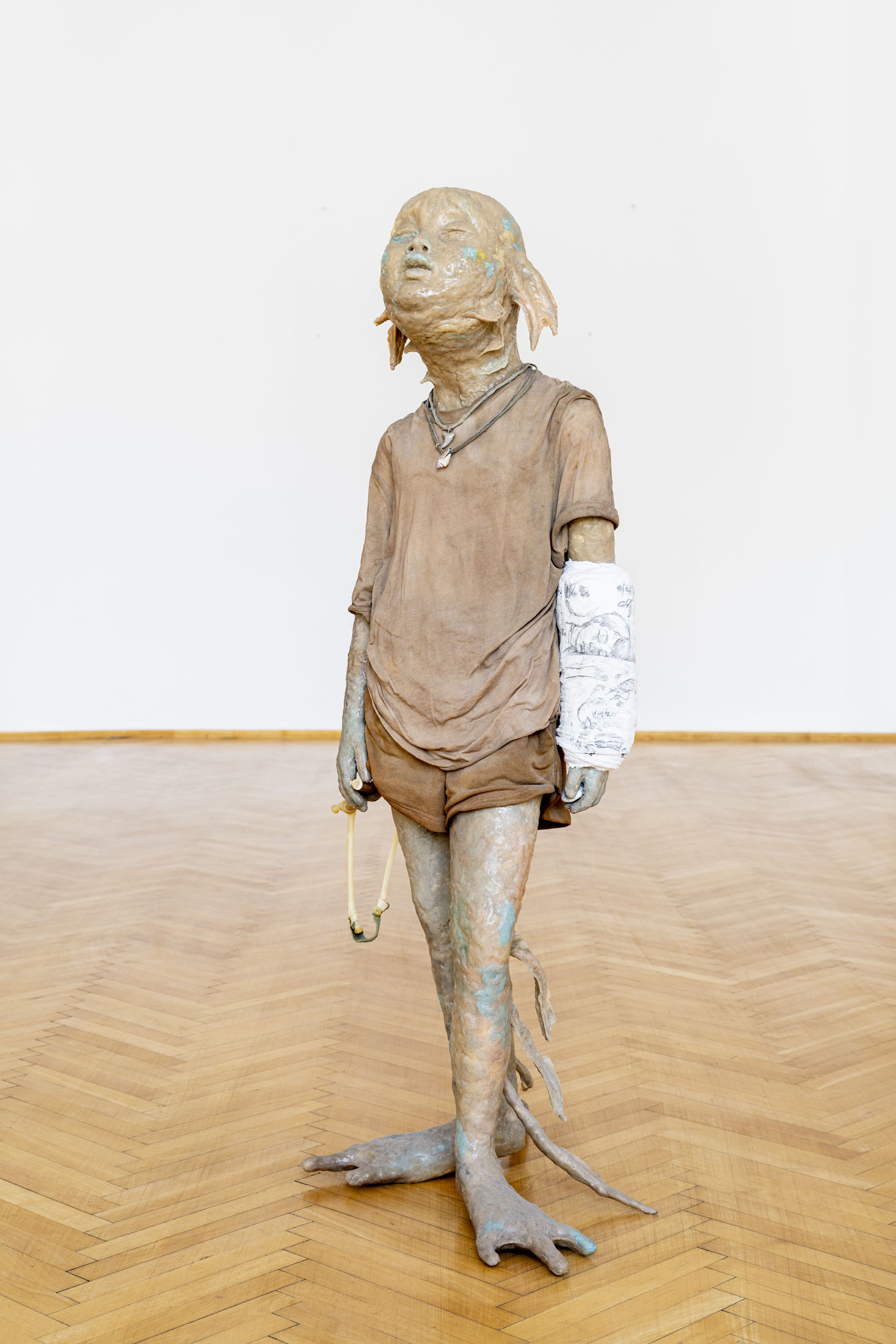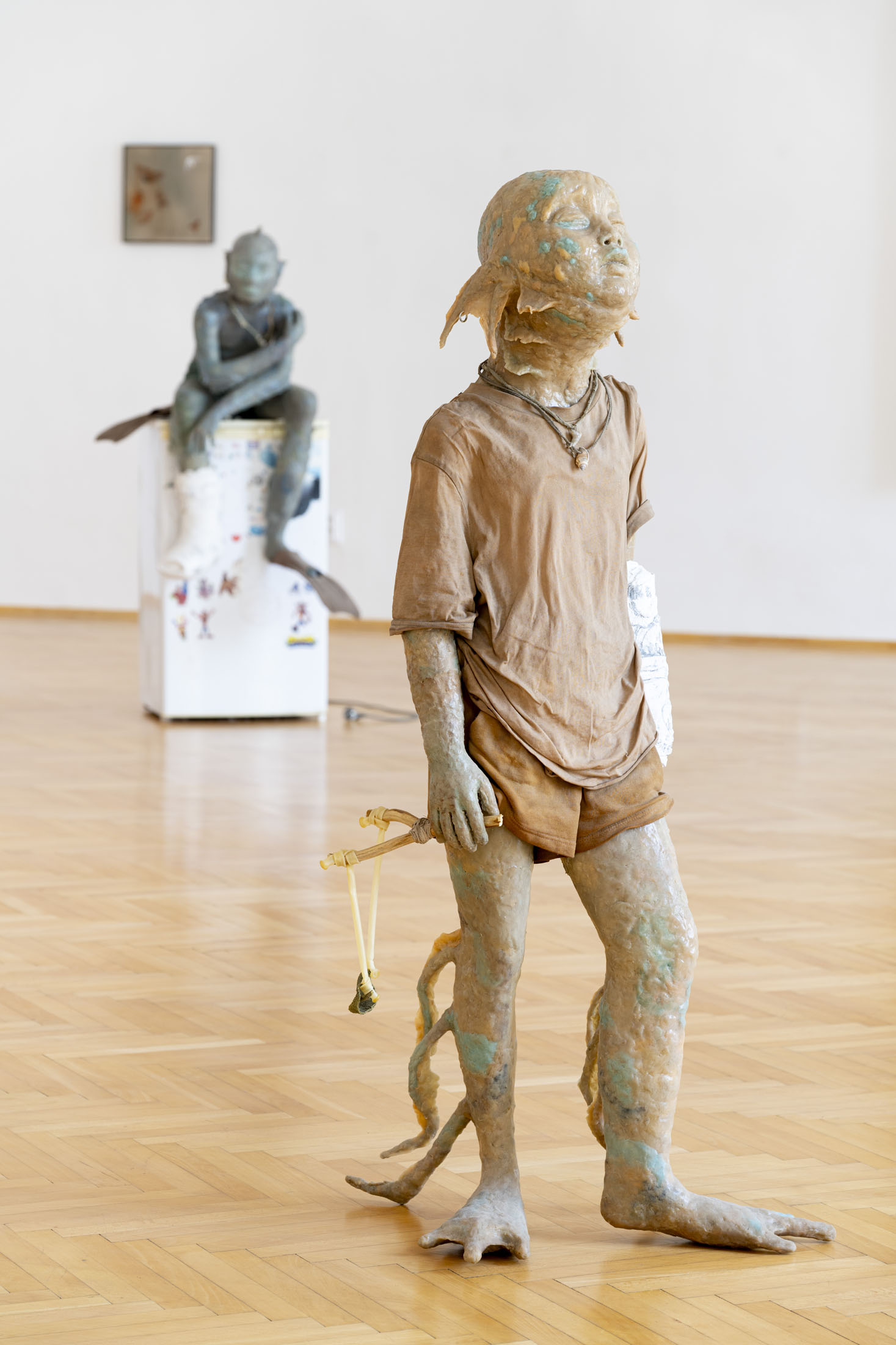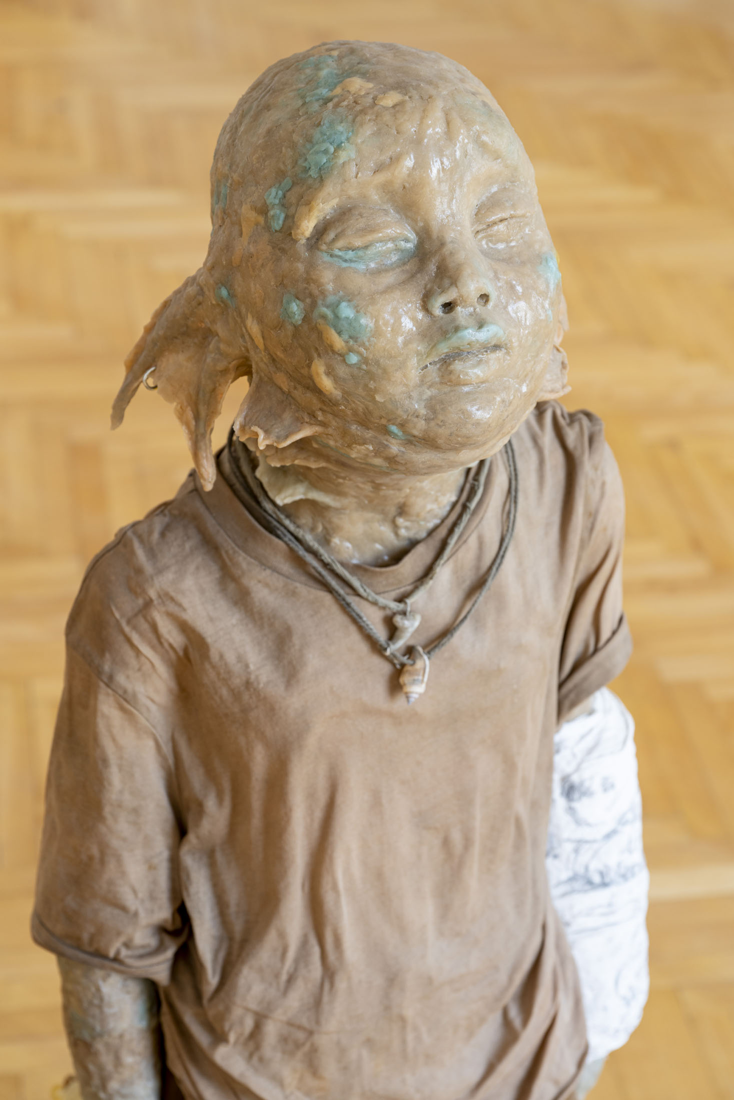 Michele Gabriele (b. 1983, Fondi, lives in Milan) creates fragmentary narratives set in an elusive space-time between the past, the future and a parallel present that comes before the apocalypse or lingers after it. In his original line of hyper-realistic figurative sculptures, he connects mythological creatures – Tritons – with sci-fi and pop culture references and museum aesthetics. The figures appear dreamlike, silent and contemplative. We do not know their origin or fate, yet their presence carries the power of an archaeological find from the future. He complements his vision of his own world with a series of abstract paintings in which gestural strokes and minute details transform noise and digital layers into an intuitive discovery of meanings, drawing on the surrealist practice of decalcomania.